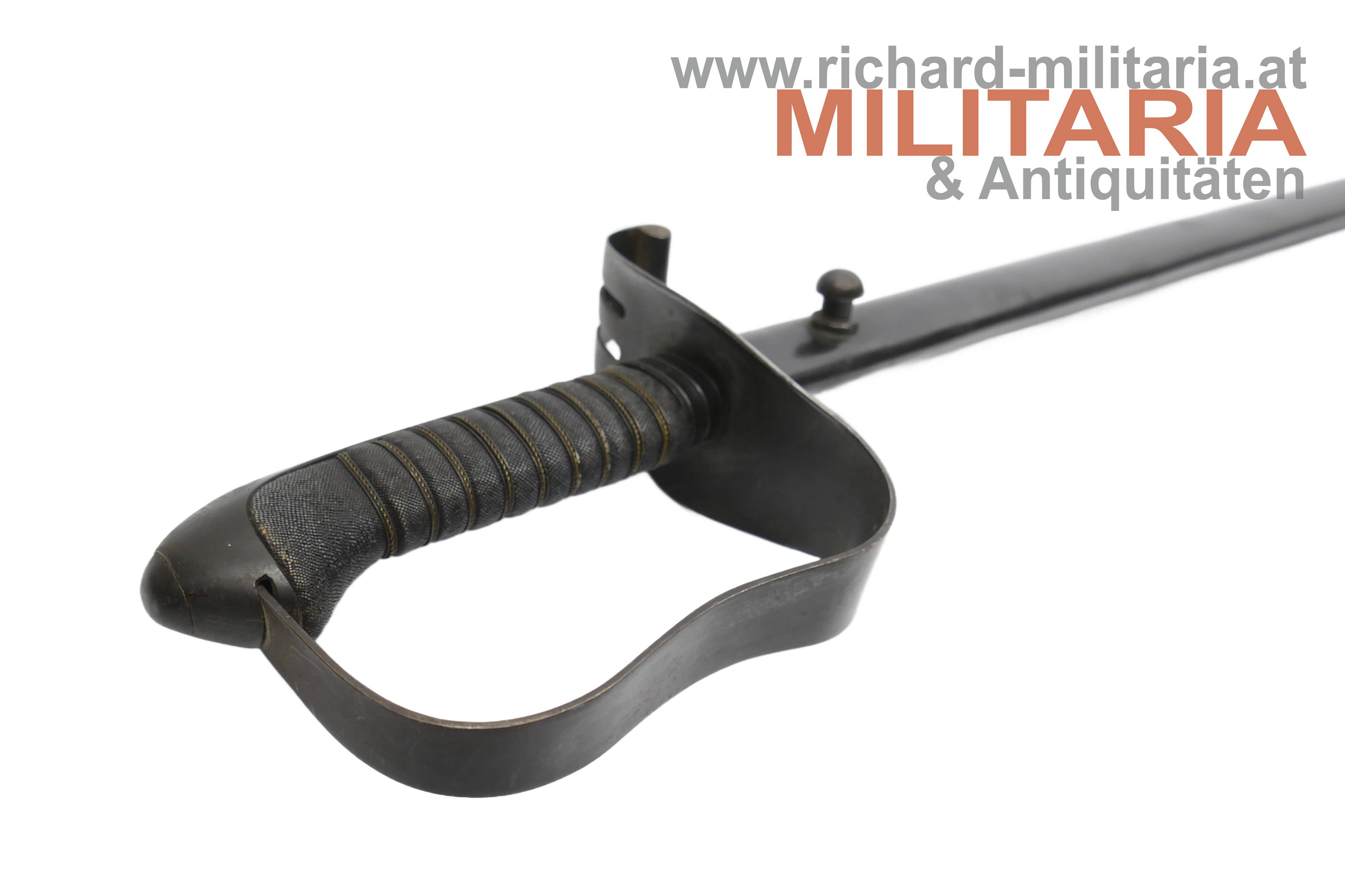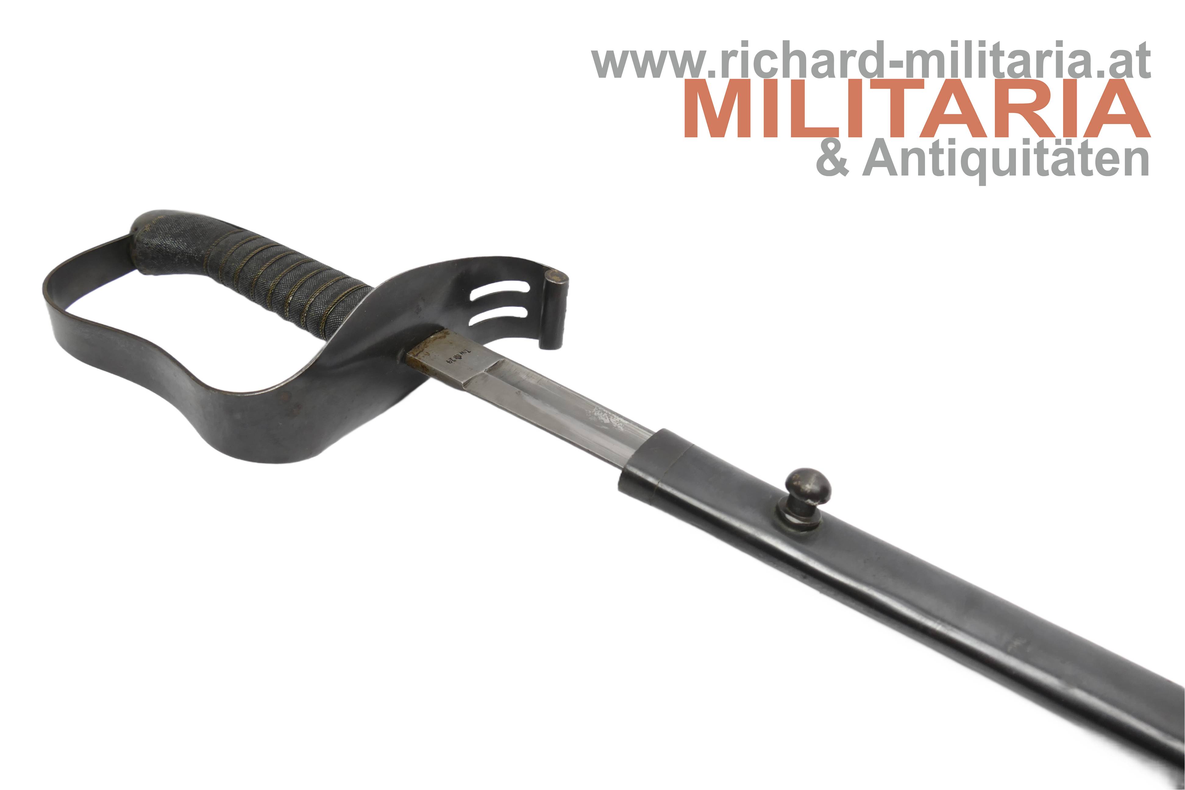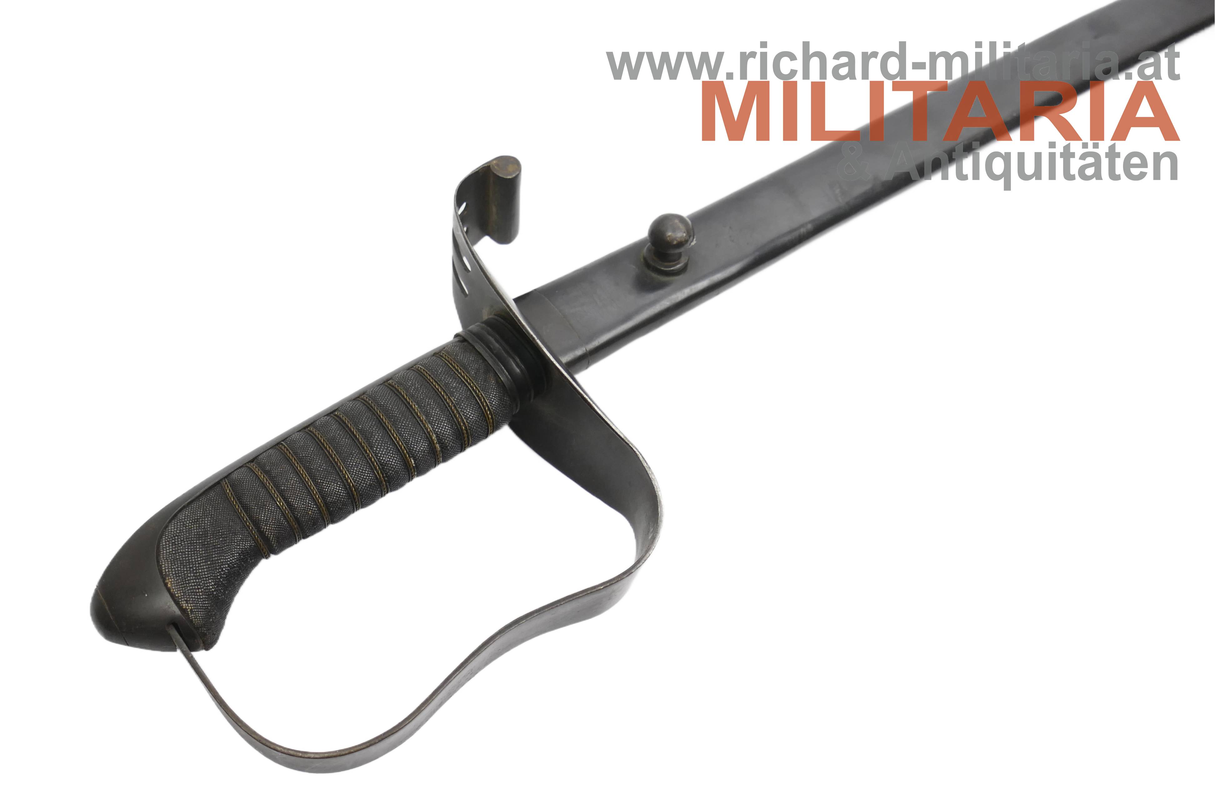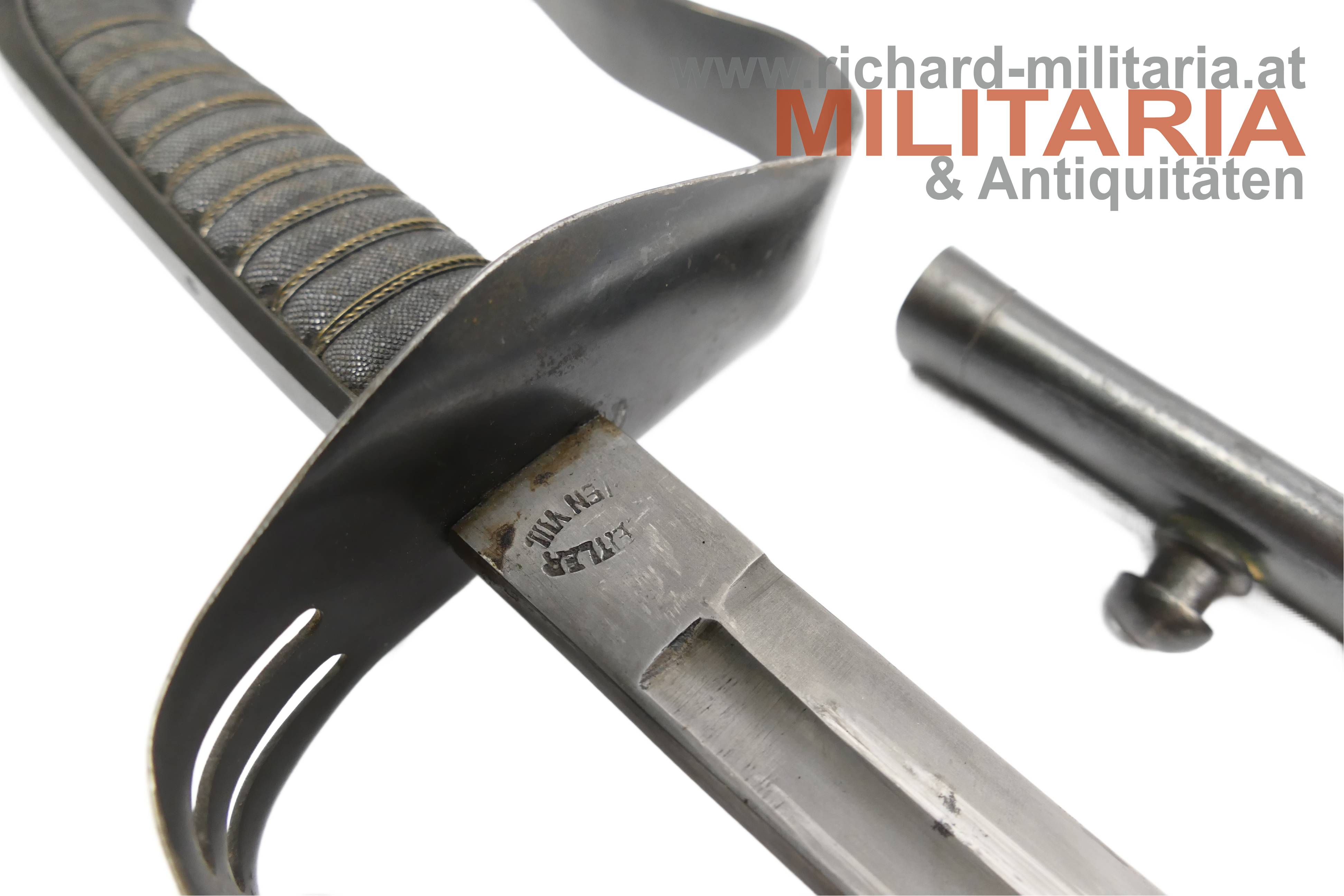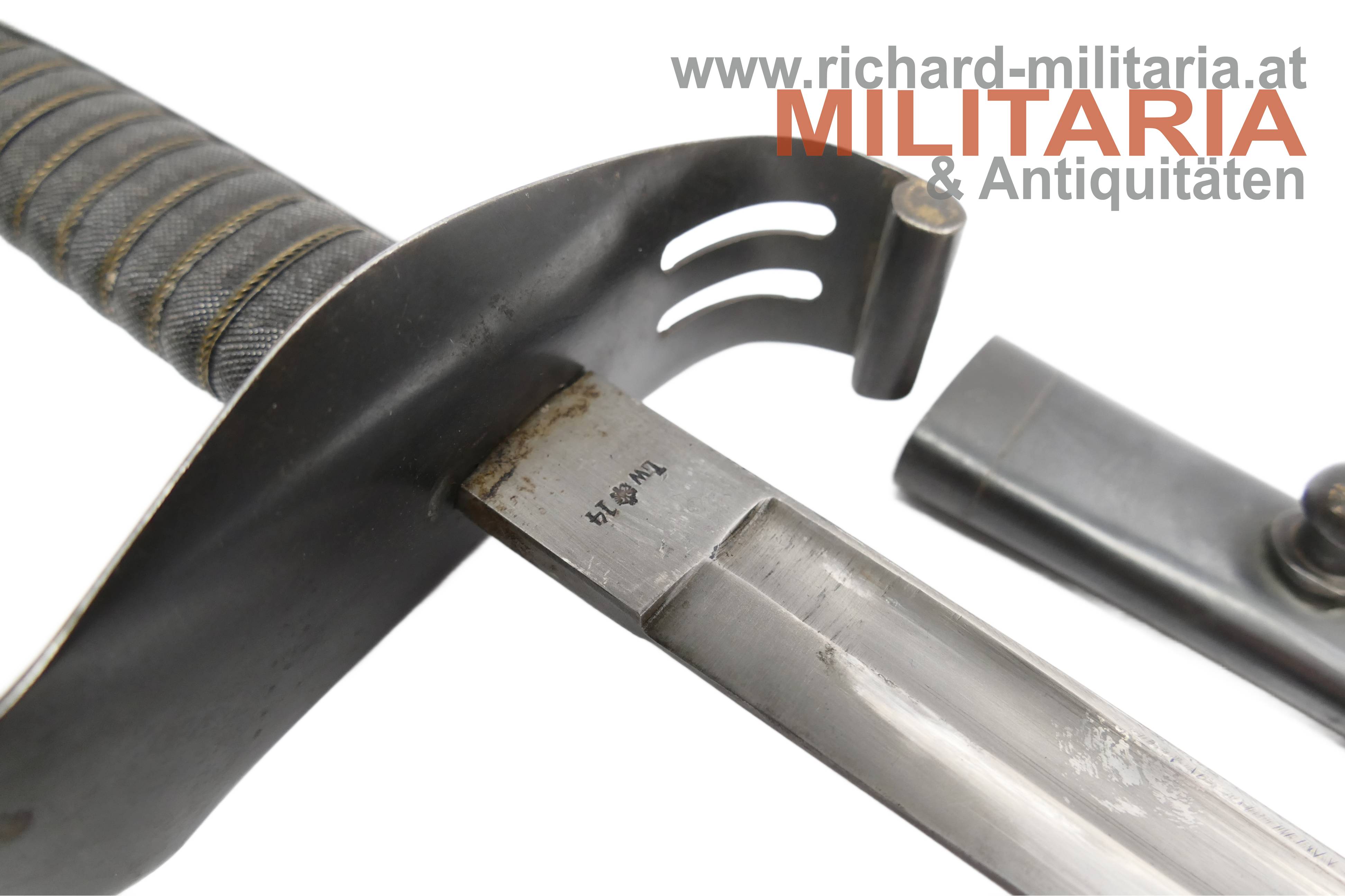 k.k. Landwehr-Gebrigstruppen Säbel für Unteroffiziere; beidseitig gekehlte Rückenklinge in sehr guter Erhaltung; auf der Fehlschärfe die Landwehr-Abnahme "Lw (Doppeladler) 14" und "Zeitler Wien"; Griff aus Fischhaut mit dreifacher Golddrahtwicklung; Griffgefäß mit Armeeabnahme; Parierstange Griffgefäß sowie auch die Scheide mit originaler Brünierung;