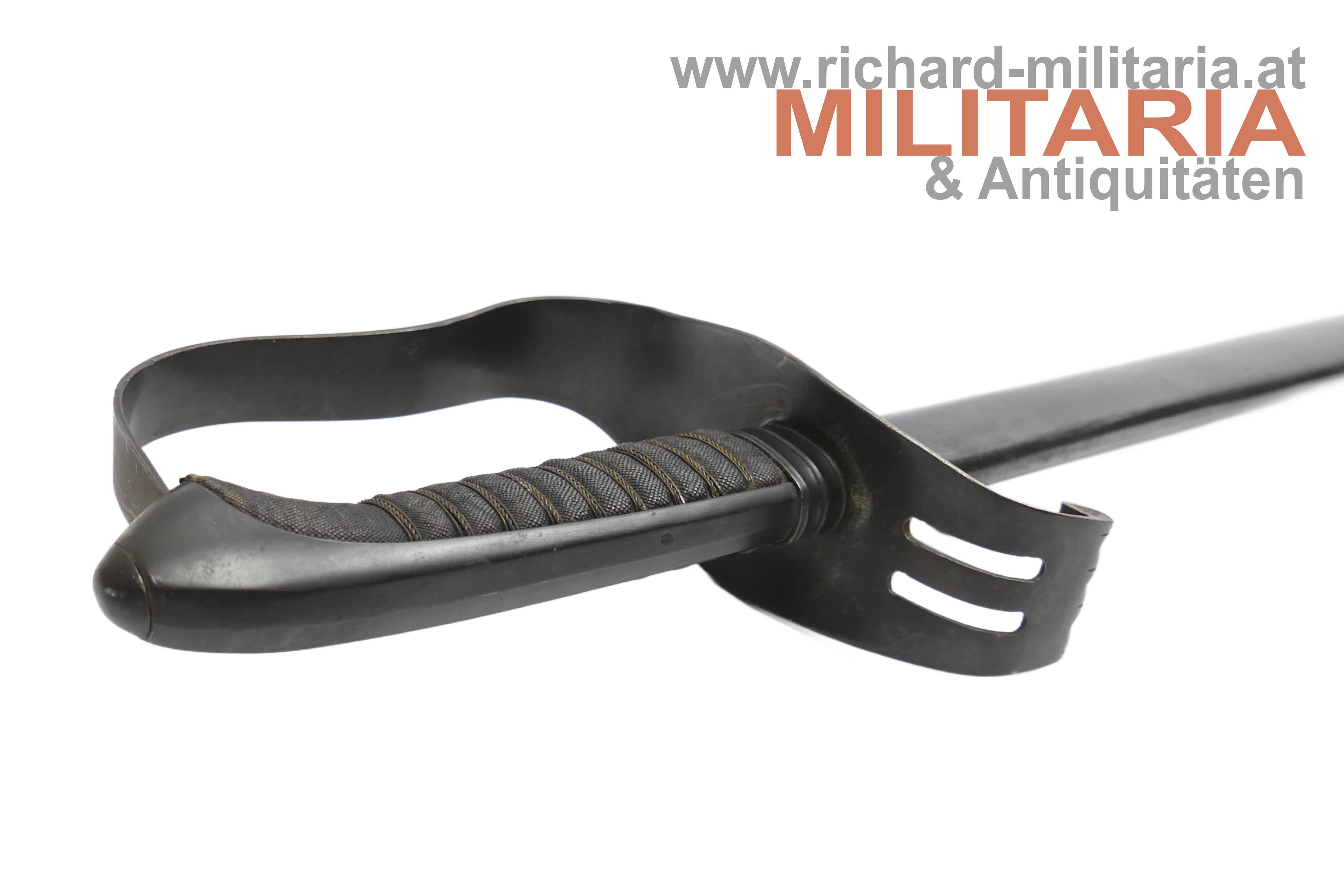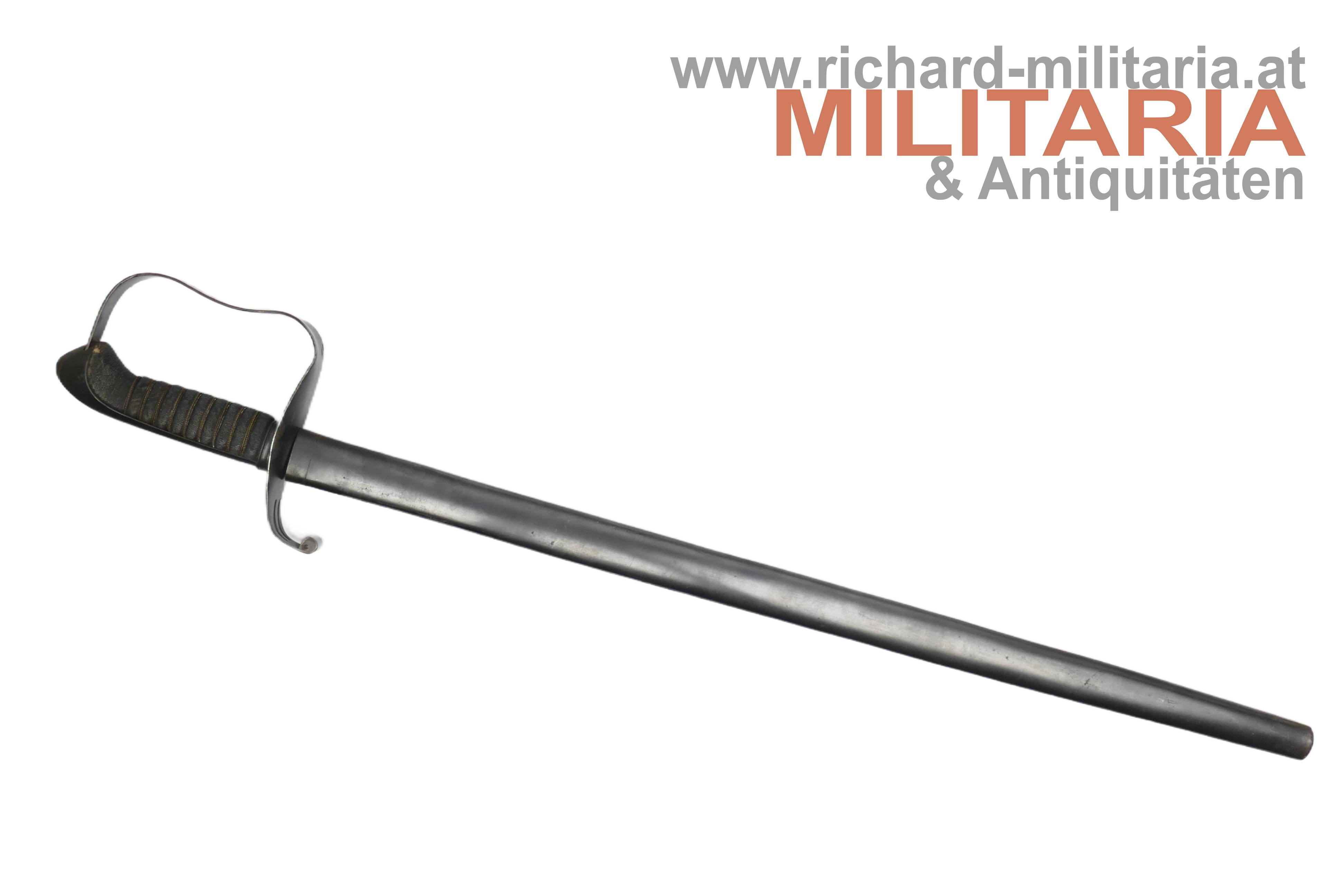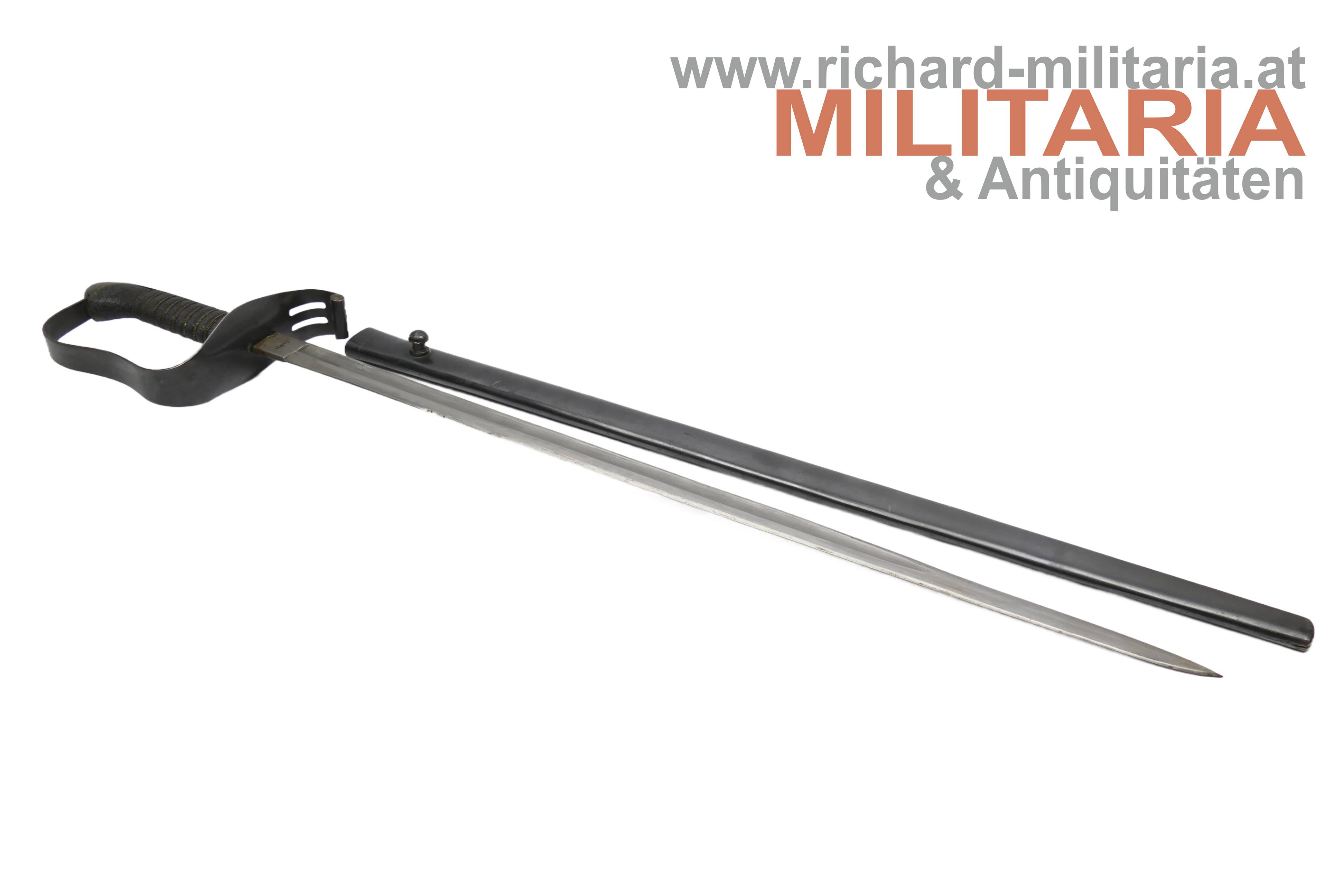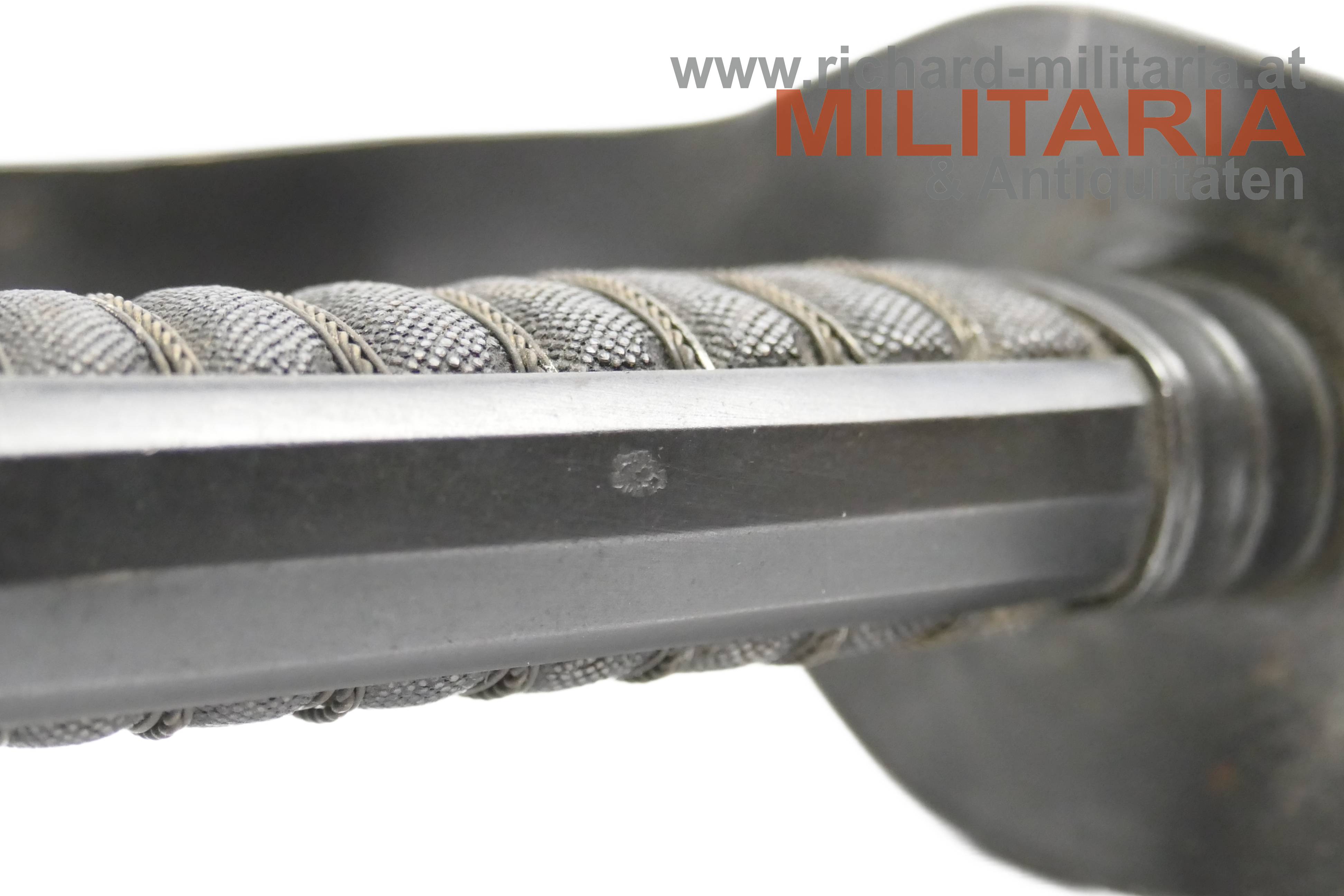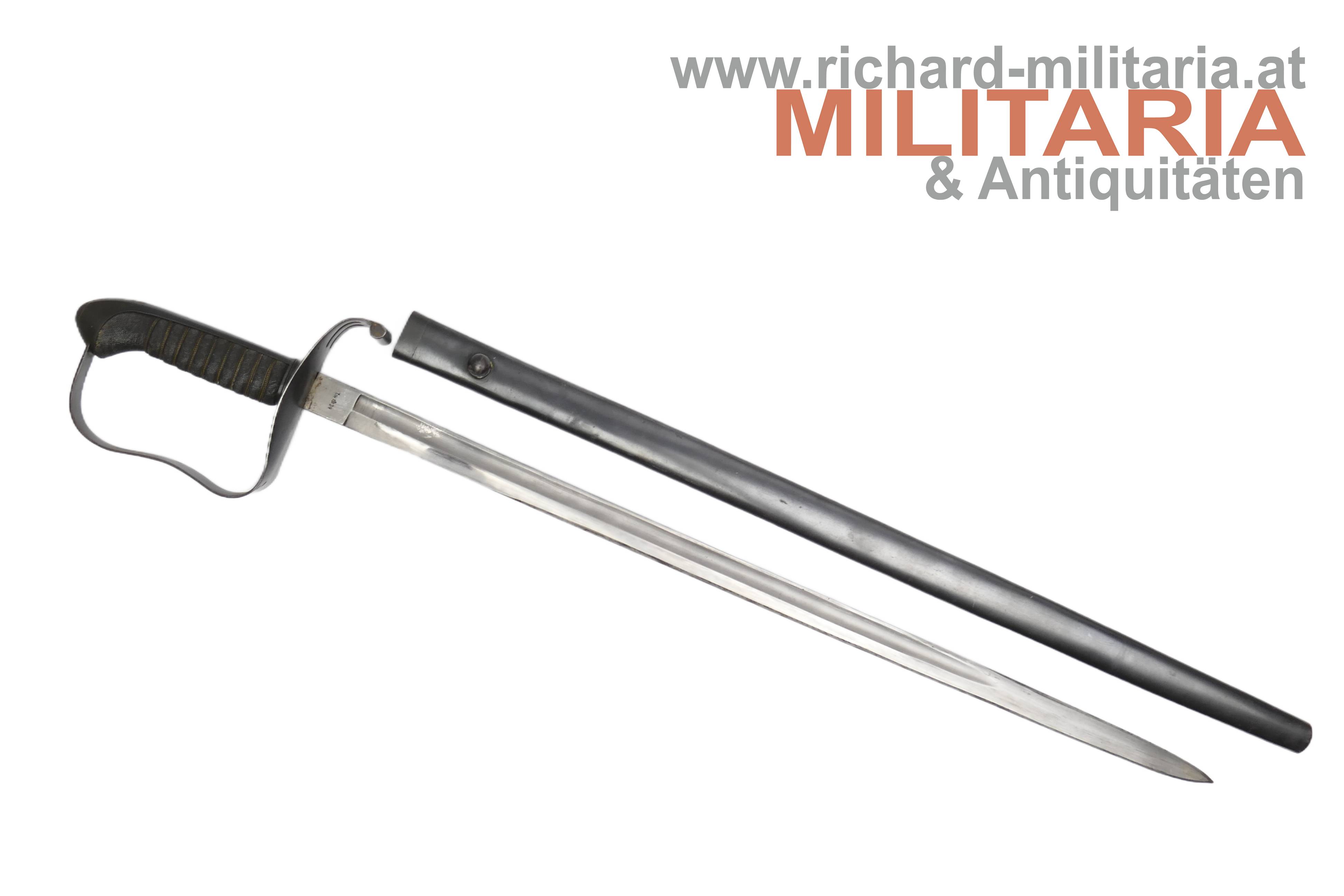 k.k. Landwehr-Gebrigstruppen Säbel für Unteroffiziere; beidseitig gekehlte Rückenklinge in sehr guter Erhaltung; auf der Fehlschärfe die Landwehr-Abnahme "Lw (Doppeladler) 14" und "Zeitler Wien"; Griff aus Fischhaut mit dreifacher Golddrahtwicklung; Griffgefäß mit Armeeabnahme; Parierstange Griffgefäß sowie auch die Scheide mit originaler Brünierung;
