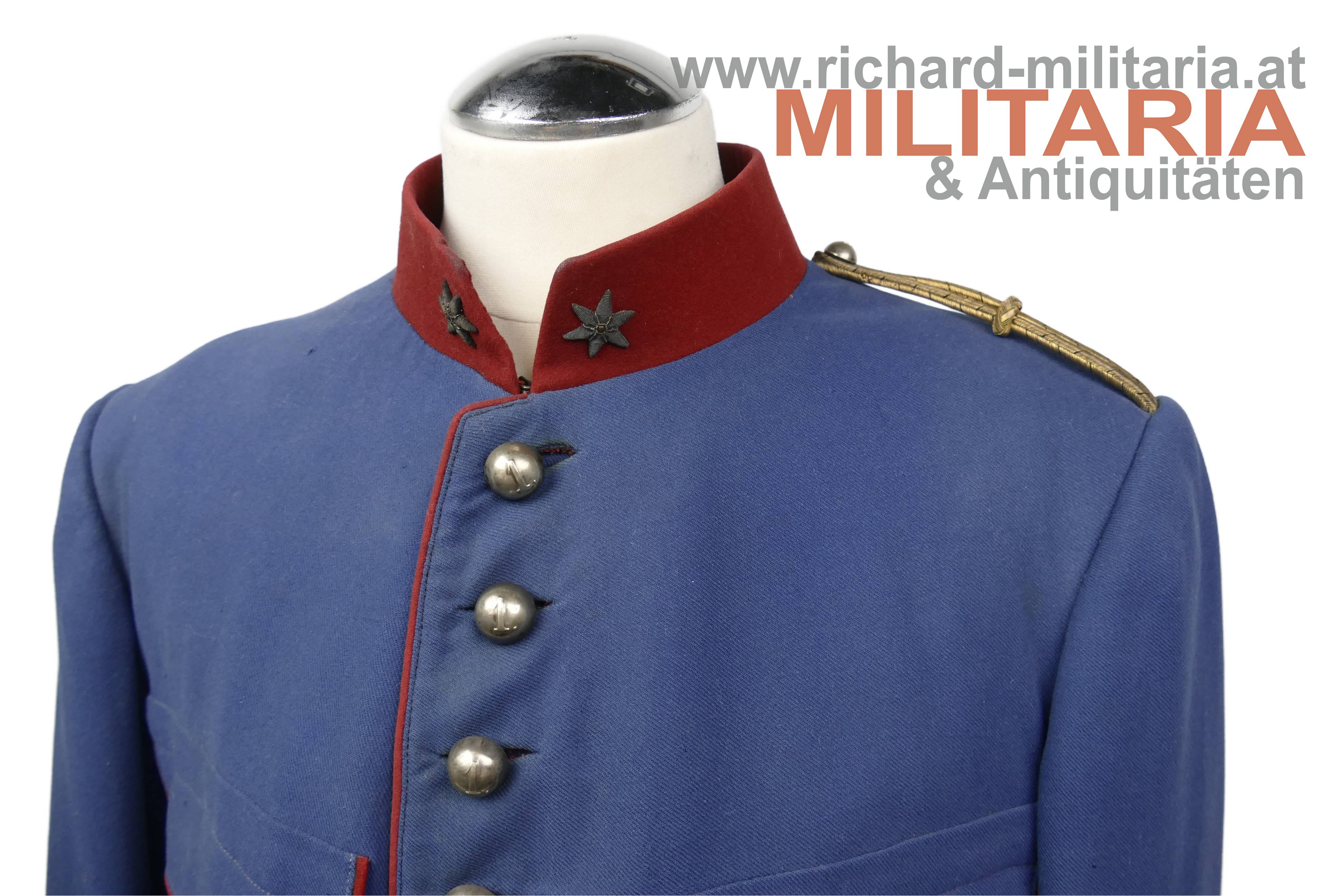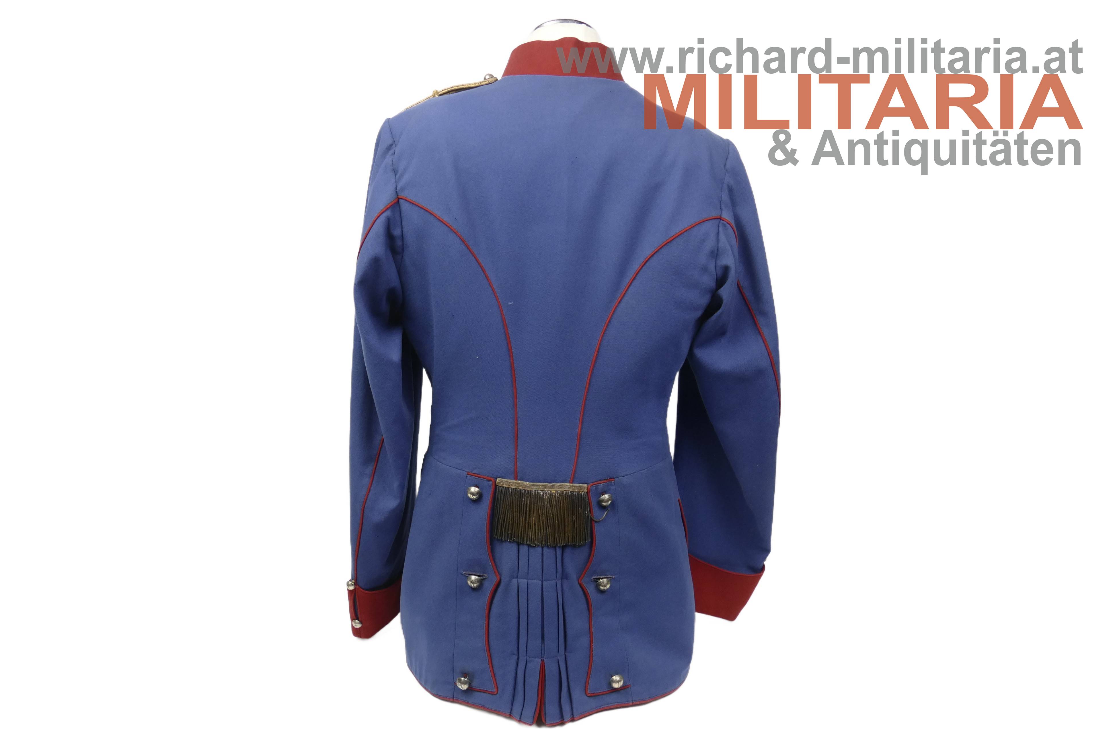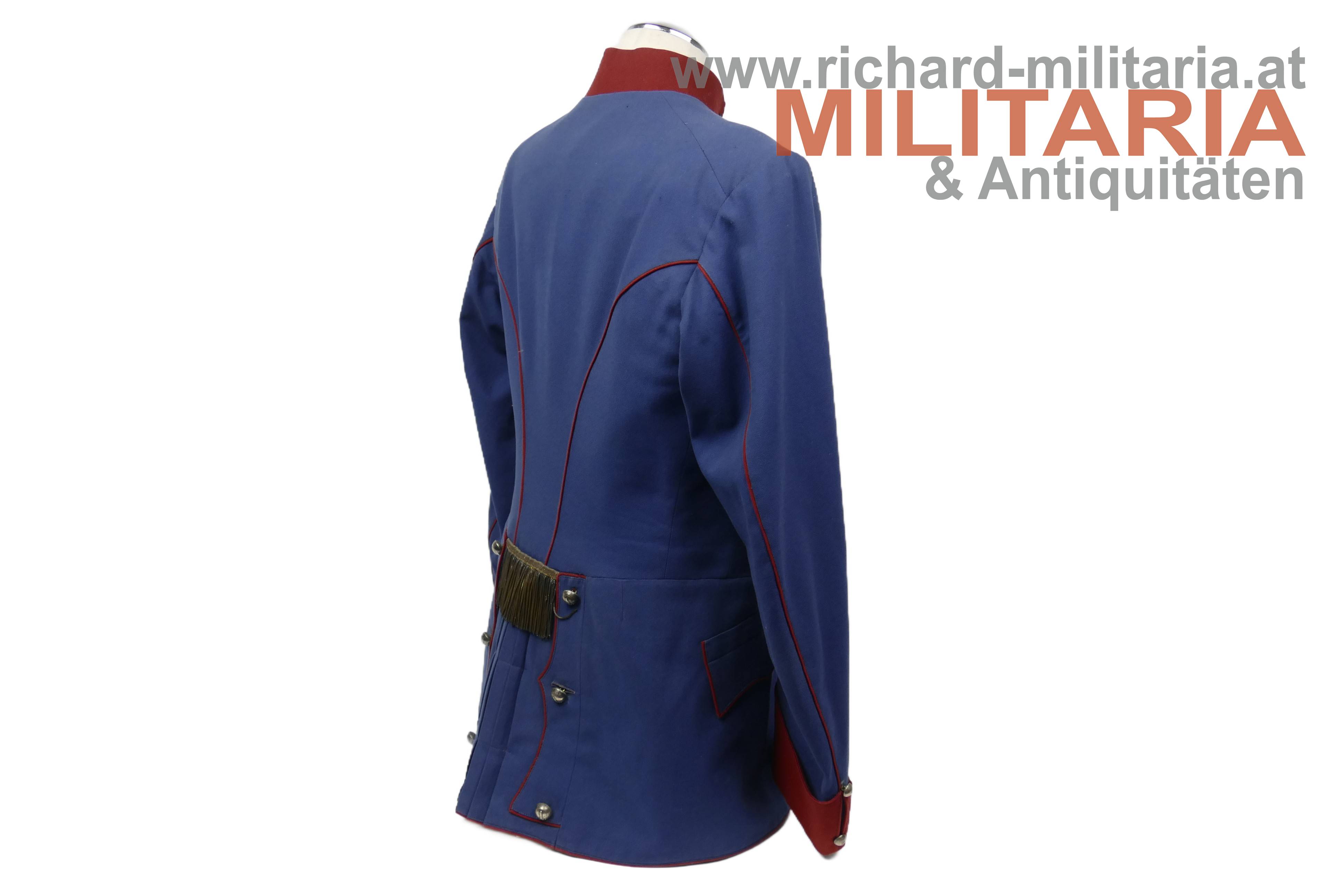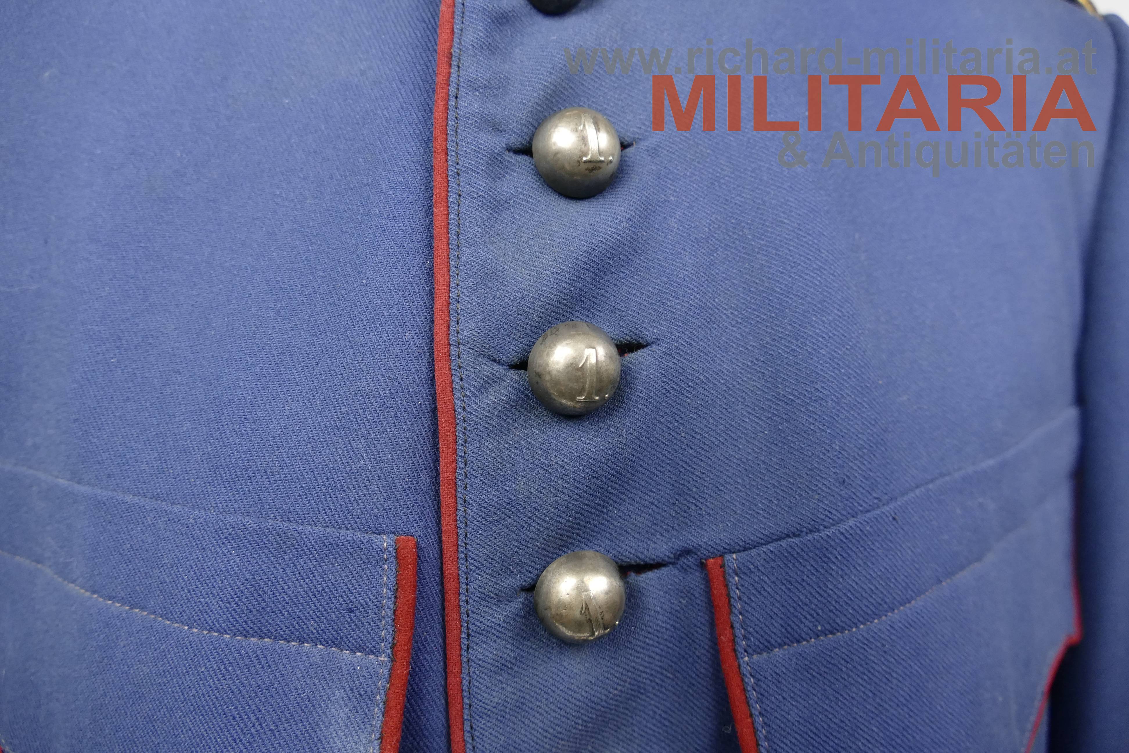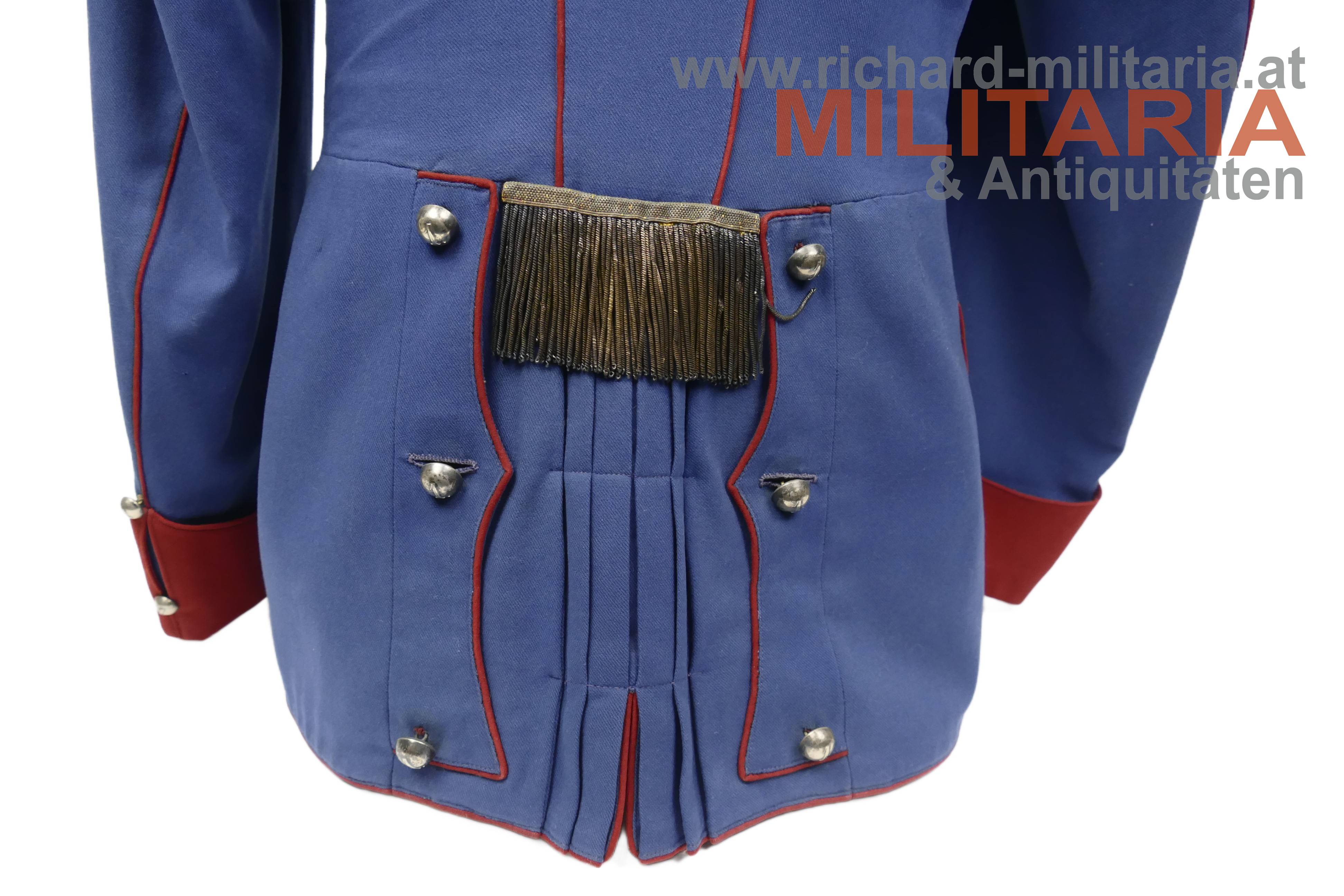 Ulanka für einen Leutnant im k.k. Landwehr-Ulanen-Regiment Nr. 1, nach der Adjustierungsvorschrift 1910/11; feines lichtblaues Tuch mit krapproten Vorstößen, Kragen und Ärmelaufschlägen; einreihig zu 11 silbernen Knöpfen - alle mit der Regimentsnummer "1"; auf der linken Schulter goldene, schwarz durchwirkte Achselschlinge ebenfalls von einem silbernen Knopf mit Regimentsnummer 1 gehalten; an den Ärmelaufschlägen und Schoßteil am Rücken ebenfalls silberne Knöpfe mit Regimentsnummer 1, am Schoßteil der sogenannte "Wasserfall" aufgenäht; innen mit krapproter Seite ausgelegt; kein Hersteller- oder Trägeretikett; Bauchriemen mit Hersteller Josef Zimbler, Wien