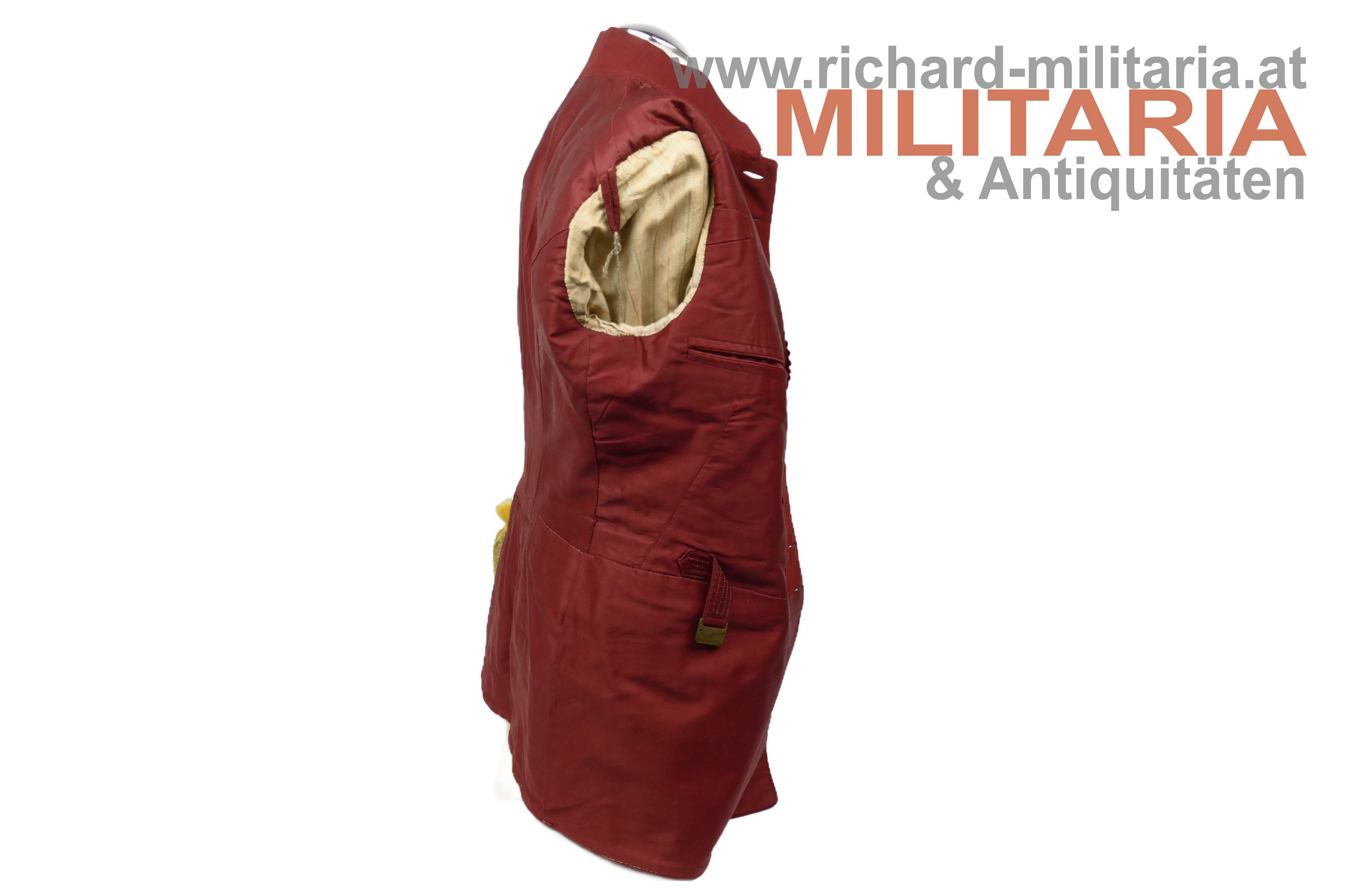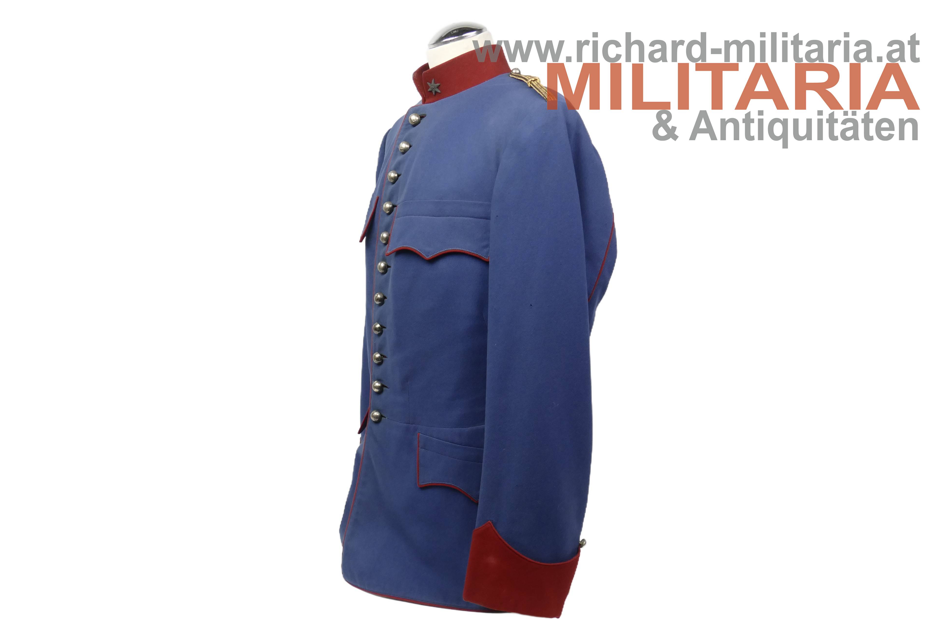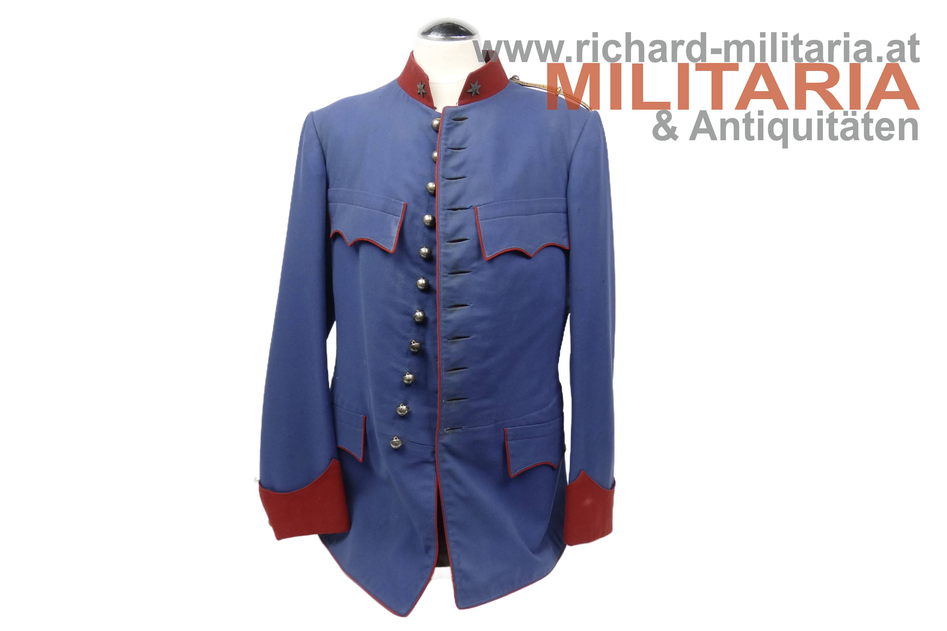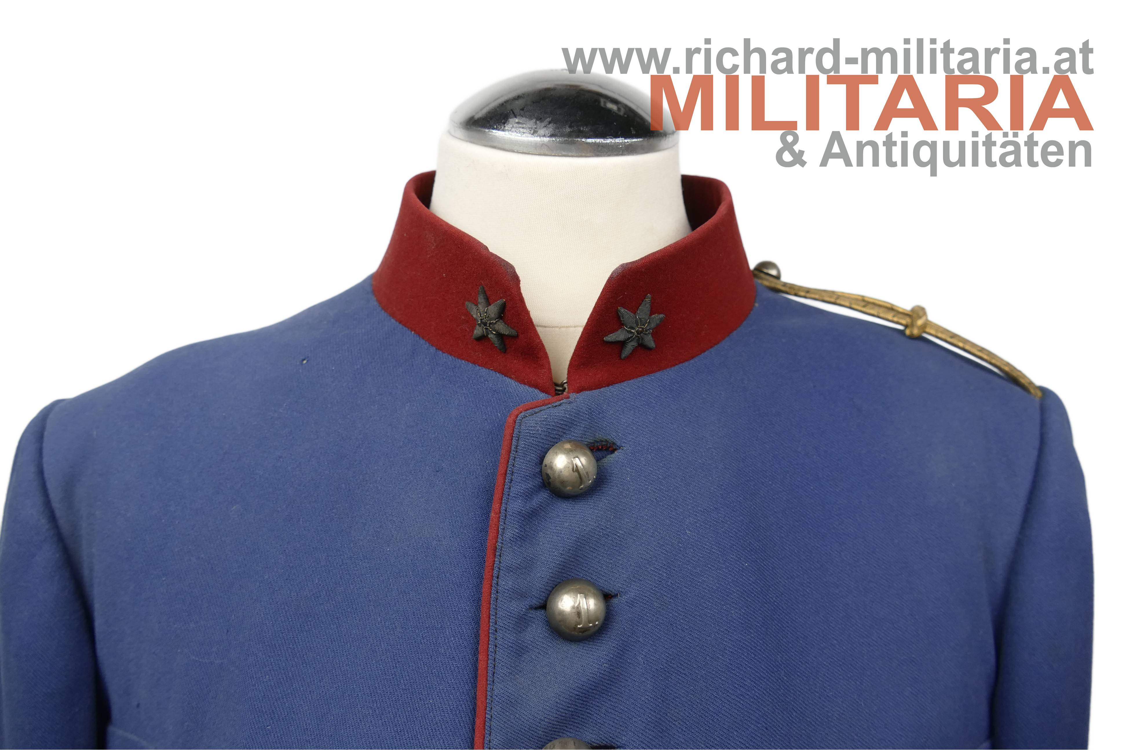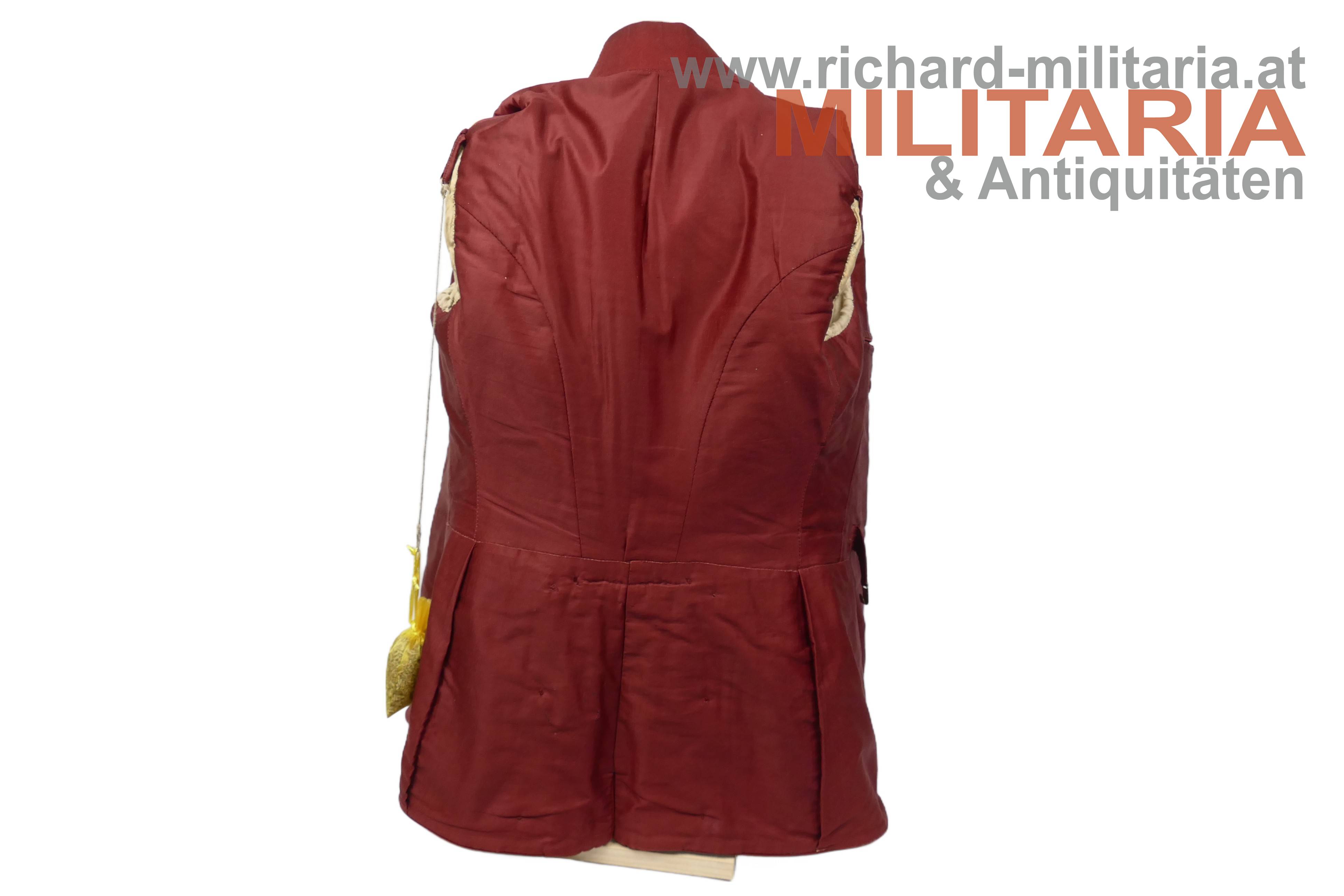 Ulanka für einen Leutnant im k.k. Landwehr-Ulanen-Regiment Nr. 1, nach der Adjustierungsvorschrift 1910/11; feines lichtblaues Tuch mit krapproten Vorstößen, Kragen und Ärmelaufschlägen; einreihig zu 11 silbernen Knöpfen - alle mit der Regimentsnummer "1"; auf der linken Schulter goldene, schwarz durchwirkte Achselschlinge ebenfalls von einem silbernen Knopf mit Regimentsnummer 1 gehalten; an den Ärmelaufschlägen und Schoßteil am Rücken ebenfalls silberne Knöpfe mit Regimentsnummer 1, am Schoßteil der sogenannte "Wasserfall" aufgenäht; innen mit krapproter Seite ausgelegt; kein Hersteller- oder Trägeretikett; Bauchriemen mit Hersteller Josef Zimbler, Wien