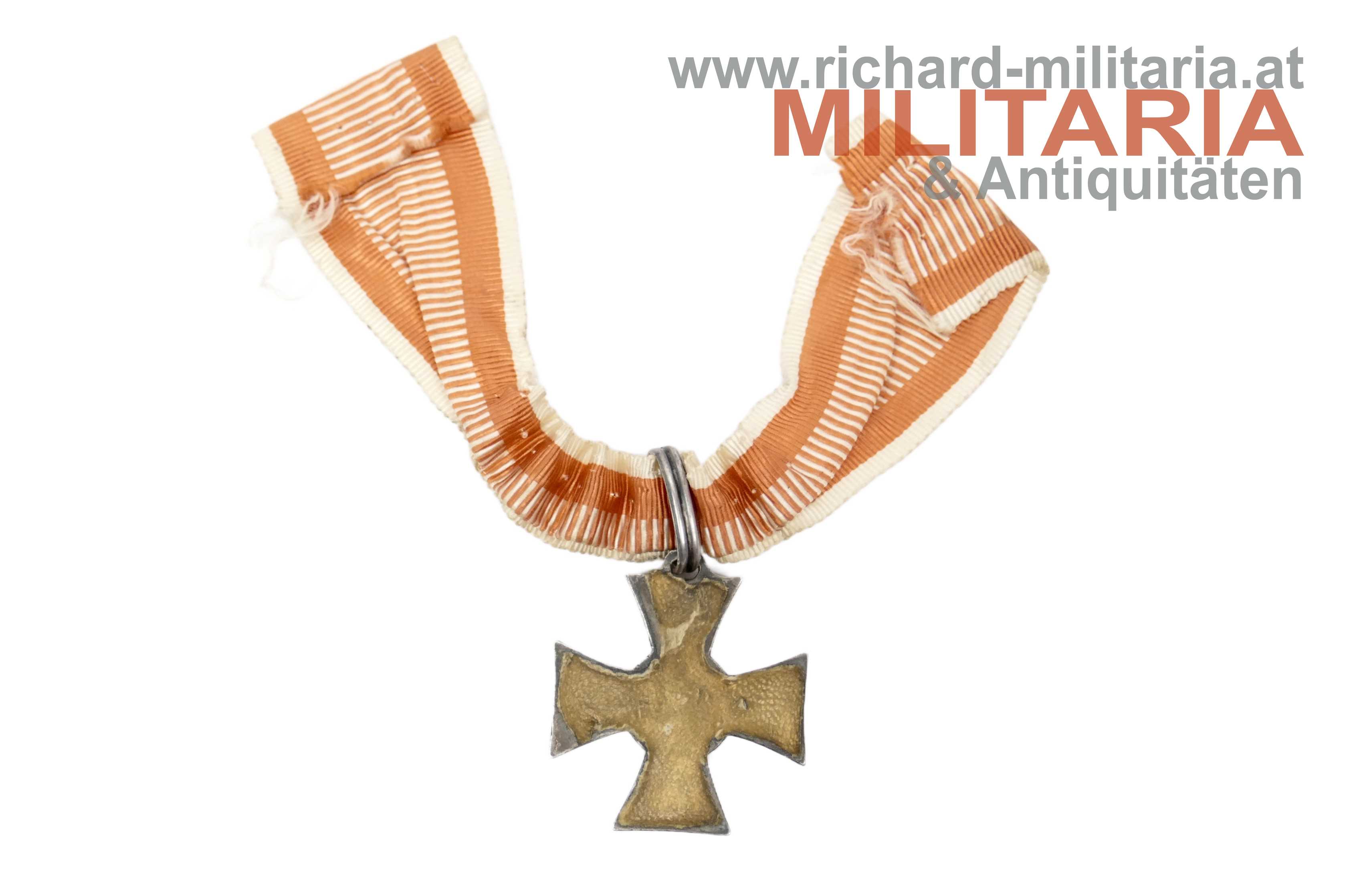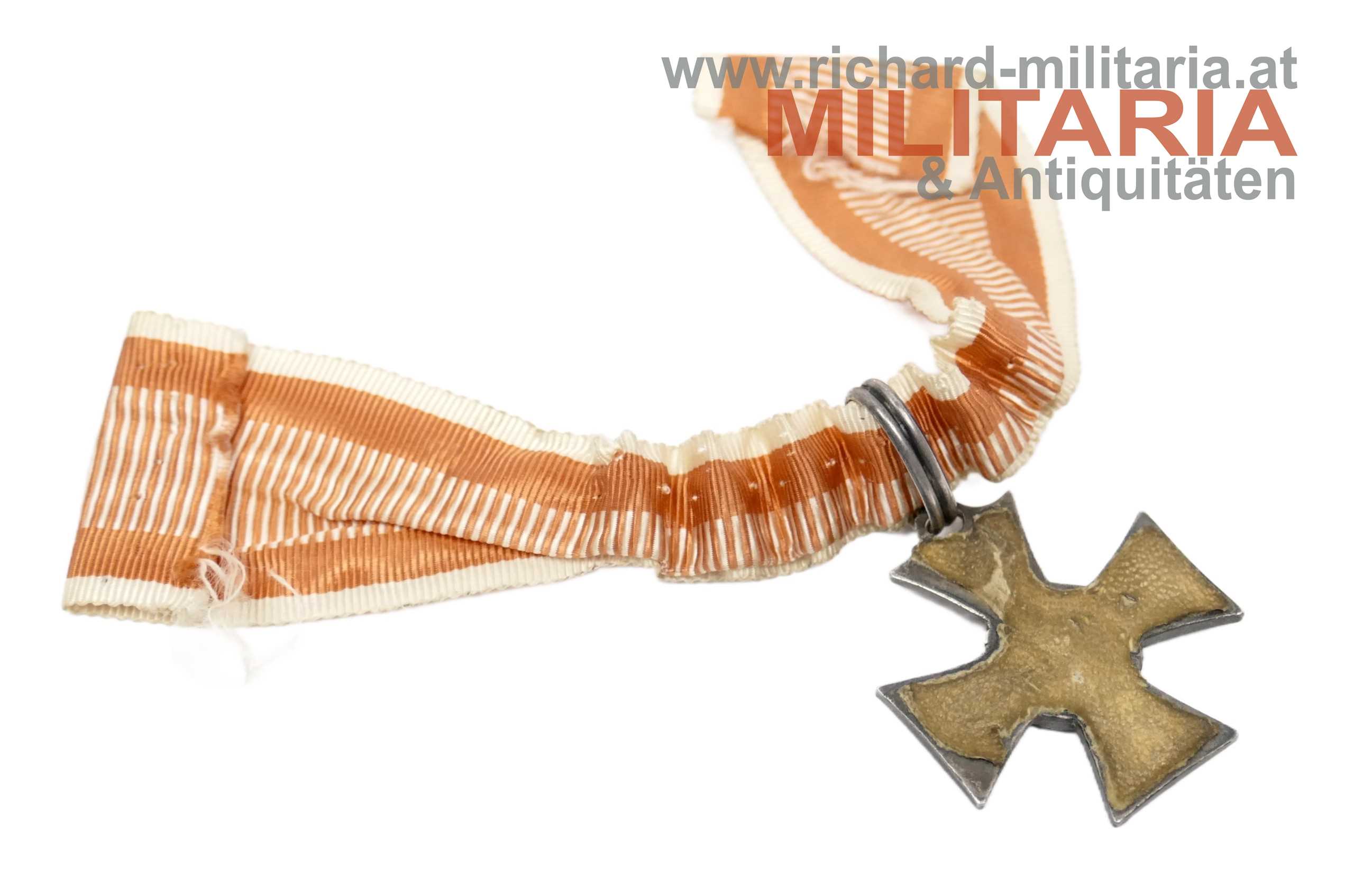 k.k. Militärverdienstkreuz - 1. Modell 1849; Silber unpunziert und der Vorderseite emailliert; Emaillierung rund um "Verdienst" etwas beschädigt - hier sieht man recht gut die Blattgoldfolie, mit welcher die rote Emaillierung unterlegt war; Emaillierung auf den Kreuzarmen einwandfrei; revers mit Lederauflage zum Schutz der Uniform (!); großer ovaler Bandring; passendes jedoch etwas späteres Durchzugsband in sehr guter Erhaltung;