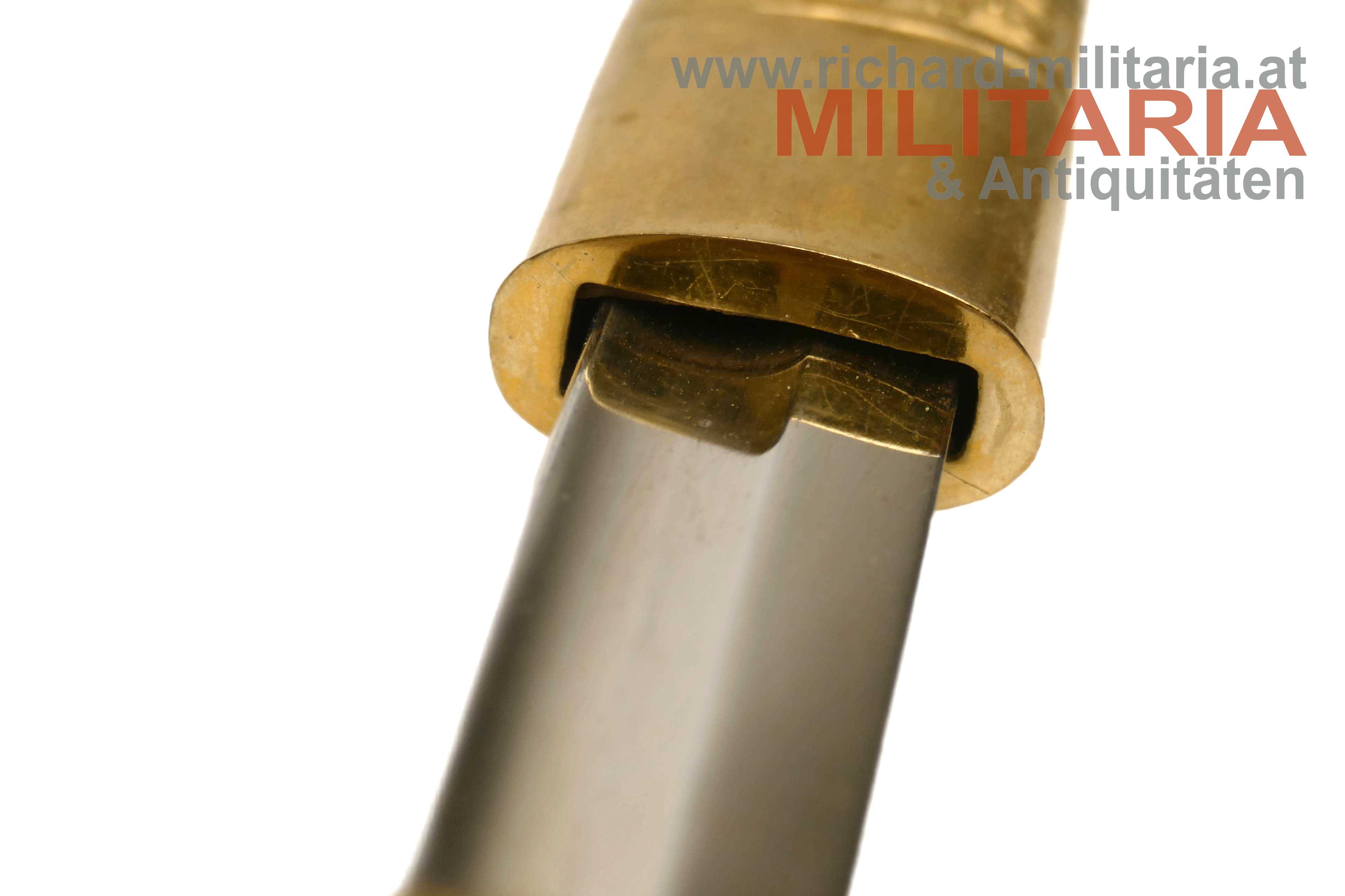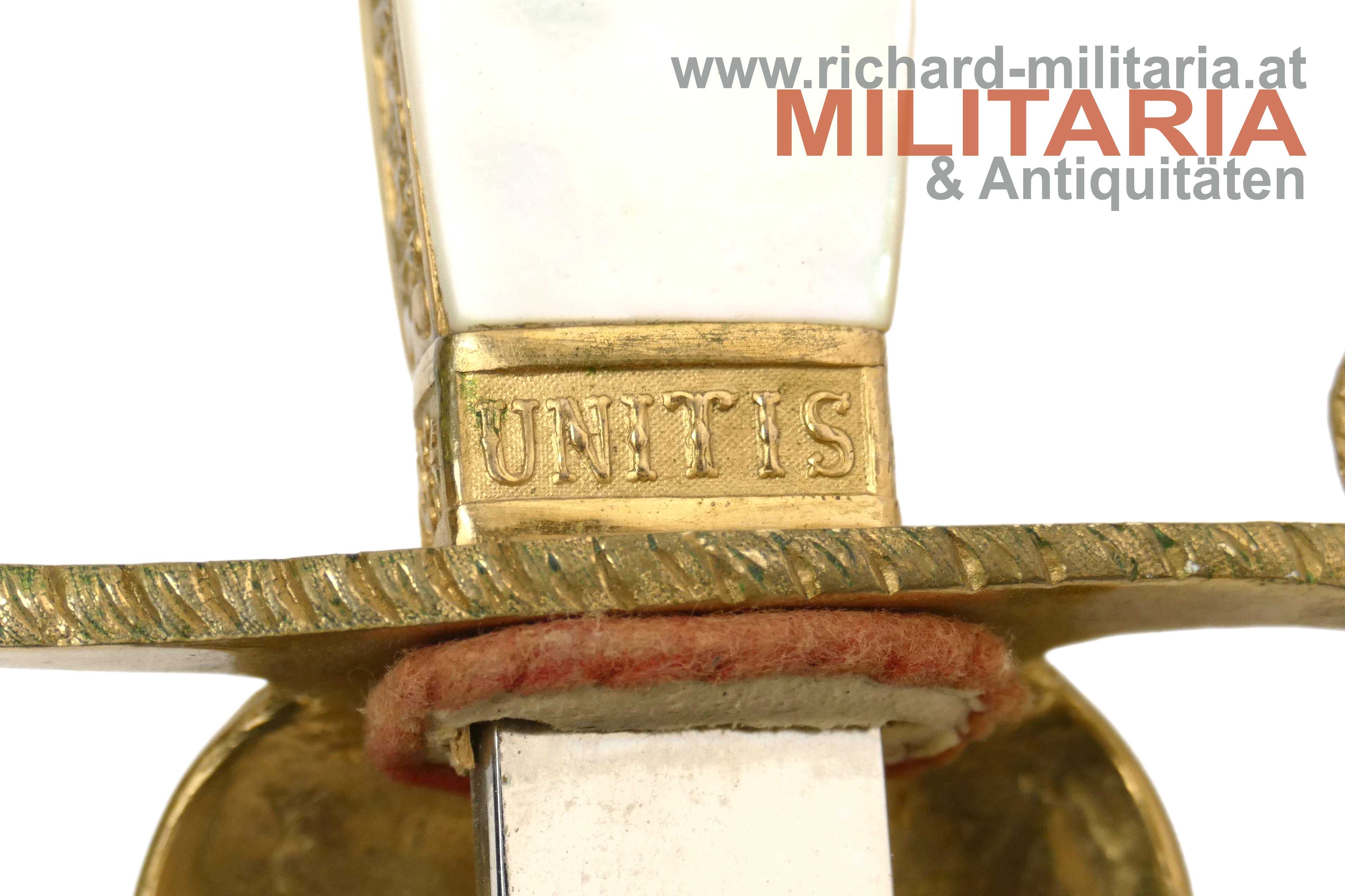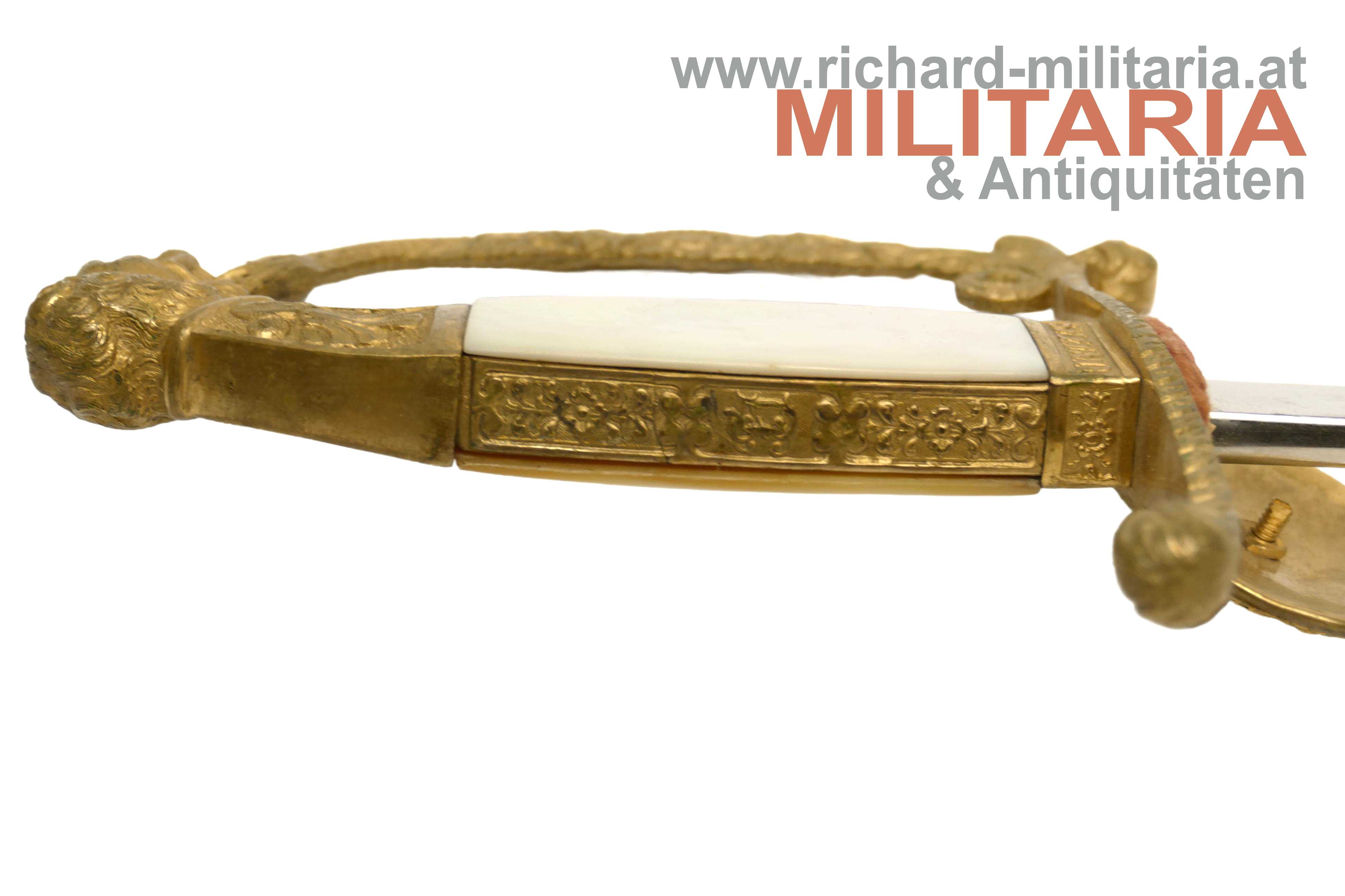 k.k. Staatsbeamten-Degen M1849 mit Degentasche; vernickelte beidseitig gekehlte Klinge in nahezu perfekter Erhaltung (!); Klinge ohne Hersteller; reich verzierter Korb aus vergoldeter Bronze; beidseitig mit fest sitzenden Perlmuttgriffschalen; zwischen Griffschallen und Stichblatt der Wahlspruch des Kaisers auf beide Seiten aufgeteilt "Viribus - Unitis"; Lederscheide krakeliert mit leichteren Abnutzungsspuren; oben und unten mit vergoldeten Messingbeschlägen; Degen zum Tragen an der Steckkuppel; zugehöriger lederner Degensack mit einem Perlmuttknopf zum Verschließen;