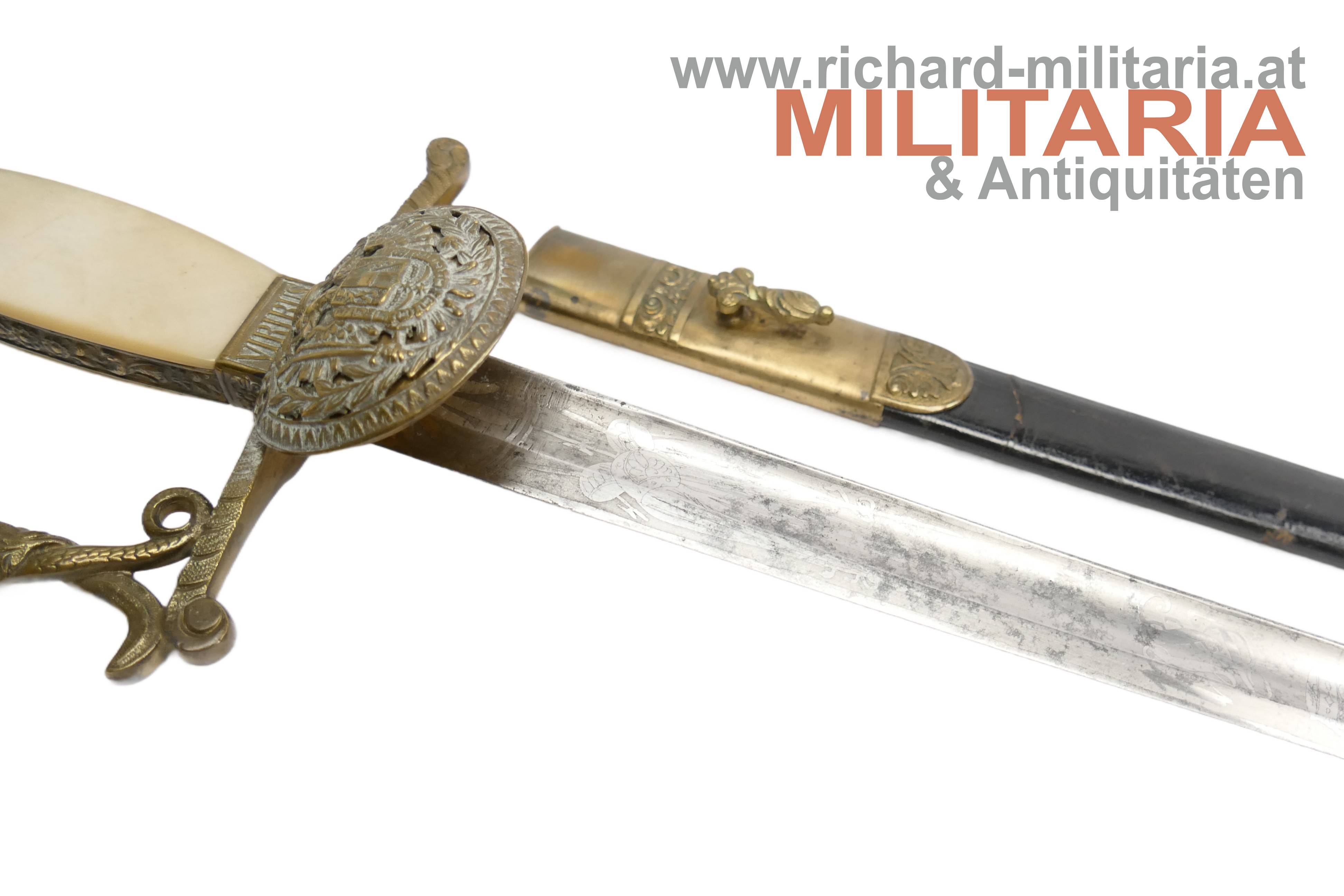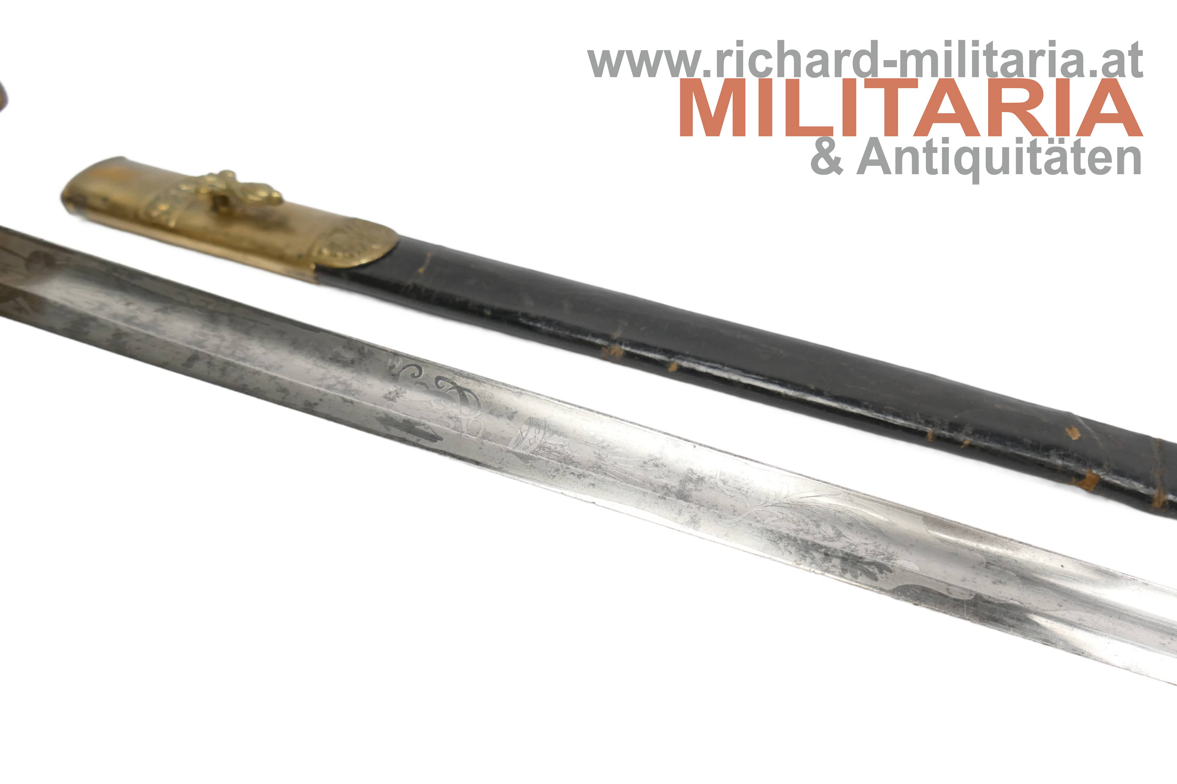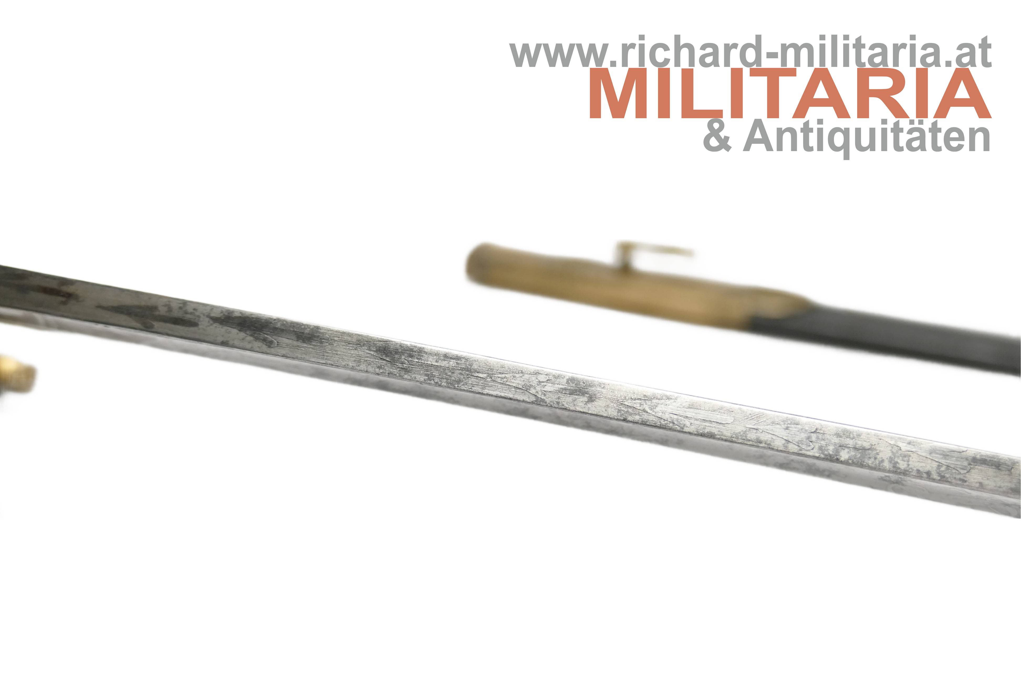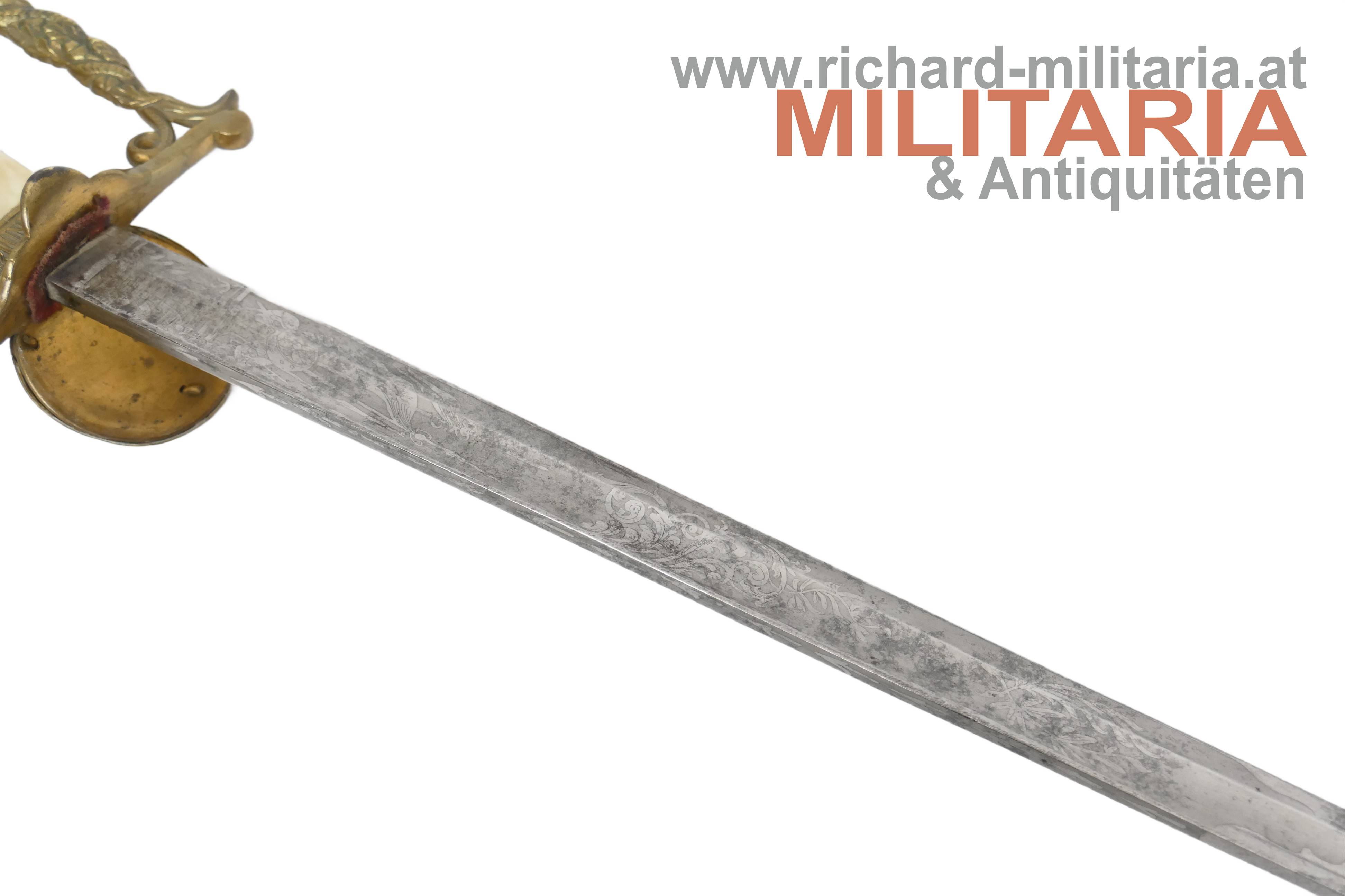 k.k. Staatsbeamtendegen M1849; beidseitig gekehlte, vernickelte Rückenklinge mit Klingenätzung; beidseitig mit Kriegstrophäen und floralen Verzierungen geätzt; einseitig zusätzlich der Allerhöchste Namenszug "FJ1" überhöht von der Kaiserkrone; reichlich verzierter Korb und Griff in Standardausführung; beidseitig eingesetzte Perlmutt-Griffeinlagen; Lederscheide mit Messingbeschlägen; am oberen Messingbeschlag ein Tragehaken für die Steckkuppel; Lederscheide mittig mit einem Knick;