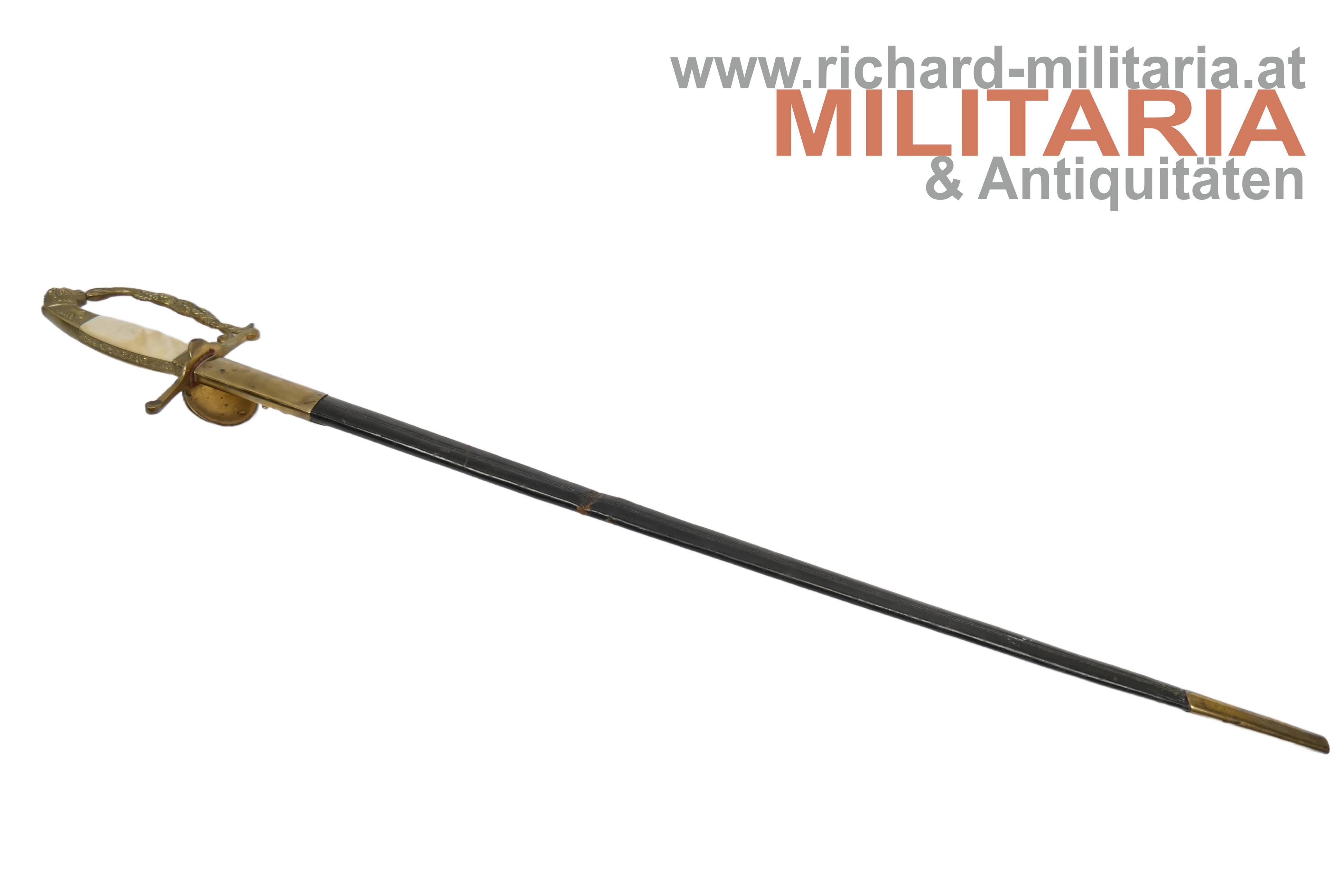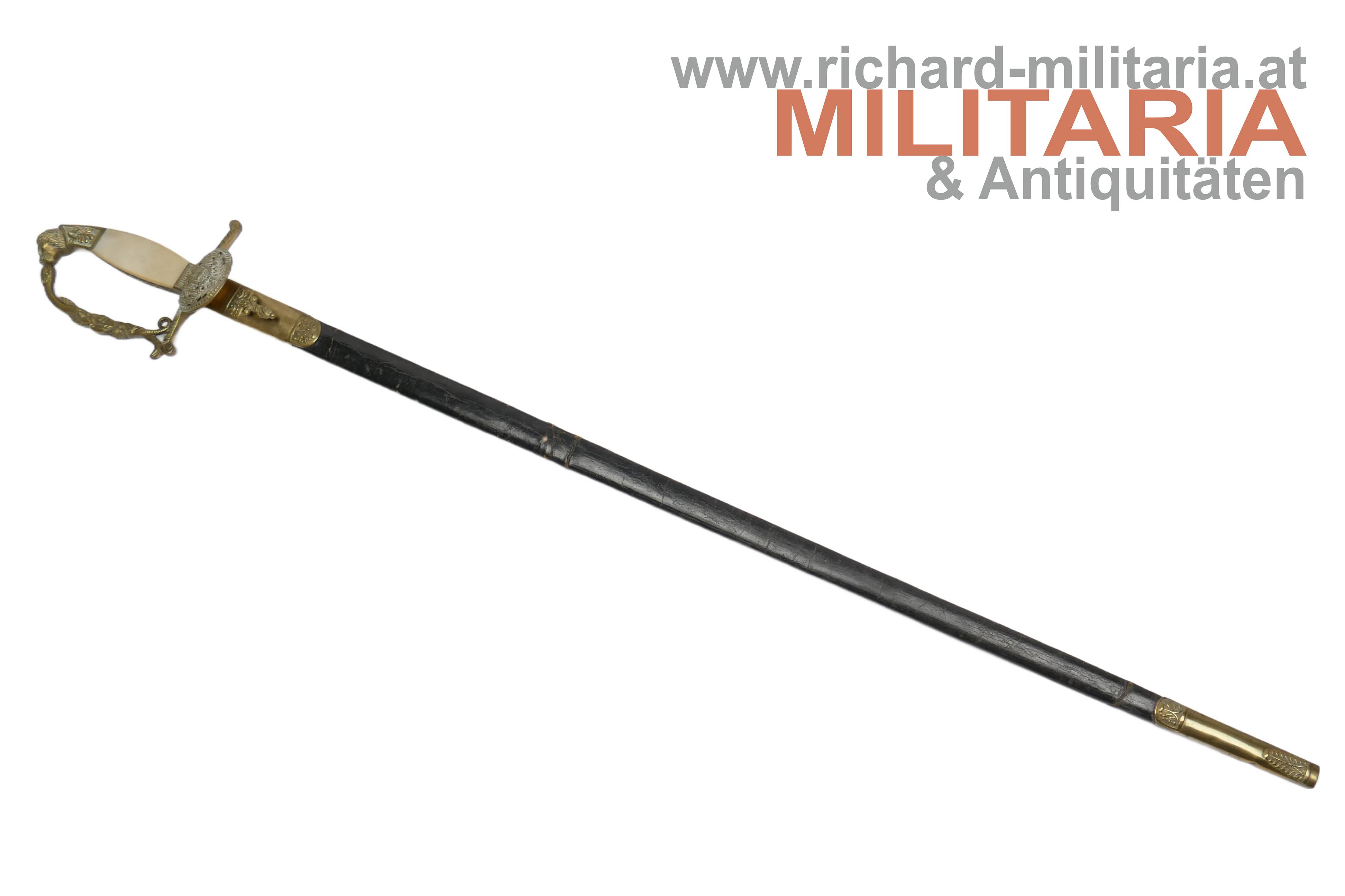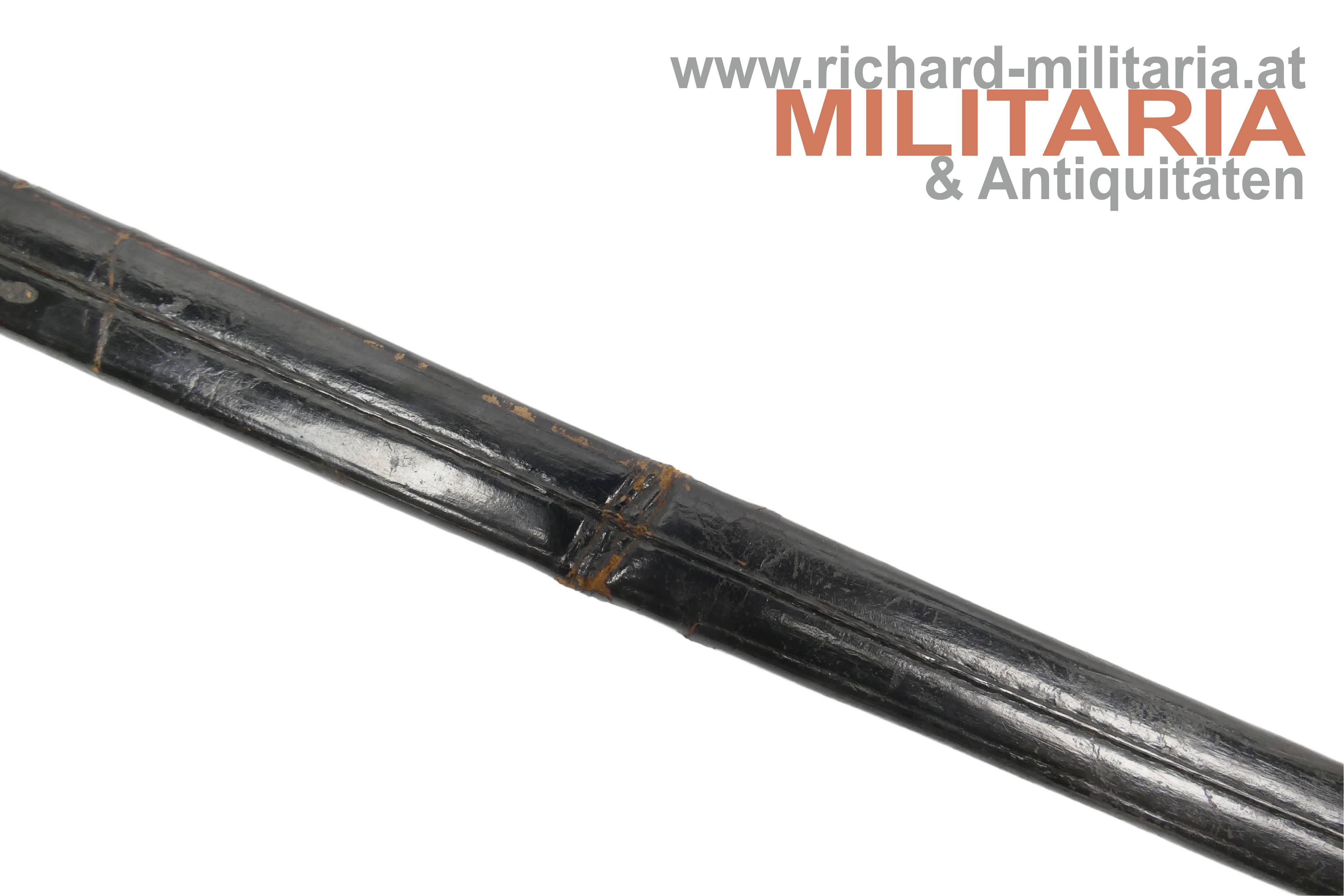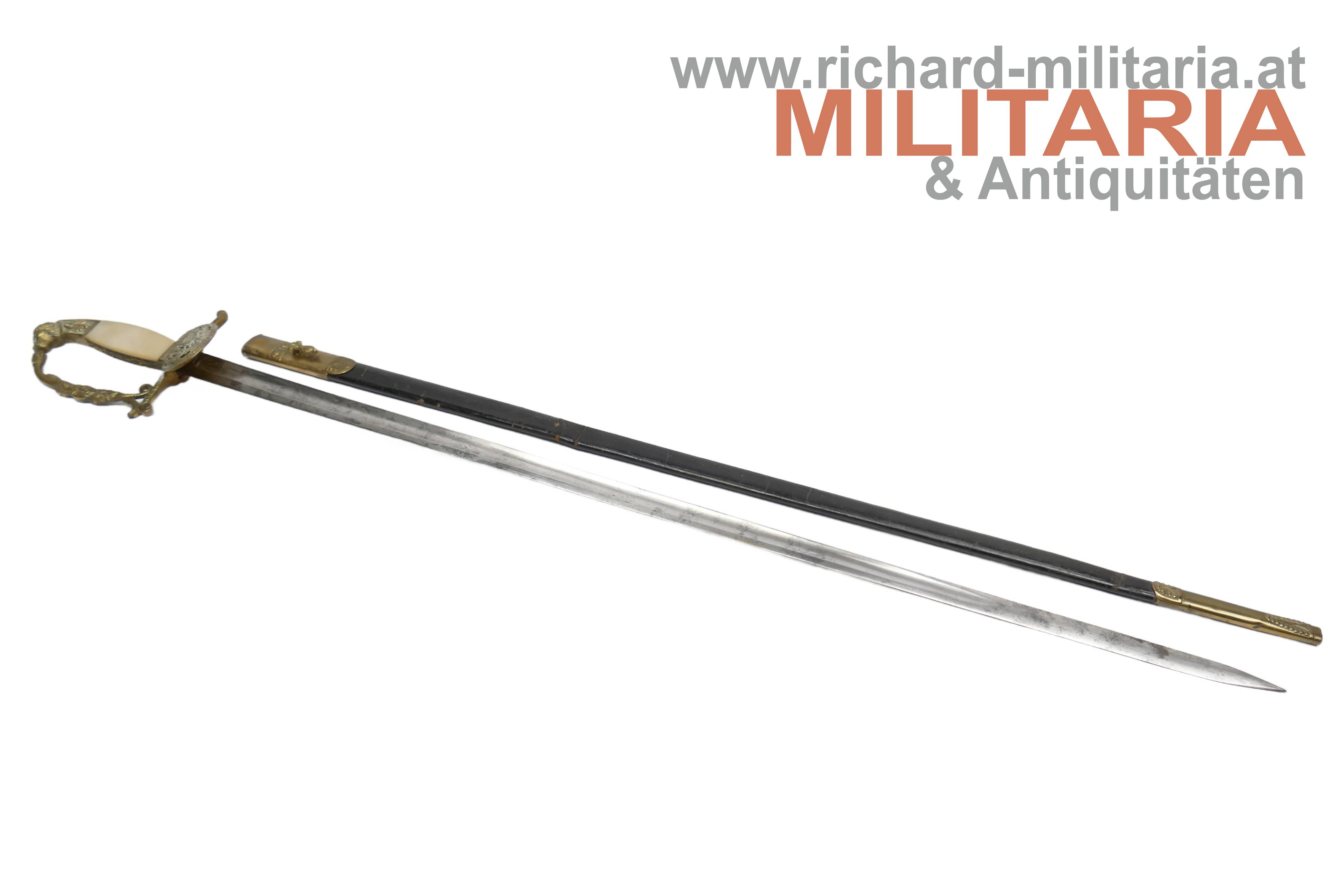 k.k. Staatsbeamtendegen M1849; beidseitig gekehlte, vernickelte Rückenklinge mit Klingenätzung; beidseitig mit Kriegstrophäen und floralen Verzierungen geätzt; einseitig zusätzlich der Allerhöchste Namenszug "FJ1" überhöht von der Kaiserkrone; reichlich verzierter Korb und Griff in Standardausführung; beidseitig eingesetzte Perlmutt-Griffeinlagen; Lederscheide mit Messingbeschlägen; am oberen Messingbeschlag ein Tragehaken für die Steckkuppel; Lederscheide mittig mit einem Knick;