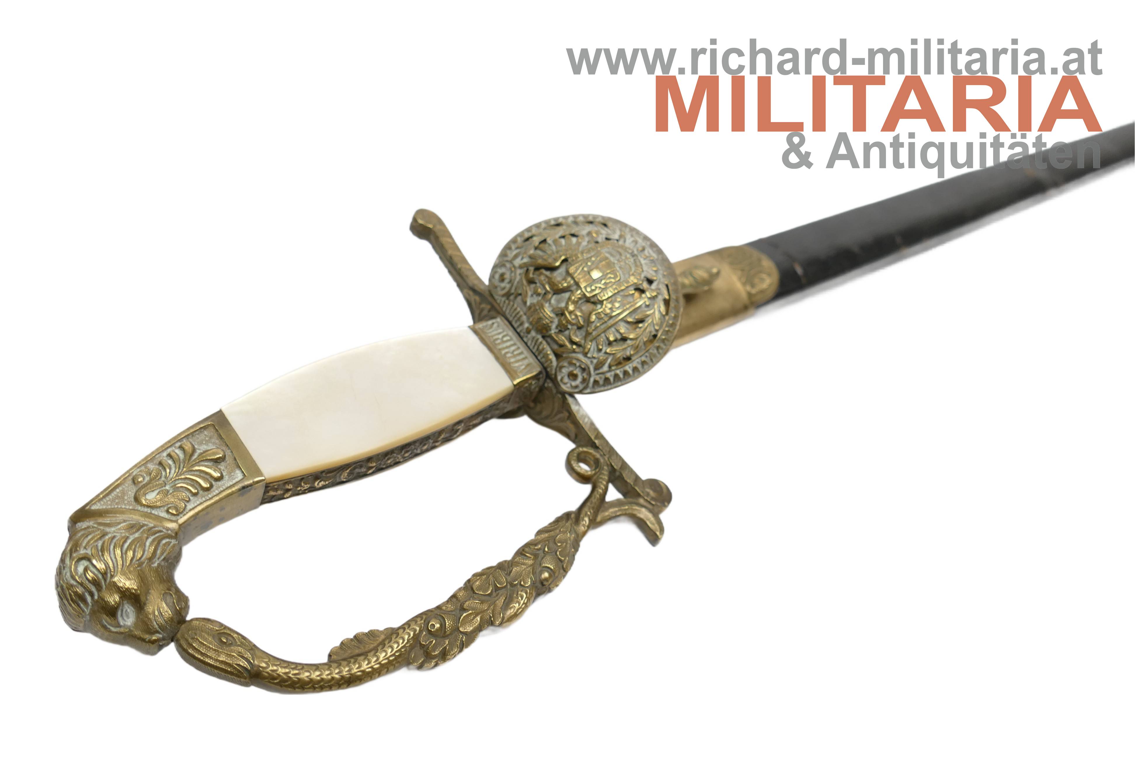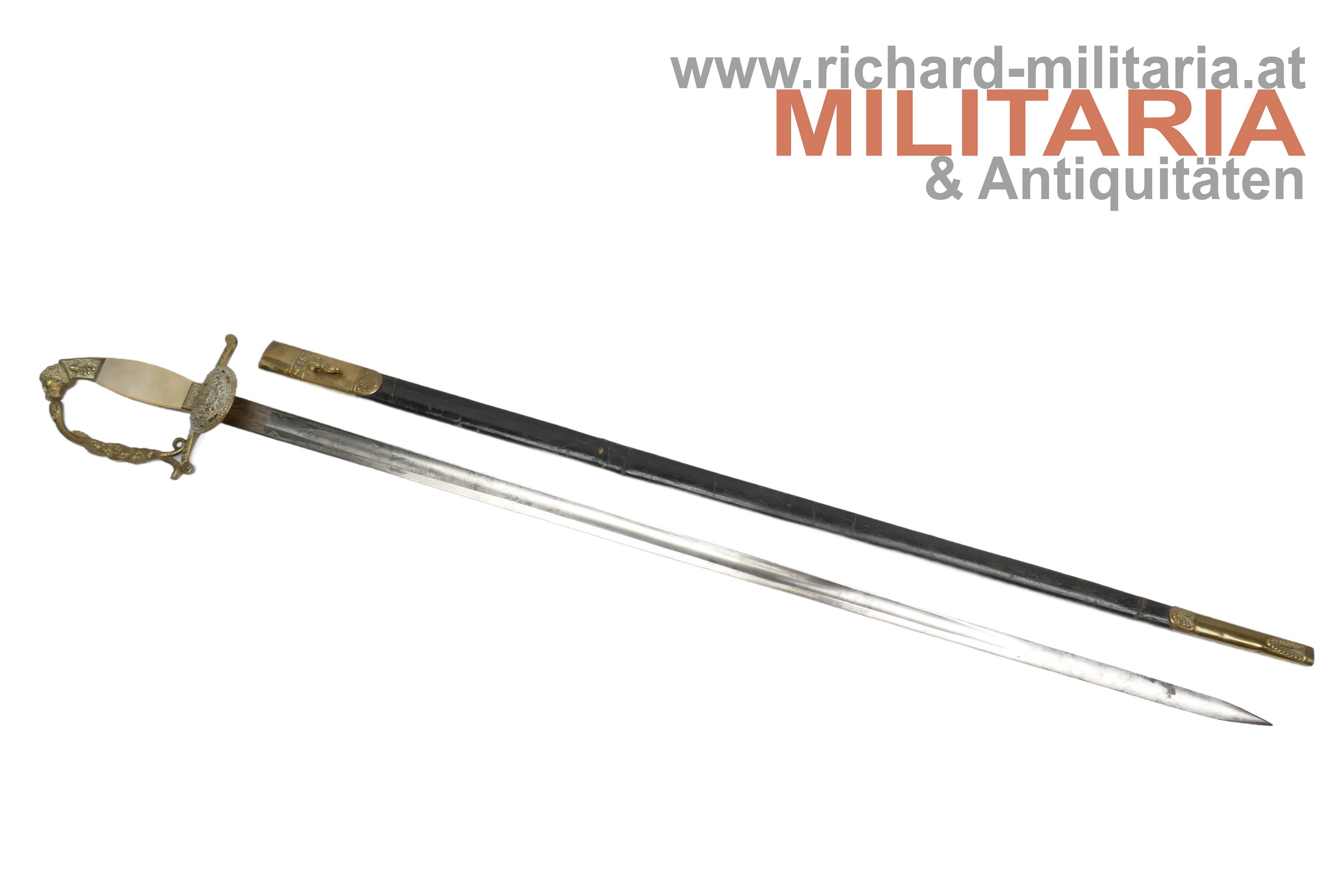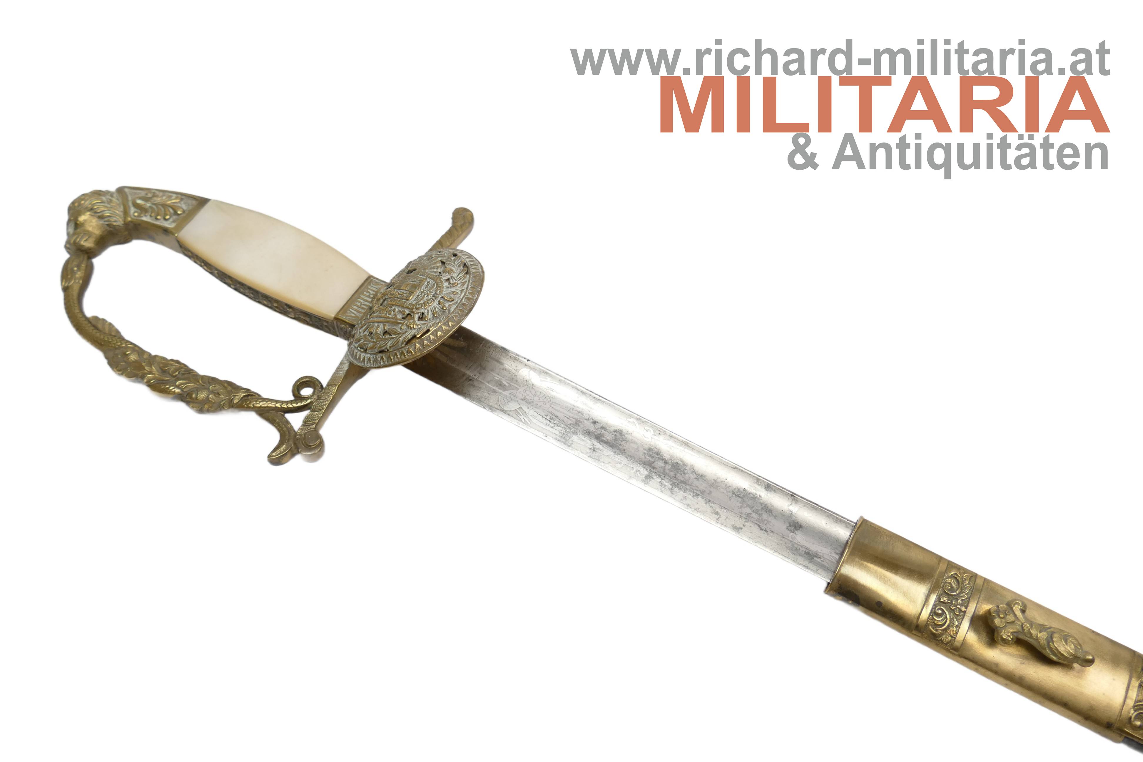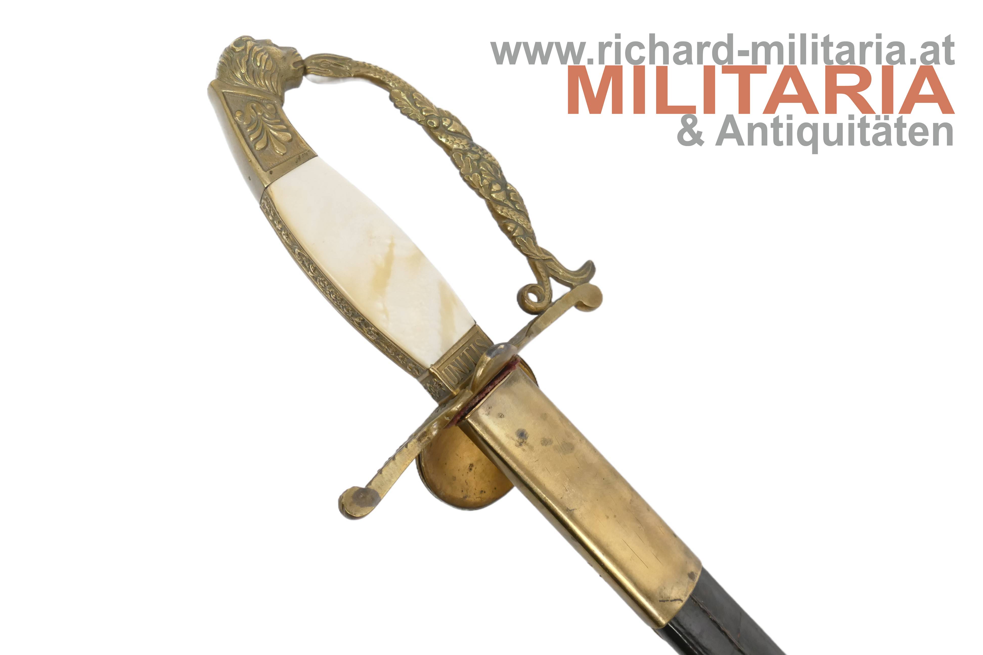 k.k. Staatsbeamtendegen M1849; beidseitig gekehlte, vernickelte Rückenklinge mit Klingenätzung; beidseitig mit Kriegstrophäen und floralen Verzierungen geätzt; einseitig zusätzlich der Allerhöchste Namenszug "FJ1" überhöht von der Kaiserkrone; reichlich verzierter Korb und Griff in Standardausführung; beidseitig eingesetzte Perlmutt-Griffeinlagen; Lederscheide mit Messingbeschlägen; am oberen Messingbeschlag ein Tragehaken für die Steckkuppel; Lederscheide mittig mit einem Knick;