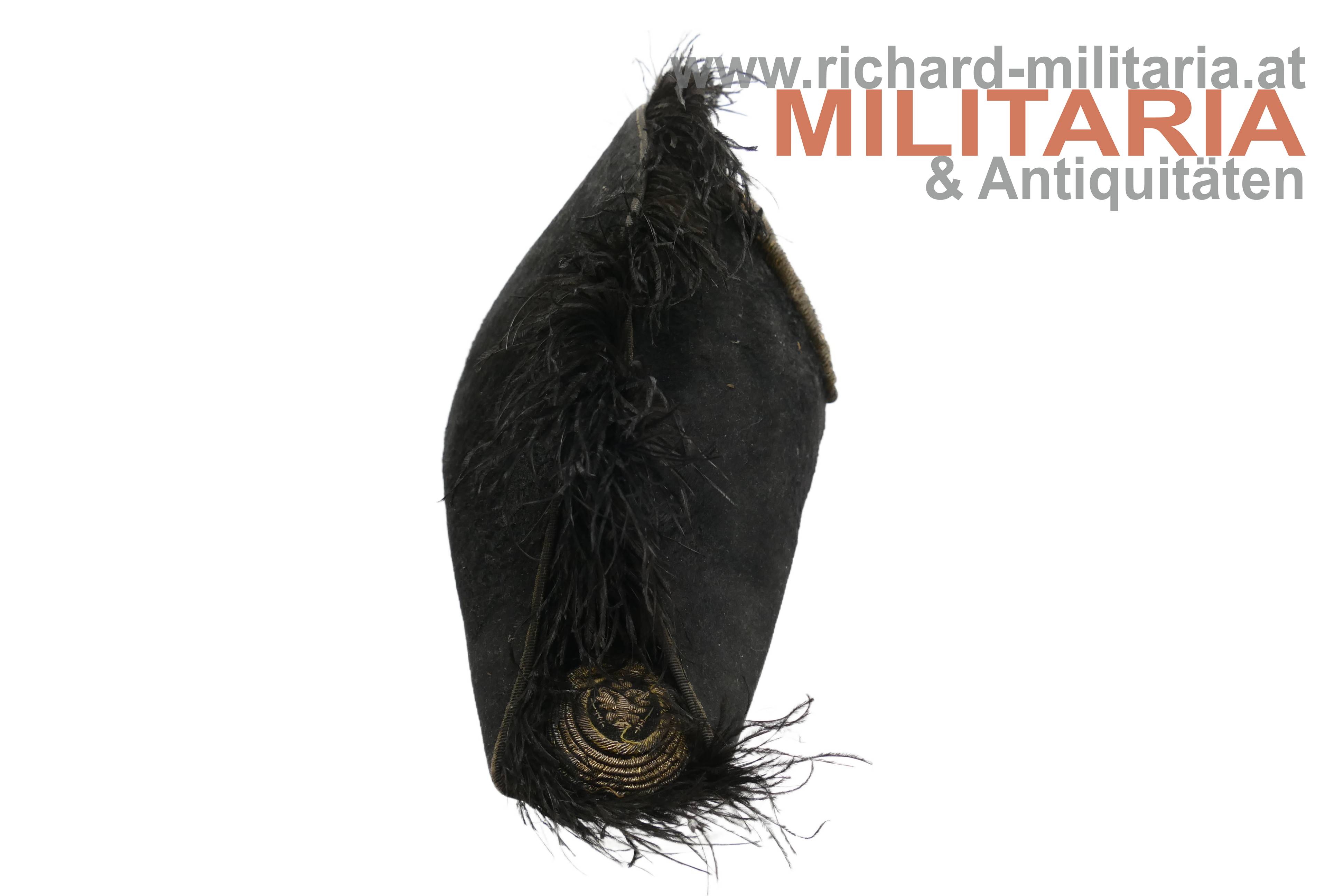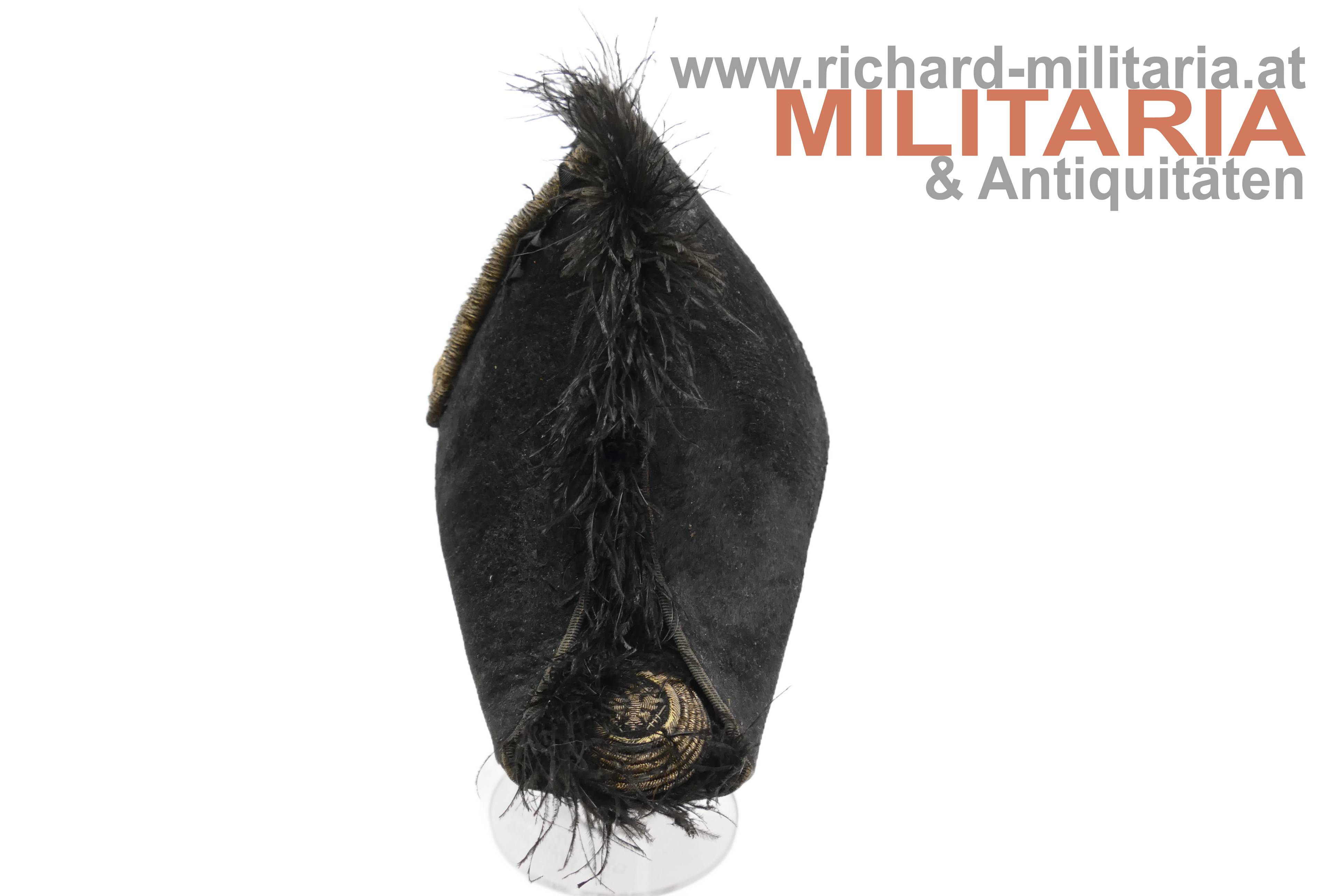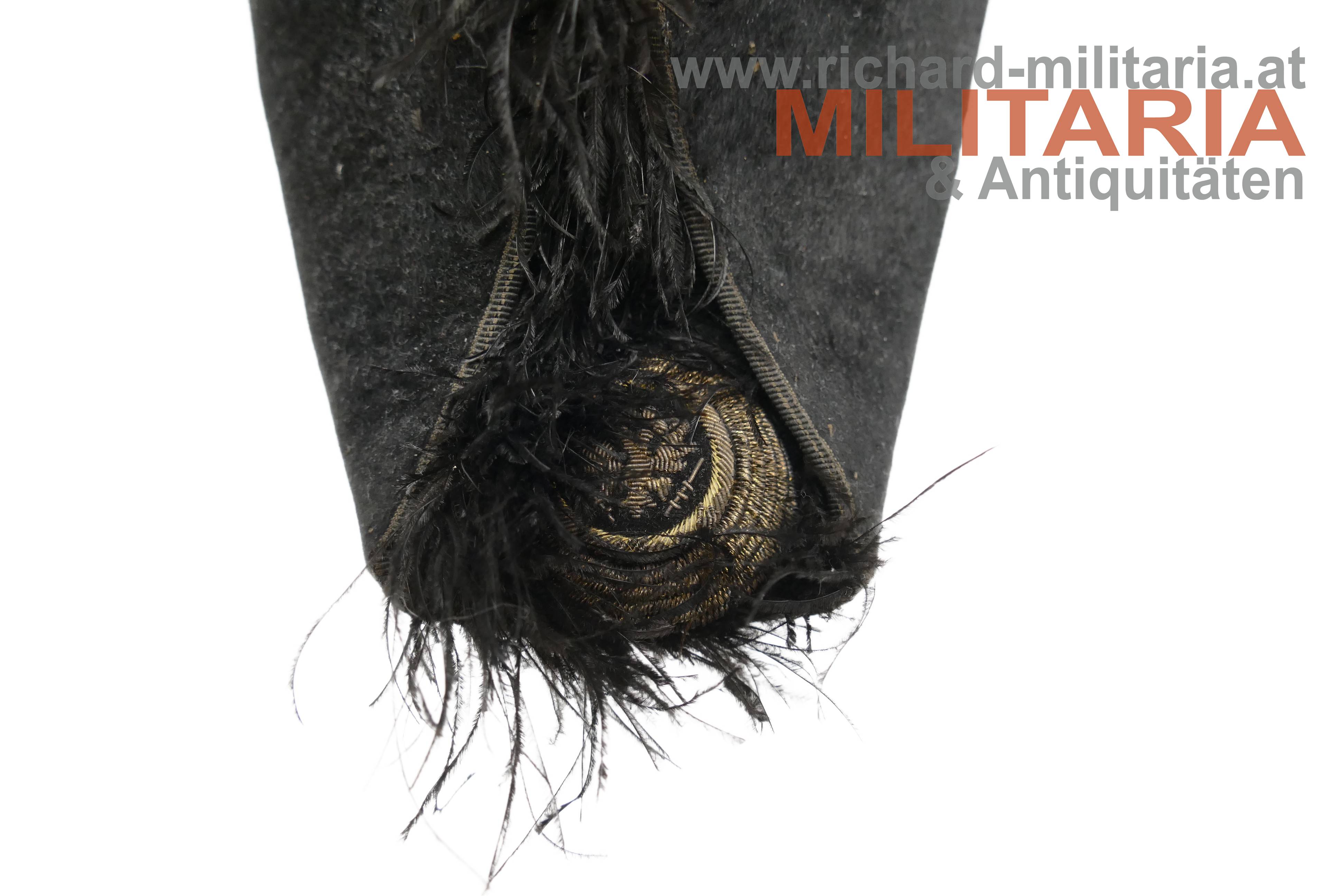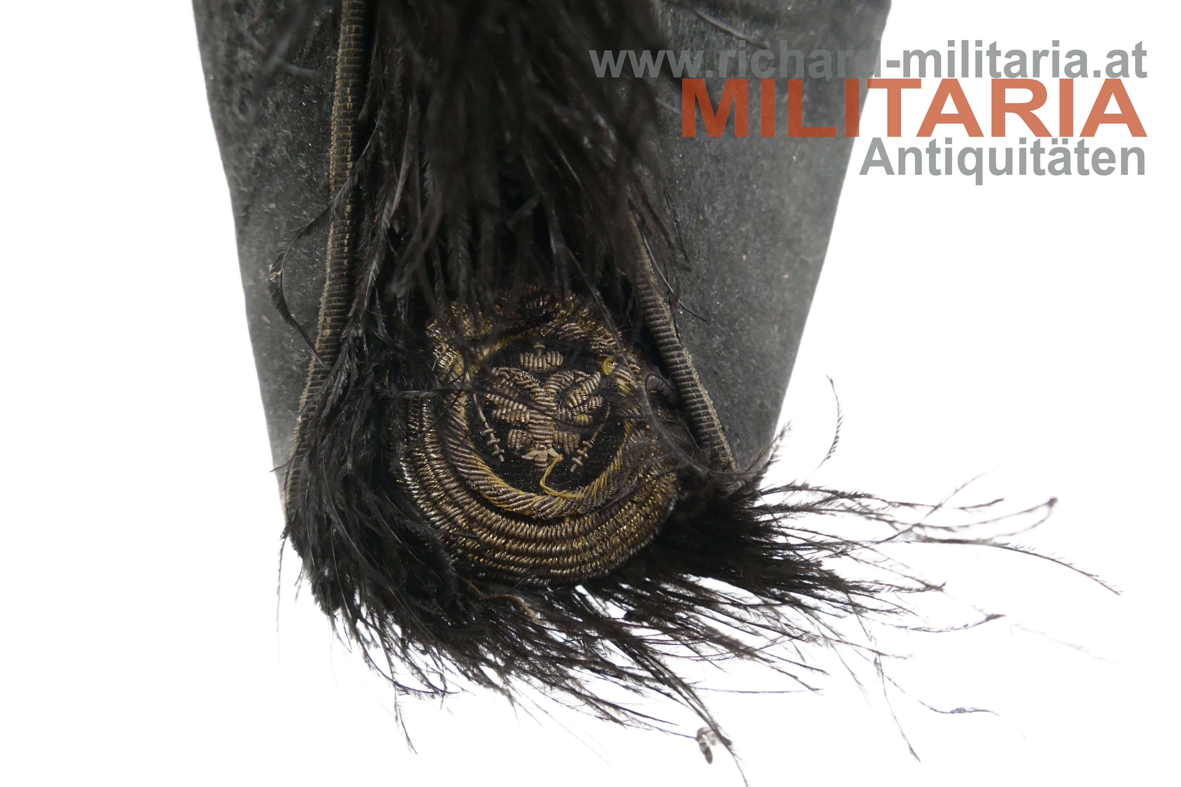 Stulphut für k.k. Beamte; frühe hohe Form - vor 1880; mit schwarzem Seidenfilz überzogener steifer Korpus, am Kamm schwarzer Straußenfedern, seitlich 6fache Goldbouillon-Schnur mit einem vergoldeten Knopf mit kaiserlichem Doppeladler gehalten; im oberen Teil mehrfach gelegtes schwarzes Morieband; in den beiden Enden je eine große, goldene Kokarde mit kaiserlichem Doppeladler; weiches hellbraunes Stirnleder und fleckiges Seidenfutter.