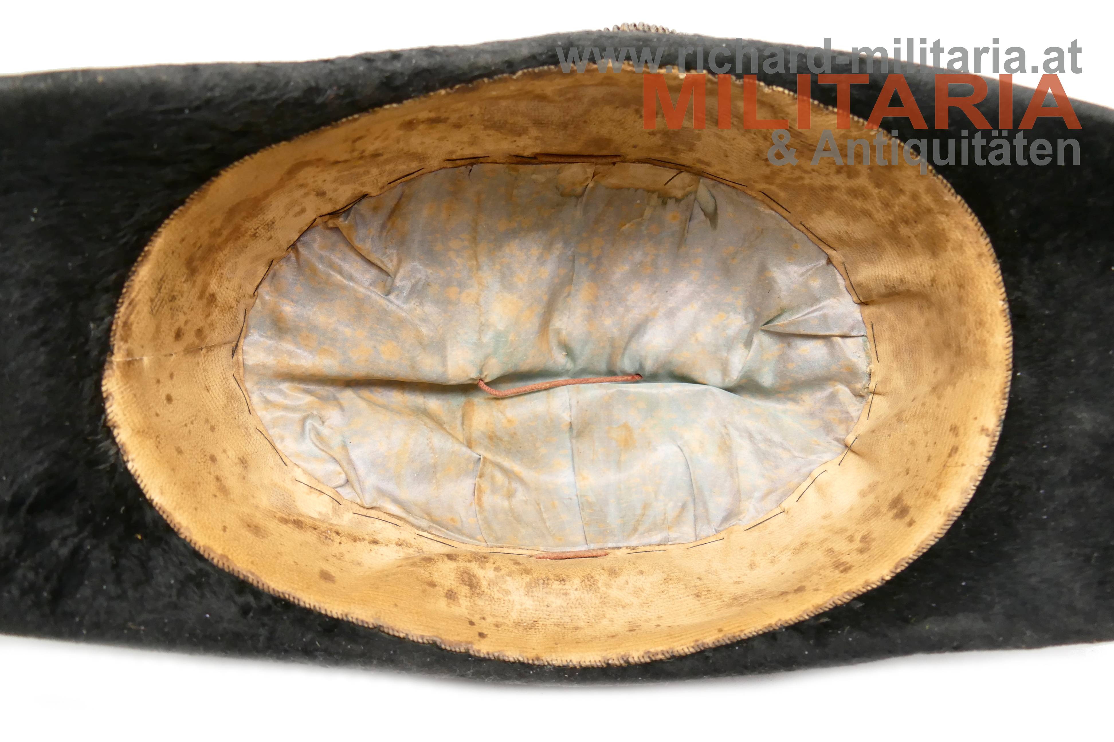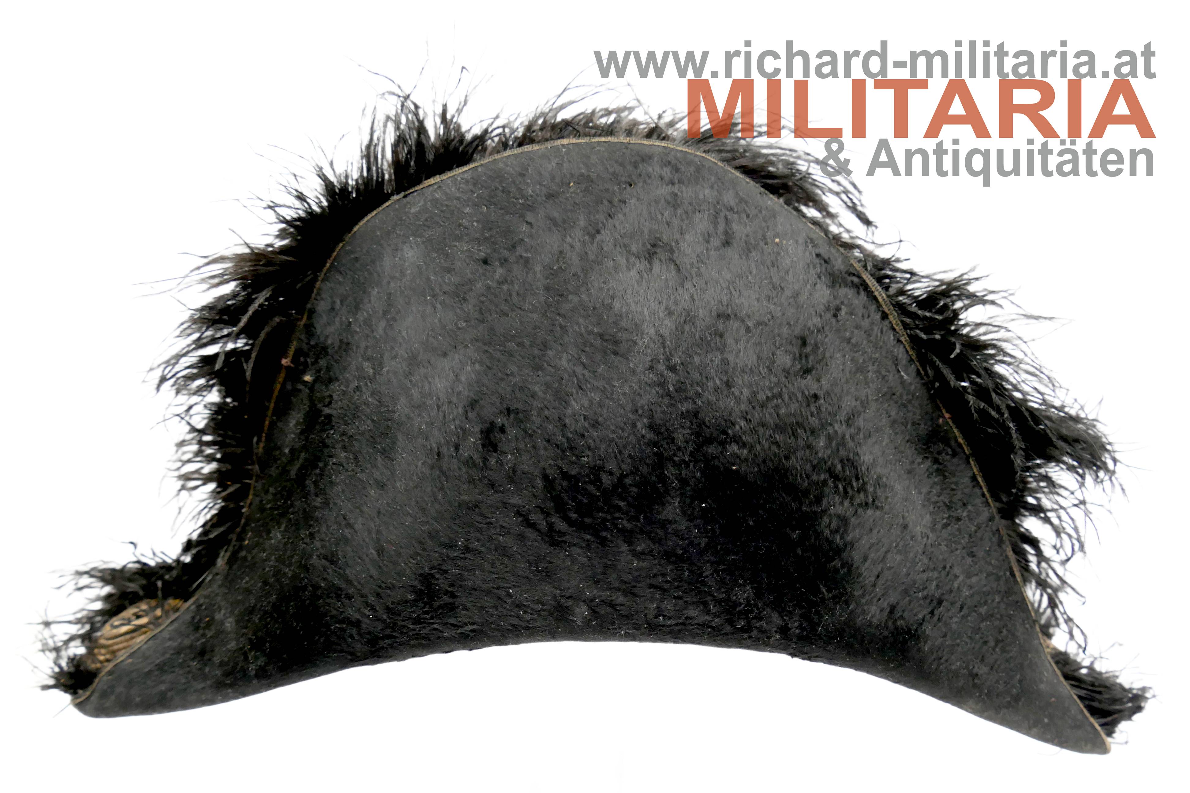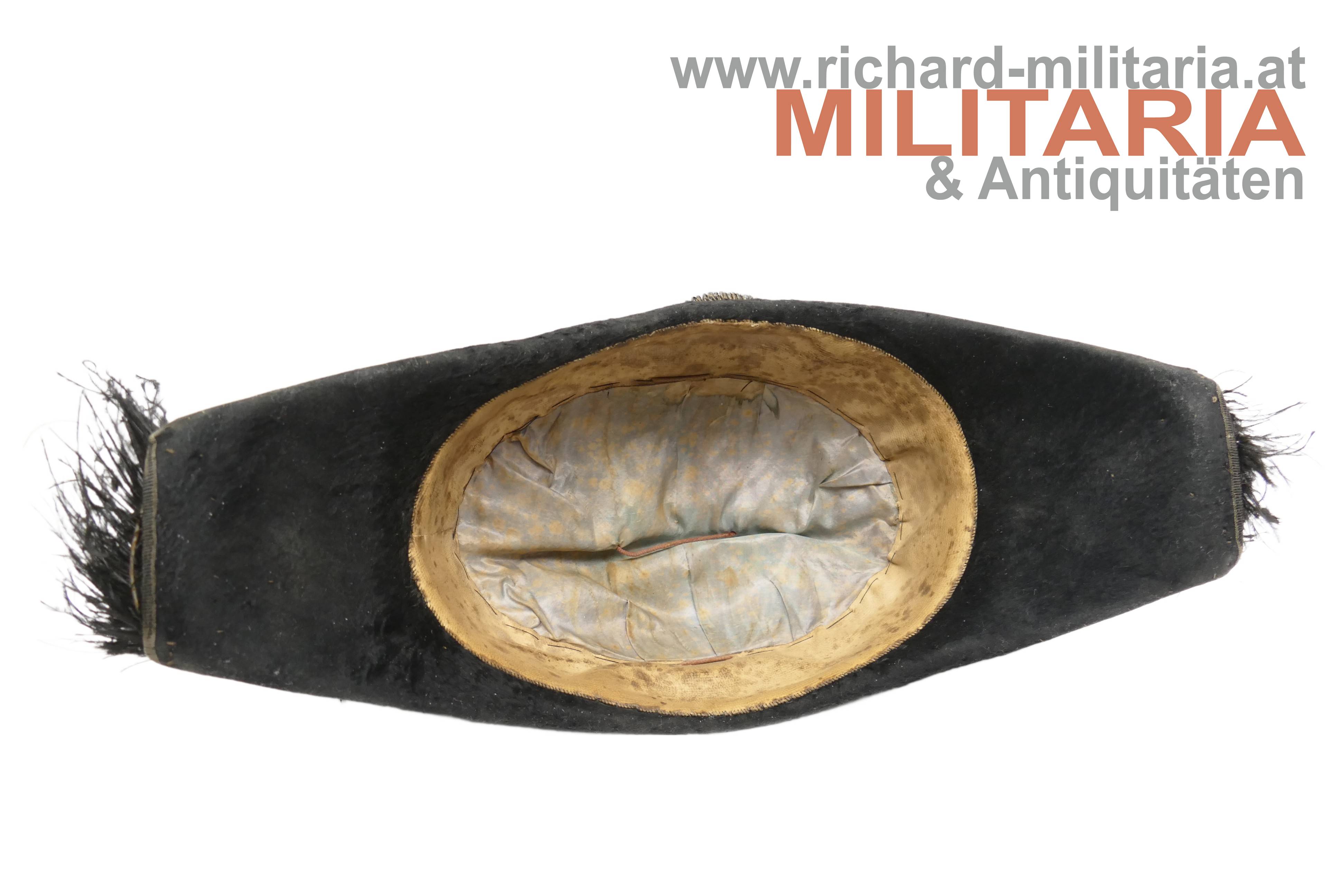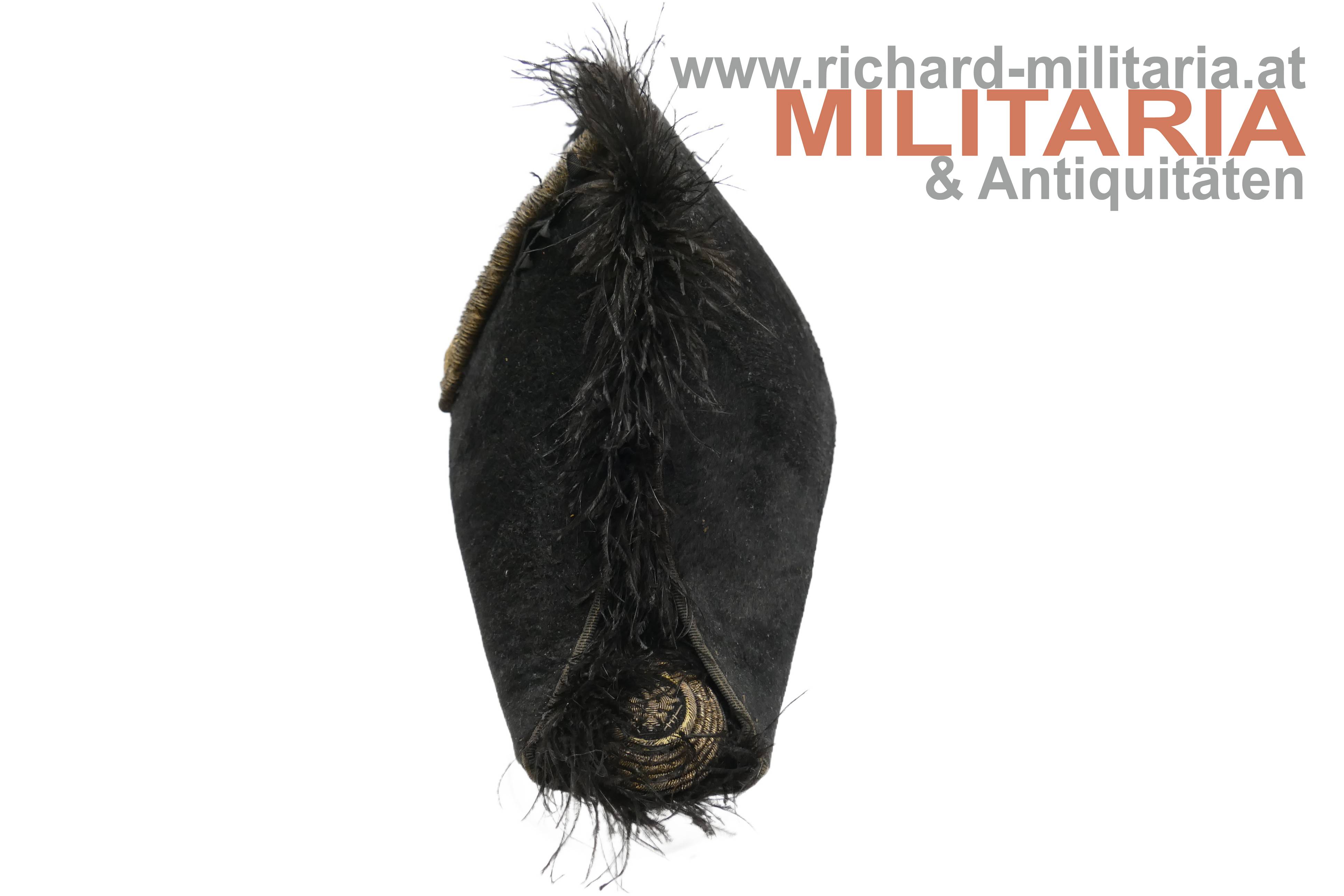 Stulphut für k.k. Beamte; frühe hohe Form - vor 1880; mit schwarzem Seidenfilz überzogener steifer Korpus, am Kamm schwarzer Straußenfedern, seitlich 6fache Goldbouillon-Schnur mit einem vergoldeten Knopf mit kaiserlichem Doppeladler gehalten; im oberen Teil mehrfach gelegtes schwarzes Morieband; in den beiden Enden je eine große, goldene Kokarde mit kaiserlichem Doppeladler; weiches hellbraunes Stirnleder und fleckiges Seidenfutter.