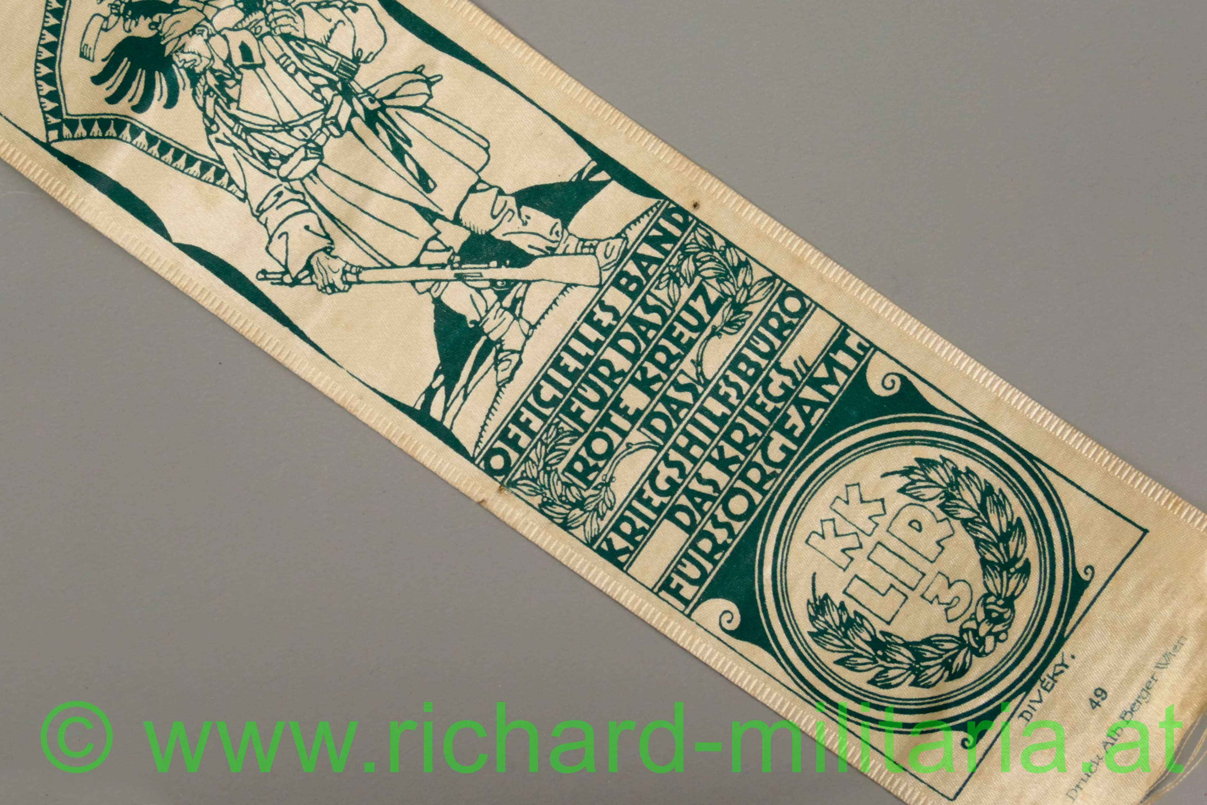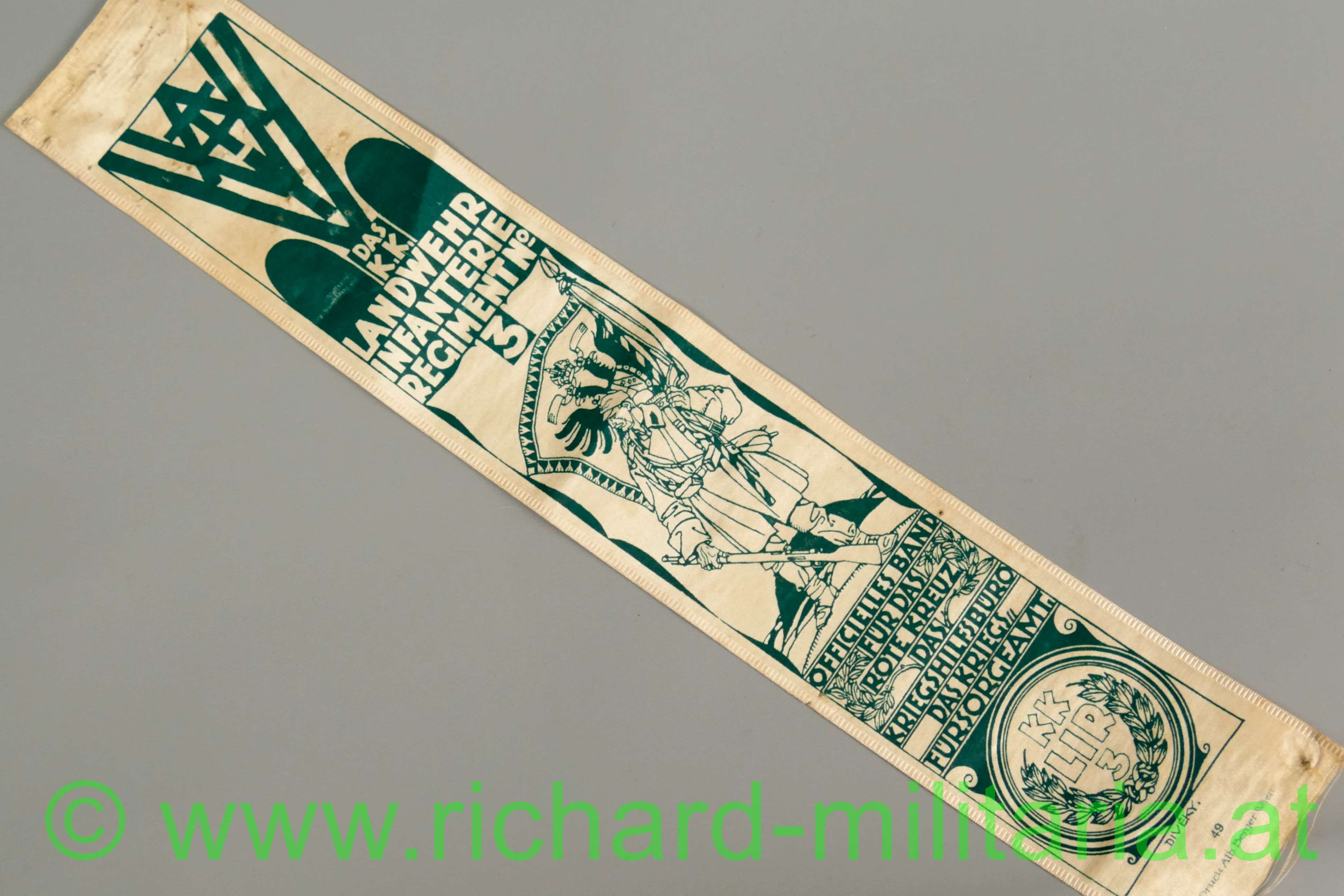 k.k. VIVAT-Band - Landwehr Infanterie Regiment Nr. 3; weißes Seidenband mit grünen Aufdruck; einseitig bedruckt; Länge: 37,5cm