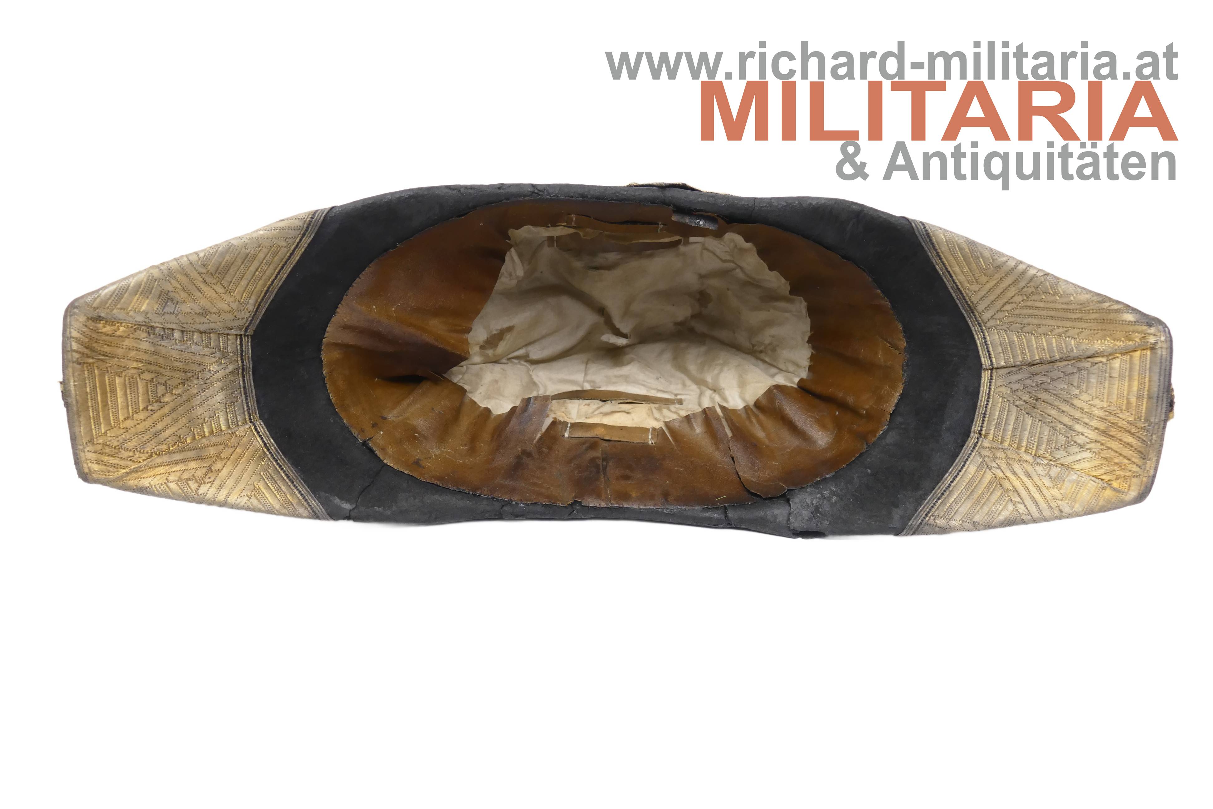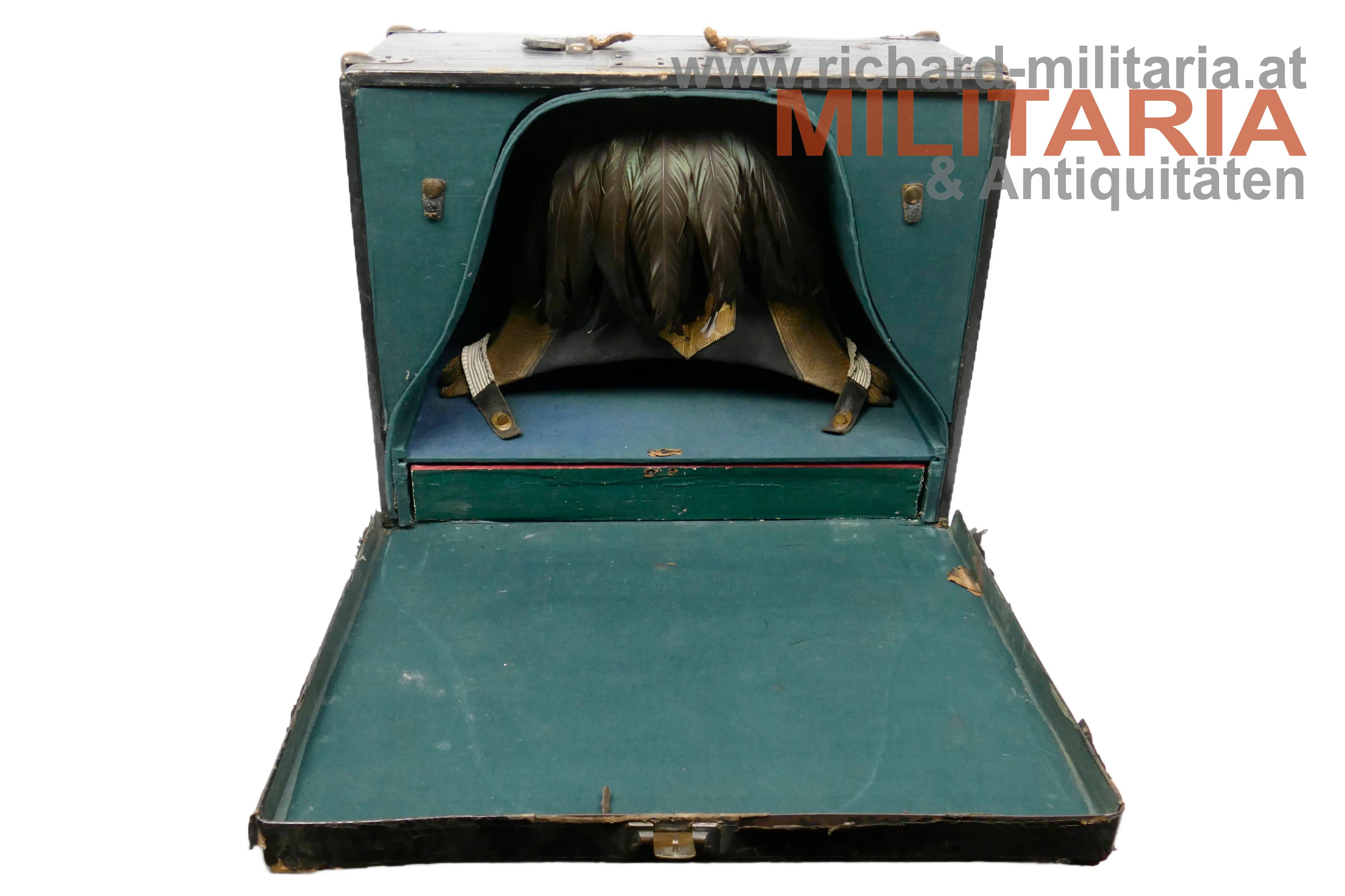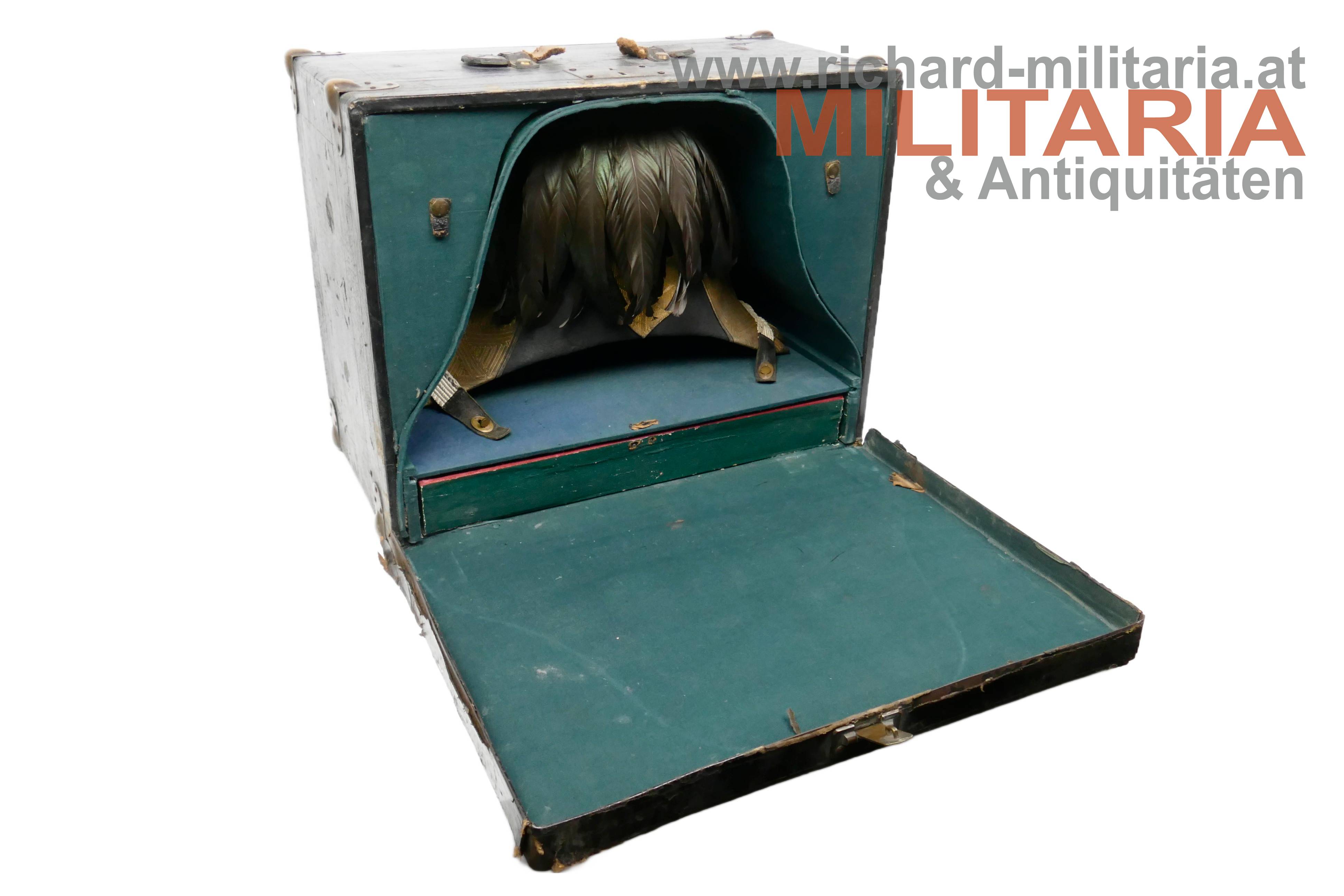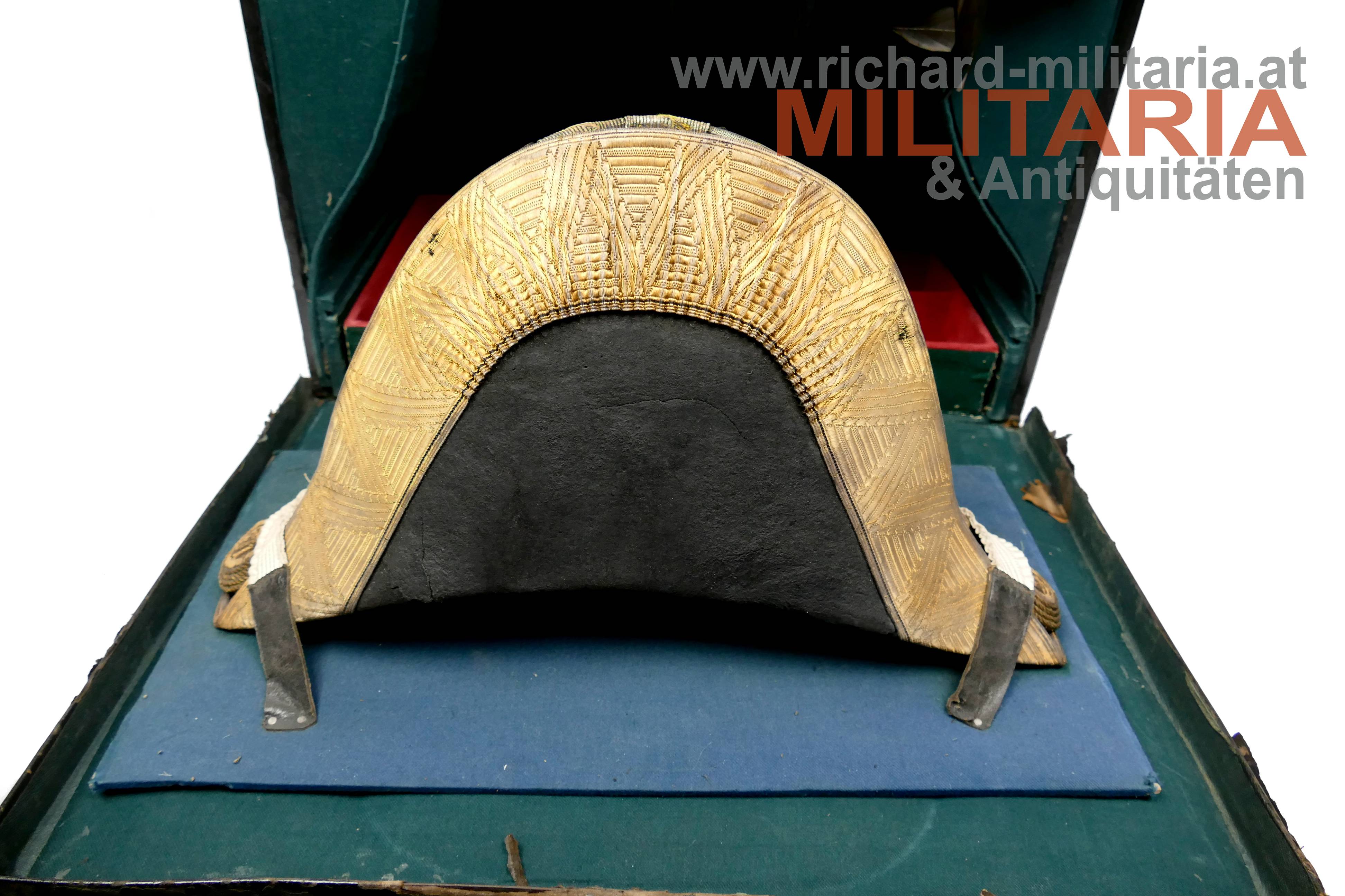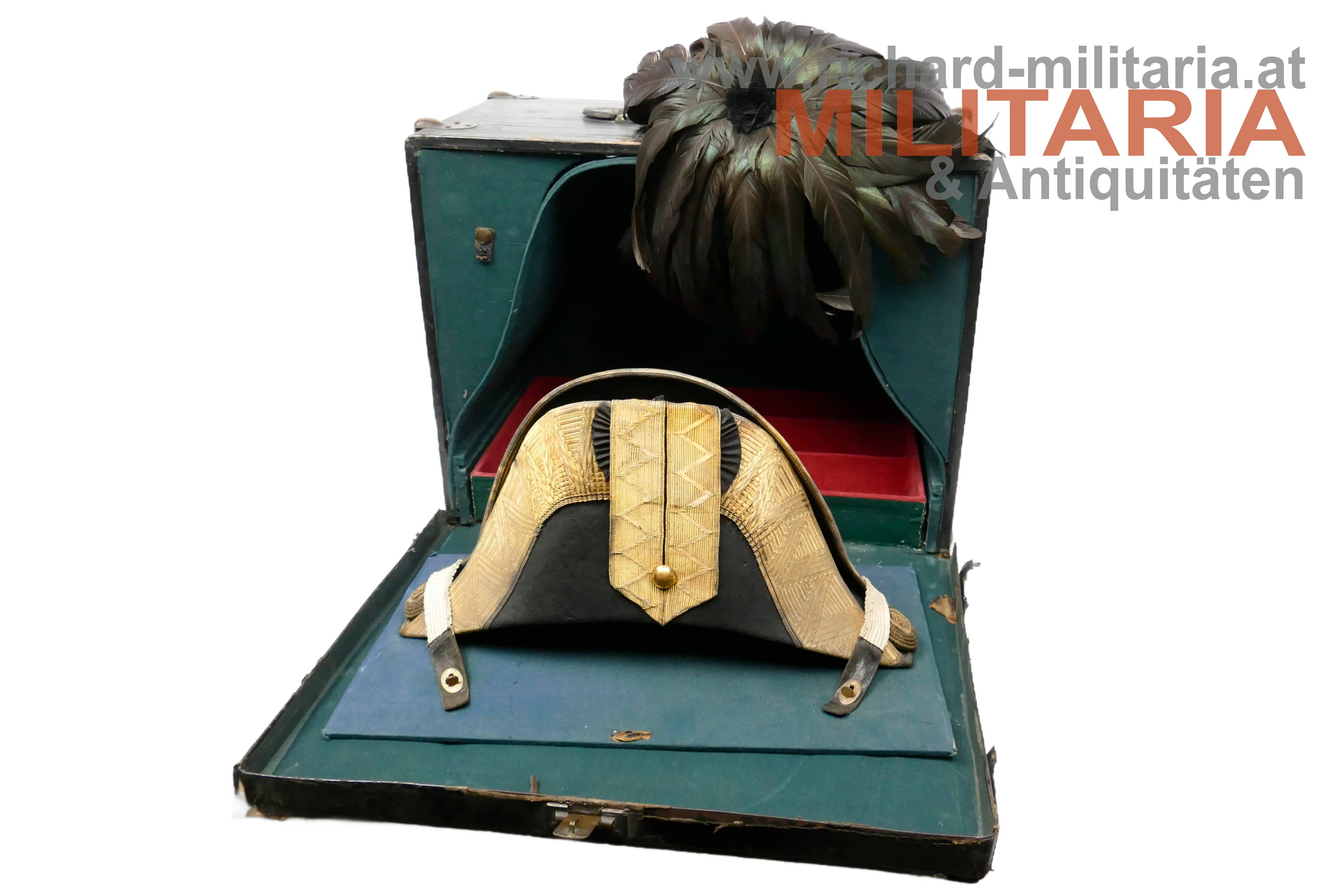 k.k. Zweispitz für einen Stabsoffizier; nach der Adjustierungsvorschrift 1855; aus schwarzem Filz in der für diese Zeit typischen hohen Form; Korbus trocken und teilweise am Rand gebrochen; in den Ecken goldene Rosen mit Allerhöchstem Namenszug FJ1; Hutschlinge und Randeinfassung mit der goldenen Borte für Stabsoffizier (abweichend zu den Generälen nicht gezackt!); Borten nur minimal gedunkelt; an der Hutschlinge glatter goldener Knopf; eingeschobener Federbusch aus schwarzen Hahnenfedern; braunes, trockenes Stirnleder und weißes leicht beschädigtes Seidenfutter; im originalen Hutkoffer mit Schublade für die Feldbinde Borte; am Koffer außen Klebeetiketten für den Versand als Militärgepäck nach Linz.