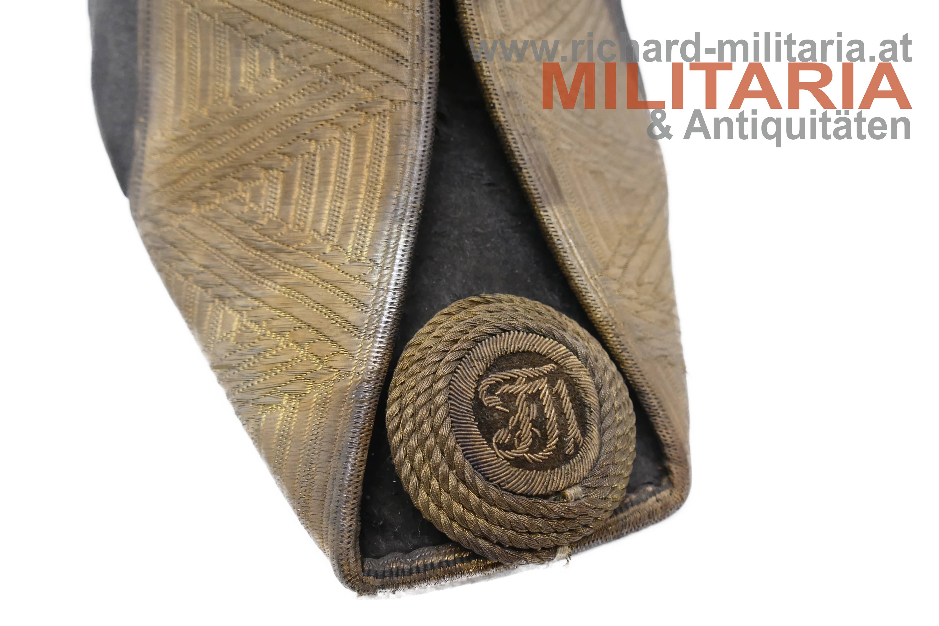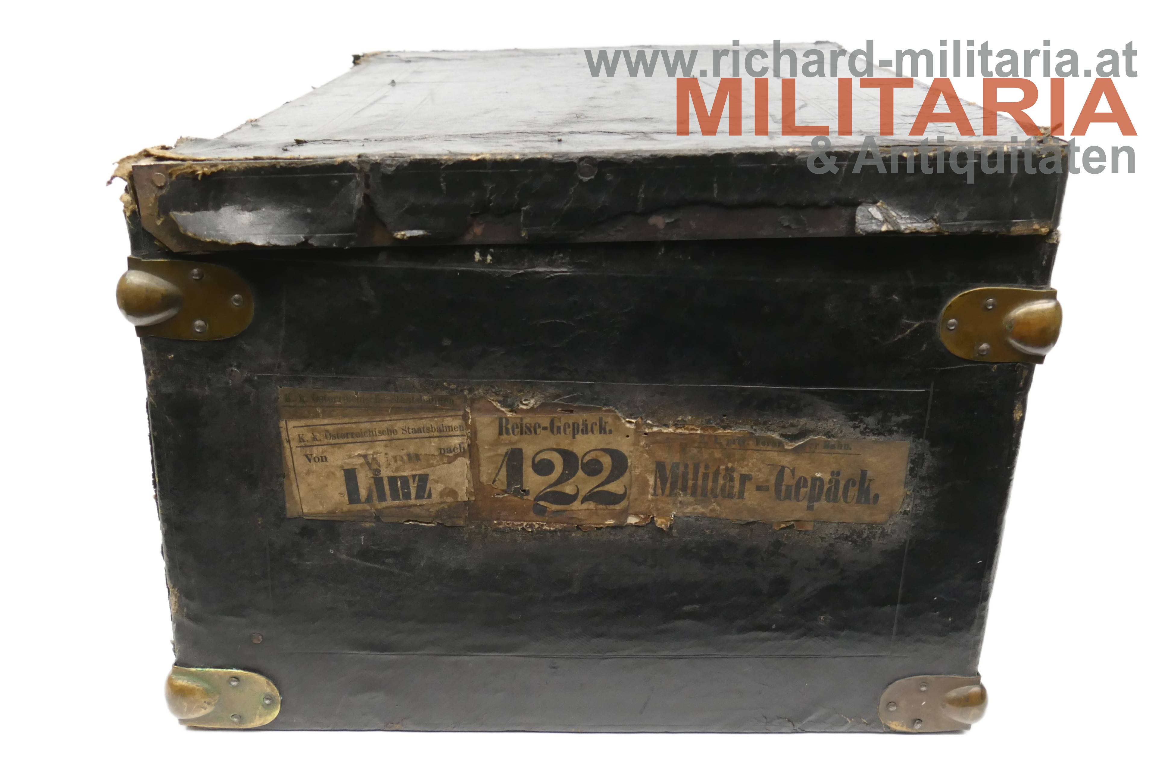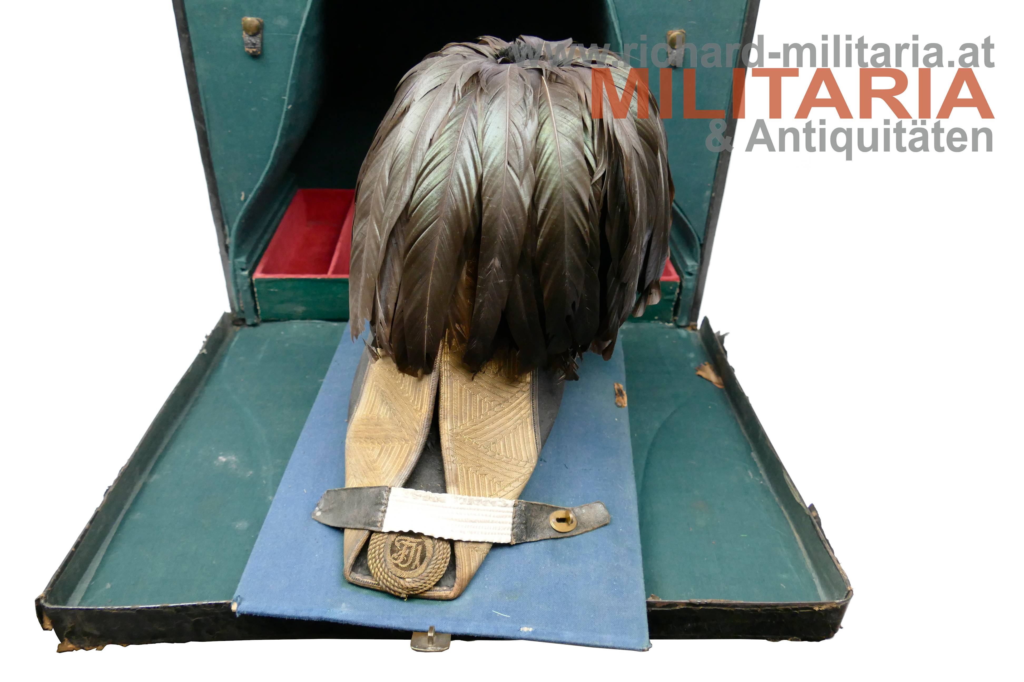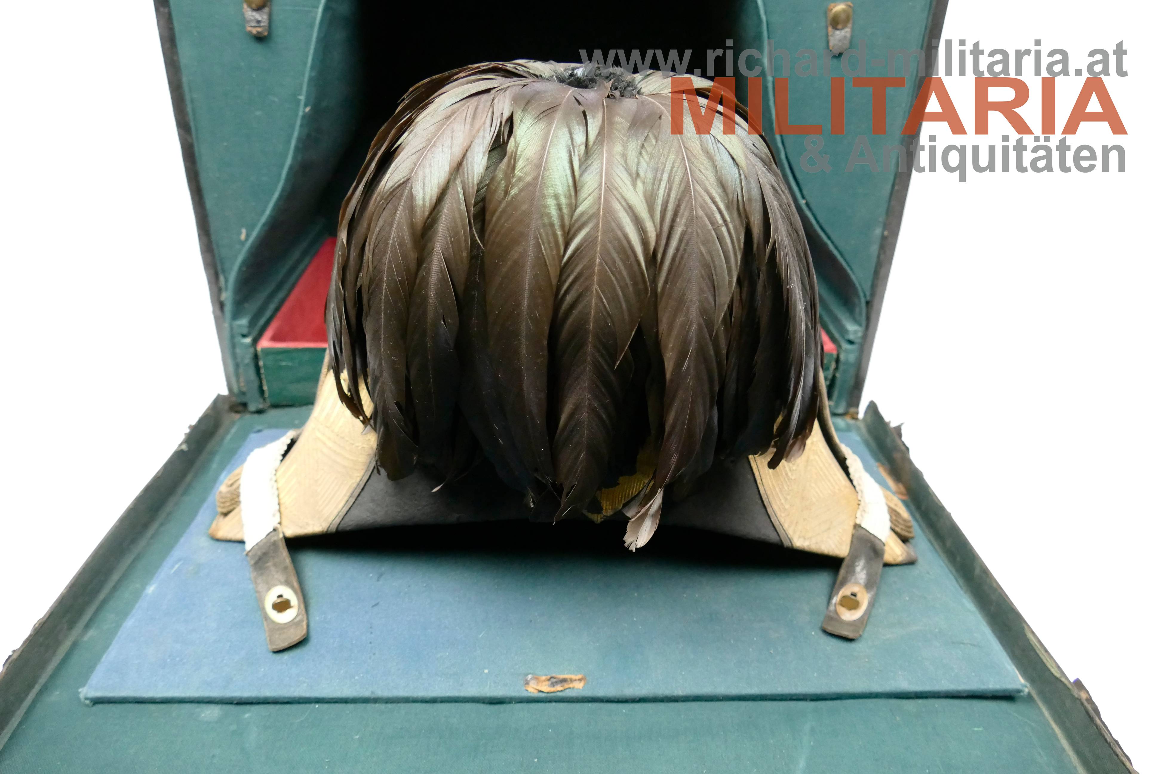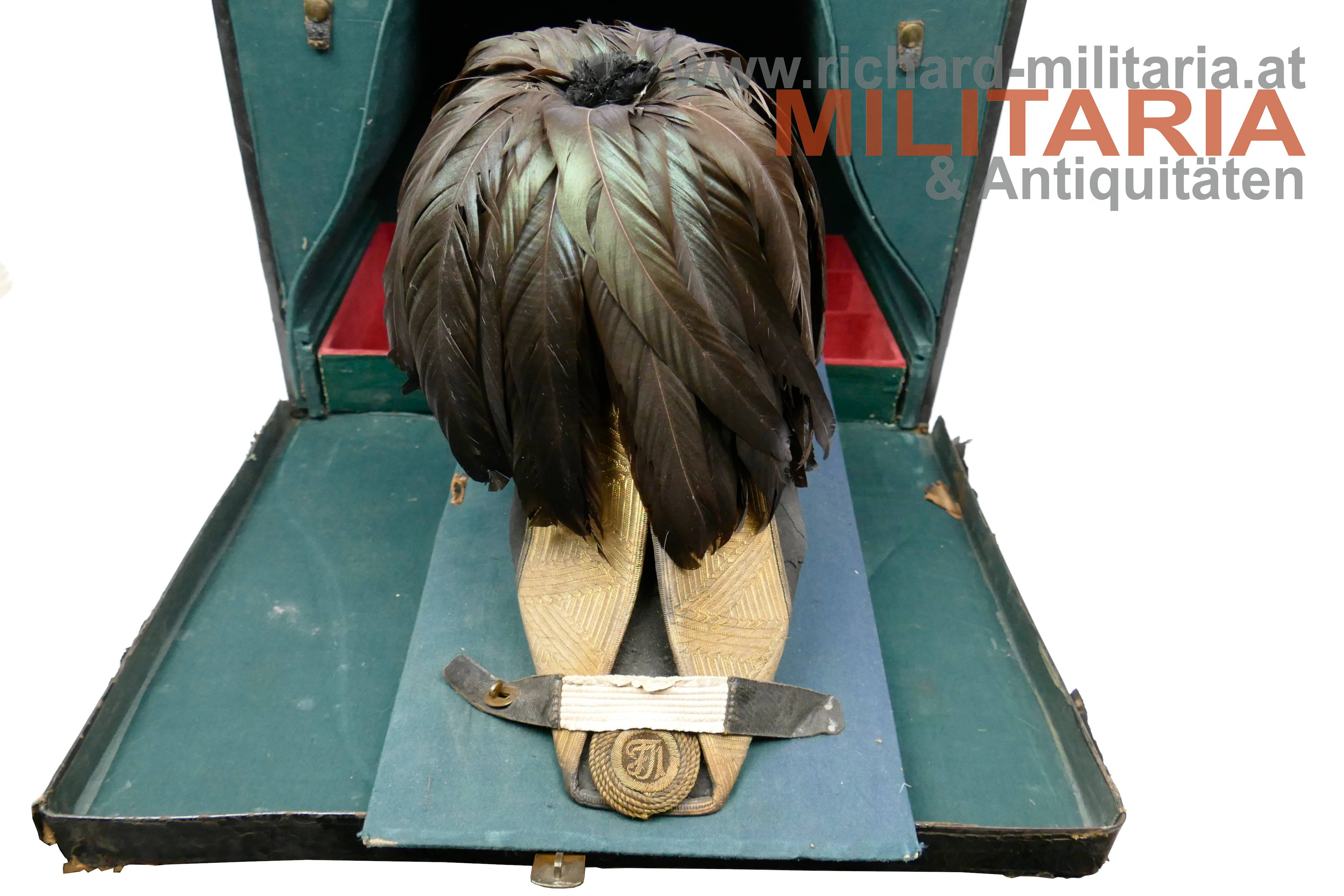 k.k. Zweispitz für einen Stabsoffizier; nach der Adjustierungsvorschrift 1855; aus schwarzem Filz in der für diese Zeit typischen hohen Form; Korbus trocken und teilweise am Rand gebrochen; in den Ecken goldene Rosen mit Allerhöchstem Namenszug FJ1; Hutschlinge und Randeinfassung mit der goldenen Borte für Stabsoffizier (abweichend zu den Generälen nicht gezackt!); Borten nur minimal gedunkelt; an der Hutschlinge glatter goldener Knopf; eingeschobener Federbusch aus schwarzen Hahnenfedern; braunes, trockenes Stirnleder und weißes leicht beschädigtes Seidenfutter; im originalen Hutkoffer mit Schublade für die Feldbinde Borte; am Koffer außen Klebeetiketten für den Versand als Militärgepäck nach Linz.