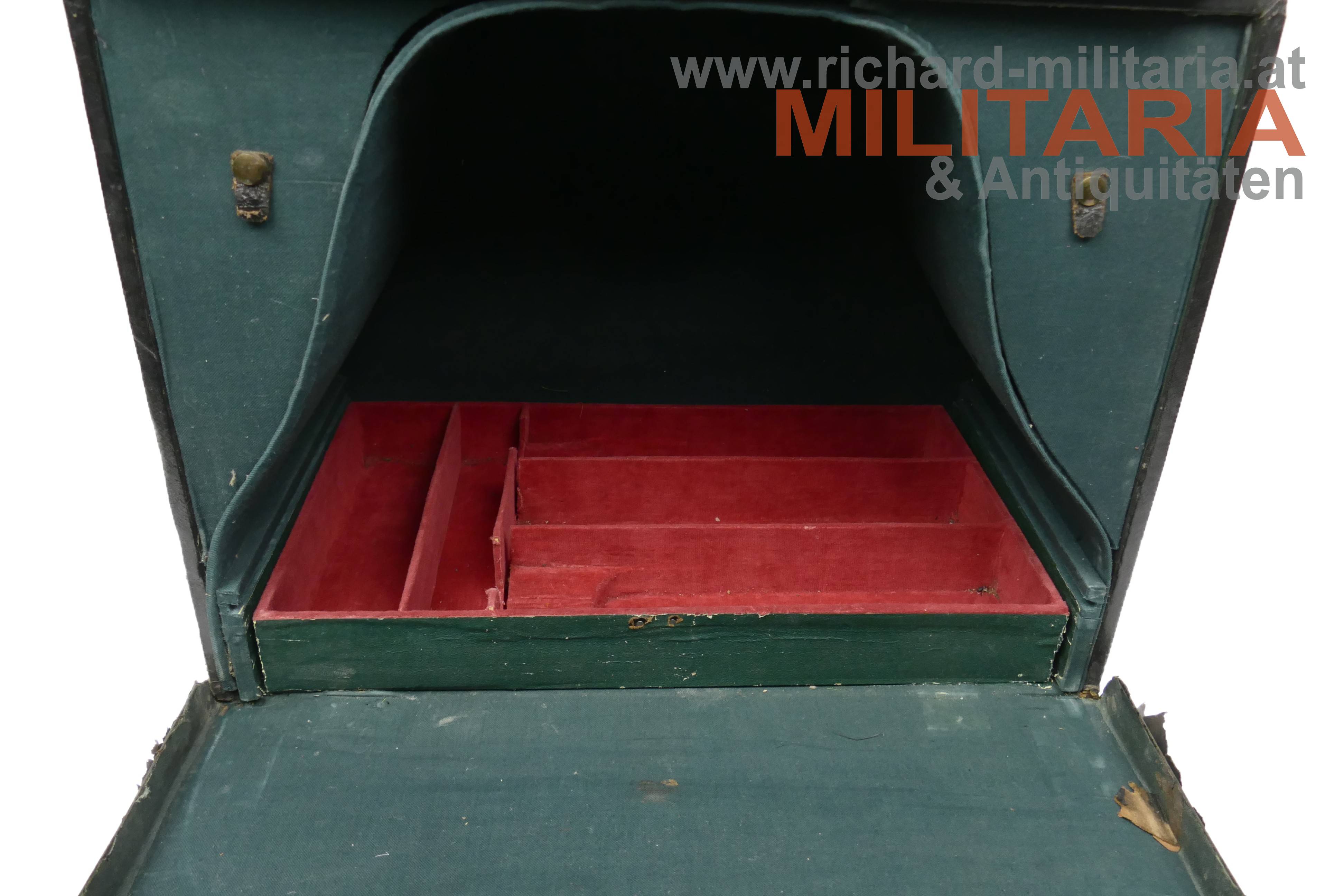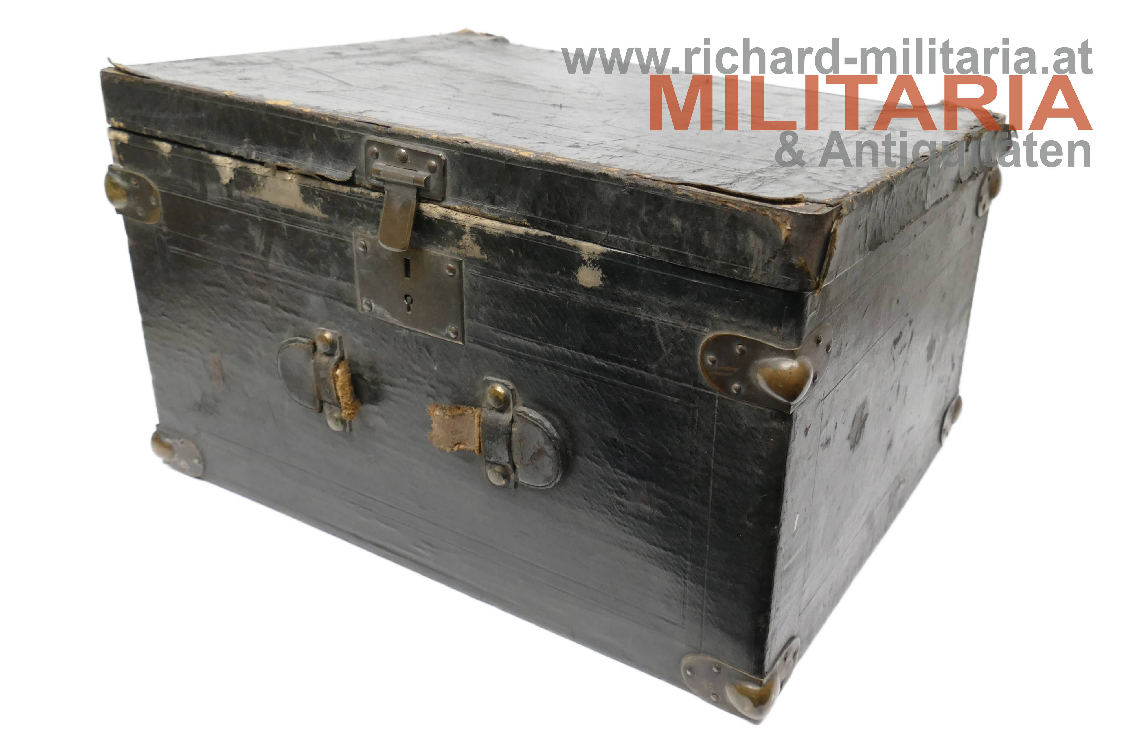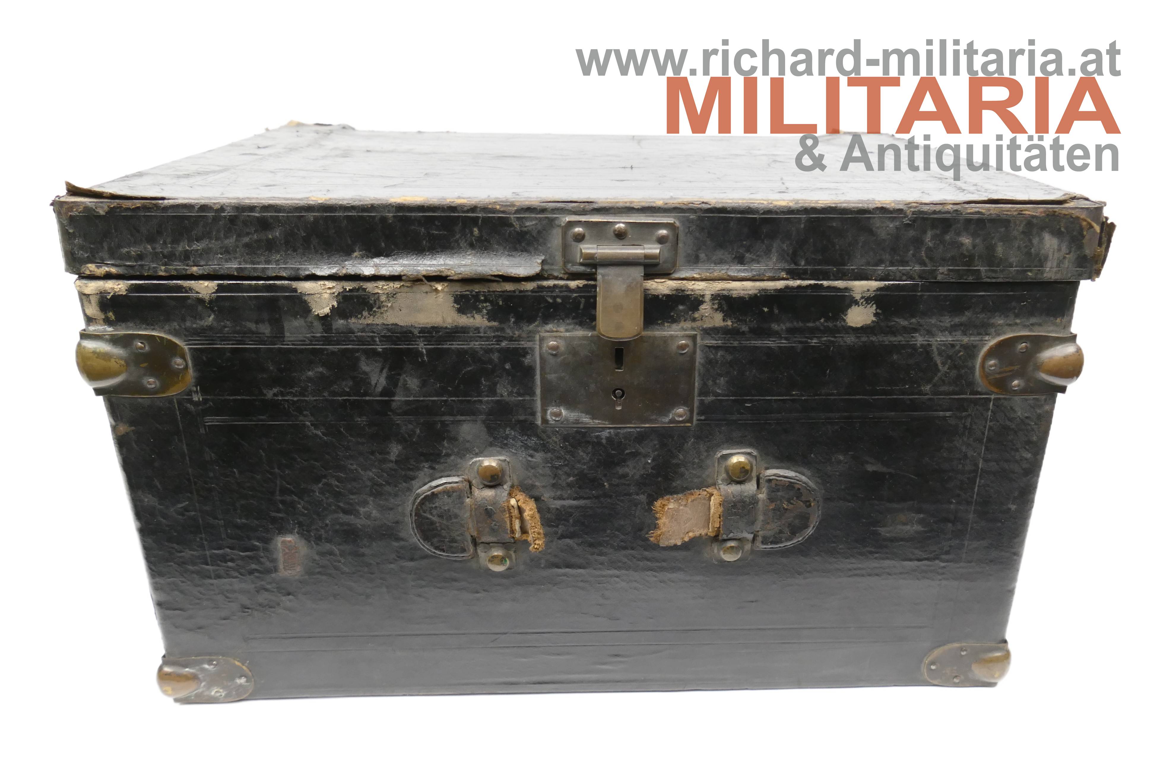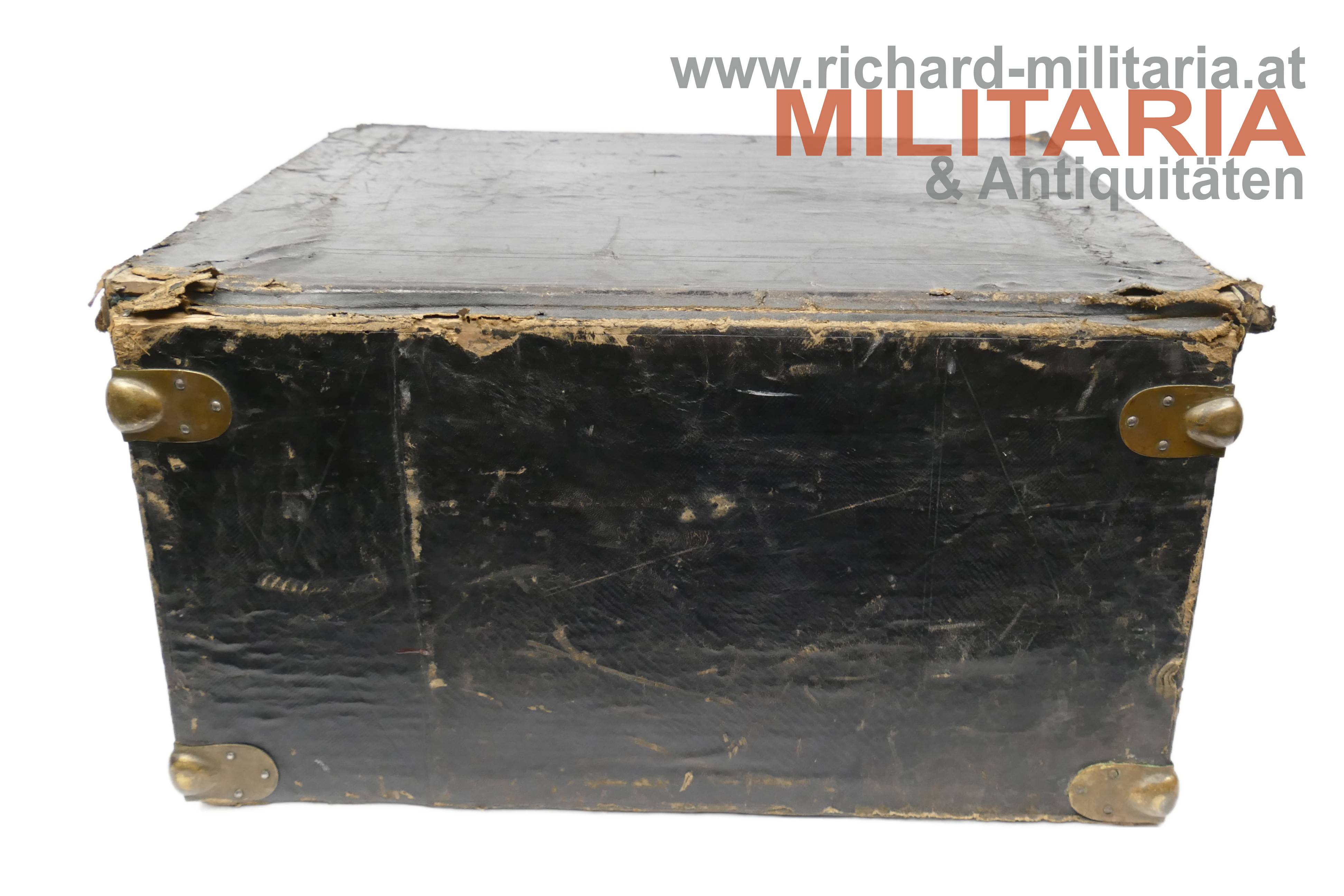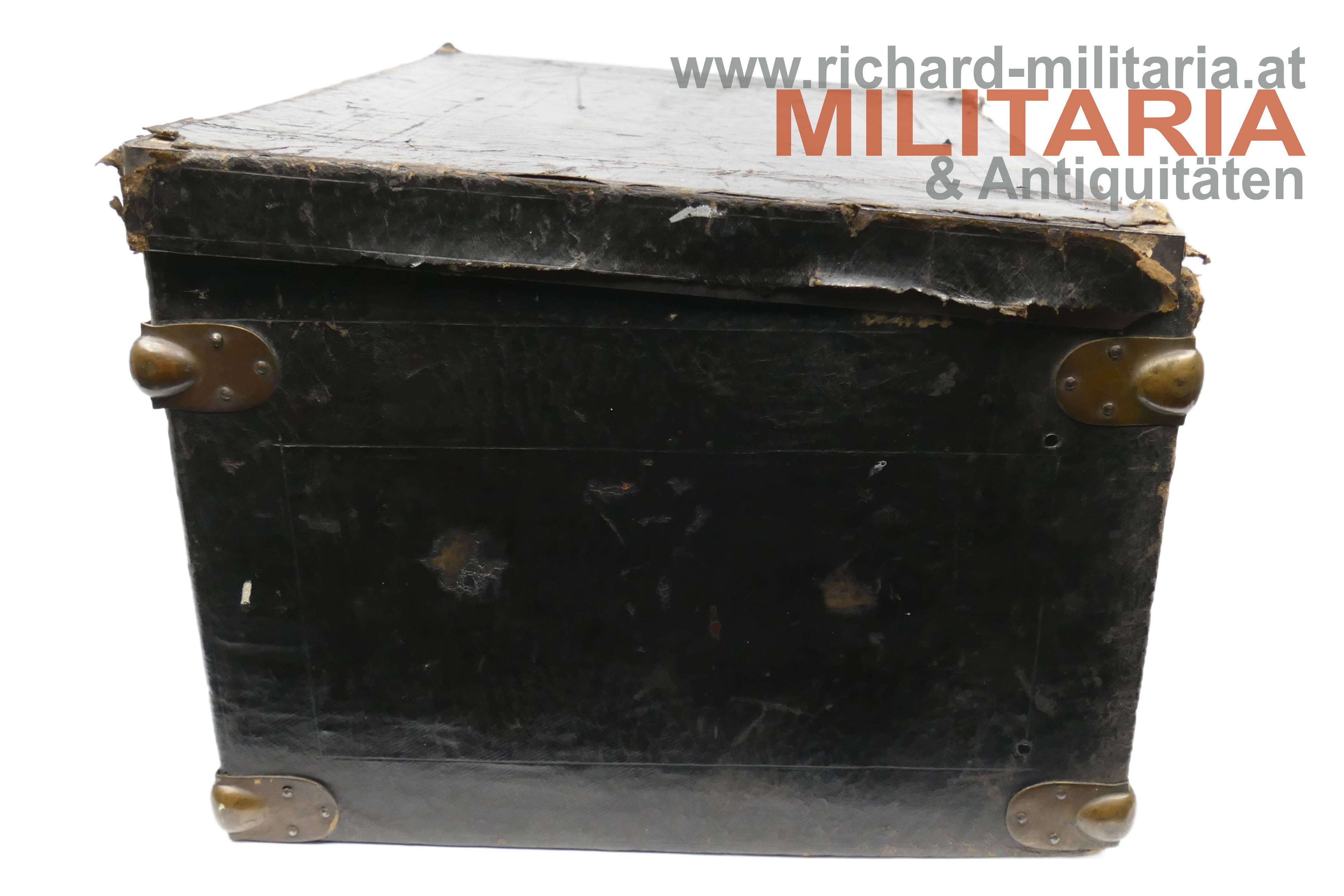 k.k. Zweispitz für einen Stabsoffizier; nach der Adjustierungsvorschrift 1855; aus schwarzem Filz in der für diese Zeit typischen hohen Form; Korbus trocken und teilweise am Rand gebrochen; in den Ecken goldene Rosen mit Allerhöchstem Namenszug FJ1; Hutschlinge und Randeinfassung mit der goldenen Borte für Stabsoffizier (abweichend zu den Generälen nicht gezackt!); Borten nur minimal gedunkelt; an der Hutschlinge glatter goldener Knopf; eingeschobener Federbusch aus schwarzen Hahnenfedern; braunes, trockenes Stirnleder und weißes leicht beschädigtes Seidenfutter; im originalen Hutkoffer mit Schublade für die Feldbinde Borte; am Koffer außen Klebeetiketten für den Versand als Militärgepäck nach Linz.