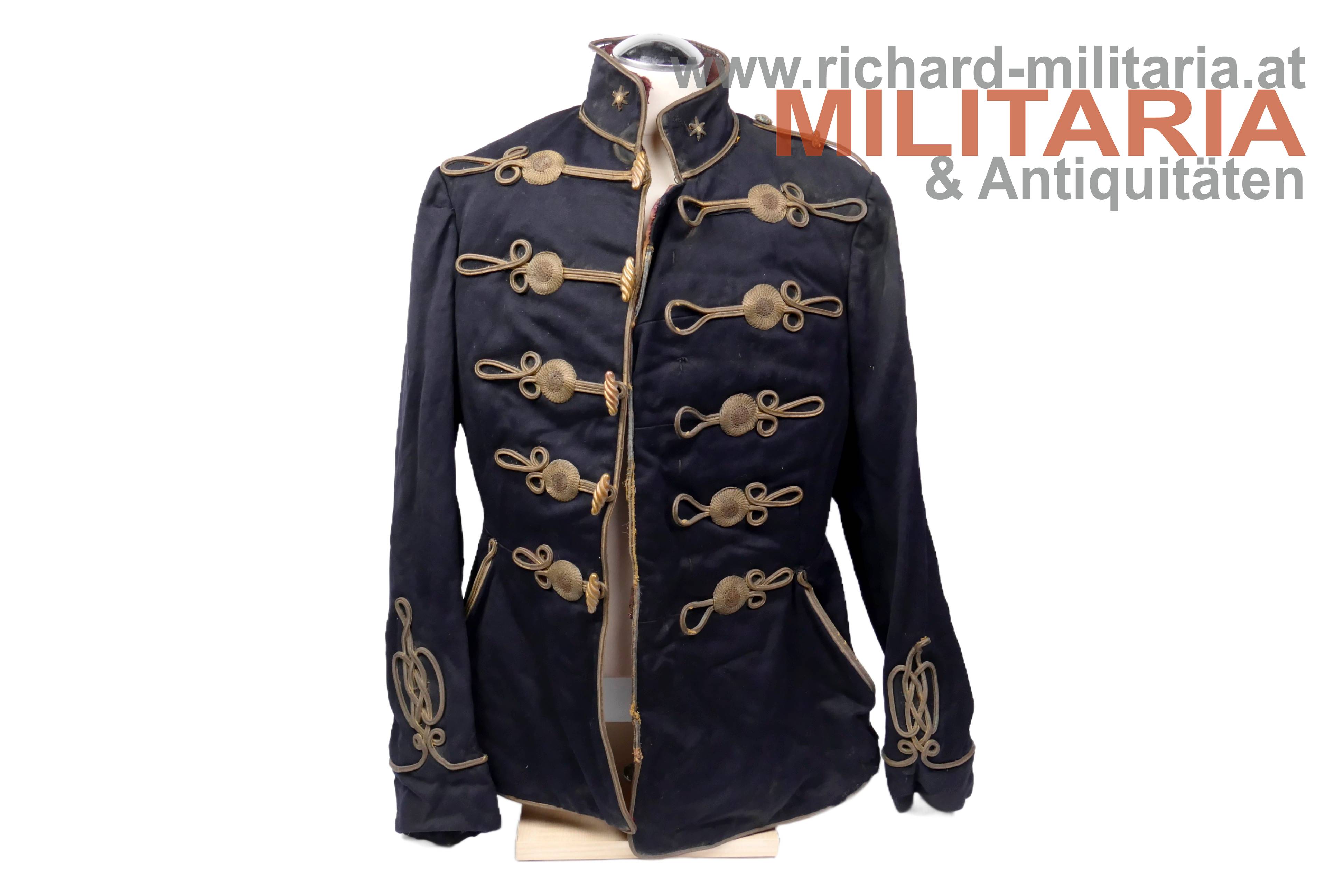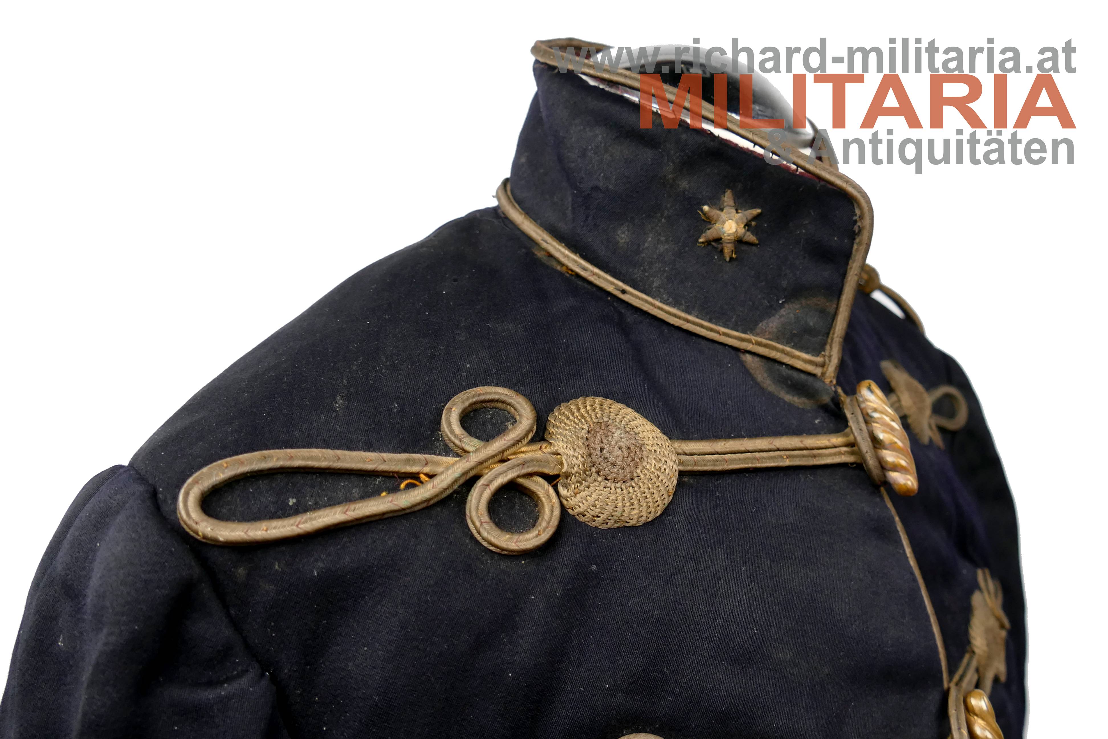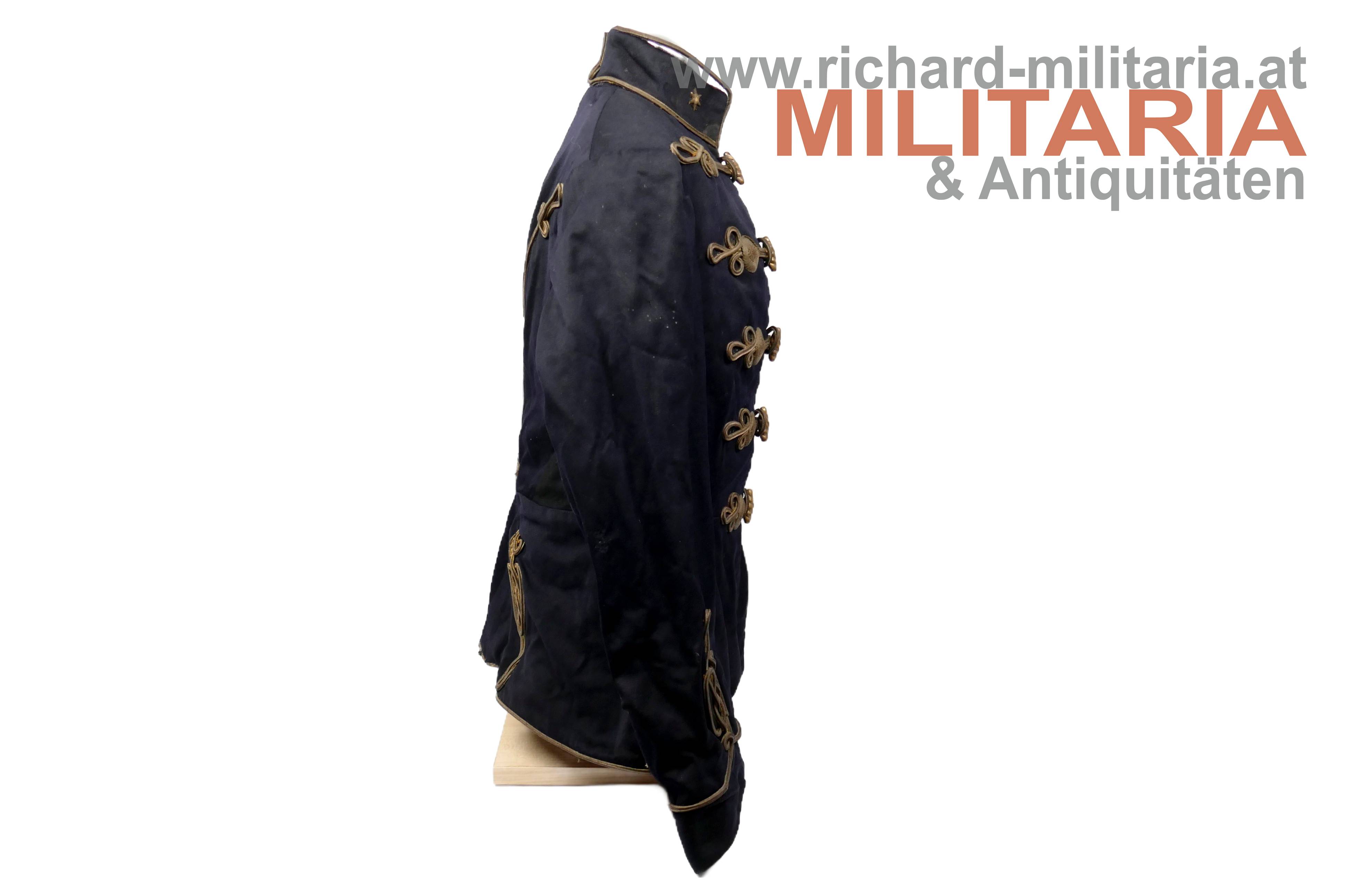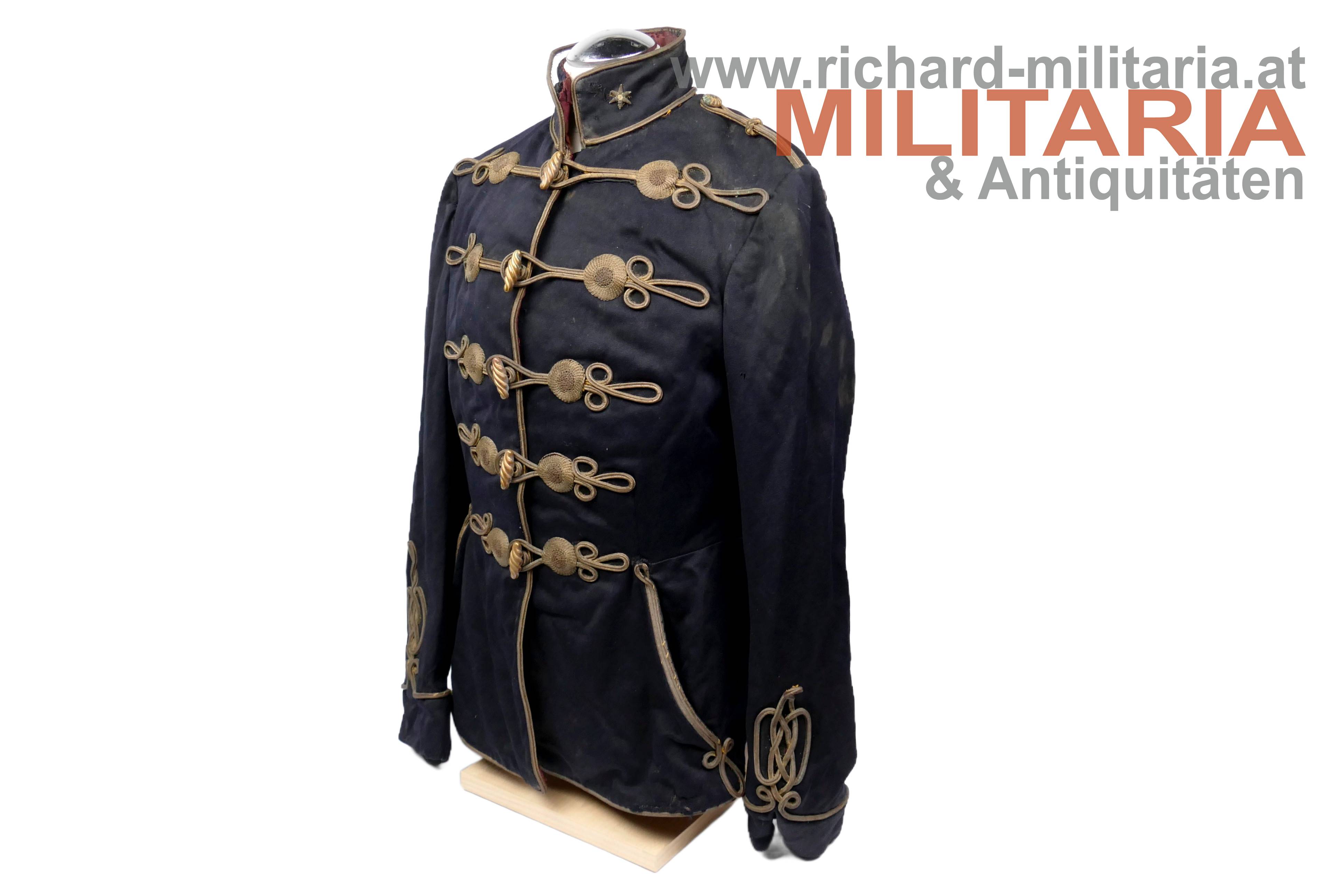 königlich ungarischer Offiziers-Attila M1892 für einen Leutnant der Honvéd-Husaren; dunkelblauer Kammgarn mit goldener, rot (!) geritzter, Verschnürrung für Honvéd-Husaren; am Kragen je ein Offiziers-Distinktionsstern für einen Leutnant; links auf der Schulter eine rot geritzte Achselspange mit Schuber gehalten von einem vergoldeten Husarenknopf; vergoldete Oliven; innen Brustteil mit beigem und Schoßteil mit roten Seidenstoff ausgelegt; darauf einige alte Fundusstempel; Attila innen stark angeschmutzt und fleckig; Verschnürrung gedunkelt und teilweise etwas lose; Außenseite stärker angeschmutzt; einige kleinere Löcher und Beschädigungen;