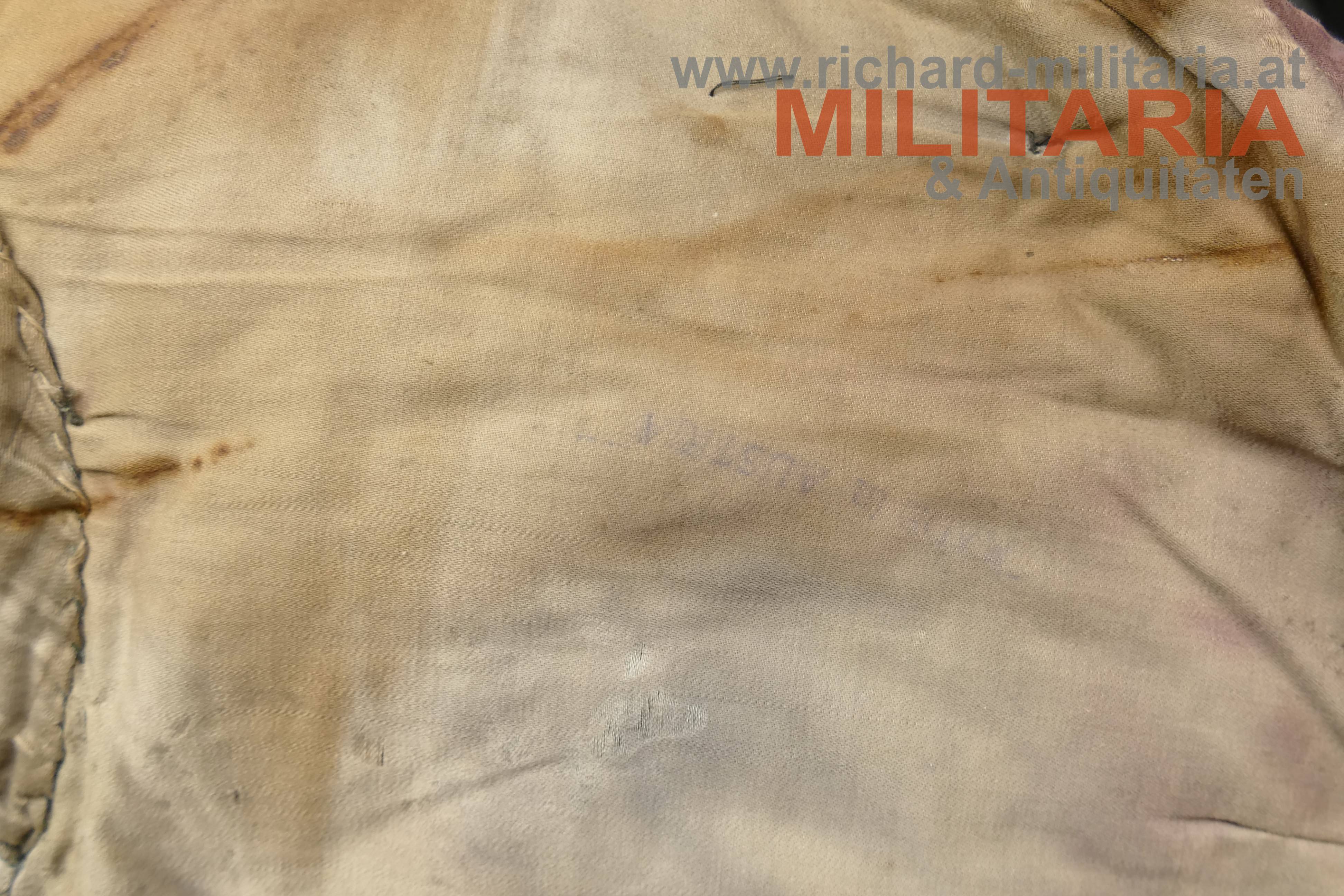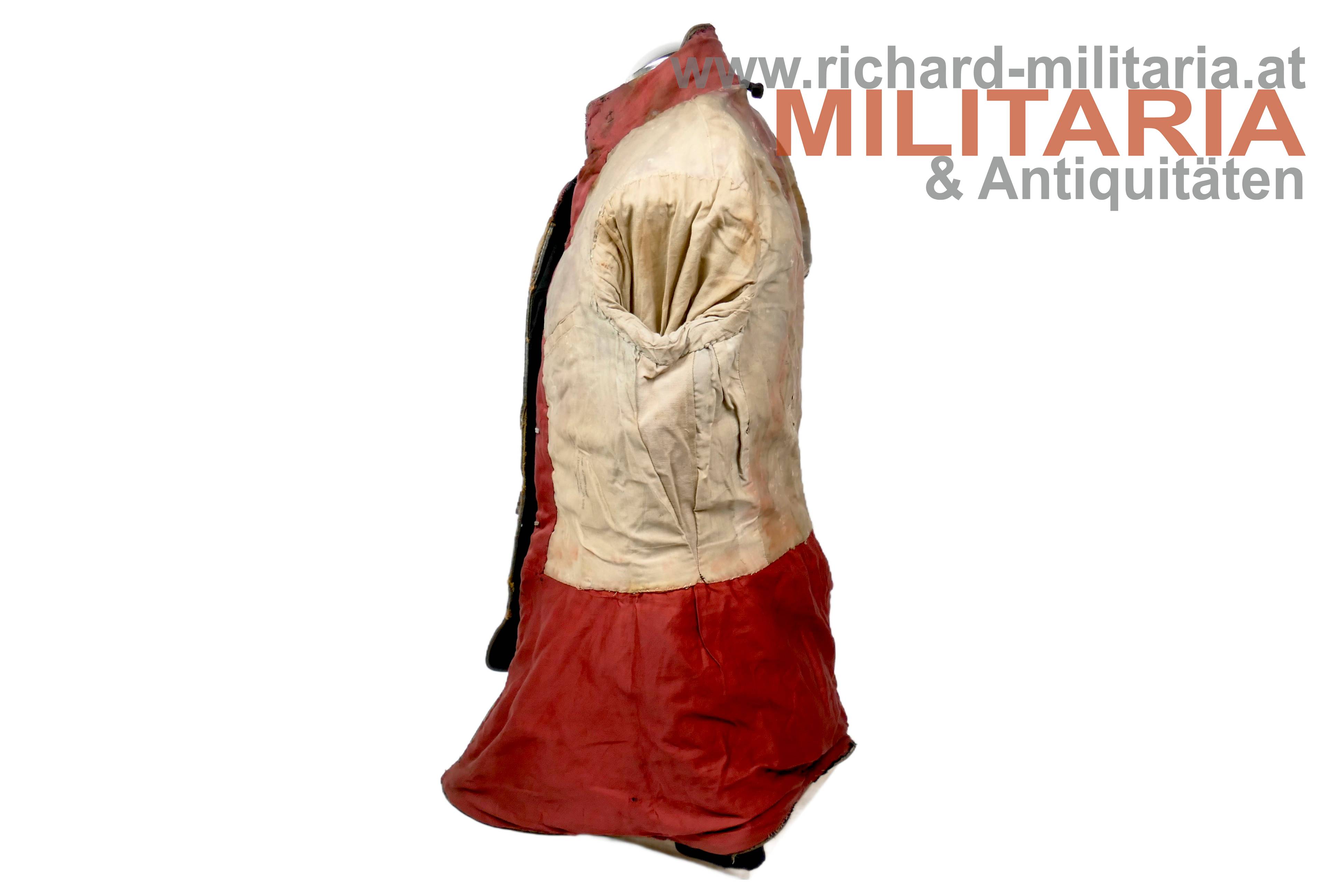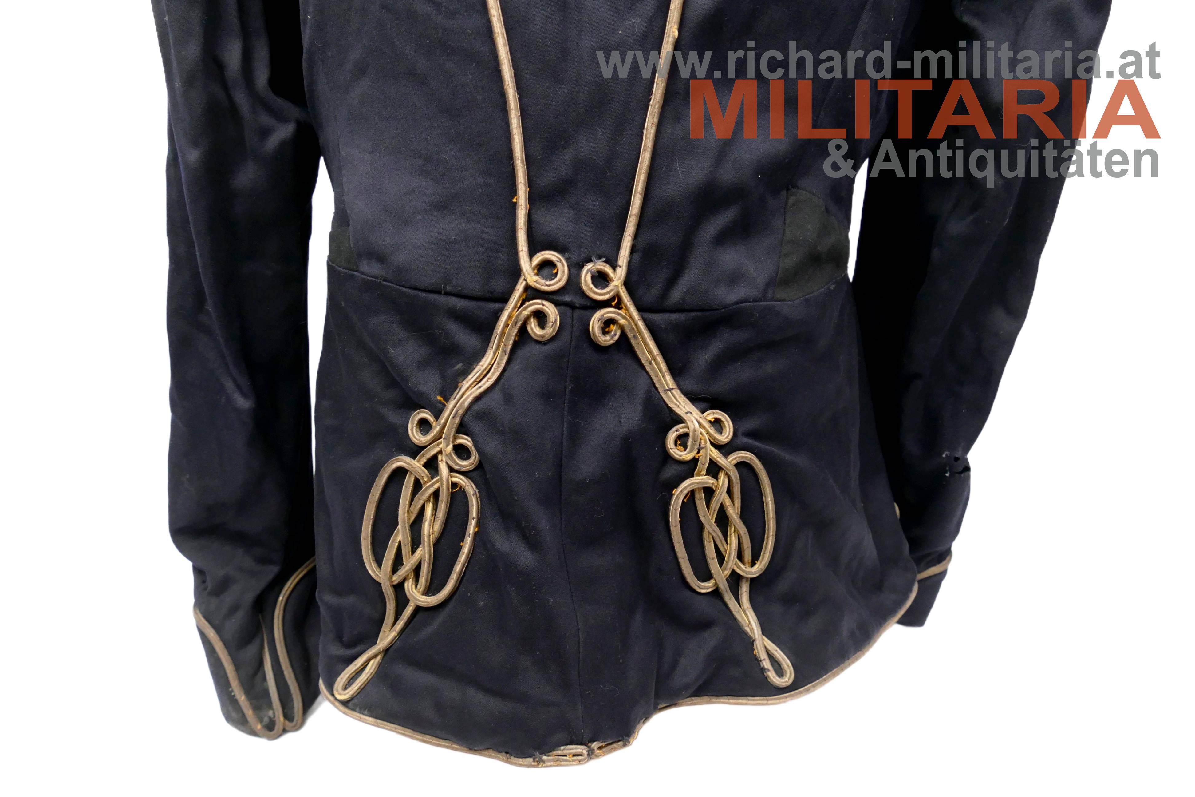 königlich ungarischer Offiziers-Attila M1892 für einen Leutnant der Honvéd-Husaren; dunkelblauer Kammgarn mit goldener, rot (!) geritzter, Verschnürrung für Honvéd-Husaren; am Kragen je ein Offiziers-Distinktionsstern für einen Leutnant; links auf der Schulter eine rot geritzte Achselspange mit Schuber gehalten von einem vergoldeten Husarenknopf; vergoldete Oliven; innen Brustteil mit beigem und Schoßteil mit roten Seidenstoff ausgelegt; darauf einige alte Fundusstempel; Attila innen stark angeschmutzt und fleckig; Verschnürrung gedunkelt und teilweise etwas lose; Außenseite stärker angeschmutzt; einige kleinere Löcher und Beschädigungen;