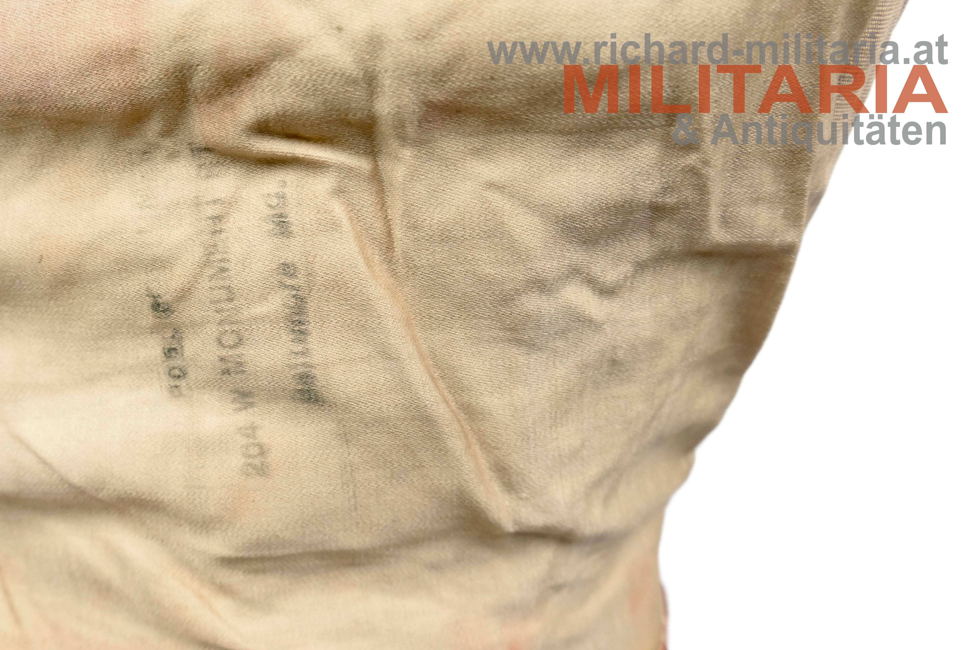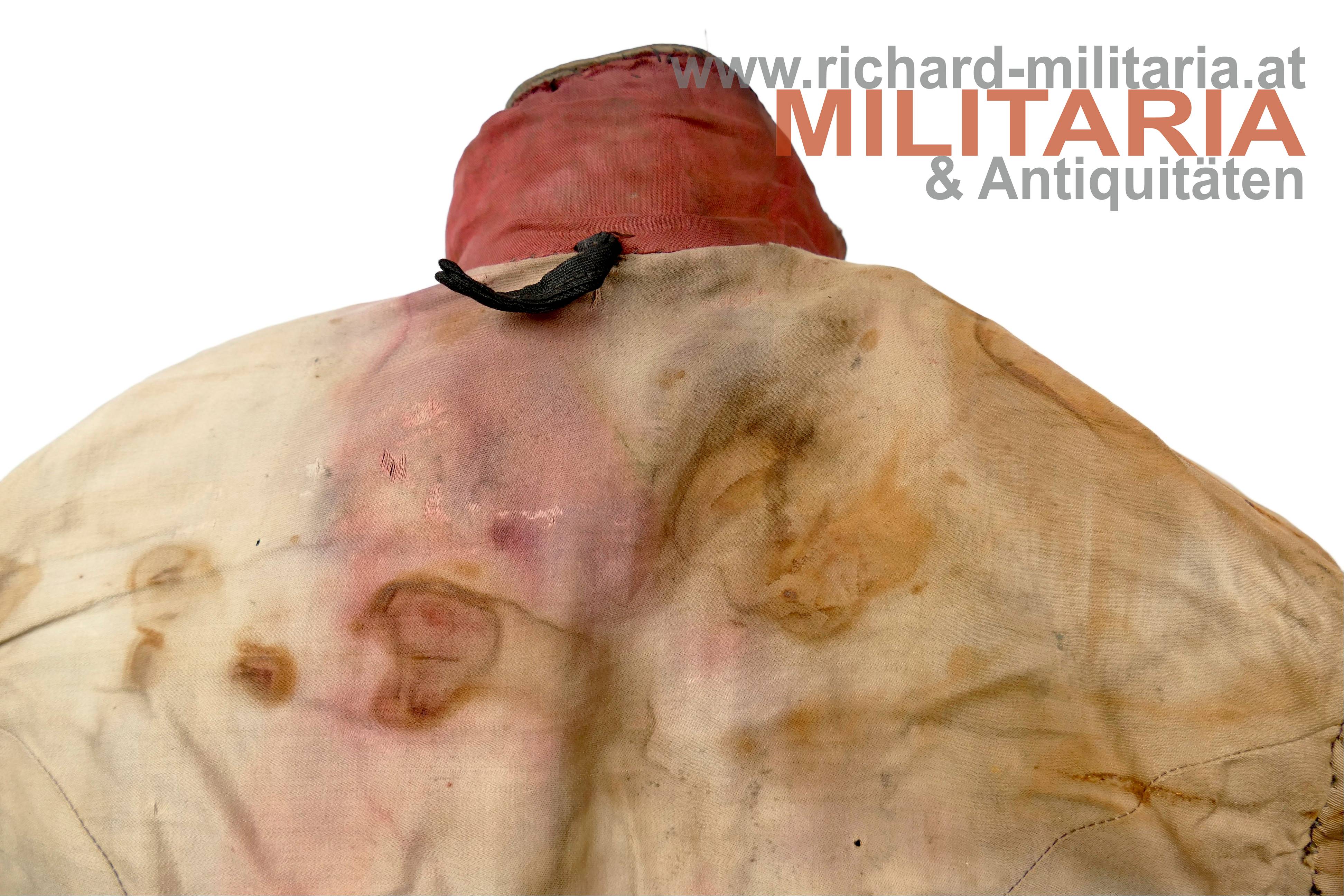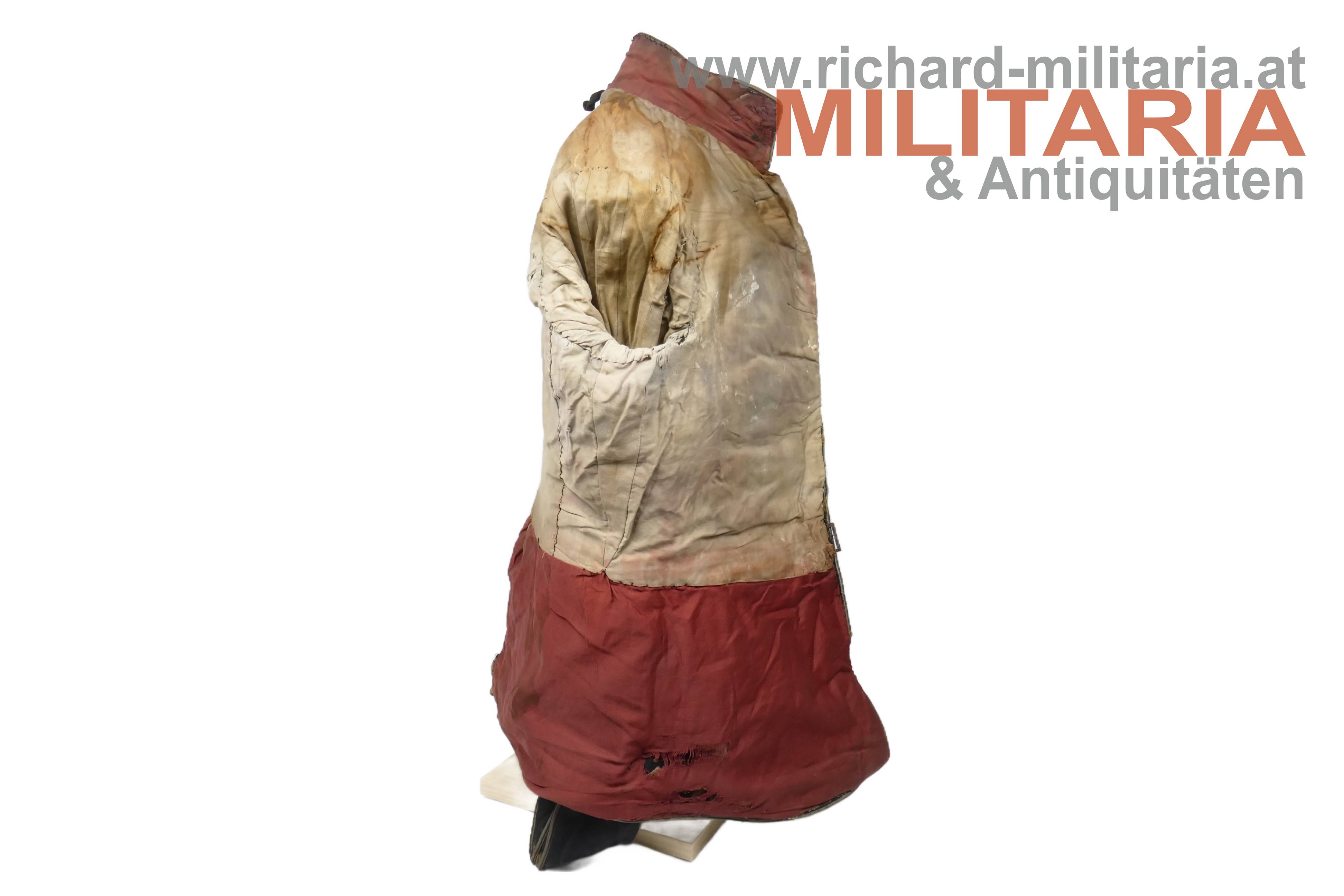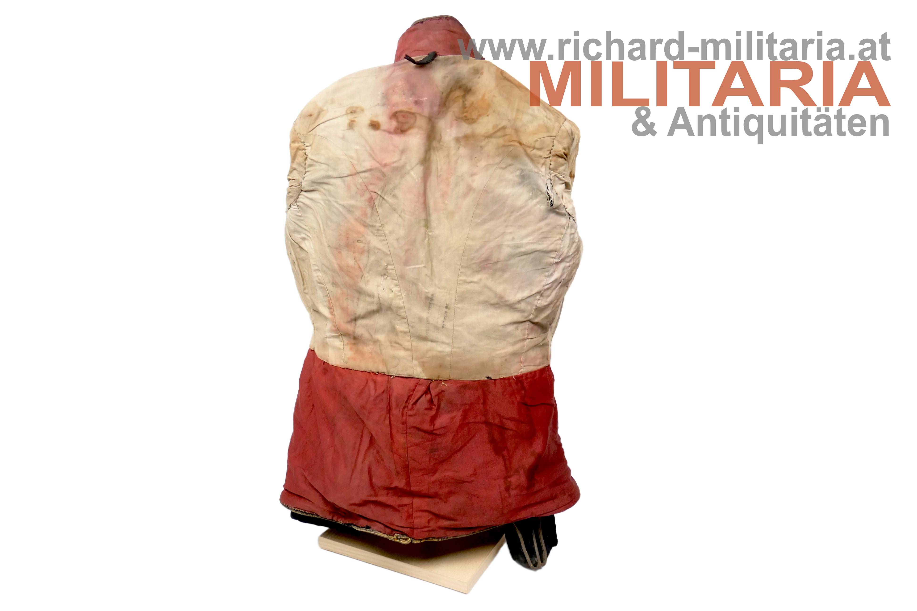 königlich ungarischer Offiziers-Attila M1892 für einen Leutnant der Honvéd-Husaren; dunkelblauer Kammgarn mit goldener, rot (!) geritzter, Verschnürrung für Honvéd-Husaren; am Kragen je ein Offiziers-Distinktionsstern für einen Leutnant; links auf der Schulter eine rot geritzte Achselspange mit Schuber gehalten von einem vergoldeten Husarenknopf; vergoldete Oliven; innen Brustteil mit beigem und Schoßteil mit roten Seidenstoff ausgelegt; darauf einige alte Fundusstempel; Attila innen stark angeschmutzt und fleckig; Verschnürrung gedunkelt und teilweise etwas lose; Außenseite stärker angeschmutzt; einige kleinere Löcher und Beschädigungen;