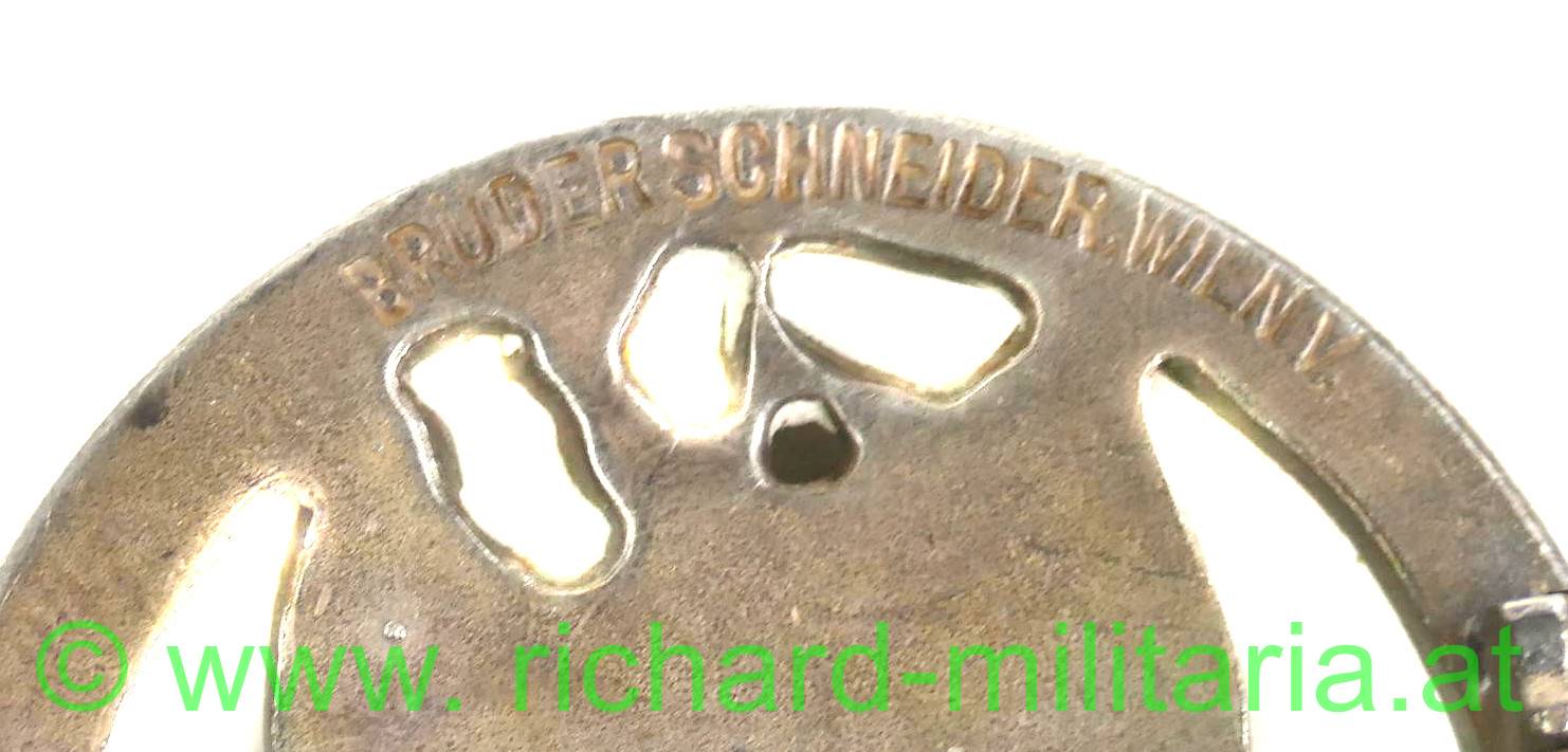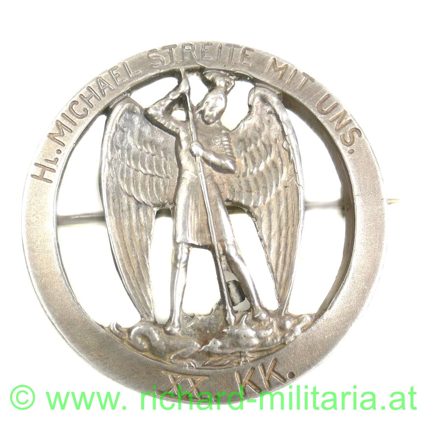 k.u.k Kappenabzeichen XX. KK., Umschrift "Hl. Michael streite mit uns"; SILBER; Hersteller: Brüder Schneider, Wien, massive Fertigung aus Silber - Punzierungen (Dianakopf u. BSW) auf dem Abzeichen; sehr guter Zustand mit Originalnadel