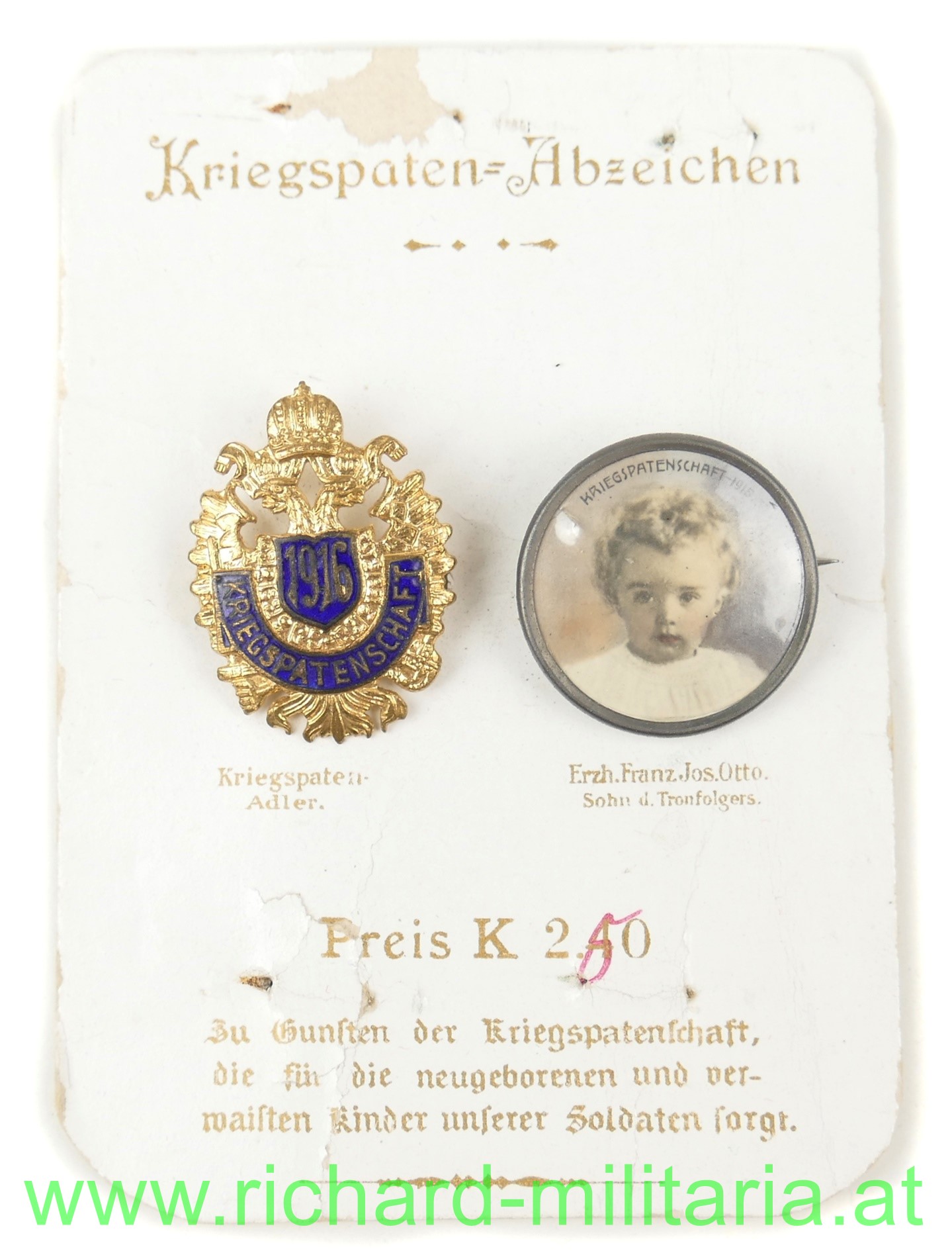 k.u.k. patriotische Abzeichen am originalen Verkaufskarton, einmal Kriegspatenadler feuervergoldet und emailliert, einmal Erzh. Franz Josef Otto,