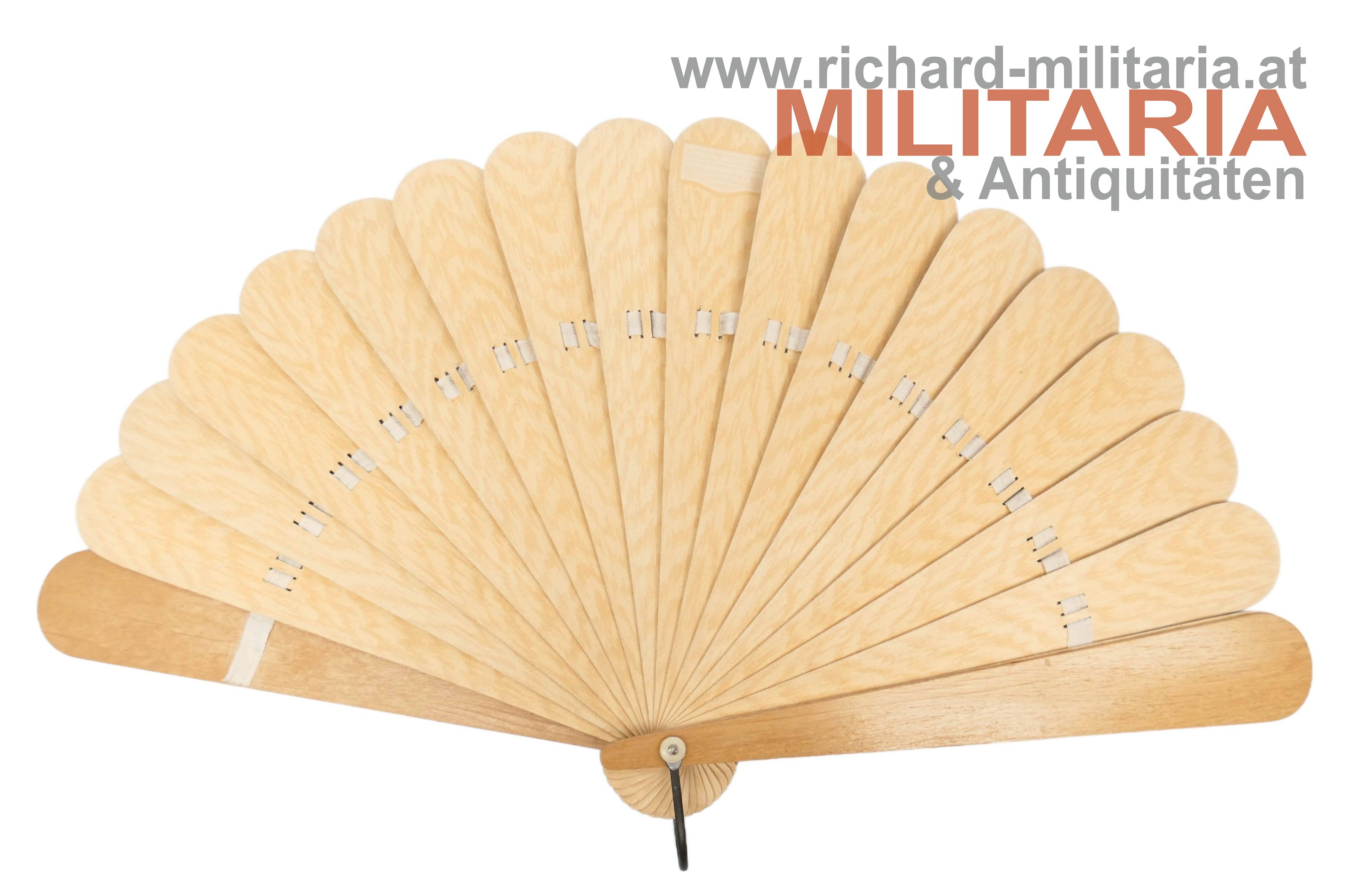 k.u.k patriotischer Fächer mit farblichen Darstellungen der österreichischen und deutschen Heeresführer im 1. Weltkrieg mit ihren Unterschriften; mit Seidenband durchzogene Holzlamellen, mit Herstellerstempel: "Hermes Buch- & Kunstdruckerei Gesellschaft, Wien";