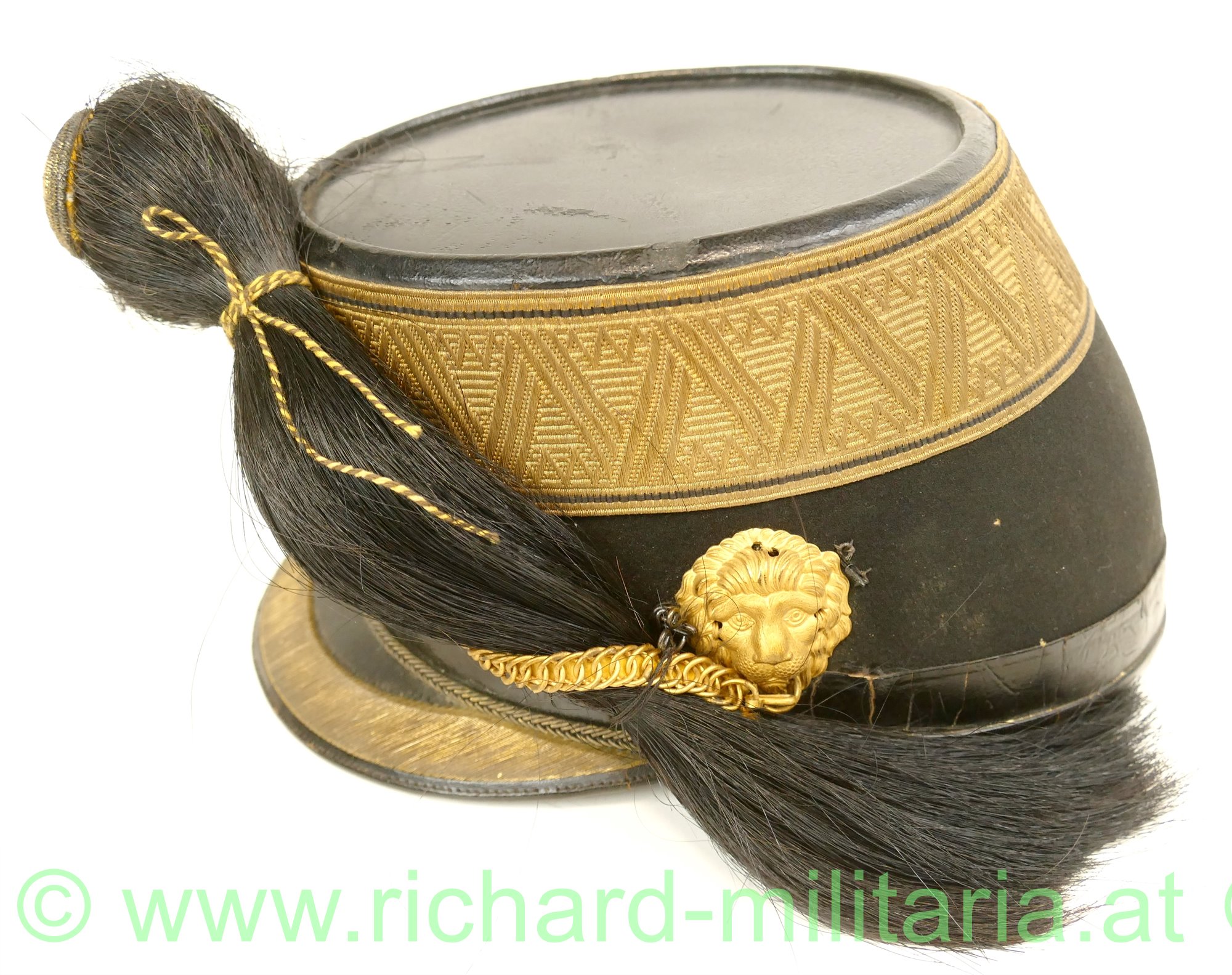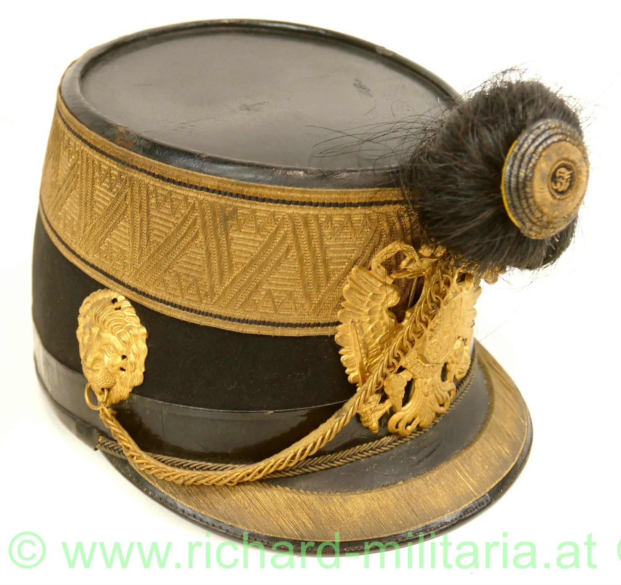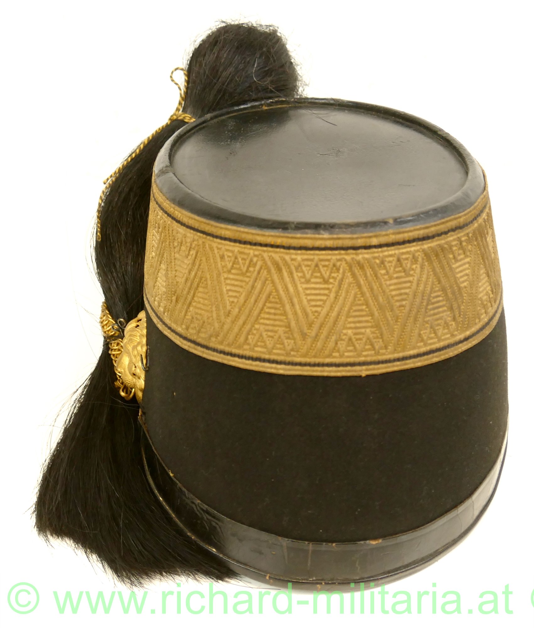 k.u.k. Tschako eines Subalternoffiziers (Leutnant, Oberleutnant) der Artillerie; mit schwarzem Filz überzogener steifer Korpus; umlaufende Offiziersborte aus Goldgespinst für Subalternoffiziere; vergoldeter Doppeladler mit eingesteckter Rosette (FJ1) mit Rosshaarbusch; links und rechts je ein vergoldeter Löwenkopf der im Maul die vergoldete Kette zum Doppeladler hält; Schirm mit Goldborte; Rosshaarbusch zusätzlich mit einem gelb/schwarzen Wollfaden zusammengebunden; Halterungsband für den Rosshaarbusch vorhanden; hellbraunes Stirnleder; innen mit rotem feinem Tuch ausgelegt; Hersteller "M. Kaufmann" innen aufgedruckt; Kinnriemen fehlt; Größe ca. 56;