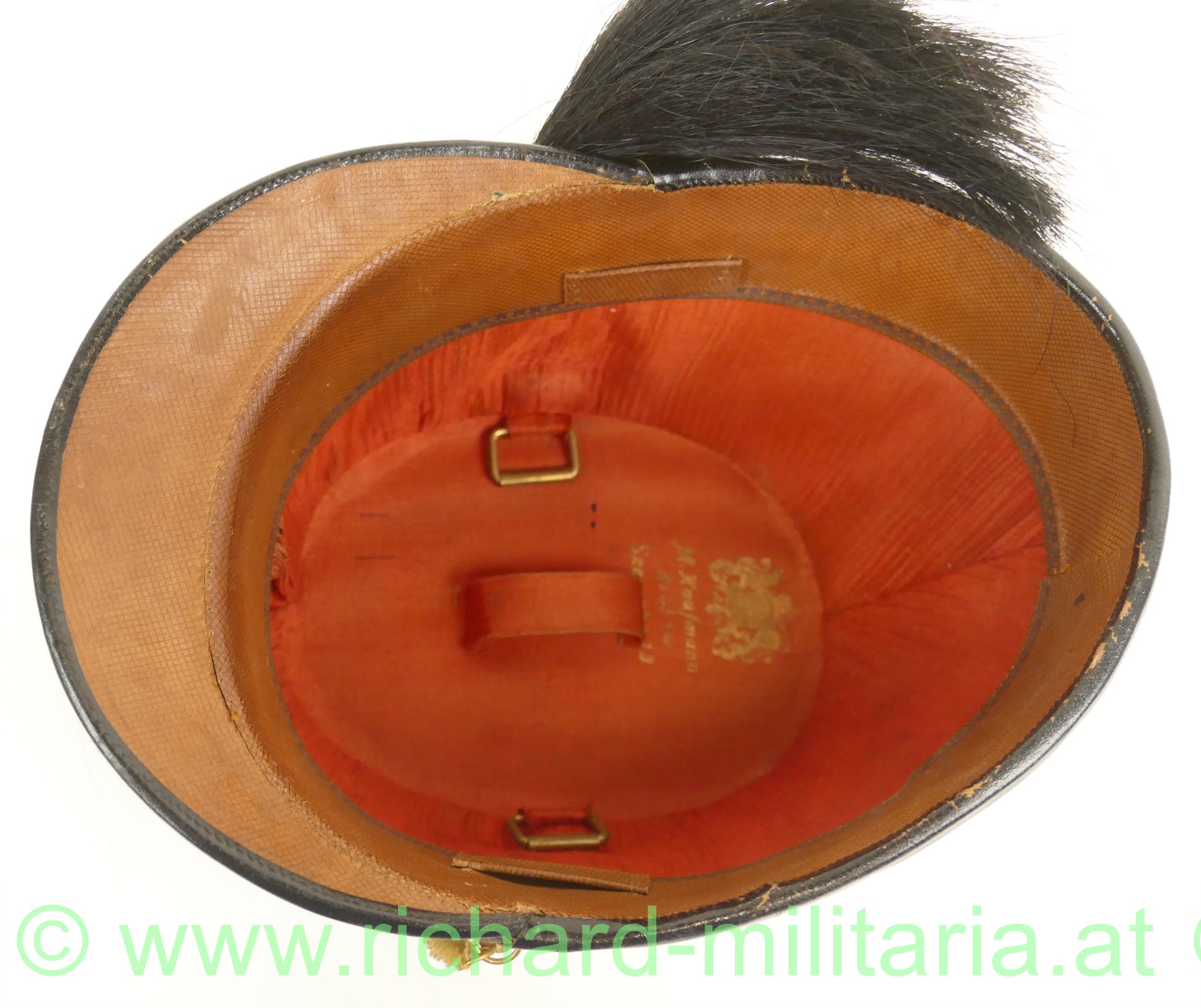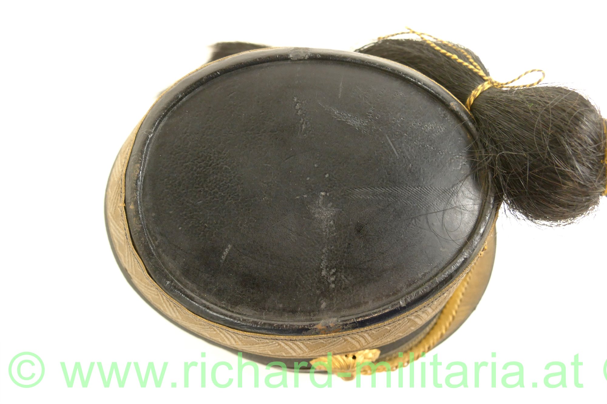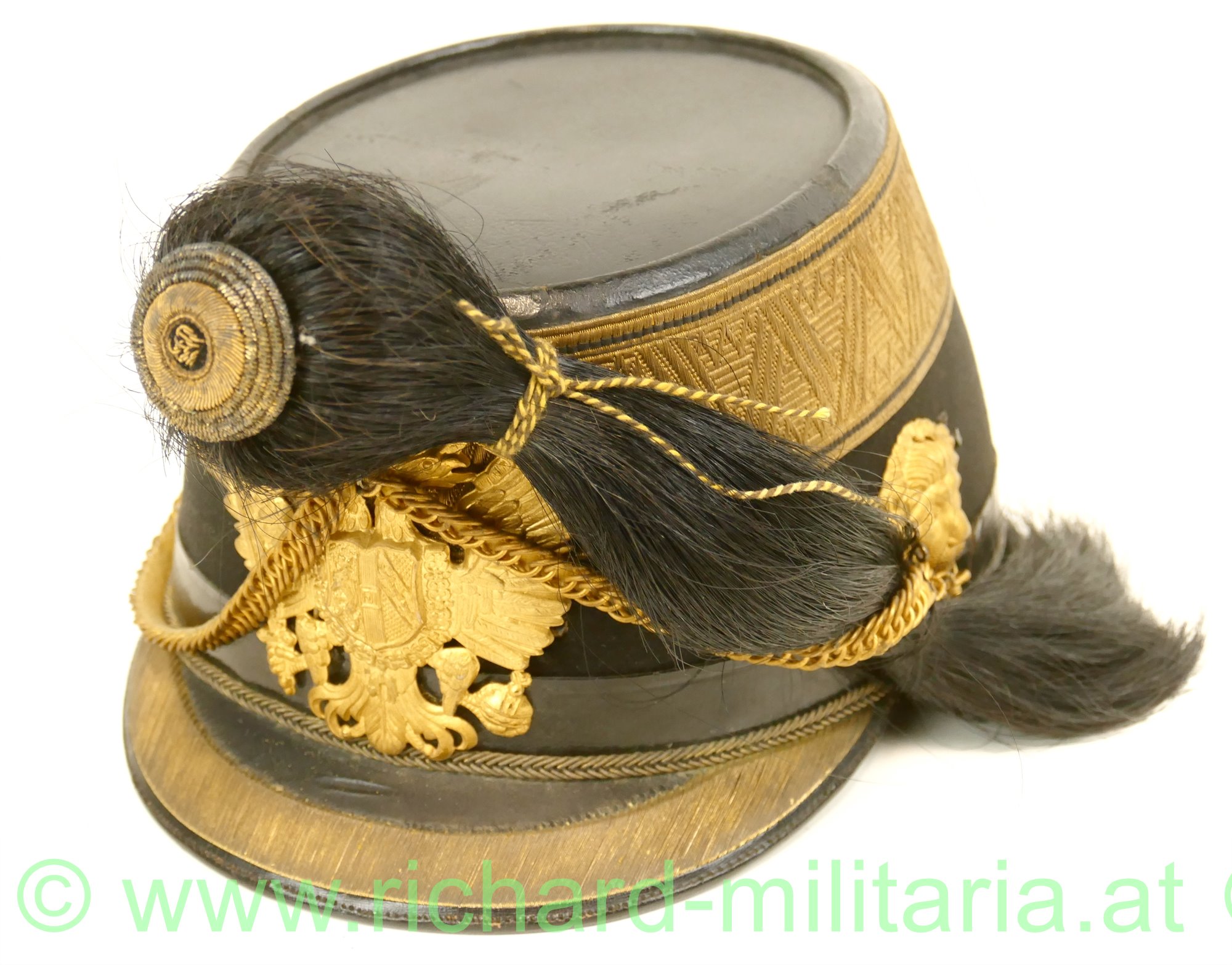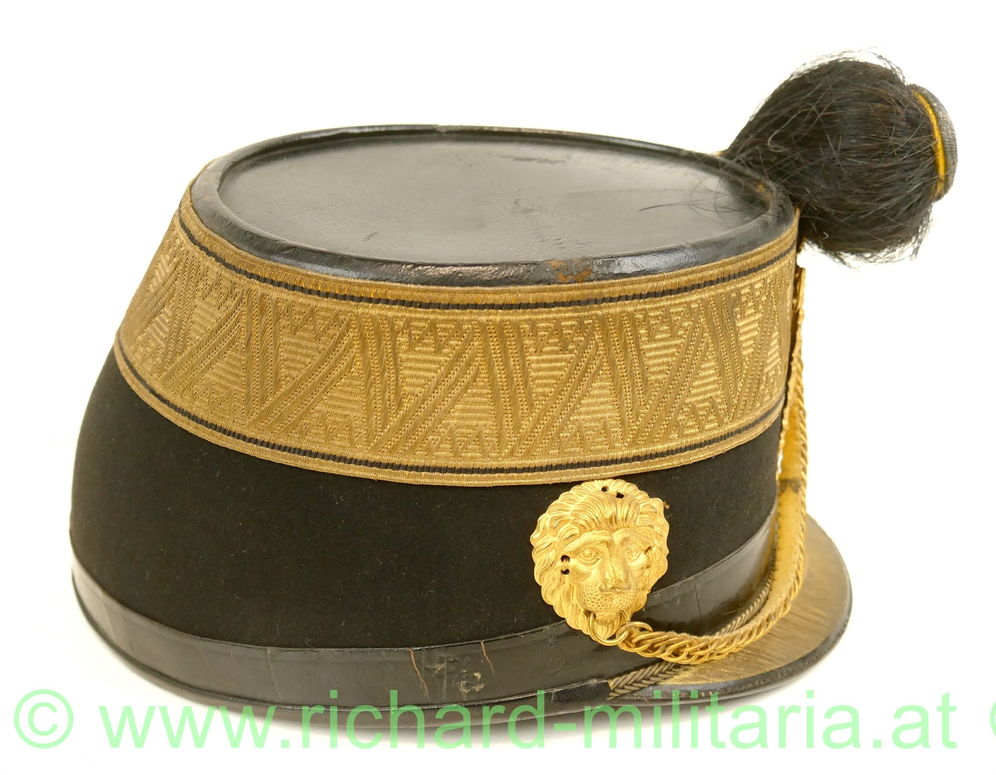 k.u.k. Tschako eines Subalternoffiziers (Leutnant, Oberleutnant) der Artillerie; mit schwarzem Filz überzogener steifer Korpus; umlaufende Offiziersborte aus Goldgespinst für Subalternoffiziere; vergoldeter Doppeladler mit eingesteckter Rosette (FJ1) mit Rosshaarbusch; links und rechts je ein vergoldeter Löwenkopf der im Maul die vergoldete Kette zum Doppeladler hält; Schirm mit Goldborte; Rosshaarbusch zusätzlich mit einem gelb/schwarzen Wollfaden zusammengebunden; Halterungsband für den Rosshaarbusch vorhanden; hellbraunes Stirnleder; innen mit rotem feinem Tuch ausgelegt; Hersteller "M. Kaufmann" innen aufgedruckt; Kinnriemen fehlt; Größe ca. 56;
