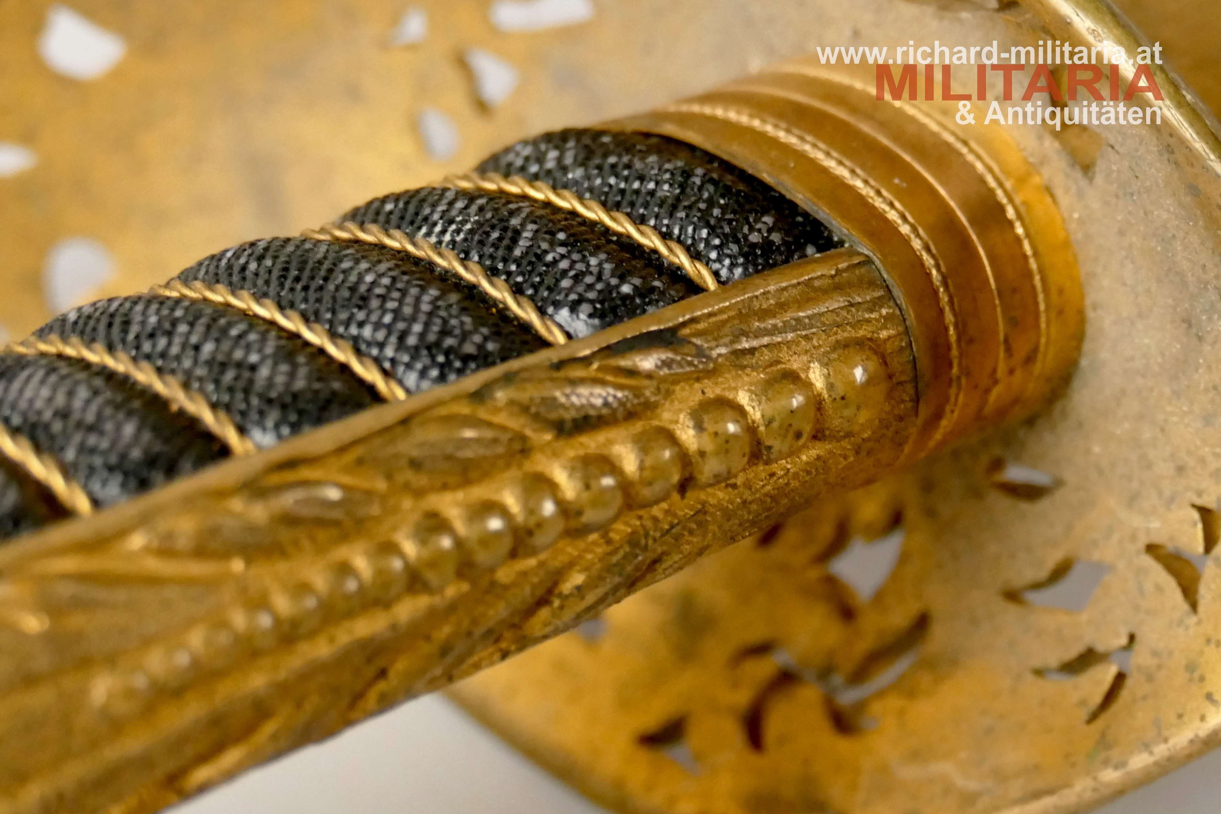 k.u.k. Beamtendegen M1889; beidseitig gekehlte vernickelte Klinge - diese durch altes Fett etwas fleckig (einfach zu reinigen!); kein Hersteller ersichtlich; durchbrochener floral verzierter und vergoldeter Messingkorb; Griff aus Fischhaut mit vergoldeter gedrillter Drahtwicklung; belederte Eisenscheide mit vergoldeten Messingbeschlägen; darauf der Allerhöchste Namenszug "FJ1"; Belederung mit stärkeren Abnutzungsspuren; Vergoldung recht gut erhalten;
