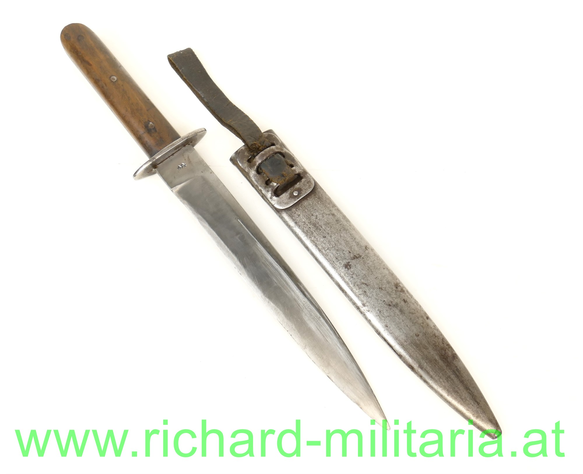 k.u.k. Grabendolch M17; Hersteller: WWF - Wiener Waffenfabrik; Klinge geschärft/beschliffen und gereinigt; k.u.k. Armeeabnahme auf der Parierstange; 3-fach vernietete Holzgriffschalen; originale Scheide Typ A/4 mit Hersteller "V & N" und dünner Ledertrageschlaufe; Scheide gereinigt - komplett ohne Lack;