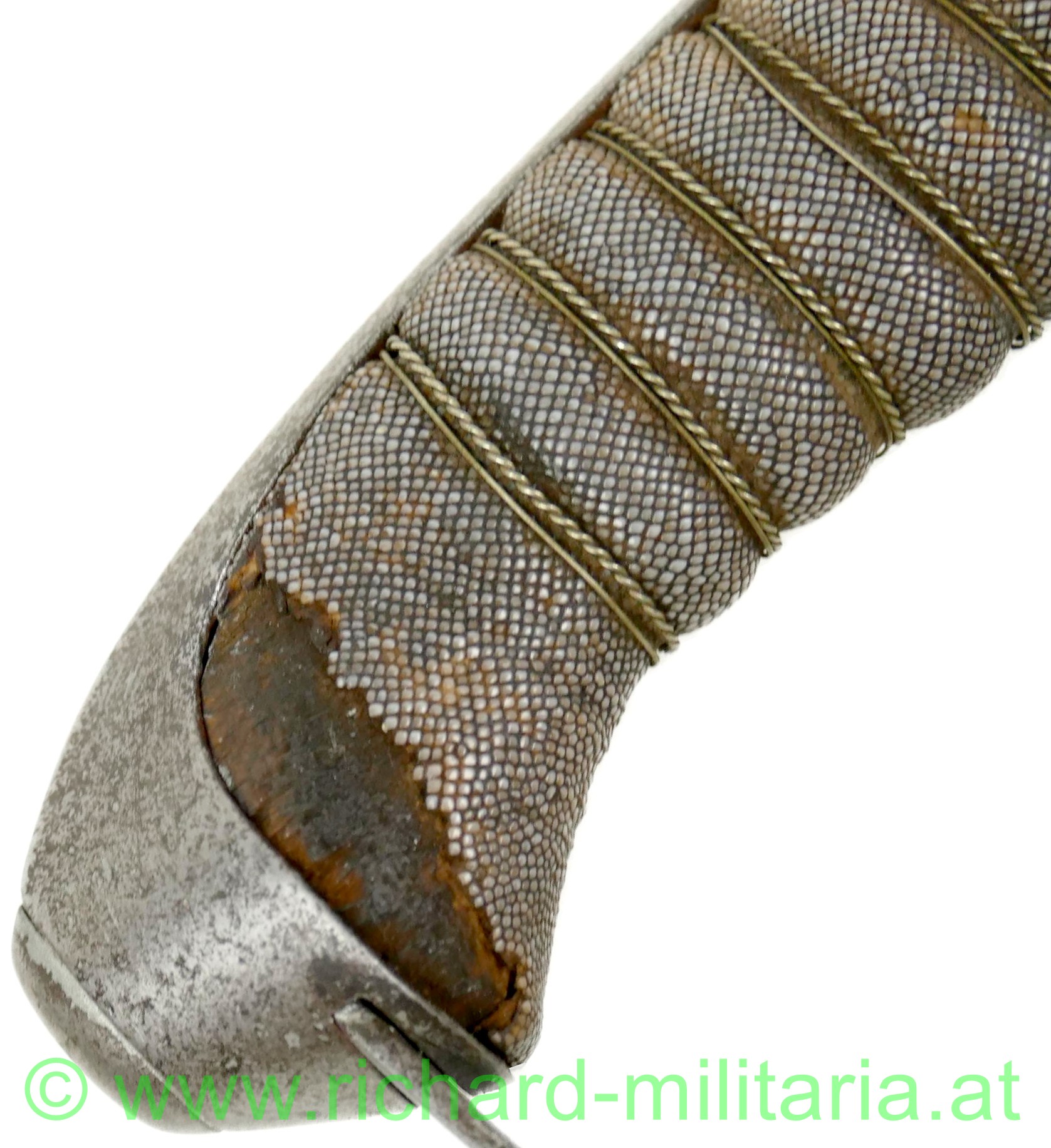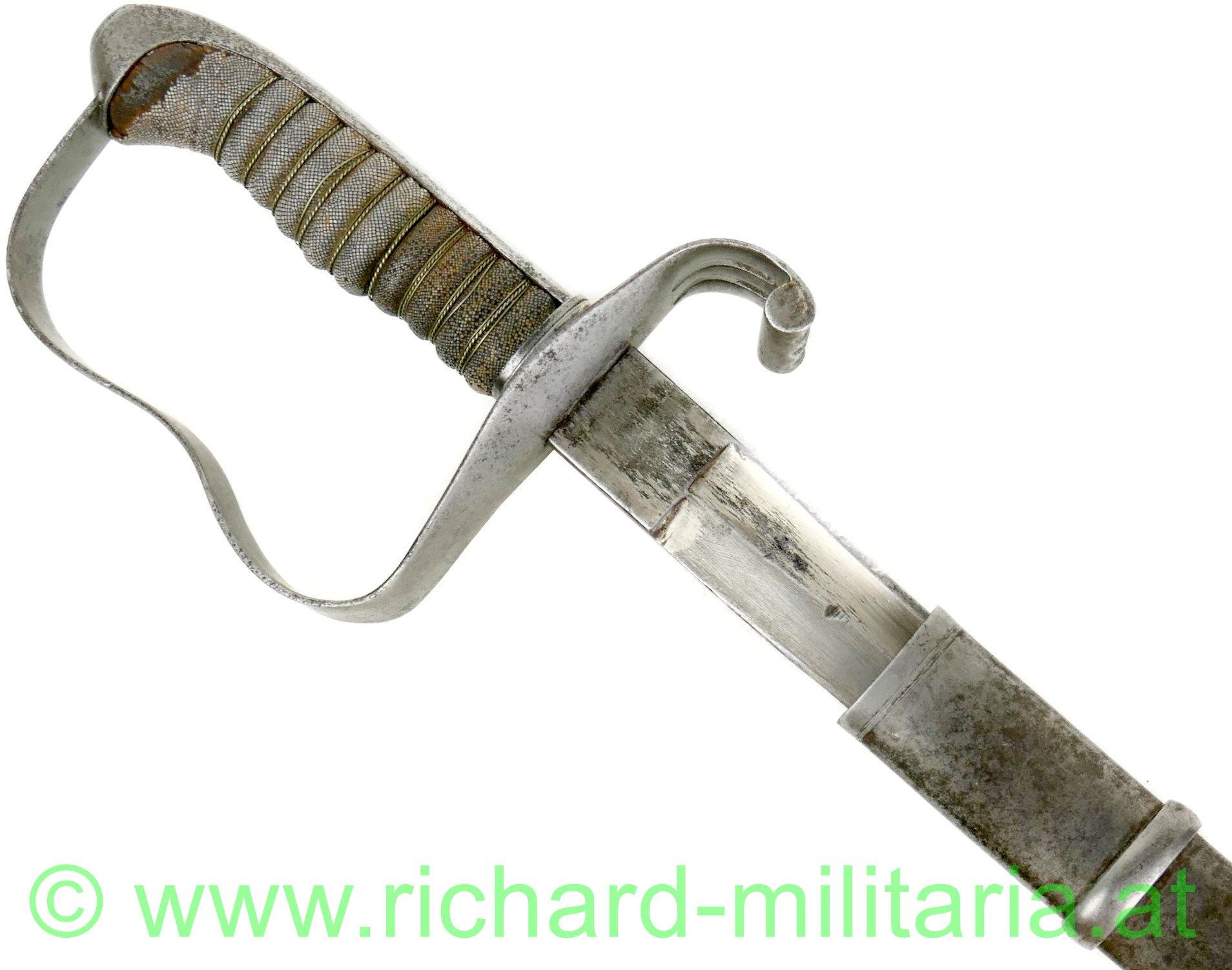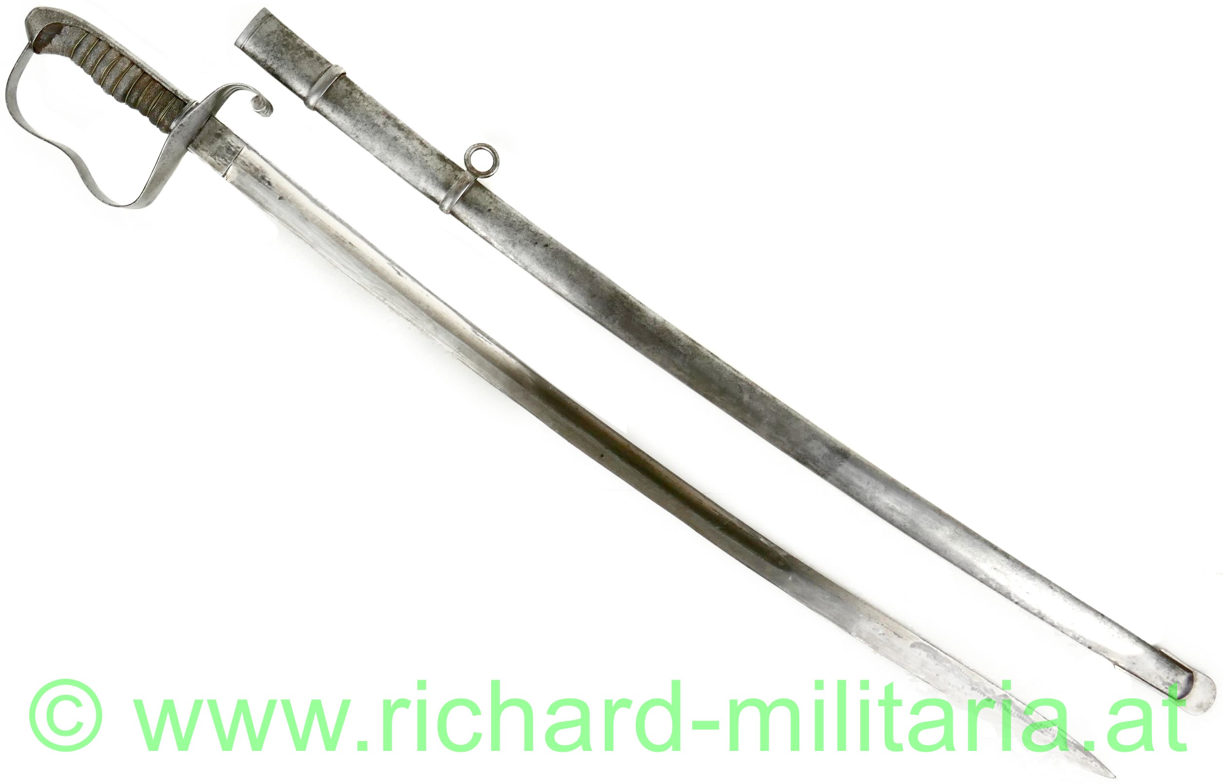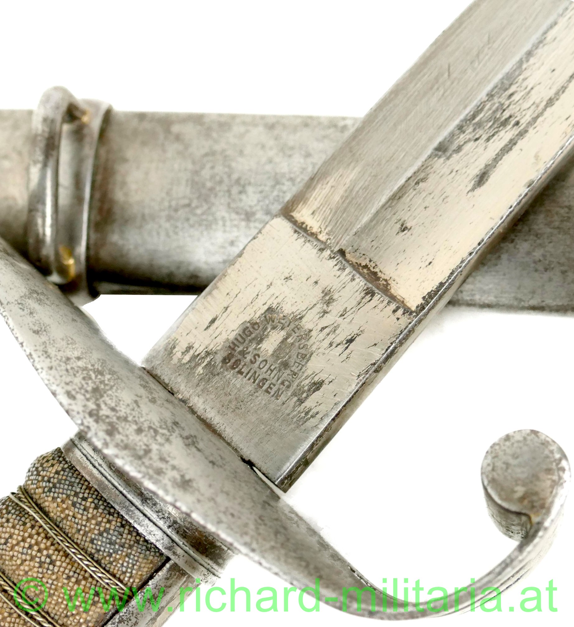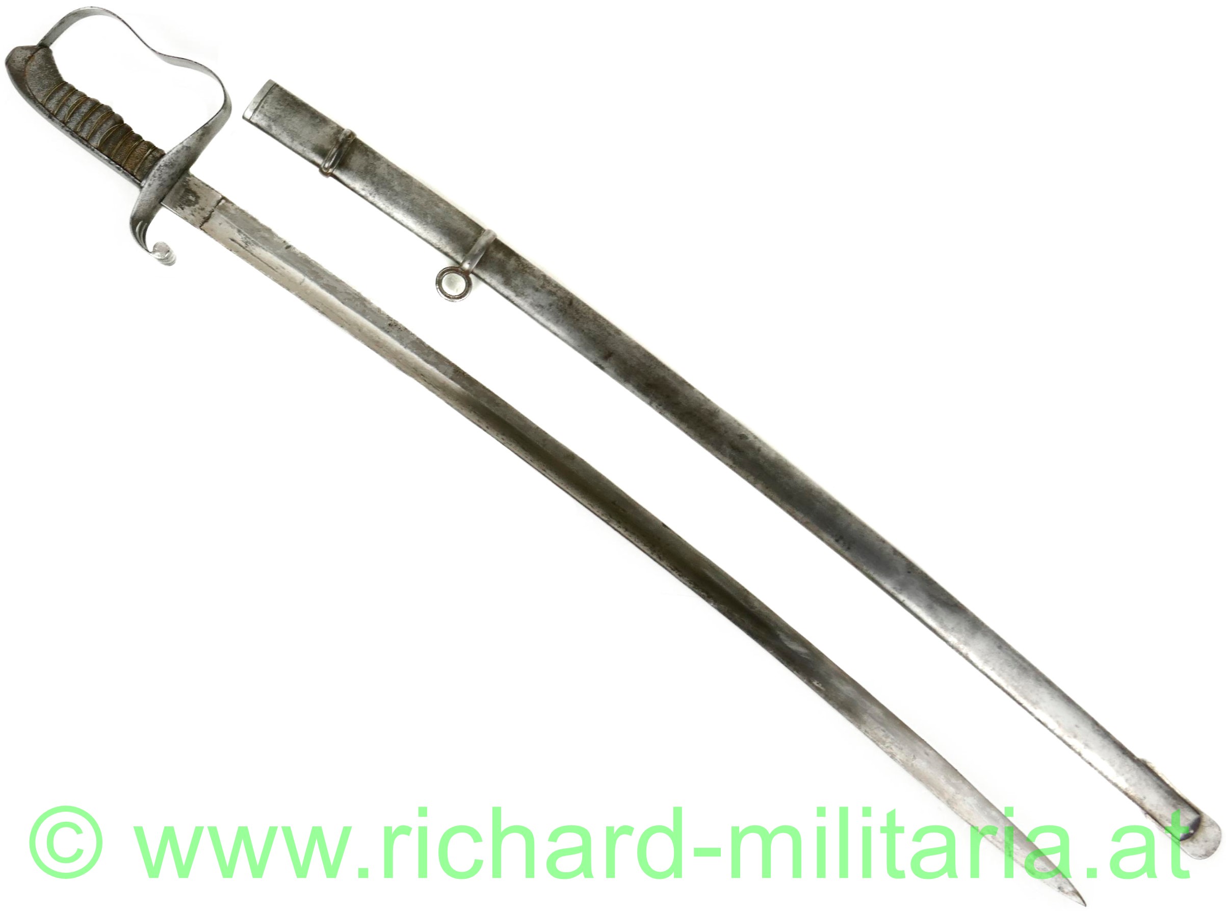 k.u.k. Infanterie-Offizierssäbel M1861, Klinge beschliffen mit Resten der Vernickelung, Klinge beidseitig gekehlt, Herstellerstempel: "Hugo Weyersberg & Sohn, Solingen"; Holzgriff mit Fischhaut überzogen - auf einer Seite mit mit einer kleinen Fehlstelle, Griff ist mit Drahtwickelung, Scheide gereinigt und ohne größere Dellen, originale Tragevorrichtung für Hängekuppel;