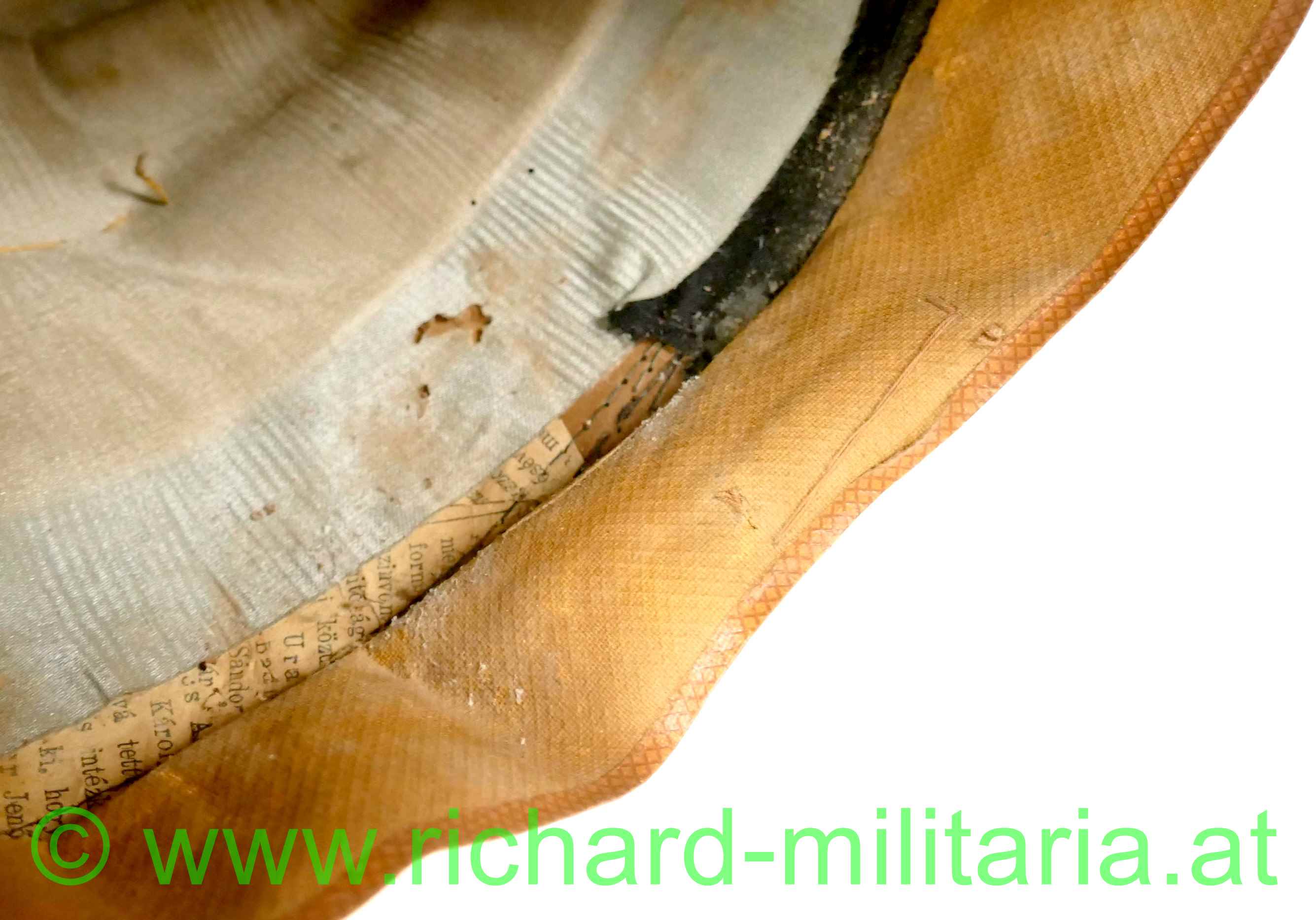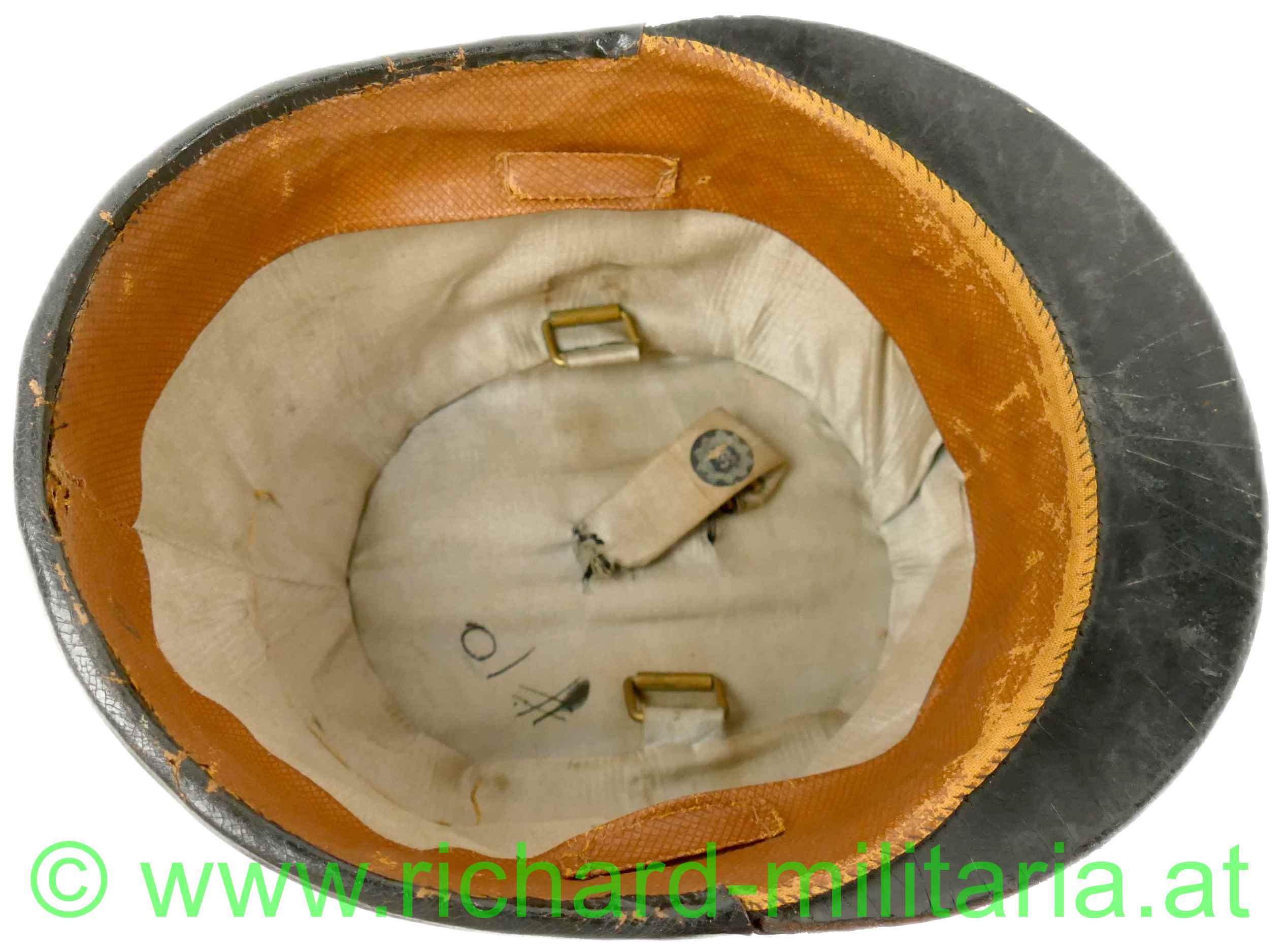 k.u.k. Infanterie-Tschako eines Fähnrichs; schwarzer steifer Korpus mit zweiteiliger Wollborte eines Fähnrichs; vorne aufgelegter vergoldeter Doppeladler mit dem Allerhöchsten Namenszug "FJ1"; eingeschobene Mannschaftskokarde; hellbraunes Stirnleder; innen mit grauem Seidenstoff ausgelegt; handschriftlich mit "#10" beschriftet; mittige Aufbewahrungshalterung für den Kinnriemen locker; darauf Größenangabe "56";