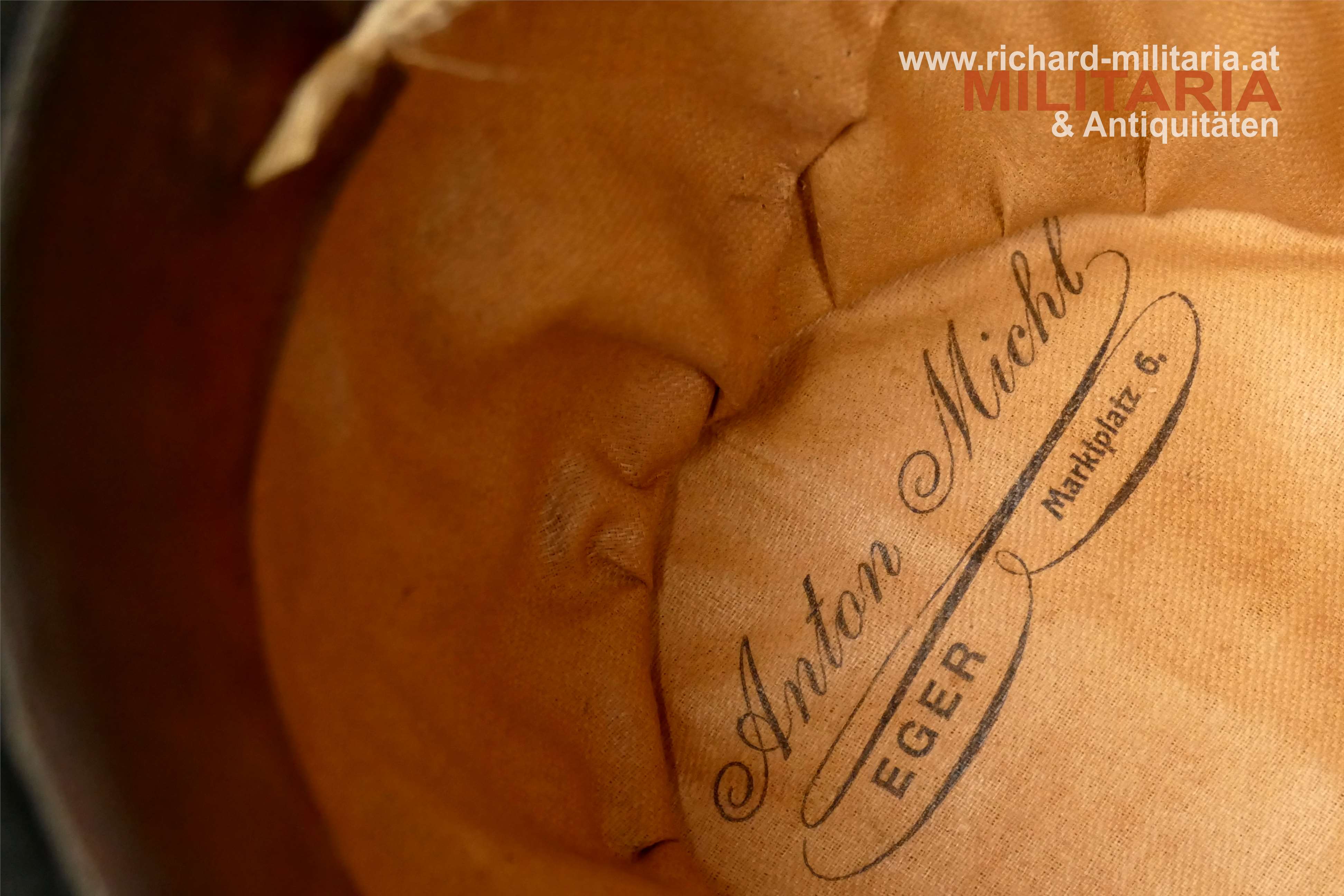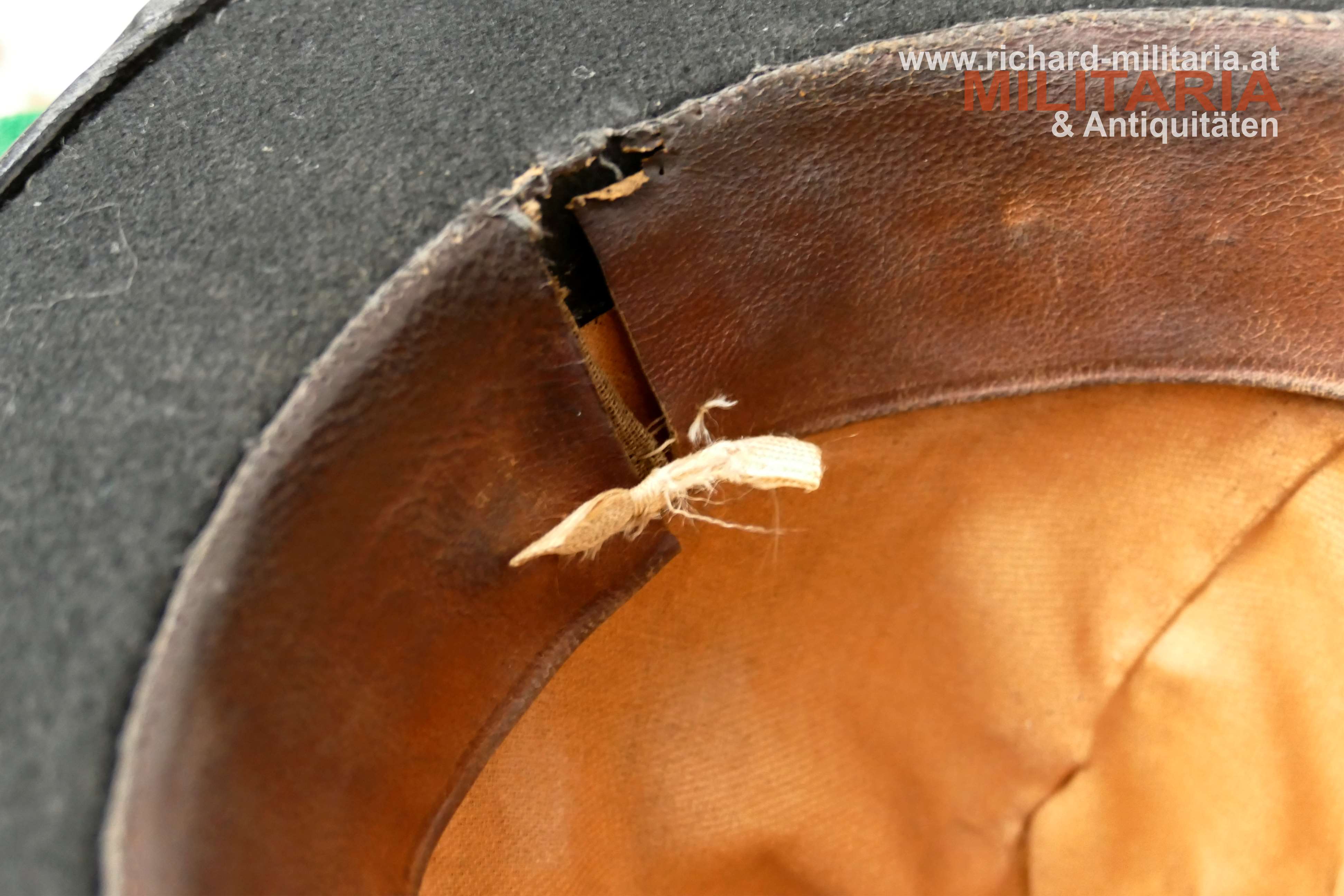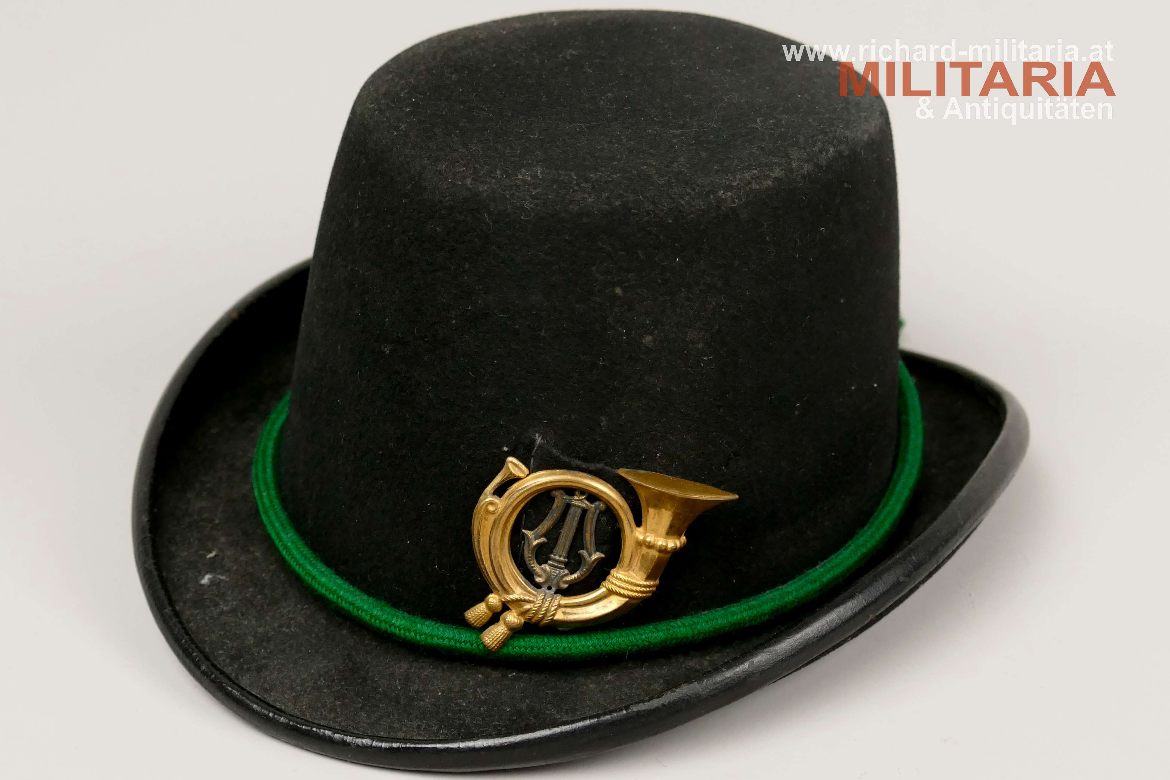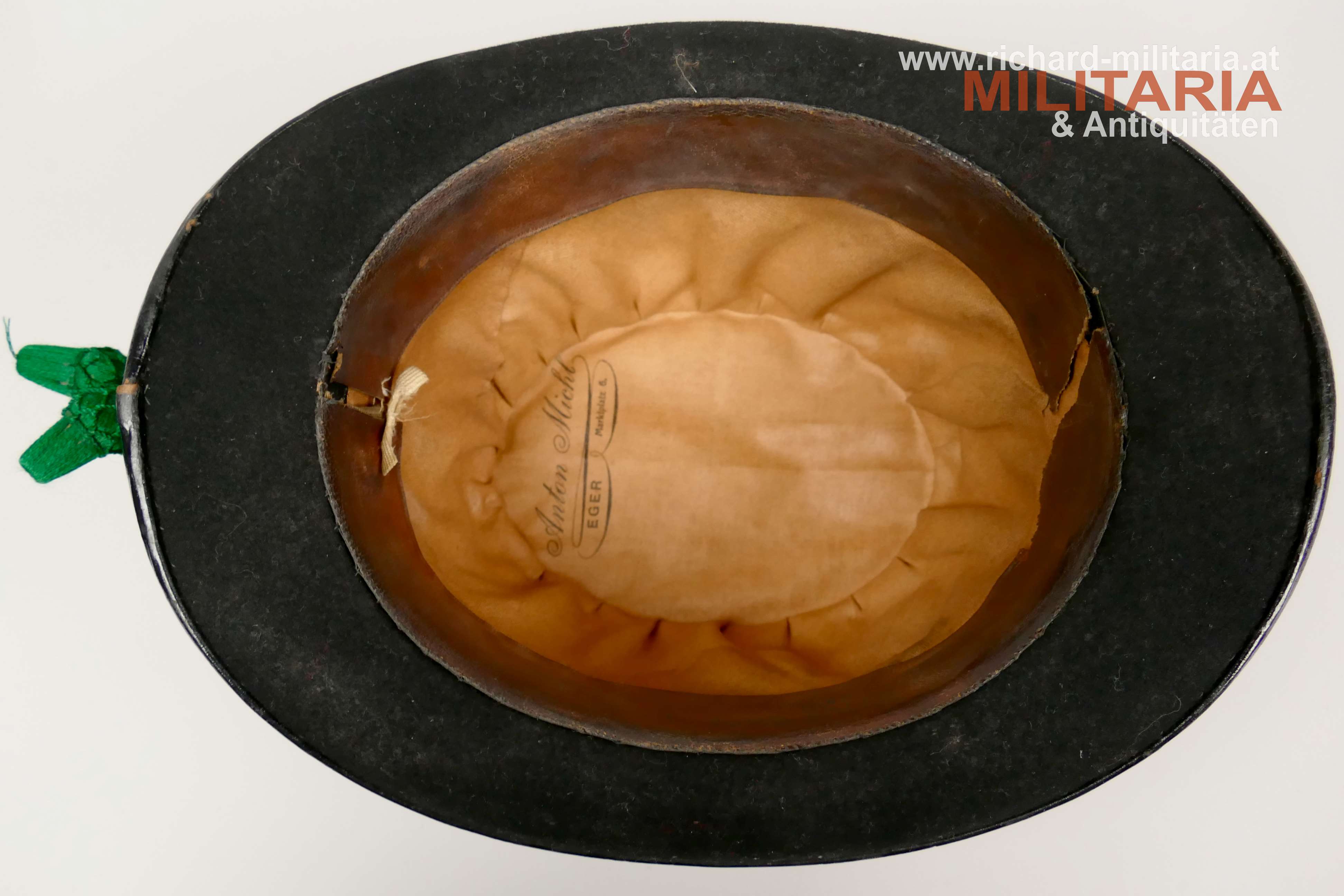 k.u.k. Jägerhut - Musiker - Mannschaft; schwarzer Filzstoff; aufgeklammertes Regimentshorn mit LYRA; grüne Hutkordel für Mannschaften; Innenfutter aus hellorangem Stoff; dunkelbraunes Stirnleder; kein Größenstempel ersichtlich; Hersteller: "Anton Michl - Eger - Marktplatz 6";