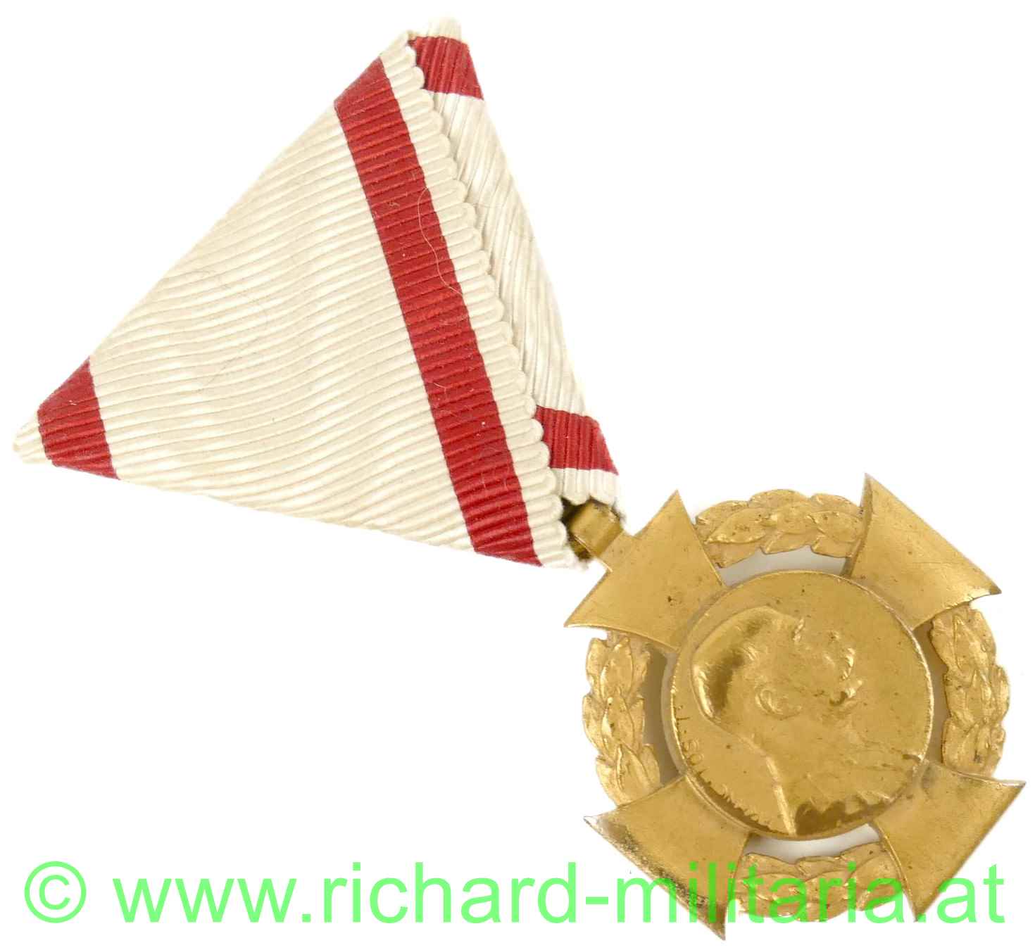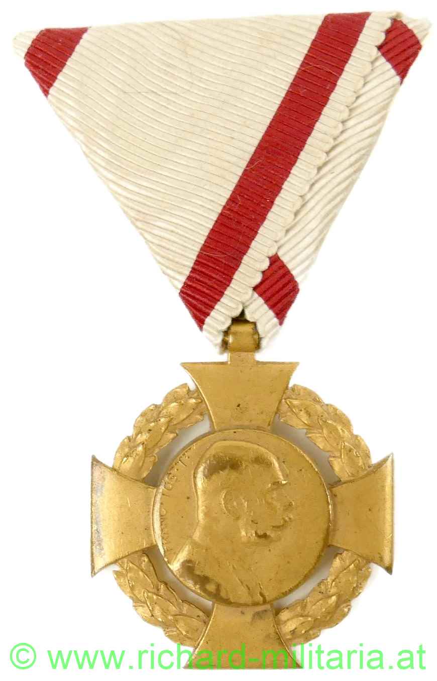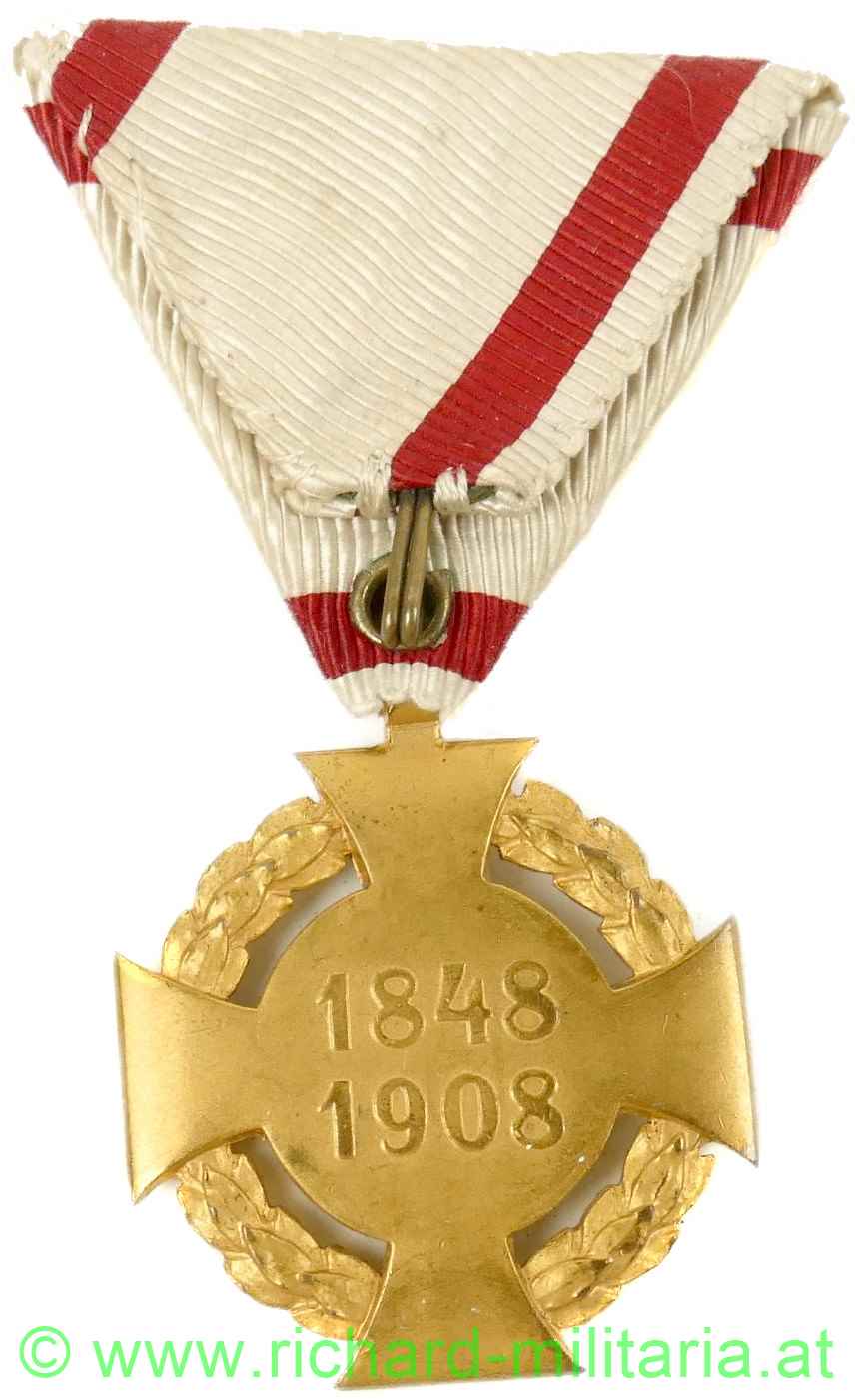 k.u.k. Jubiläumskreuz 1848 -1908, Tombak - mit gut erhaltener Feuervergoldung - mit originalem Band für Militär,