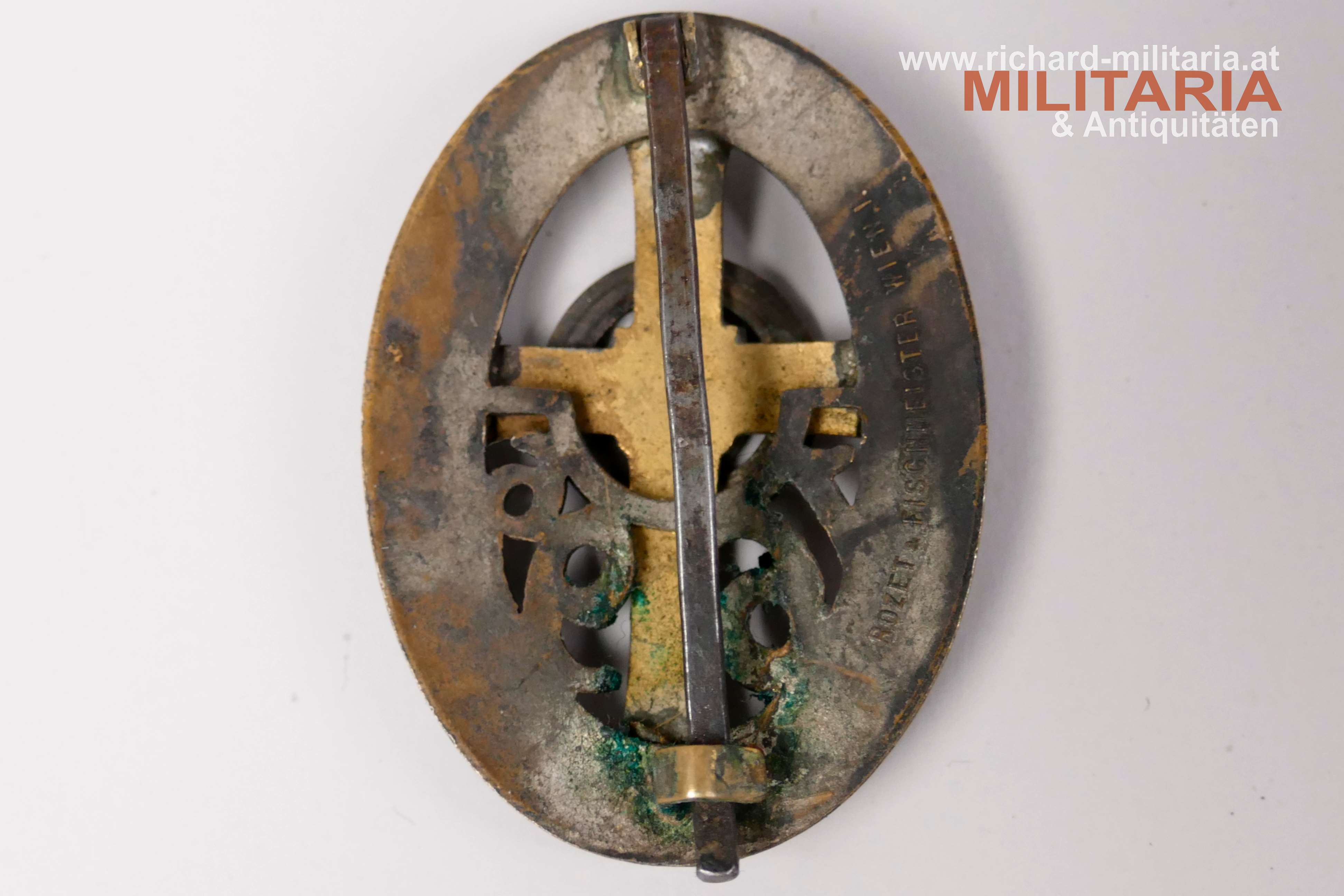 k.u.k. Kappenabzeichen IR 4 - Hoch- und Deutschmeister; Bronze versilbert und teilweise emailliert; Versilberung großteils vergangen; revers patiniert; Emaillierung in guter Erhaltung; revers mit Hersteller "Rozet & Fischmeister Wien"; originales Nadelsystem;