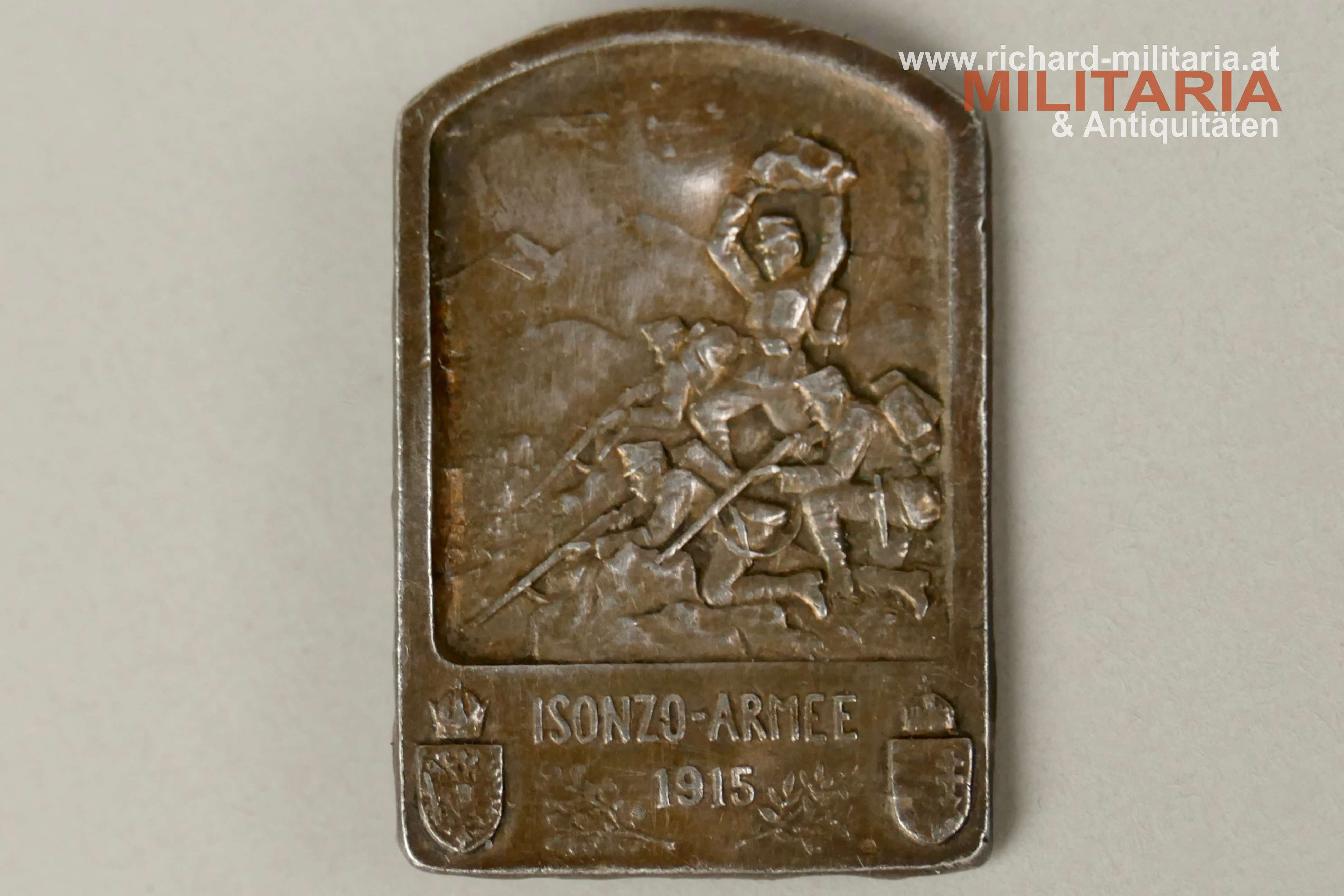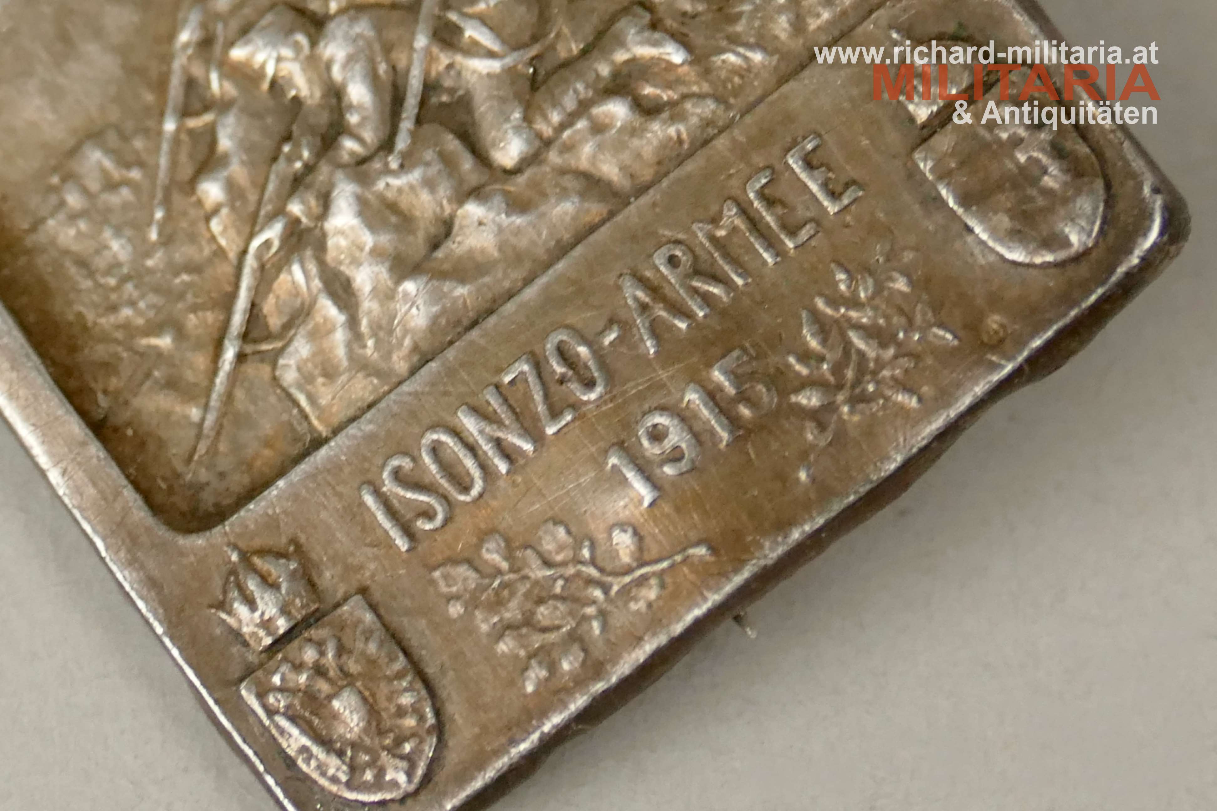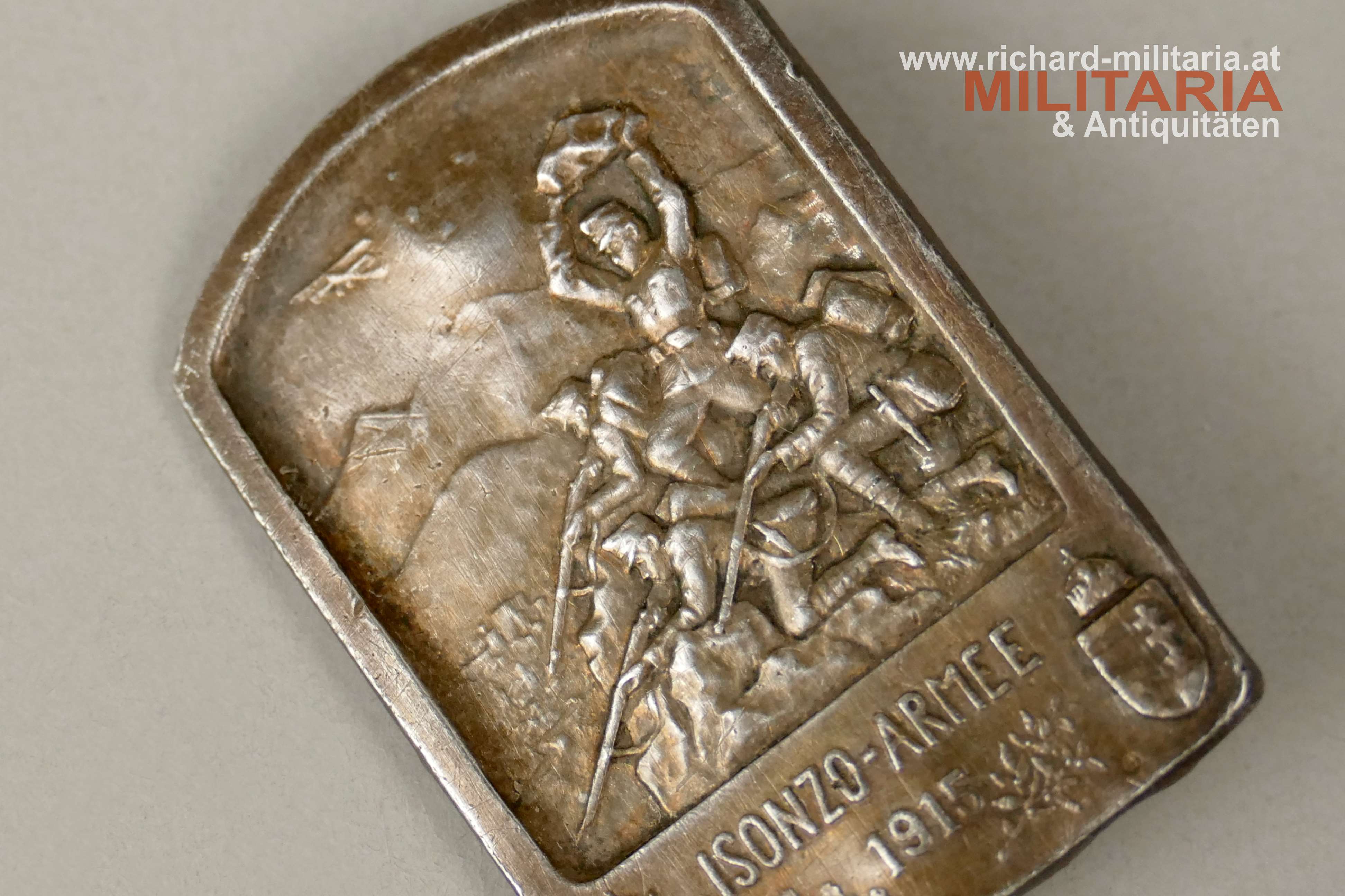k.u.k. Kappenabzeichen - Isonzo-Armee 1915 - SILBER, Kontrollamtspunze A rechts unten auf der Vorderseite, originales Nadelsystem;