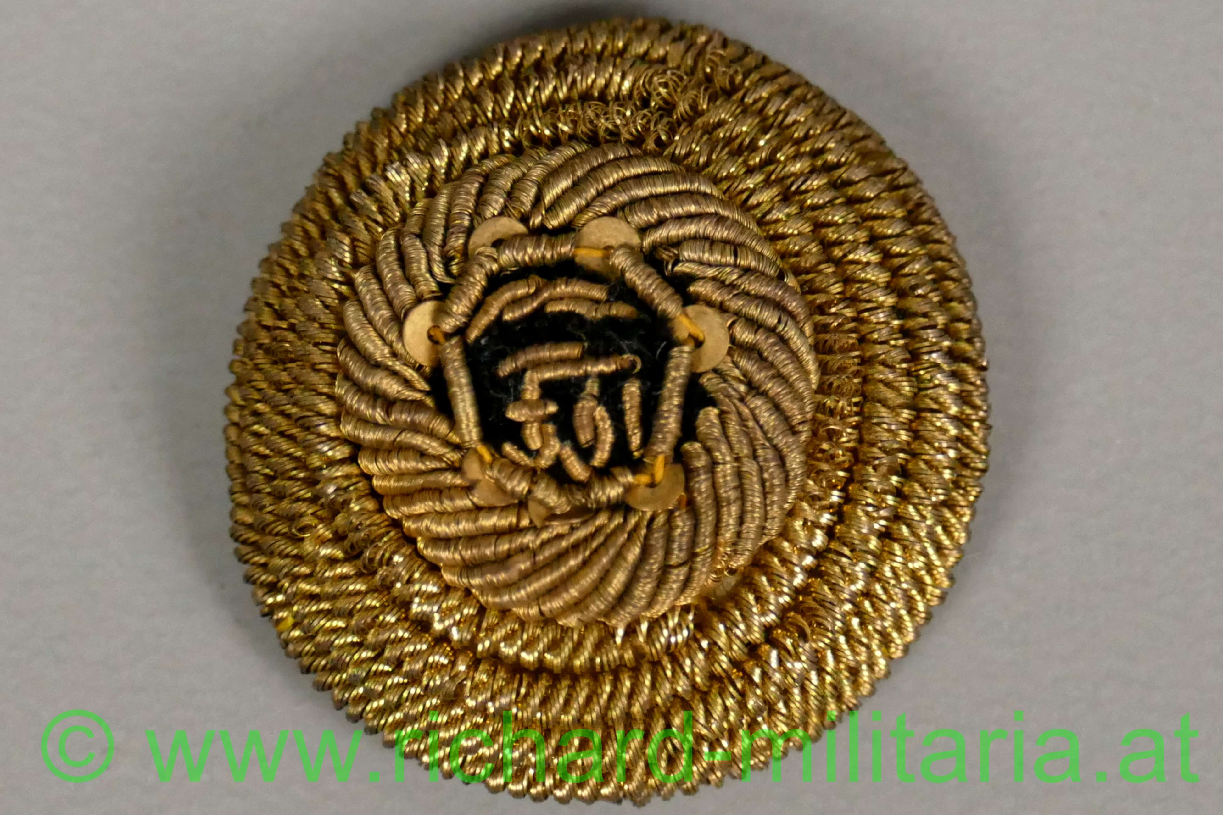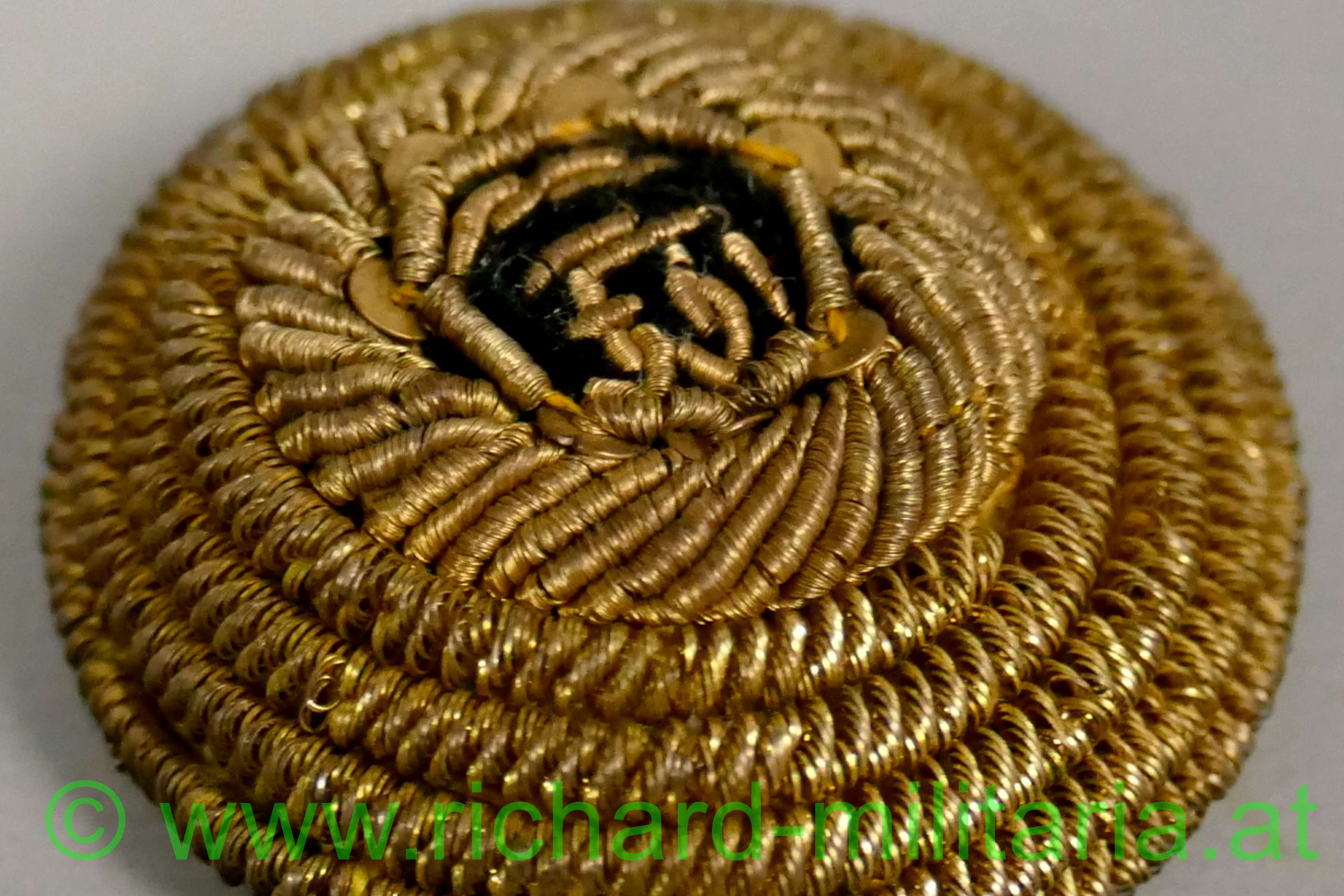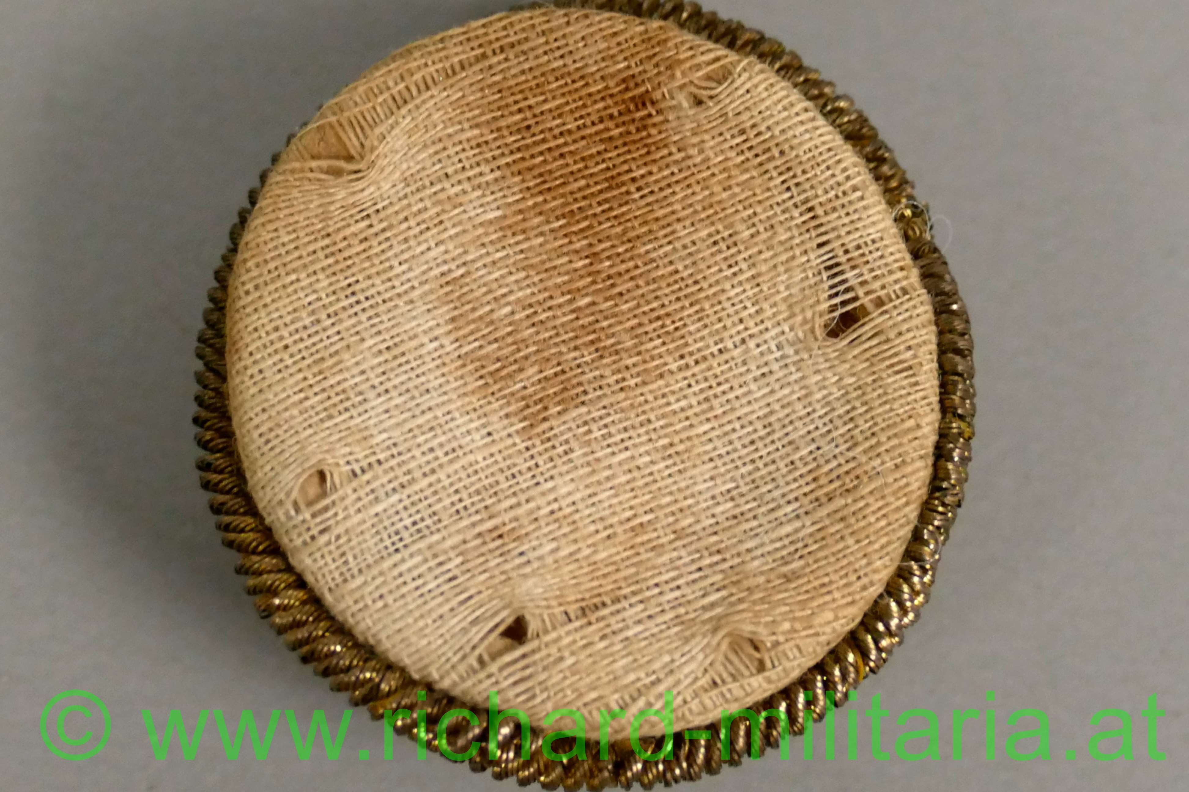 k.u.k. Kappenkokarde f. Offiziere Kaiser Franz Josef, Gespinst aus Goldfaden mit Initialen FJI auf schwarzem Stoffgrund, Rückseite mit beiger Stoffabdeckung, von der Kappe abgetrennt;