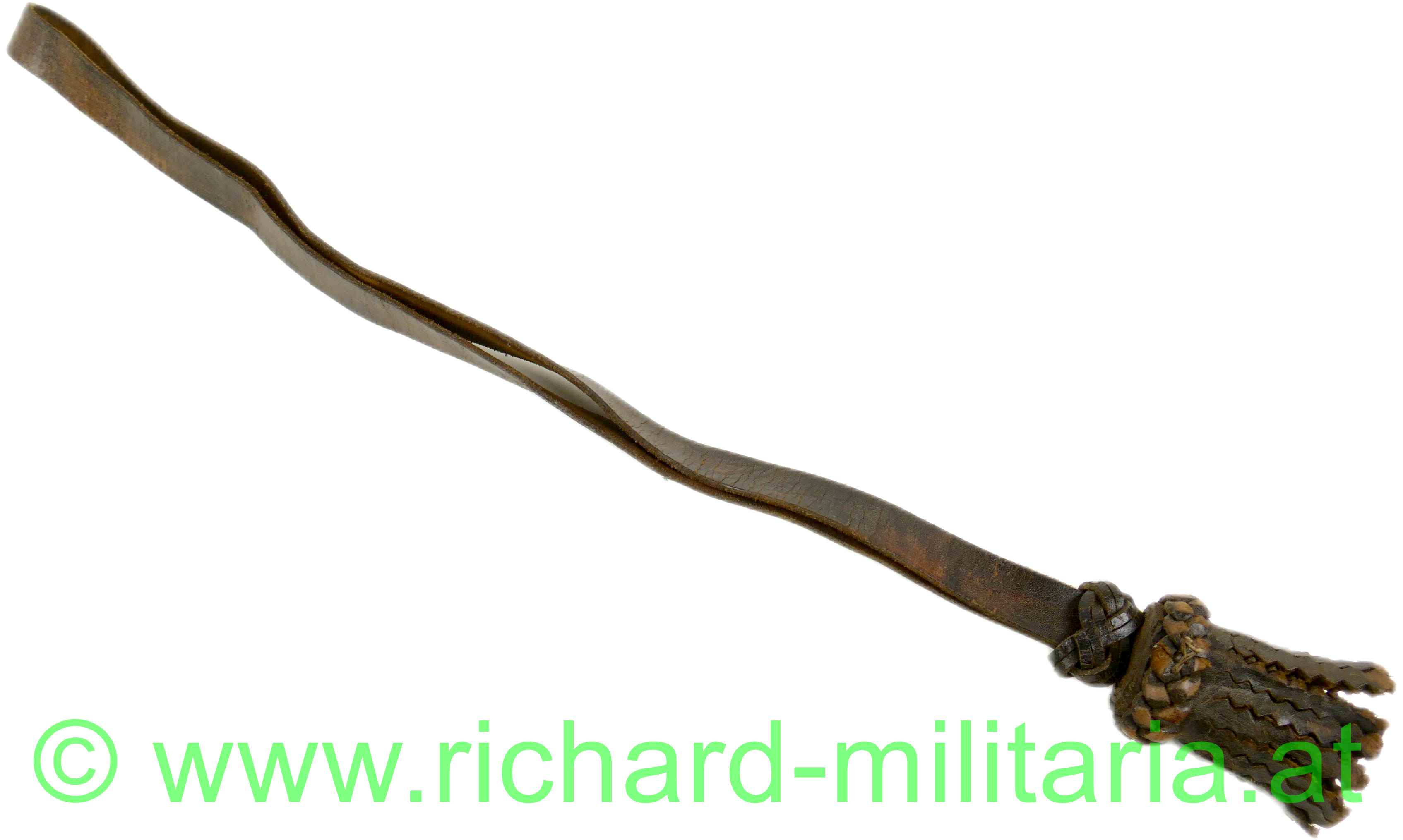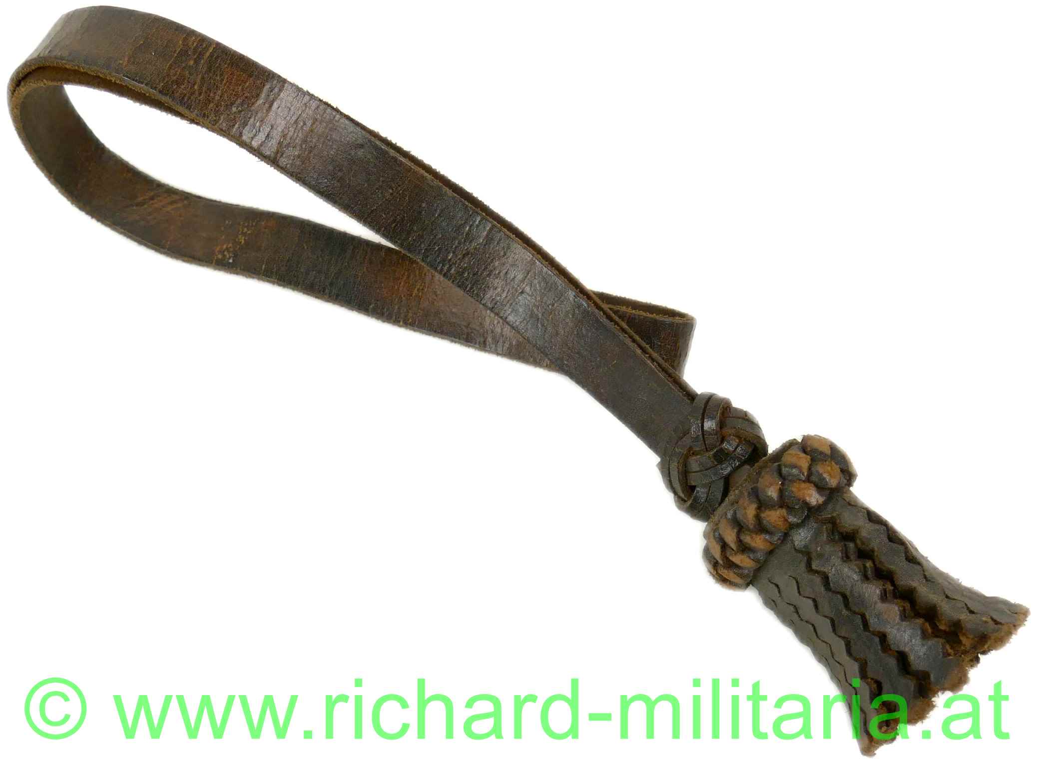 k.u.k. Kavallerie Mannschaft - juchtenlederner Handriemen, dickes braunes Leder mit Tragespuren; offene Quaste mit geflochtenem Schieber, guter Zustand;