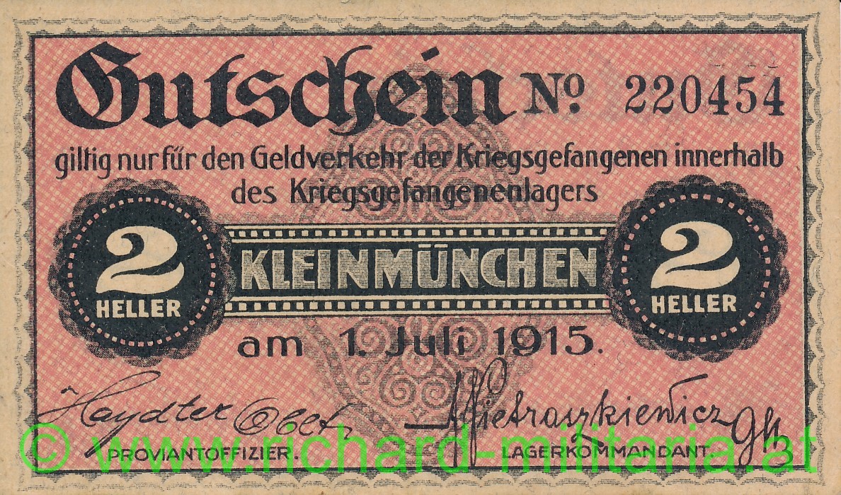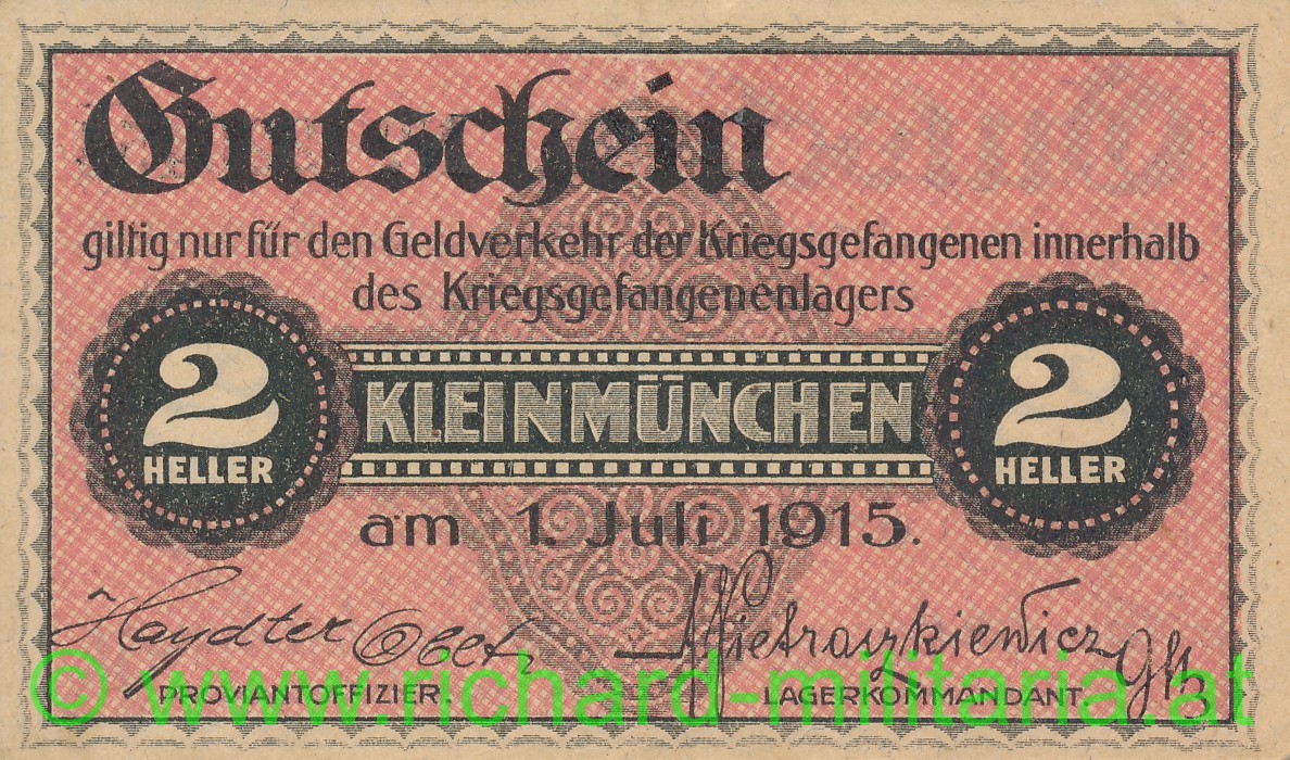k.u.k. Kriegsgefangenenlager Kleinmünchen, Lagergeld 2 Heller, sehr guter Zustand