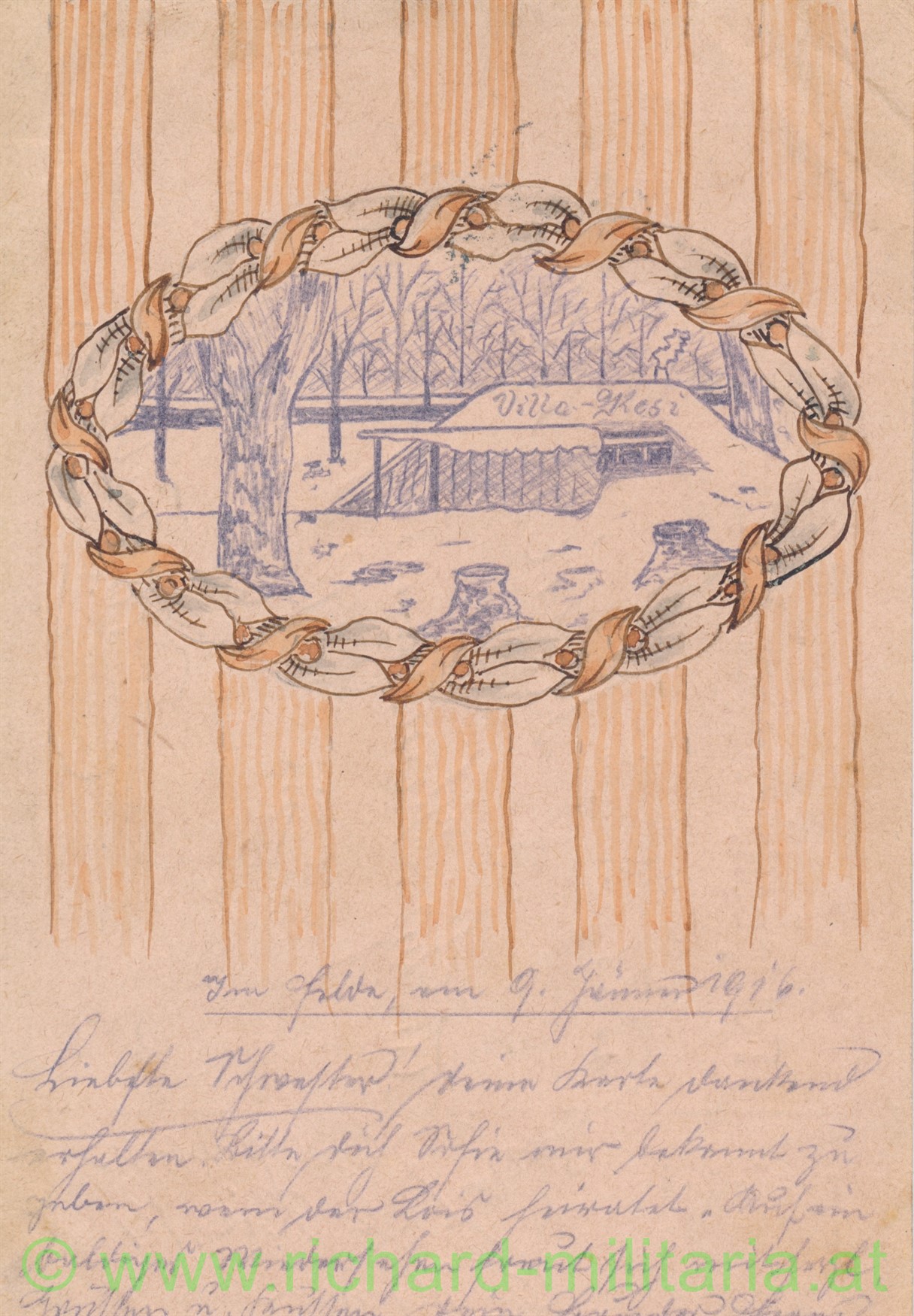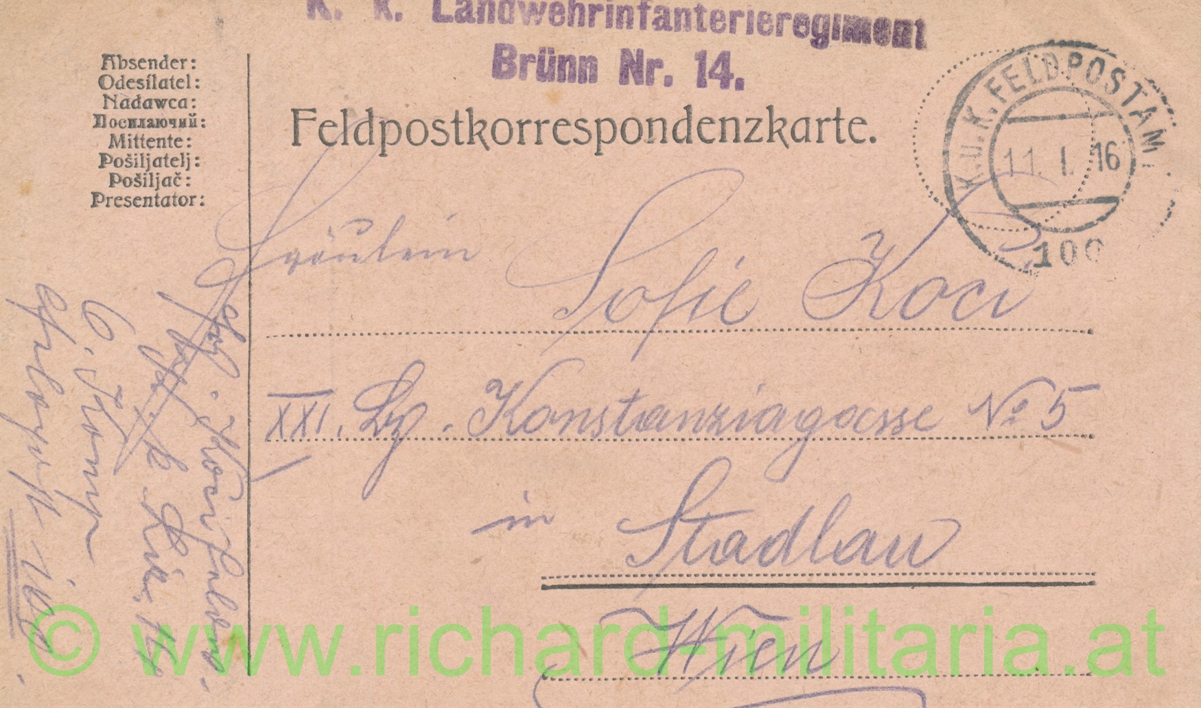 handgemalte Karte mit Truppenstempelung des kk. Landwehr-IR Brünn Nr. 14