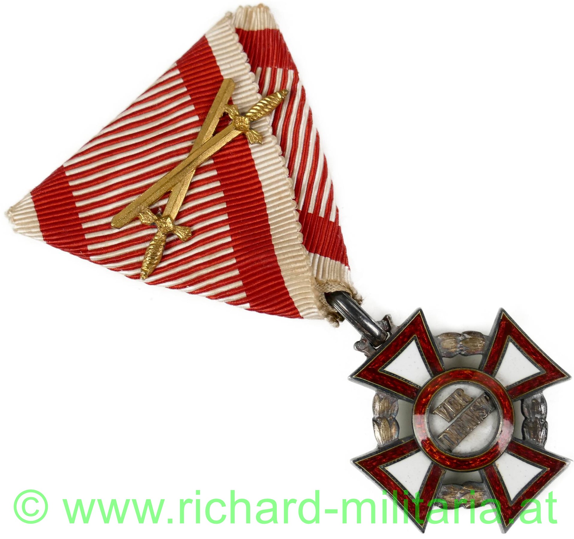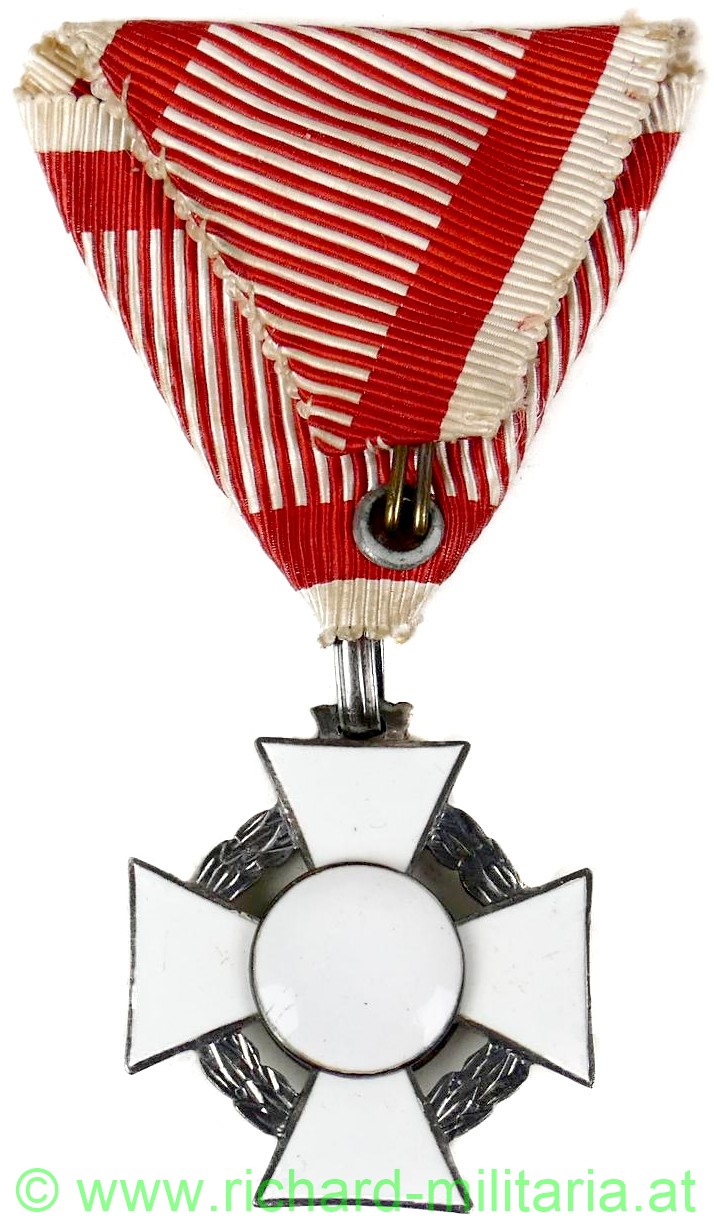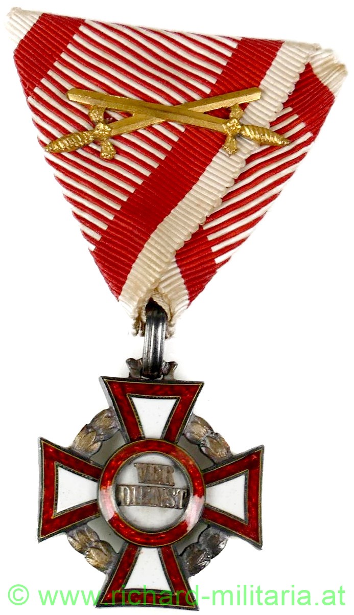 k.u.k. Militärverdienstkreuz III. Klasse mit Kriegsdekoration und Schwertern, Silber mit Dianakopfpunzierung, Hersteller "VM" - Vinzenz Mayer; feine Fertigung; Email komplett unbeschädigt (!); schönes feines Seidenband mit aufgeklammerten Schwertern;