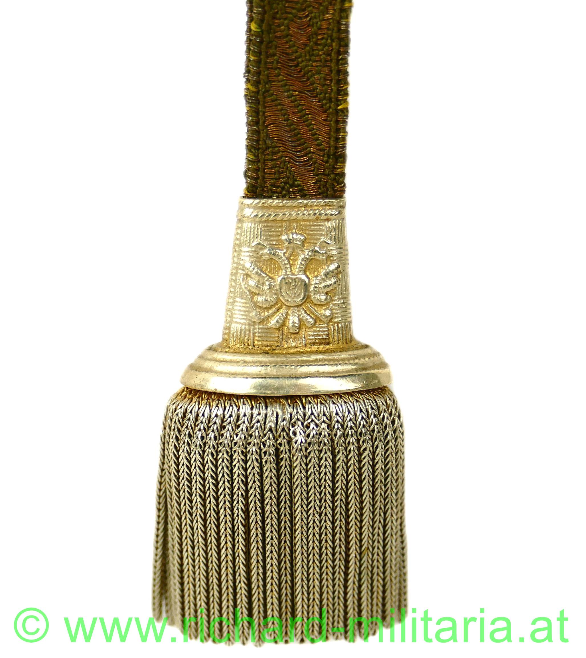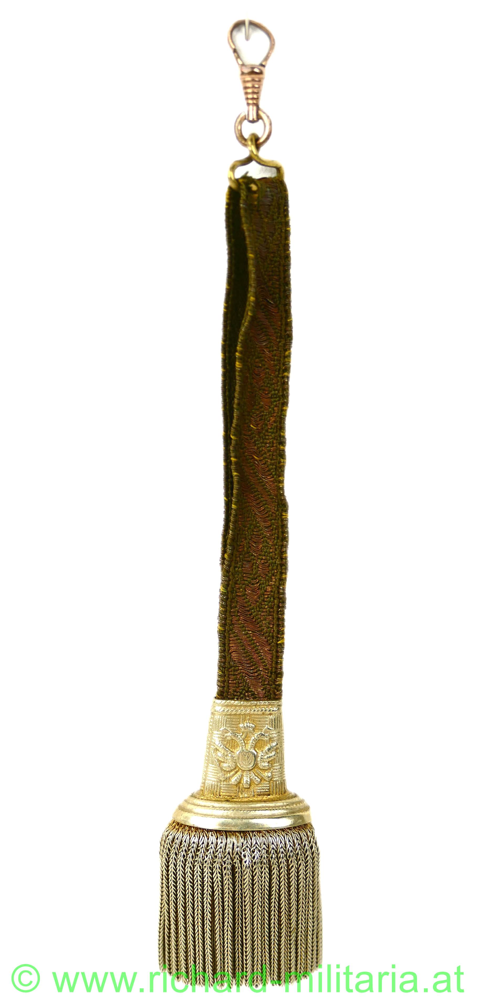 k.u.k. Offiziersportepee - Bierzipf, Metallfadengespinst u. Karabinerhaken, Weißmetall geprägter Stengel mit Doppeladler und FJI, weiße gedrehte Metallfransen,