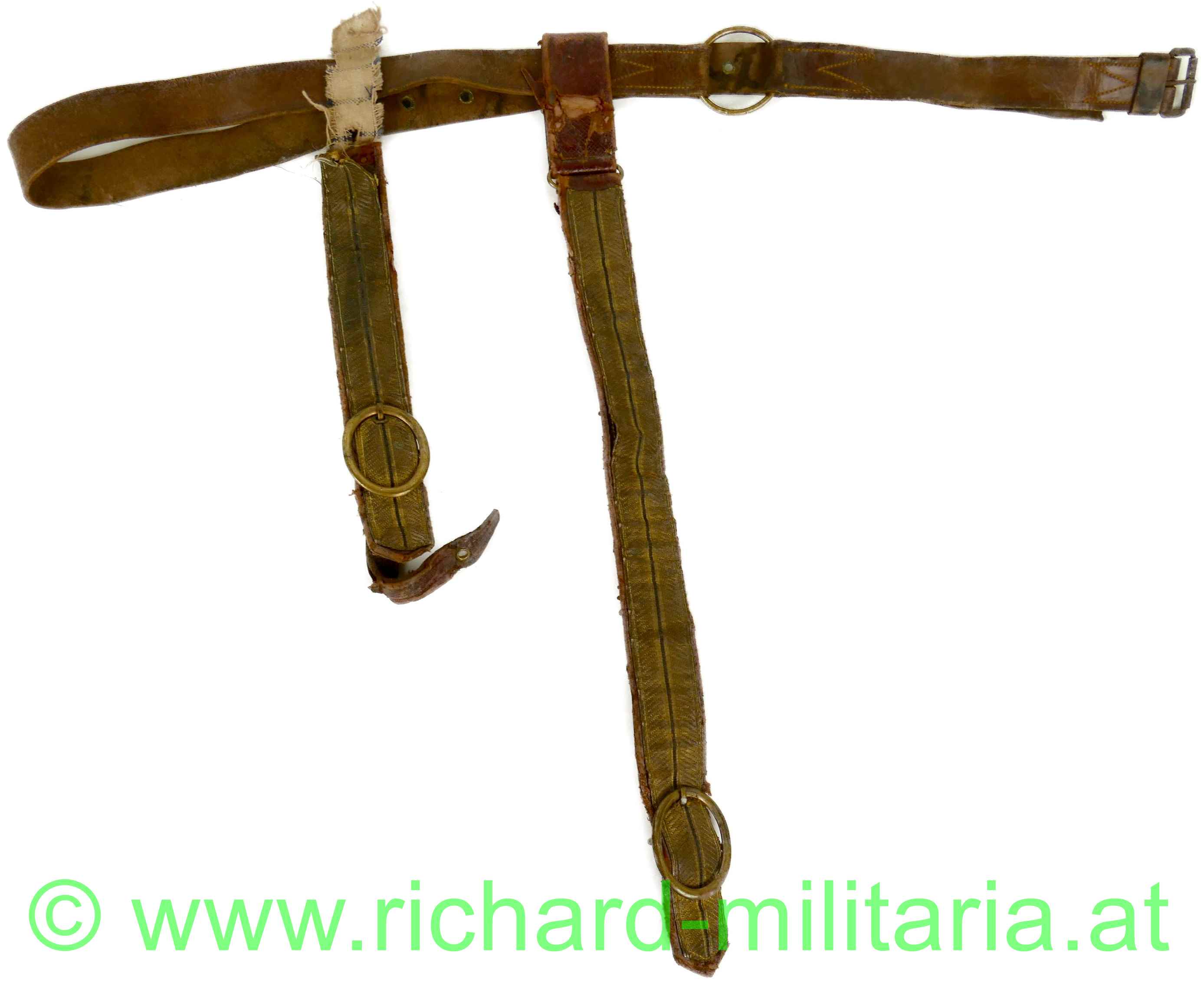 k.u.k. Säbelgehänge für Offiziere, Stulpen aus rotem Leder mit aufgenähten Goldborten für Offiziere - Nähte teilweise offen - Leder auf der Rückseite beschädigt - der kurze Lederriemen hat sich vom Tragering komplett gelöst, brauner Leibriemen mit Verstelllöcher diese mit Messingösen verstärkt - keine zusätzlichen Löcher gestochen (!); Längenstempel nicht komplett ersichtlich;