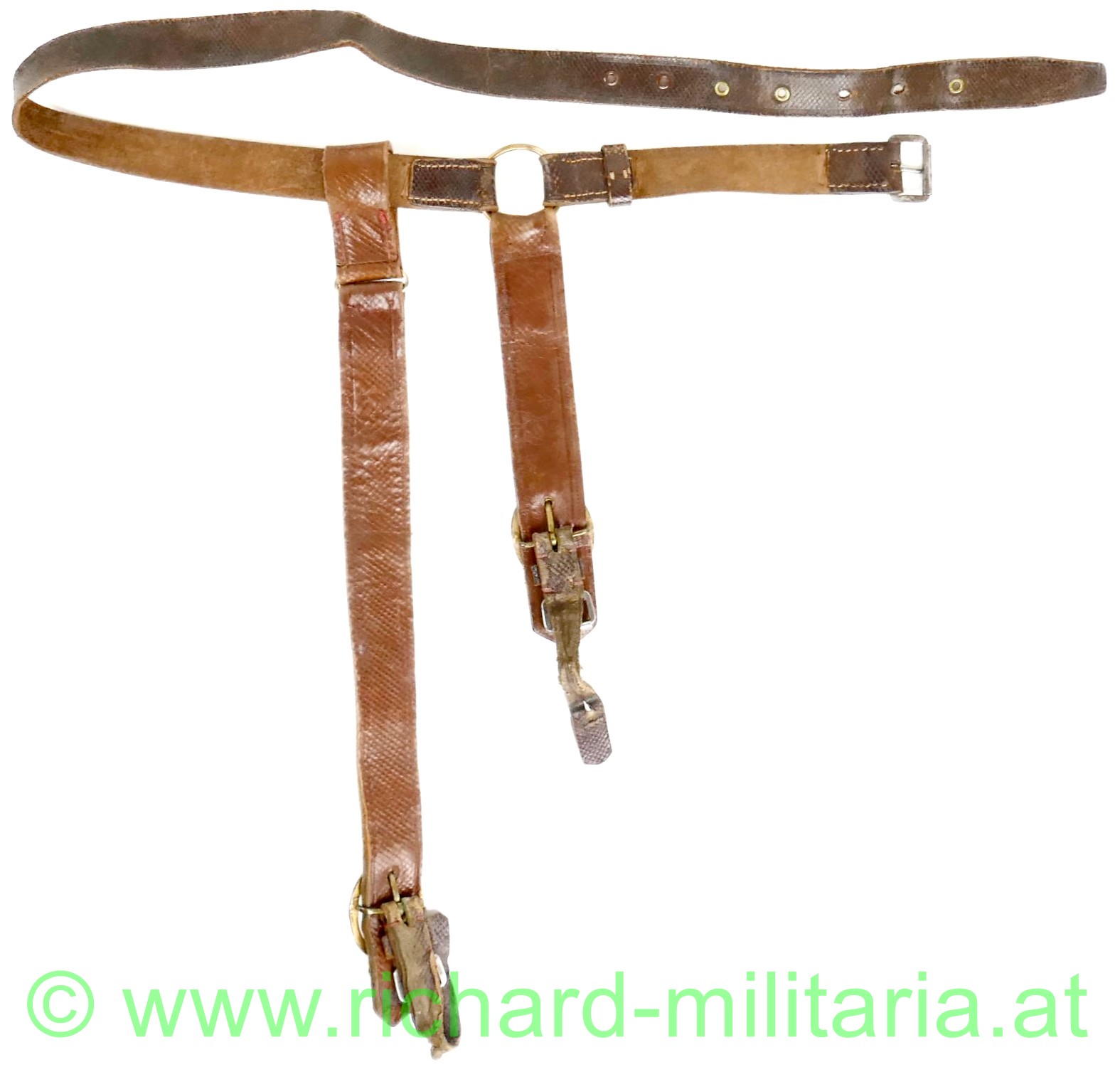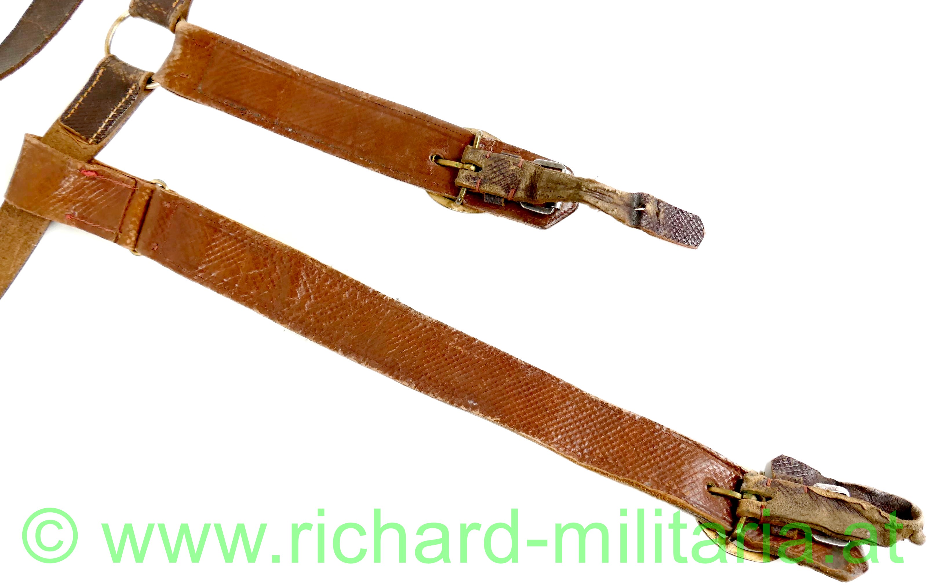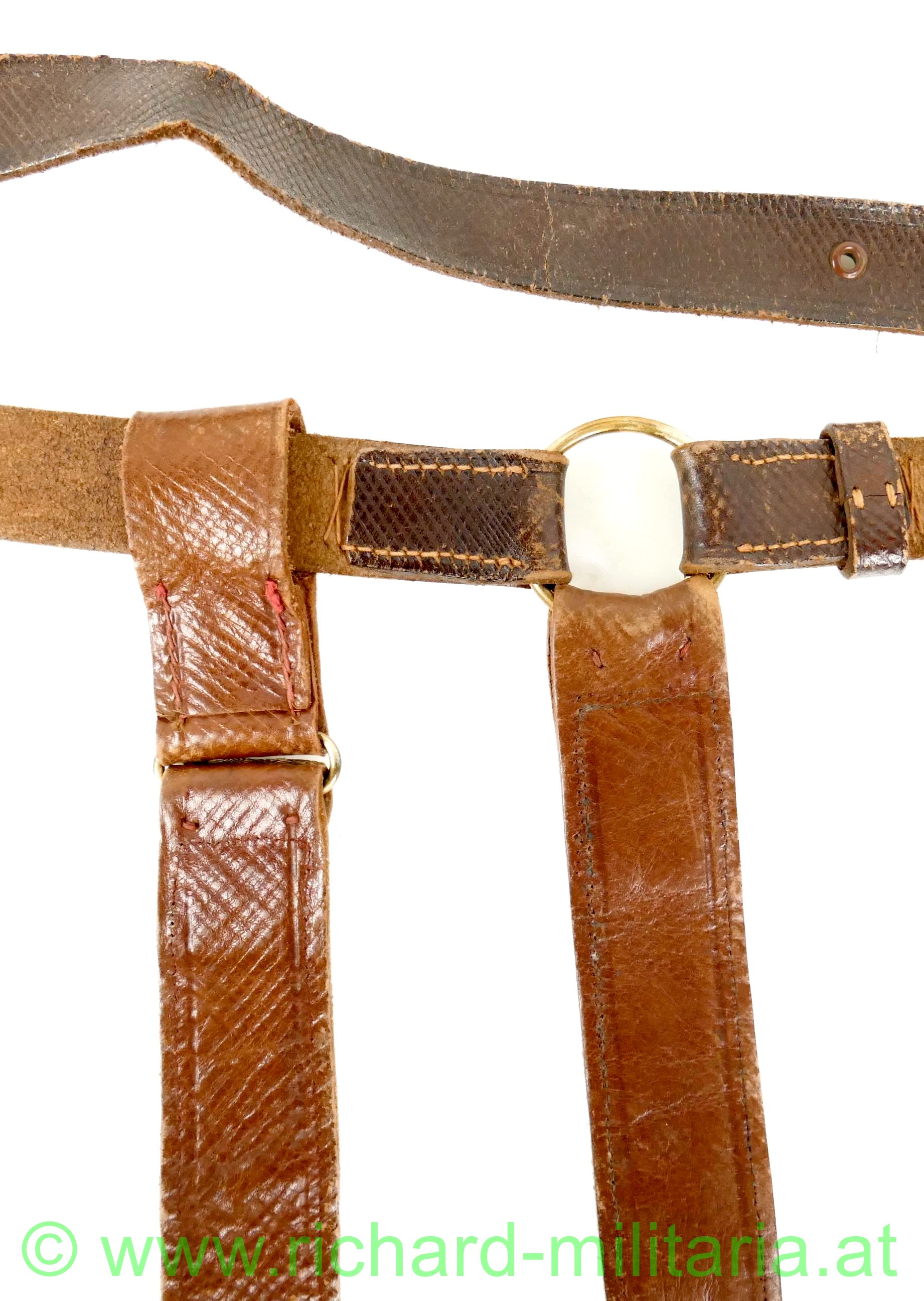 k.u.k. Säbelgehänge für Offiziere; Leibriemen aus dunkelbraunem Leder ohne zusätzlich gestochene Löcher (!); Stulpen aus helleren braunem Leder mit aufgenähter Goldborte für Offiziere; leichtere tragebedingte Abnutzungsspuren;