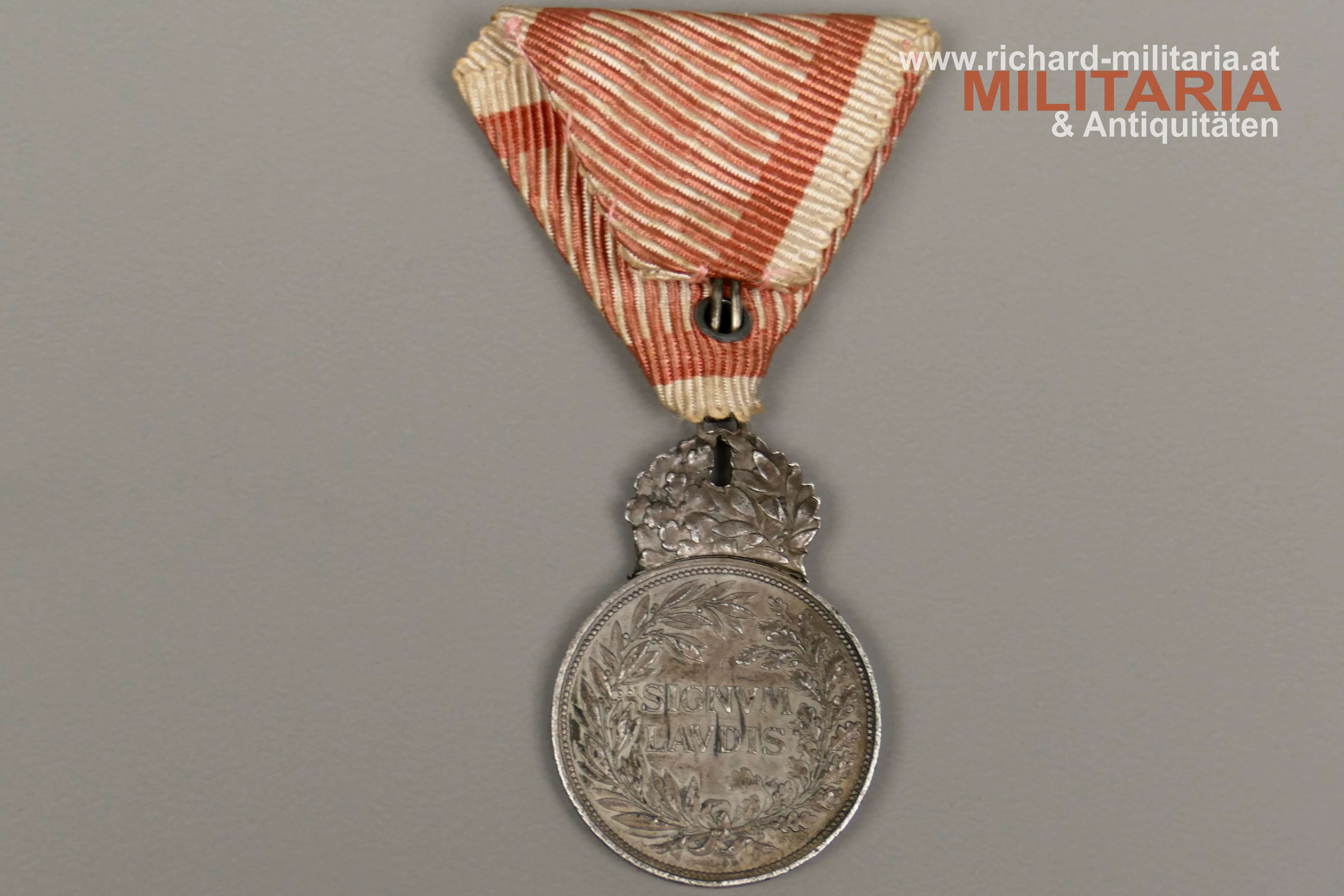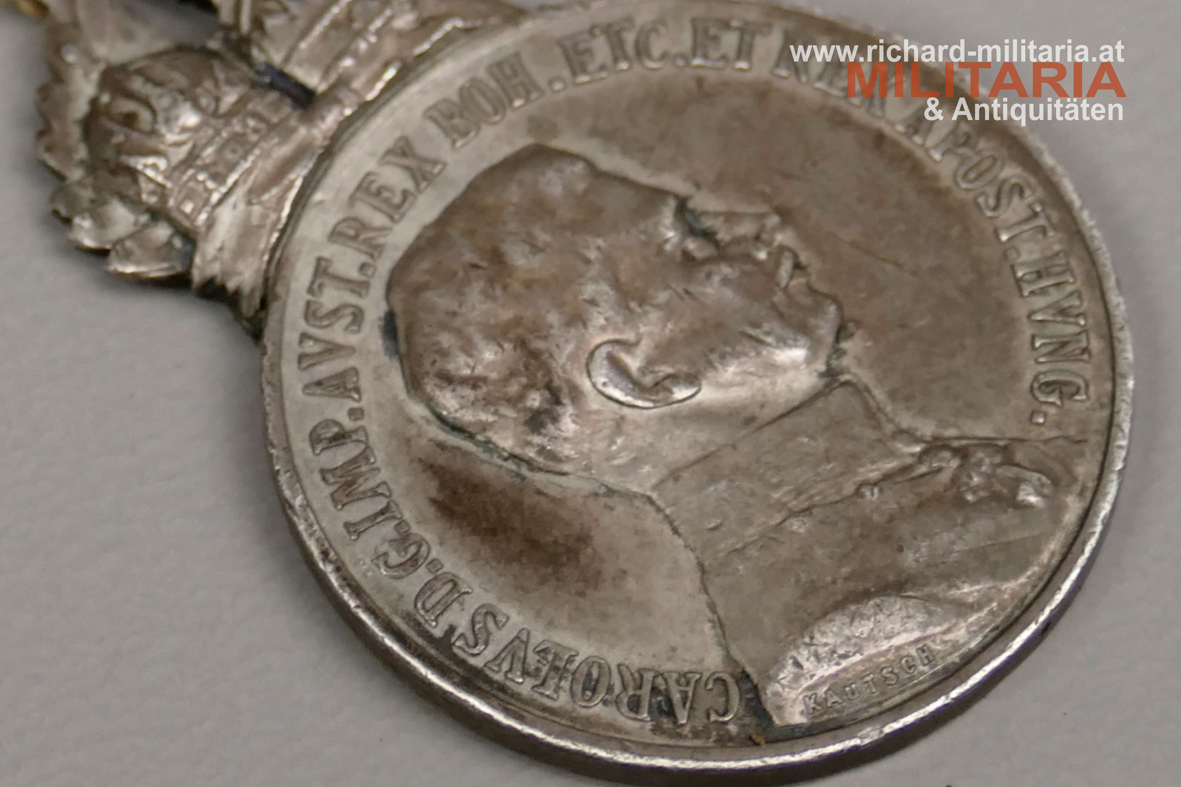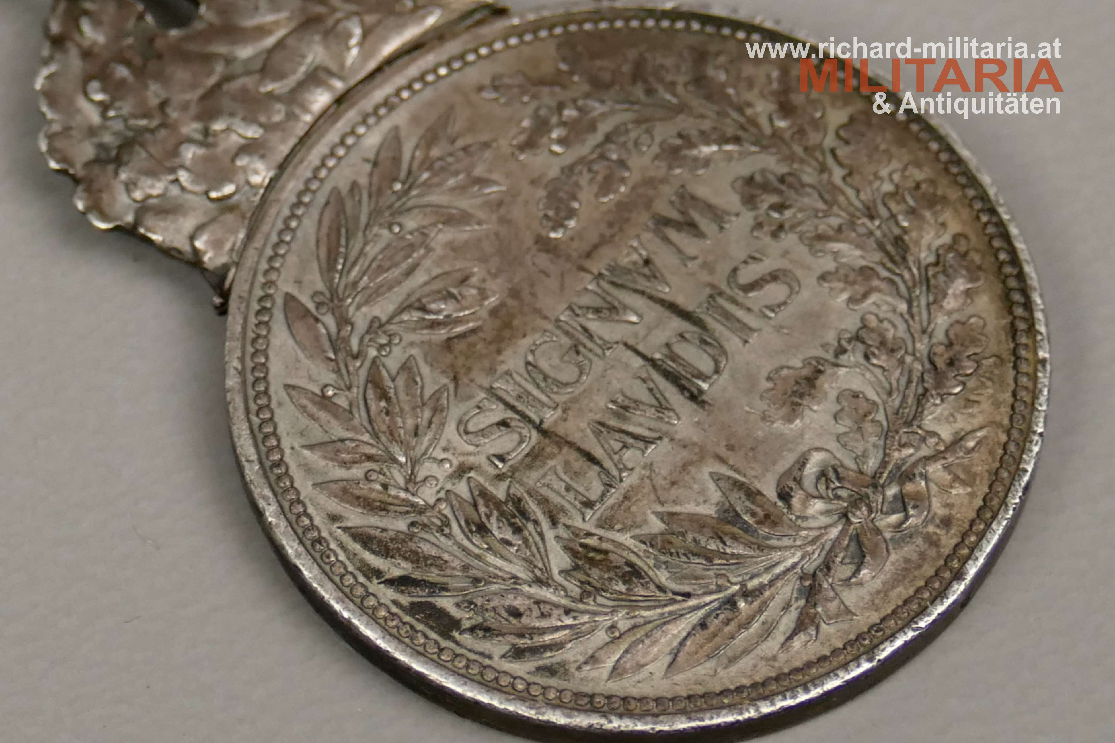 k.u.k. Silbernes Signum Laudis Kaiser Karl mit Schwertern; Kontrollamtspunzierung "A"; Stempelschneider "Kautsch"; am originalen späten Kriegsband mit aufgesplinteten Schwertern;