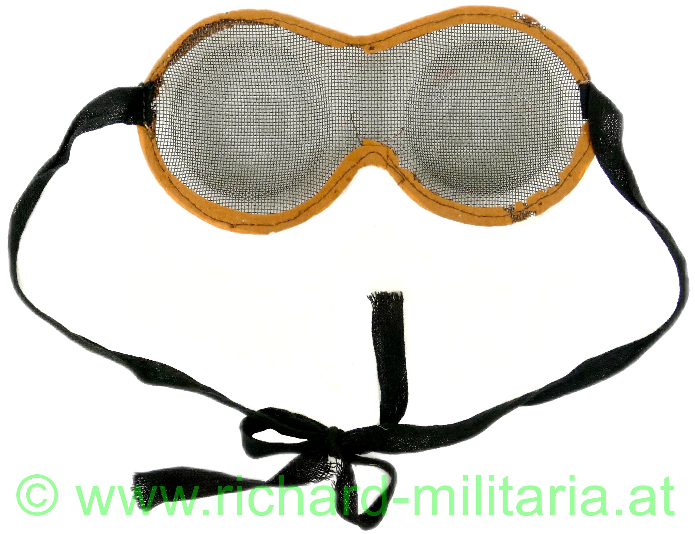 Splitterschutzbrillen der k.u.k. Armee aus dem 1. Weltkrieg, stabiles geschwärztes Eisengitter mit plastischen Ausbuchtungen für die Augen, Randeinfassung aus braunem Filz - dieser mit Mottenverbiss, schwarzes langes Stoffzugband vorhanden;