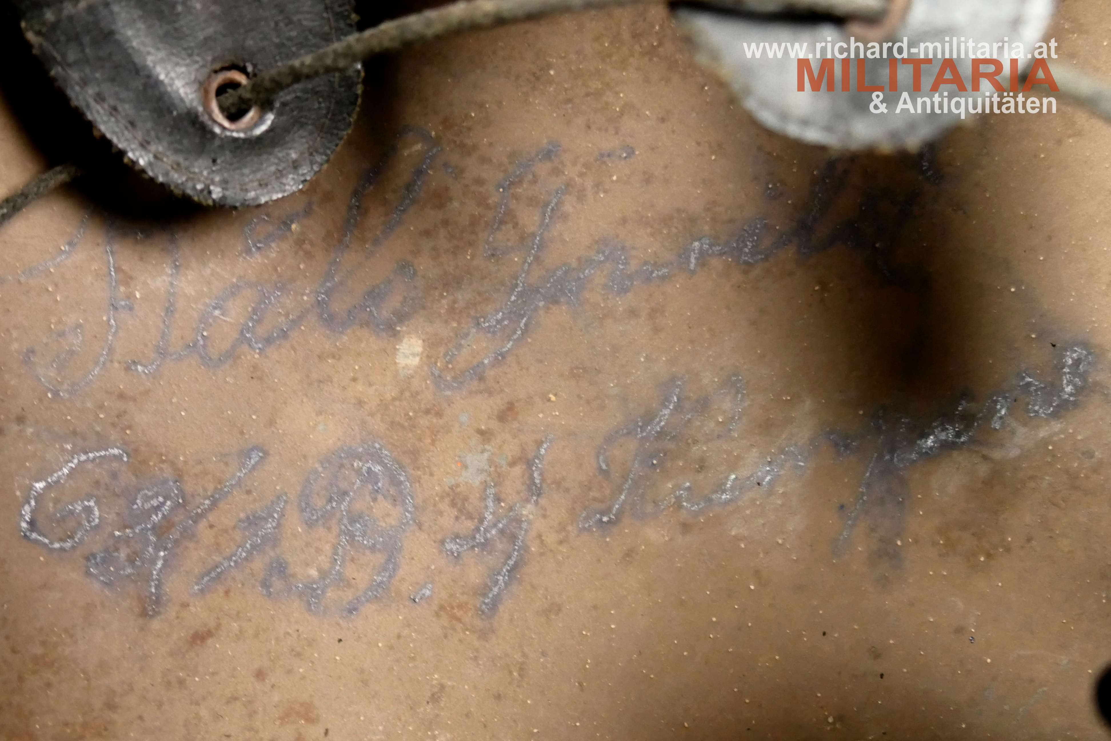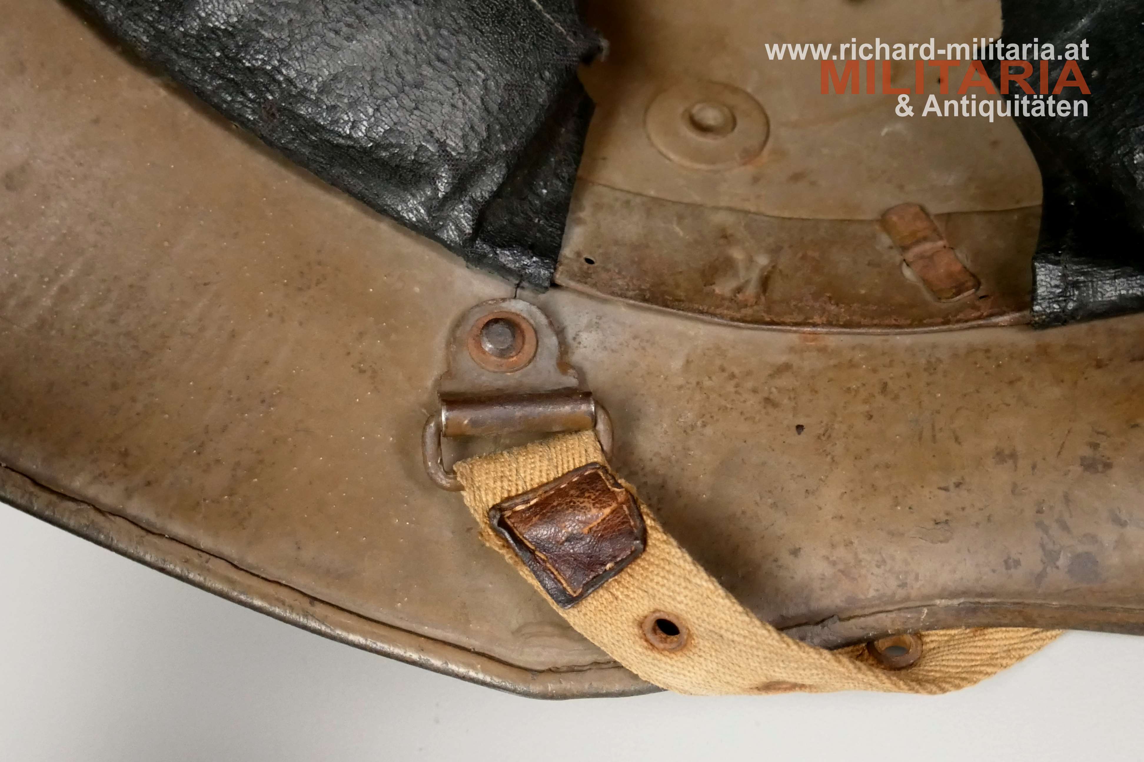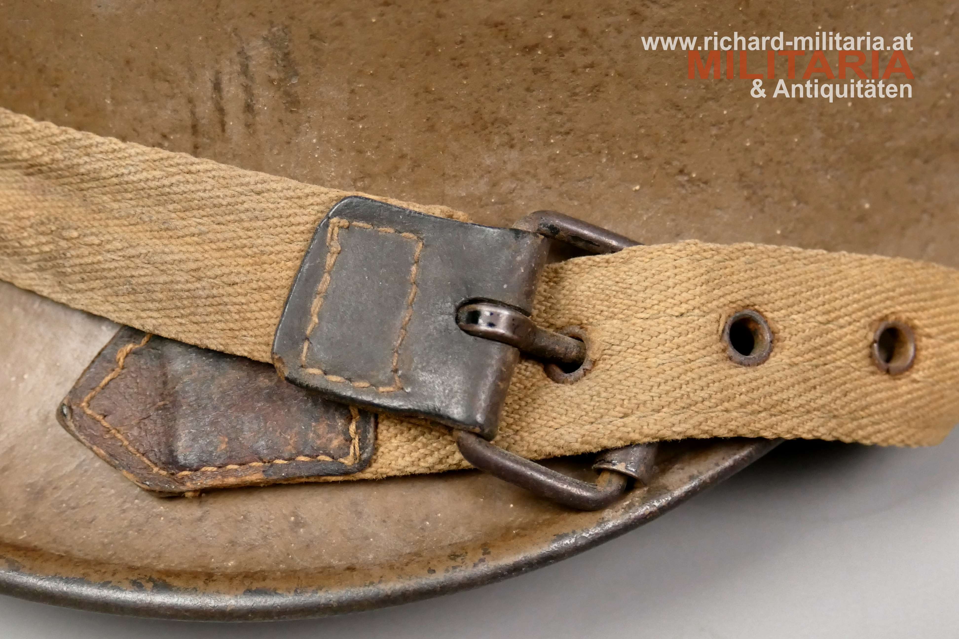 k.u.k. Stahlhelm M17 - österreichische Fertigung, originale erdbraune (isonzobraune) Lackierung noch sehr gut erhalten mit den typischen Altersspuren, Größenstempel (etwas verschlagen): "66 ?", ebenso der Herstellerstempel: "B... Brüder Gottlieb und Brauchbar, Brünn ?", Metallinnenring - dieser ist mit "K" gestempelt - mit 3 vernähten Ersatzlederlaschen mit Roßhaarpolsterungen, zugehöriger Leinenkinnriemen, im Helmdom gestempelt: "L 30", im Helmdom mit Tintenbleistift personalisiert: "Bele J... 69 (oder 63)/1. Baon ... Kompanie"; seitlich noch schwach der Abnahmestempel erkennbar