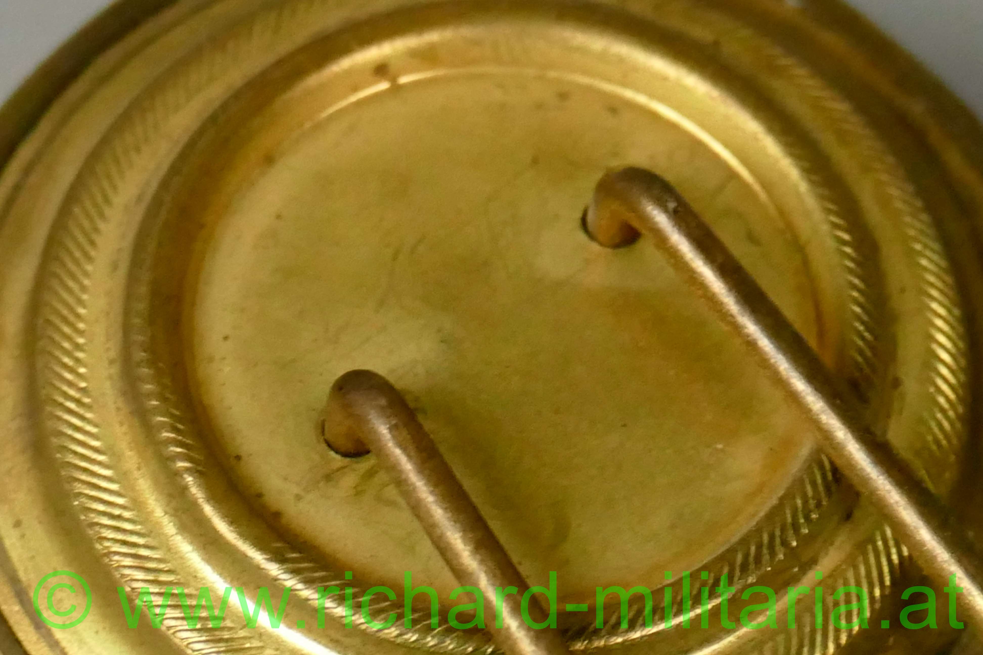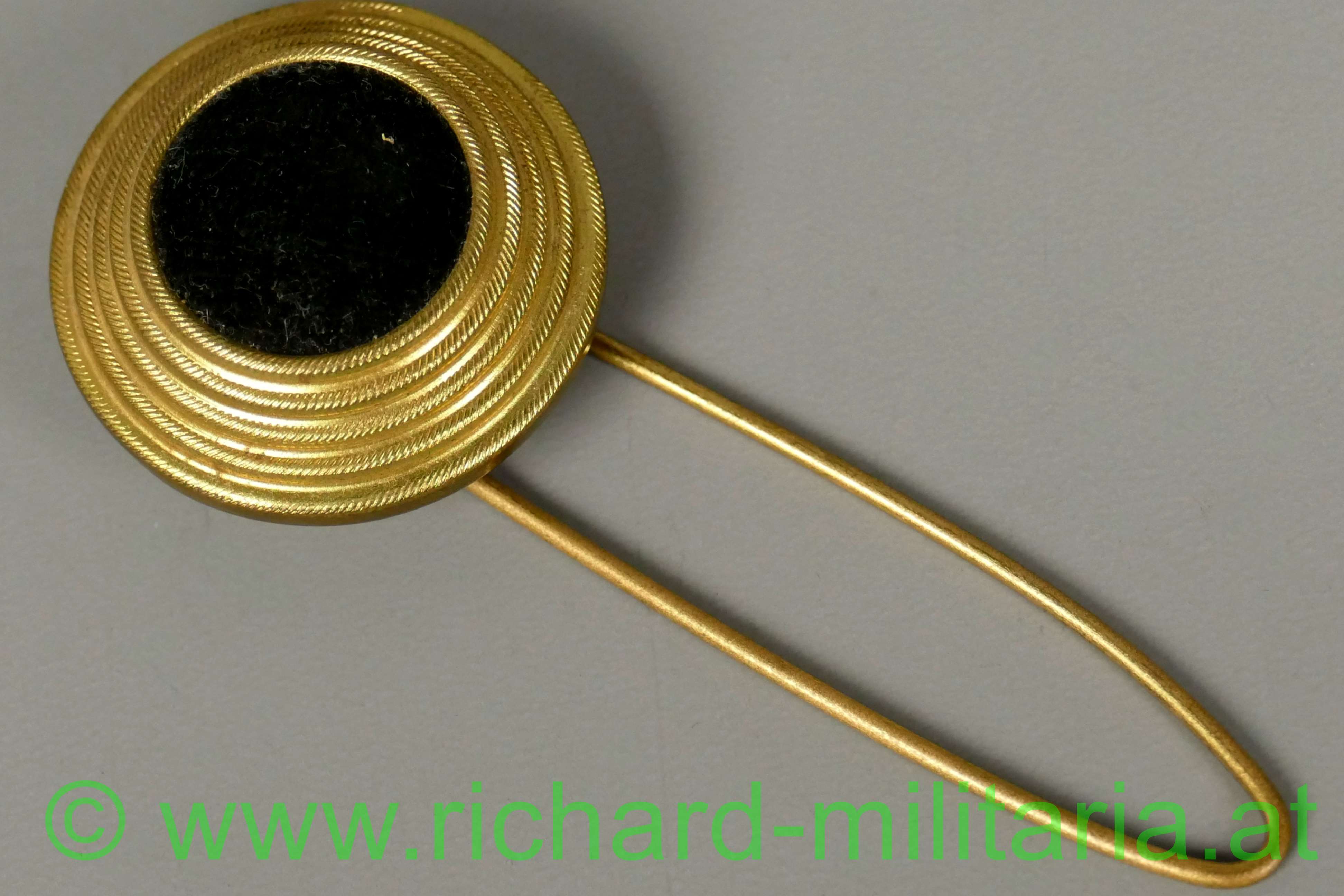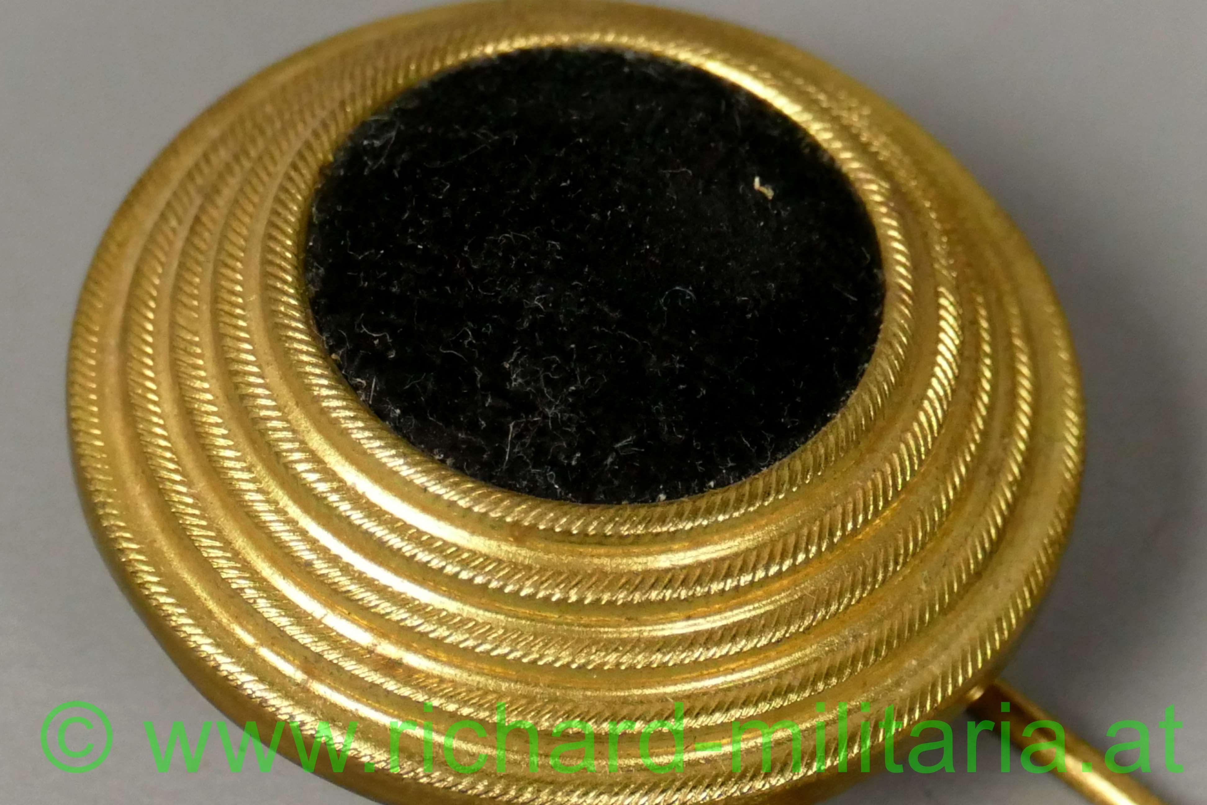 k.u.k. Tschako Kokarde für Mannschaften und Unteroffiziere; Tombak vergoldet; mittig mit schwarzen Stoff ausgelegt; Haltedraht mit einer Länge von 8,5cm;