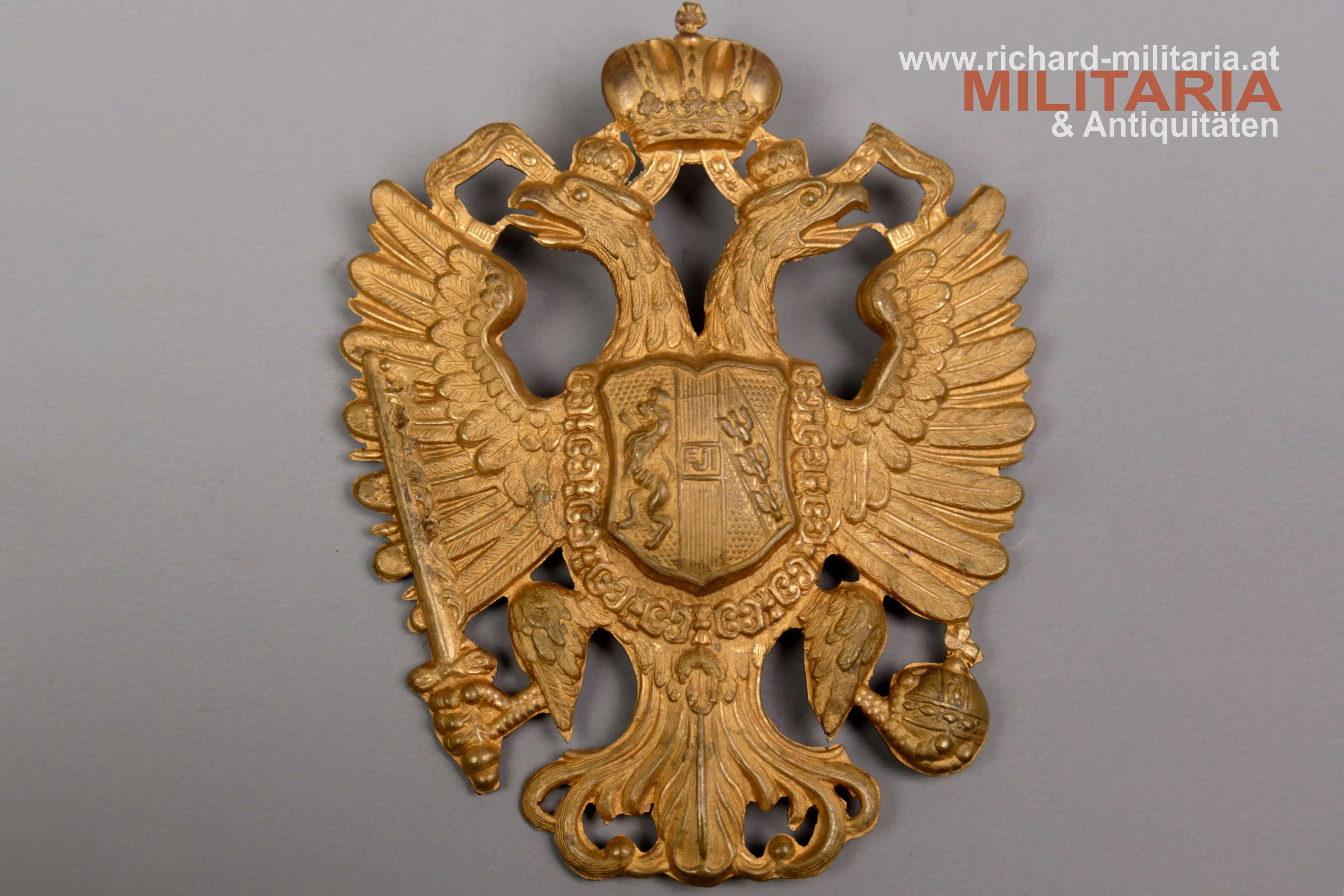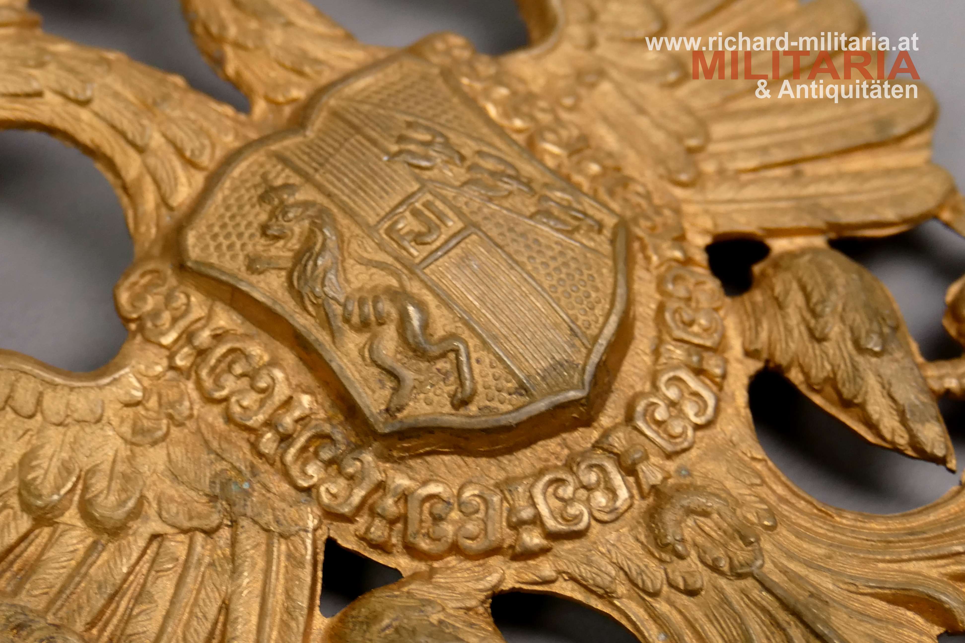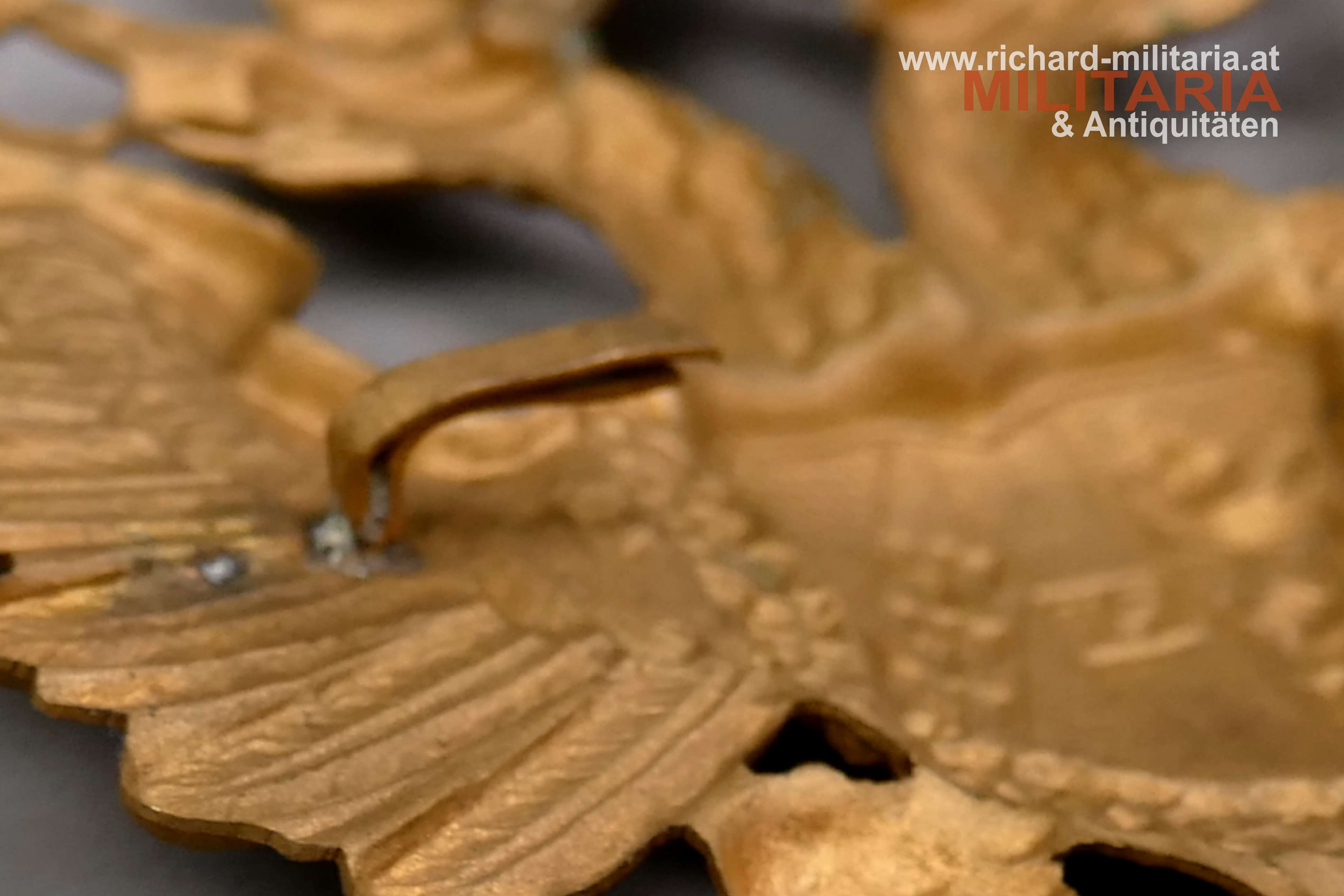 k.u.k. Tschakoadler für Infanterie; Tombak feuervergoldet; mit Initialen: "FJ1"; Rückseite mit beiden Doppelsplinten;