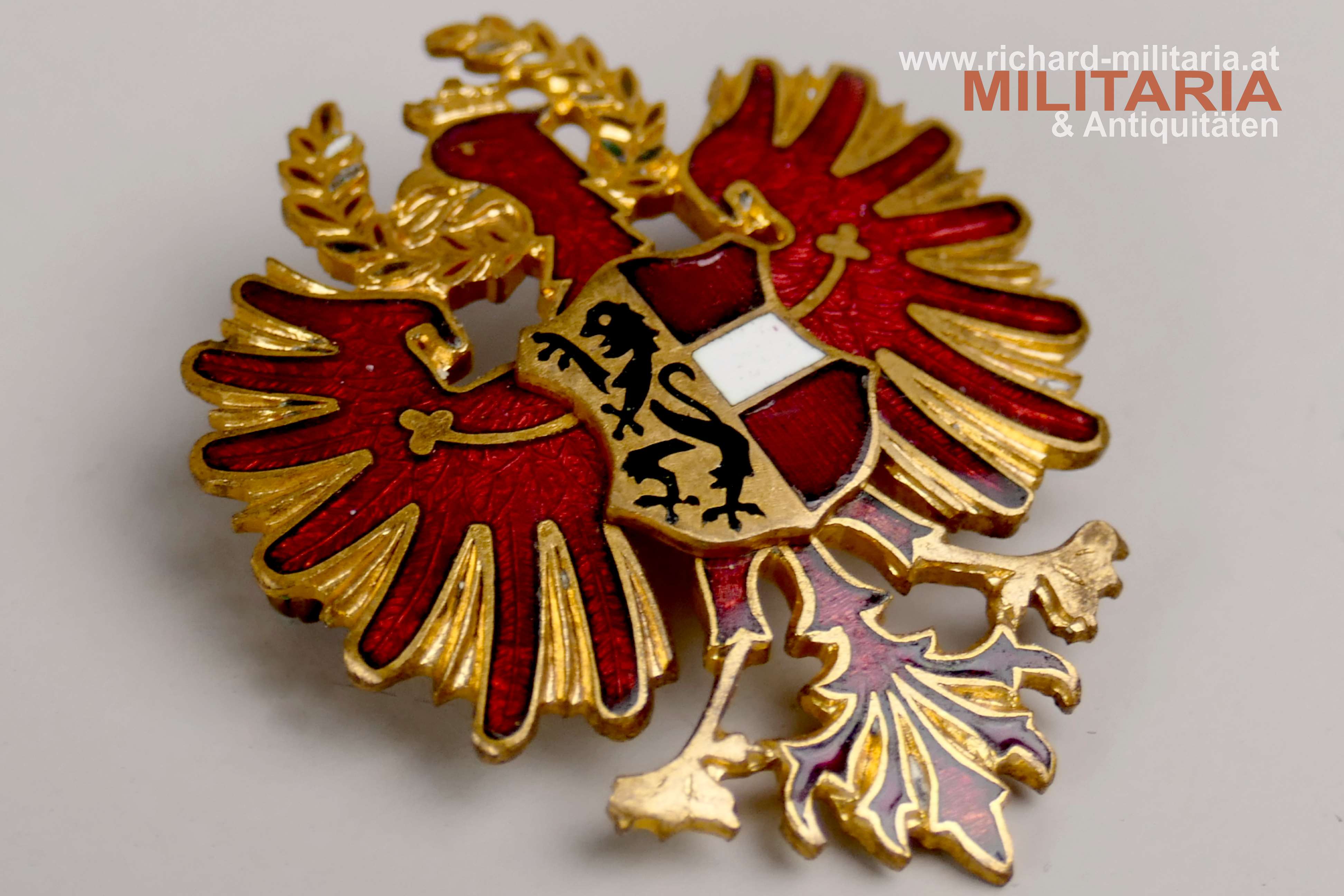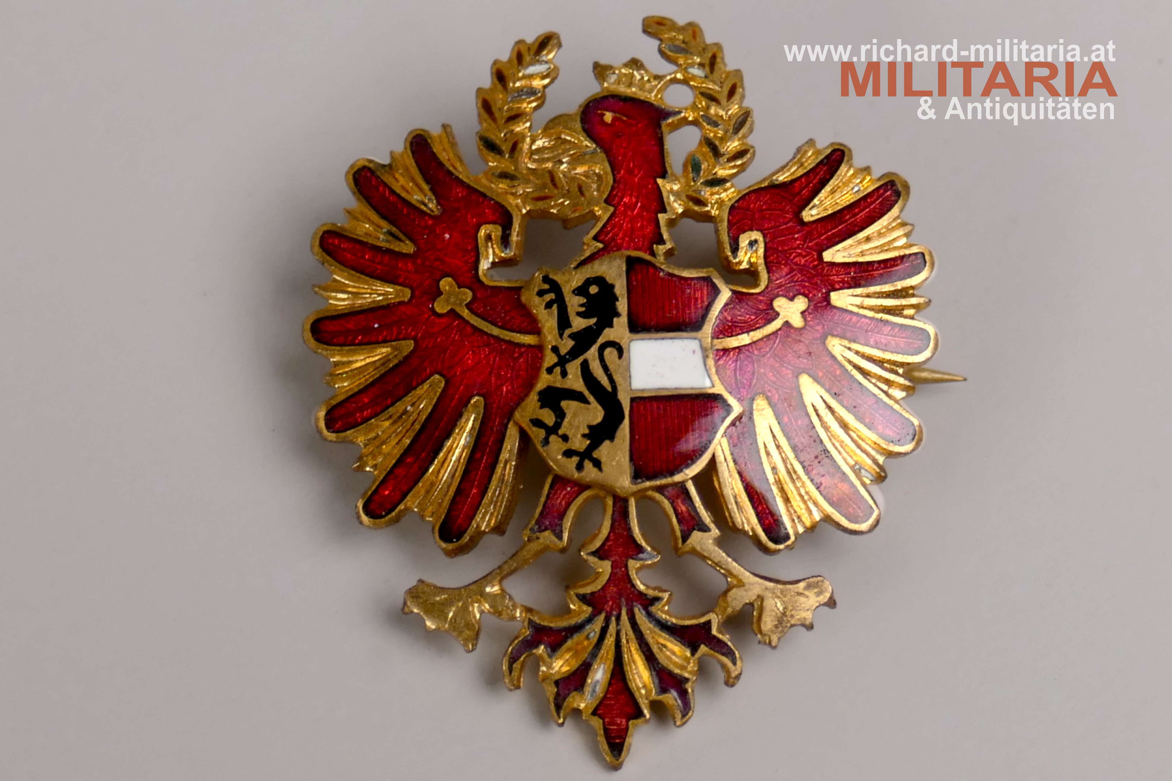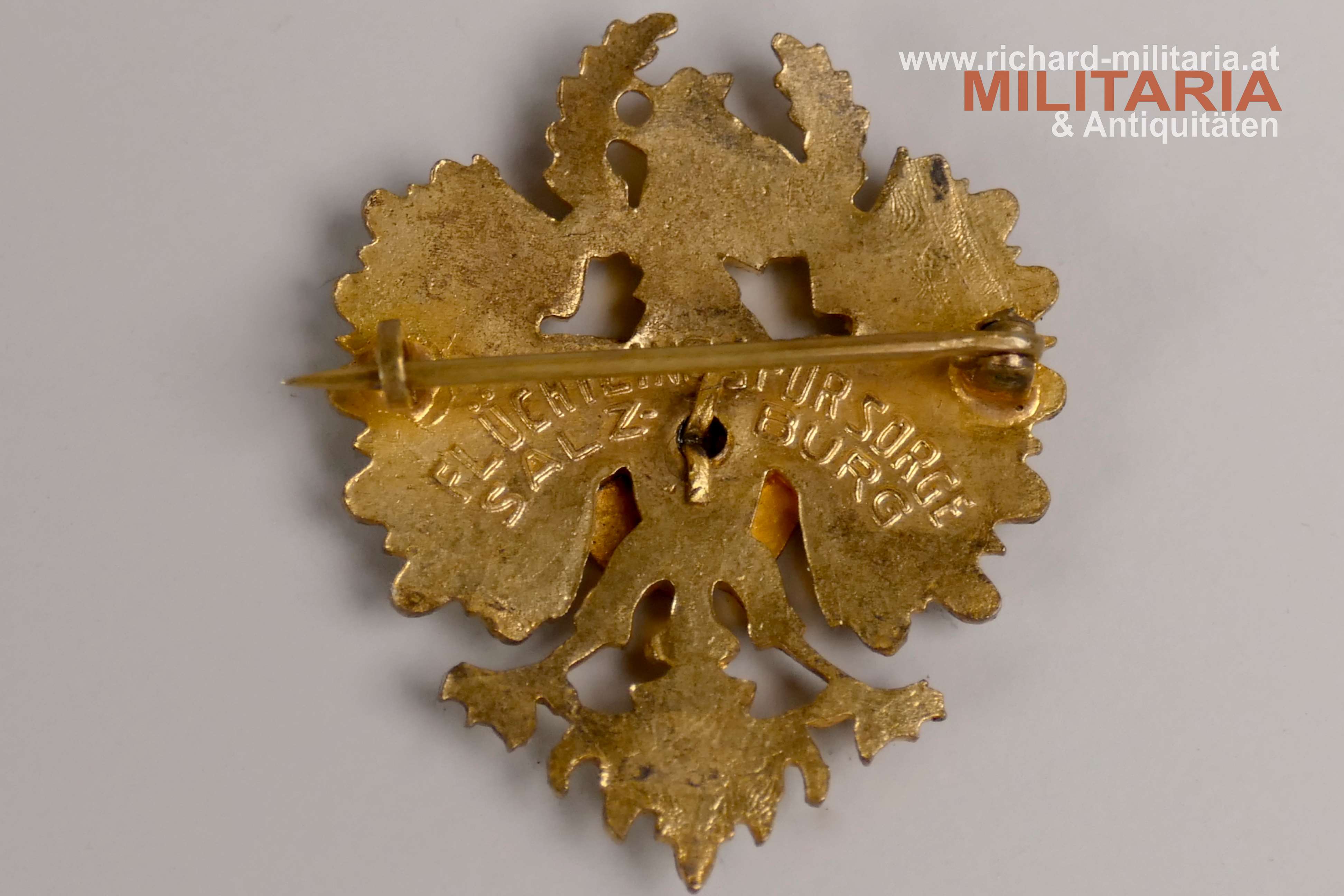 k.u.k. Abzeichen für die Flüchtlingsfürsorge in Salzburg, emaillierter Tiroler Adler mit emaillierten Bindenschild mit Darstellung des Salzburger Wappens, Schriftzug "Flüchtlingsfürsorge Salzburg" am Revers, Emaillierung im Eichenlaubkranz minimal beschädigt; originale Nadel