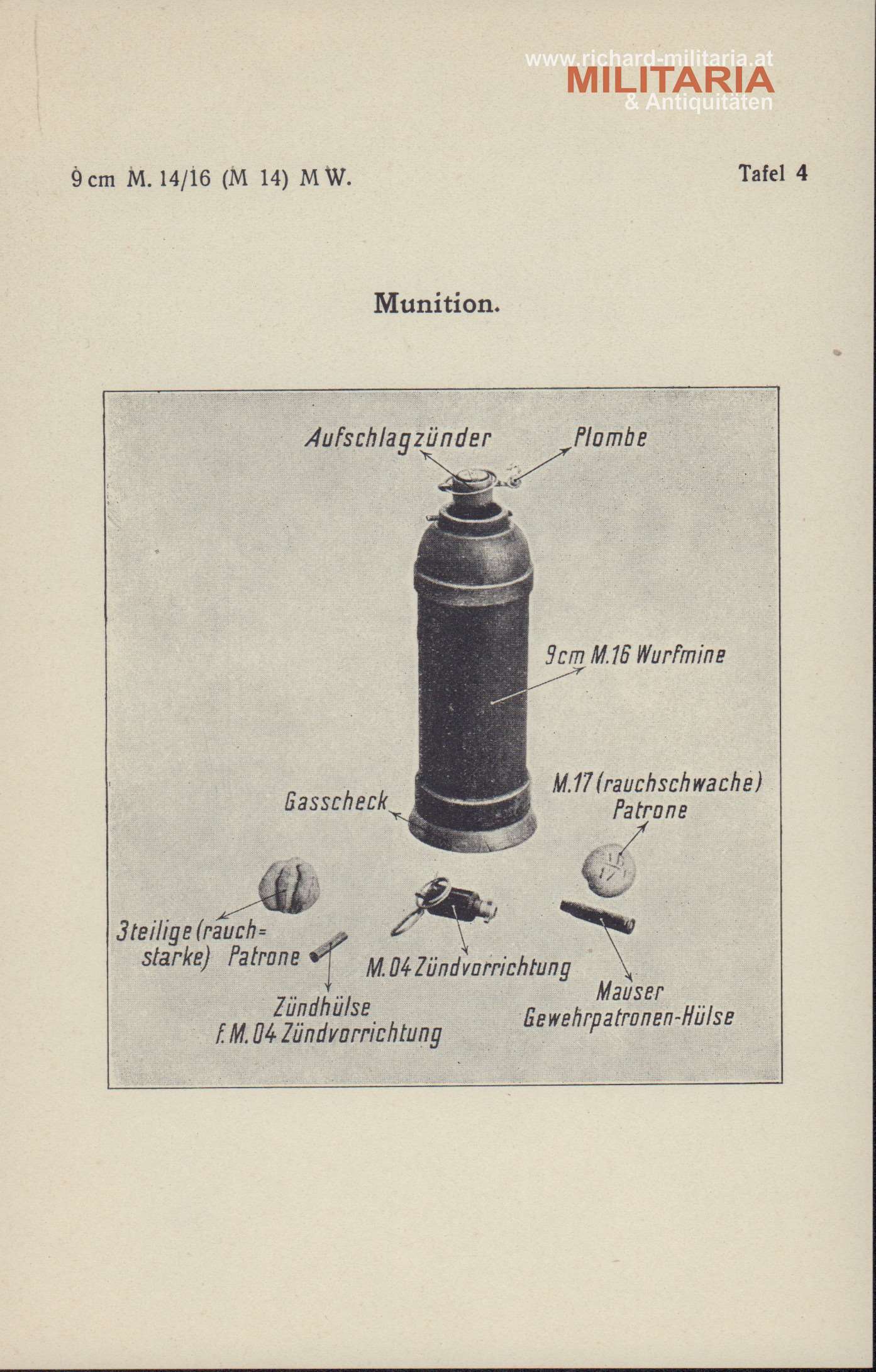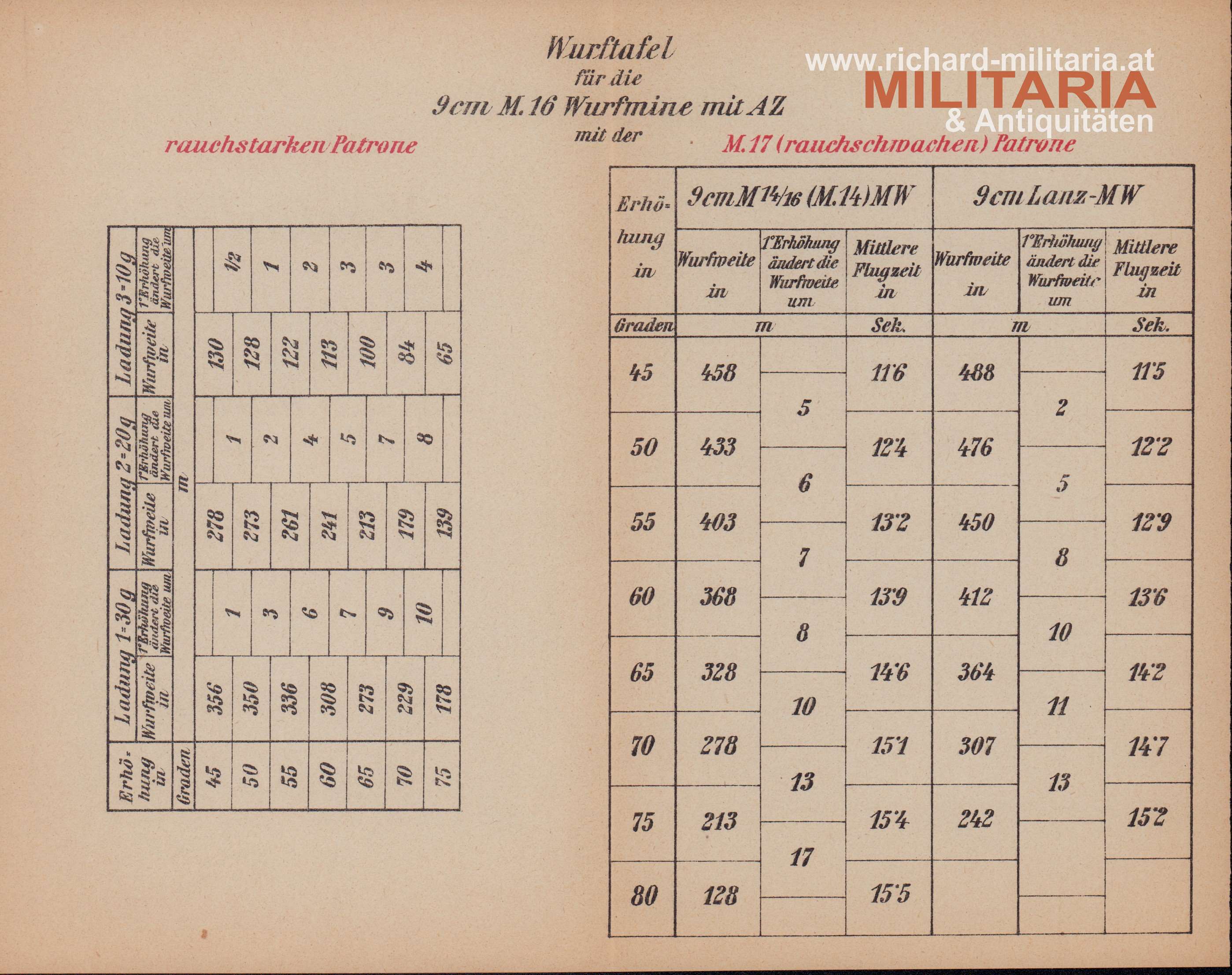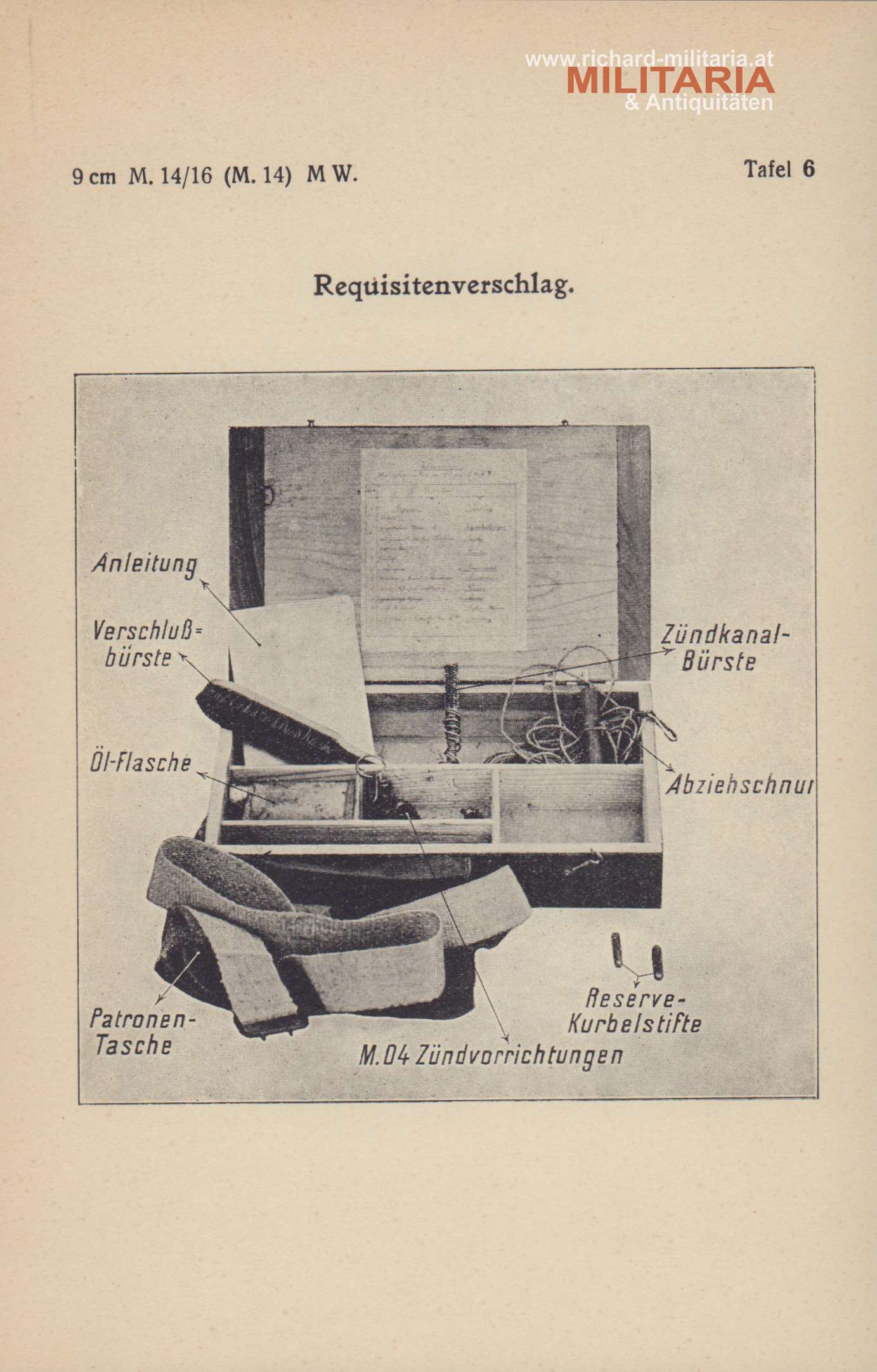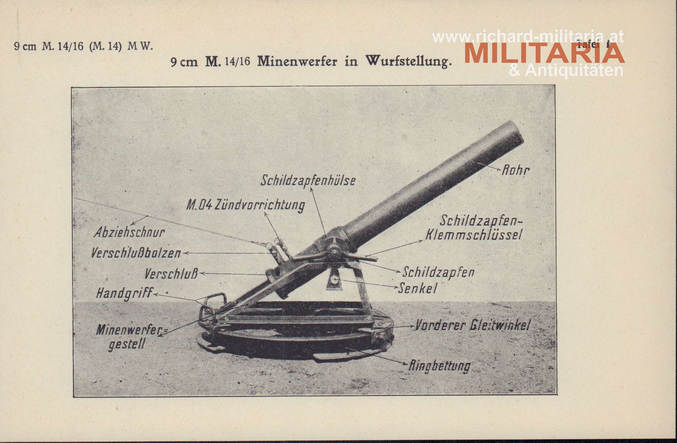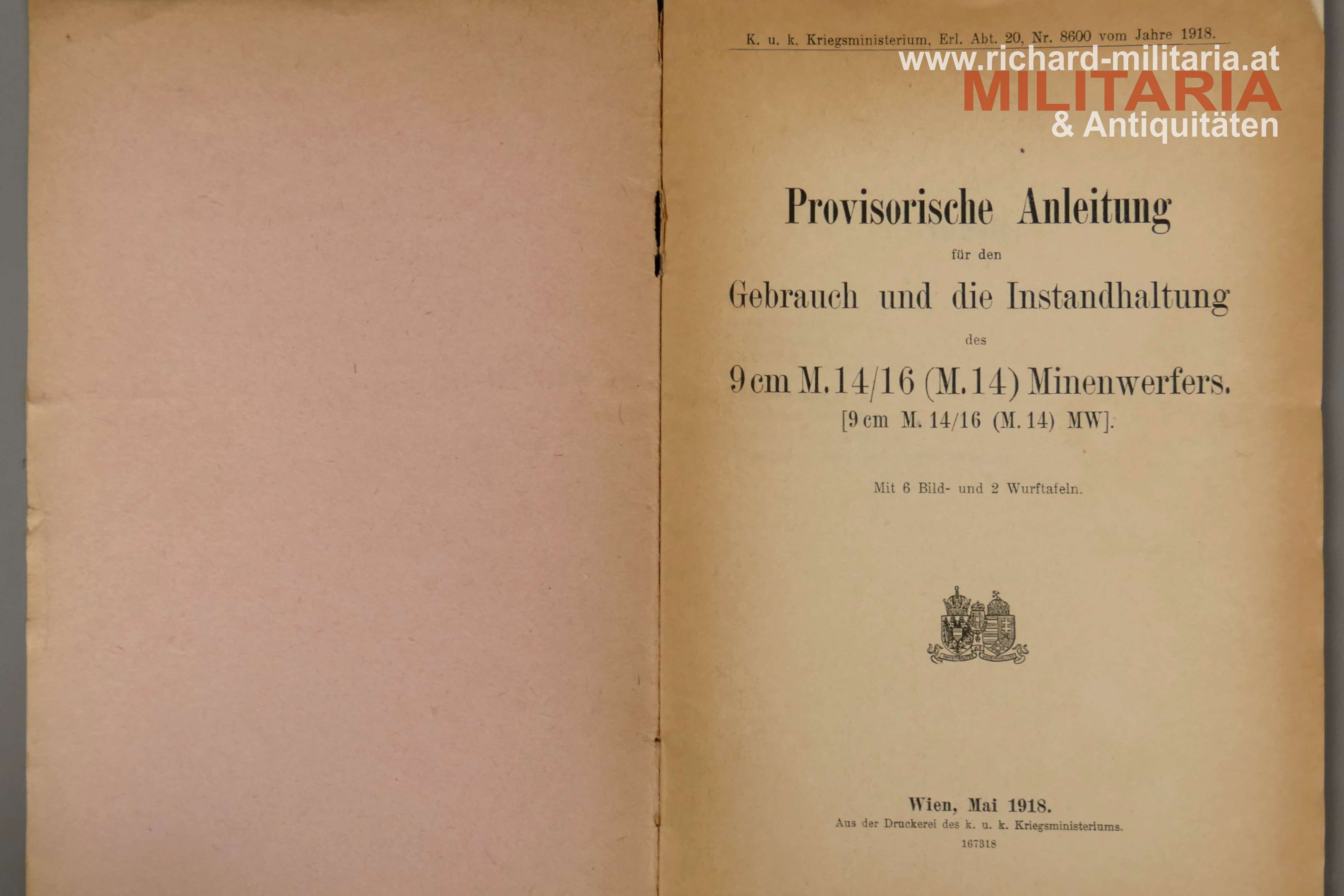 k.u.k. provisorische Anleitung für den Gebrauch und die Instandhaltung des 9cm M14/16 (M14) Minenwerfers; Wien Mai 1918; insgesamt 22 Seiten; mit 2 Wurftafeln und den 6 folgenden Beilagen: