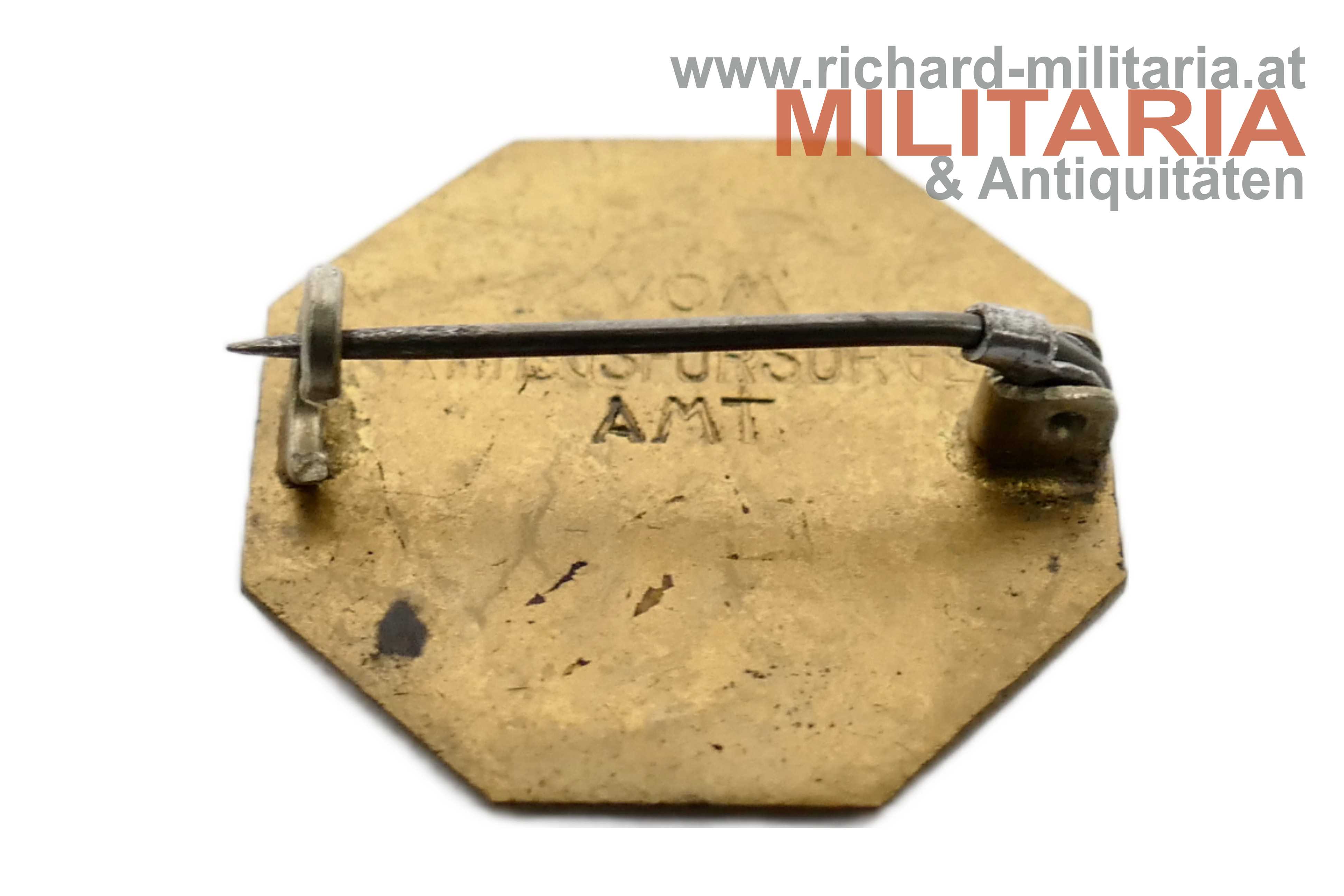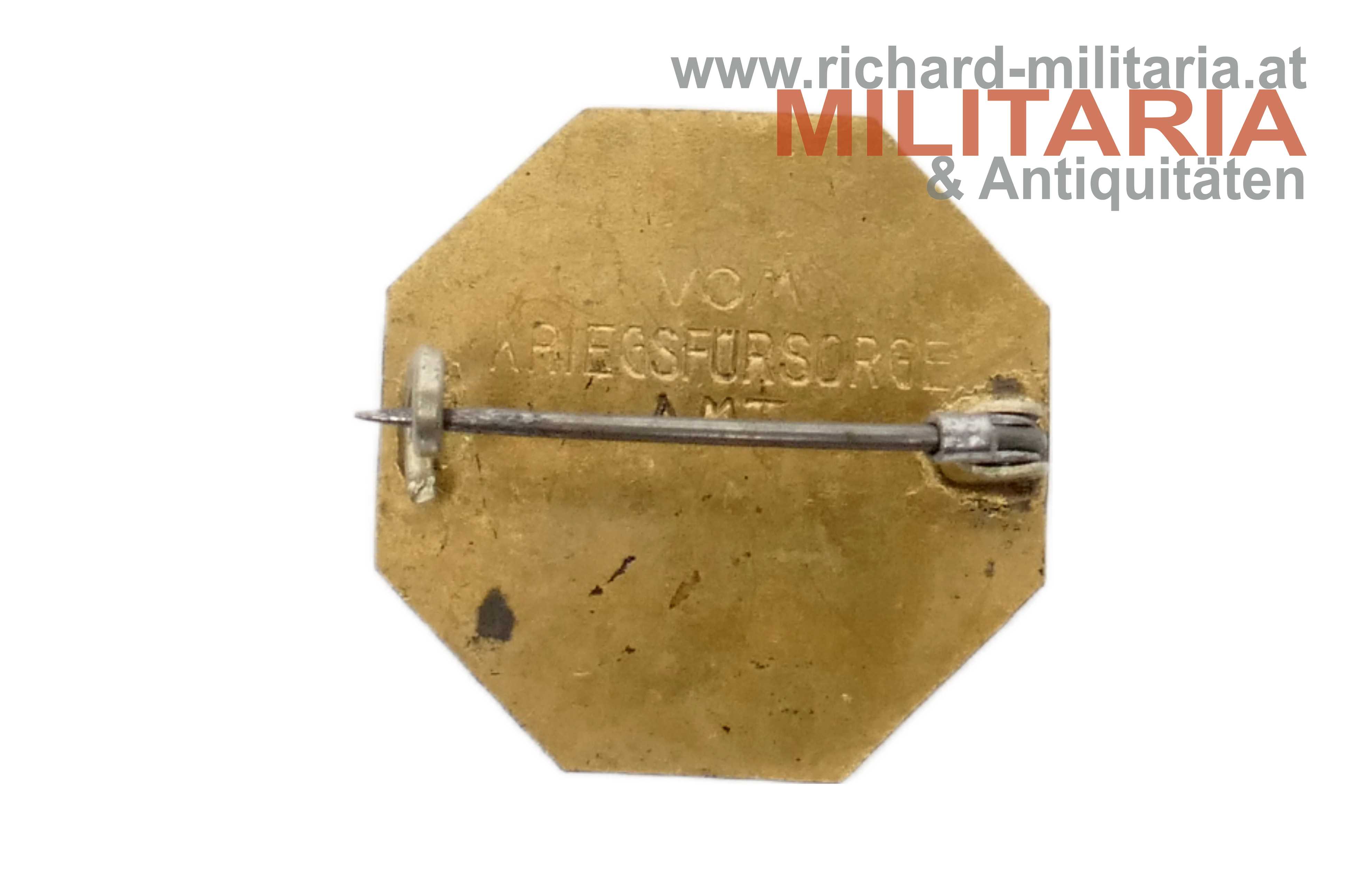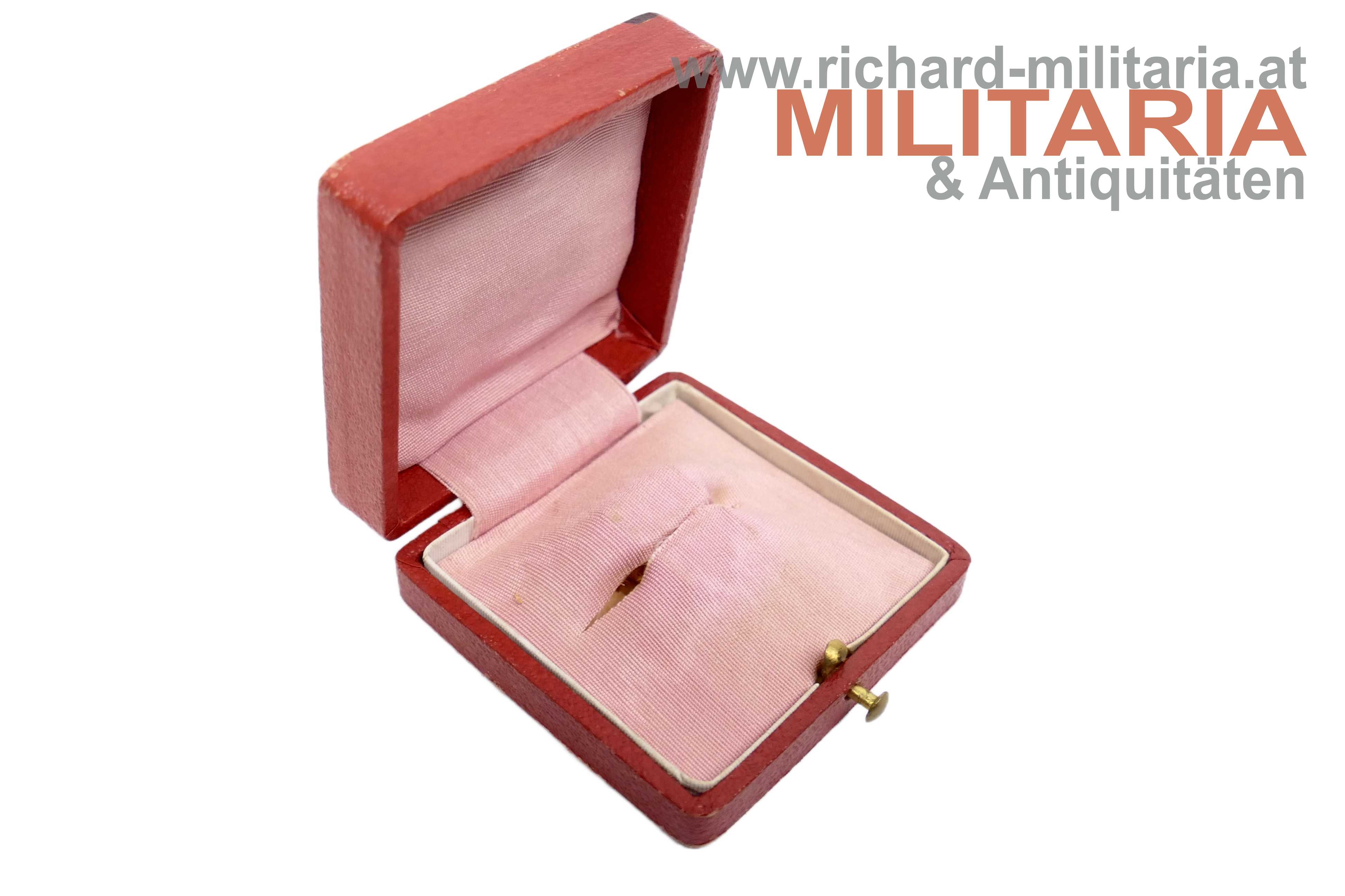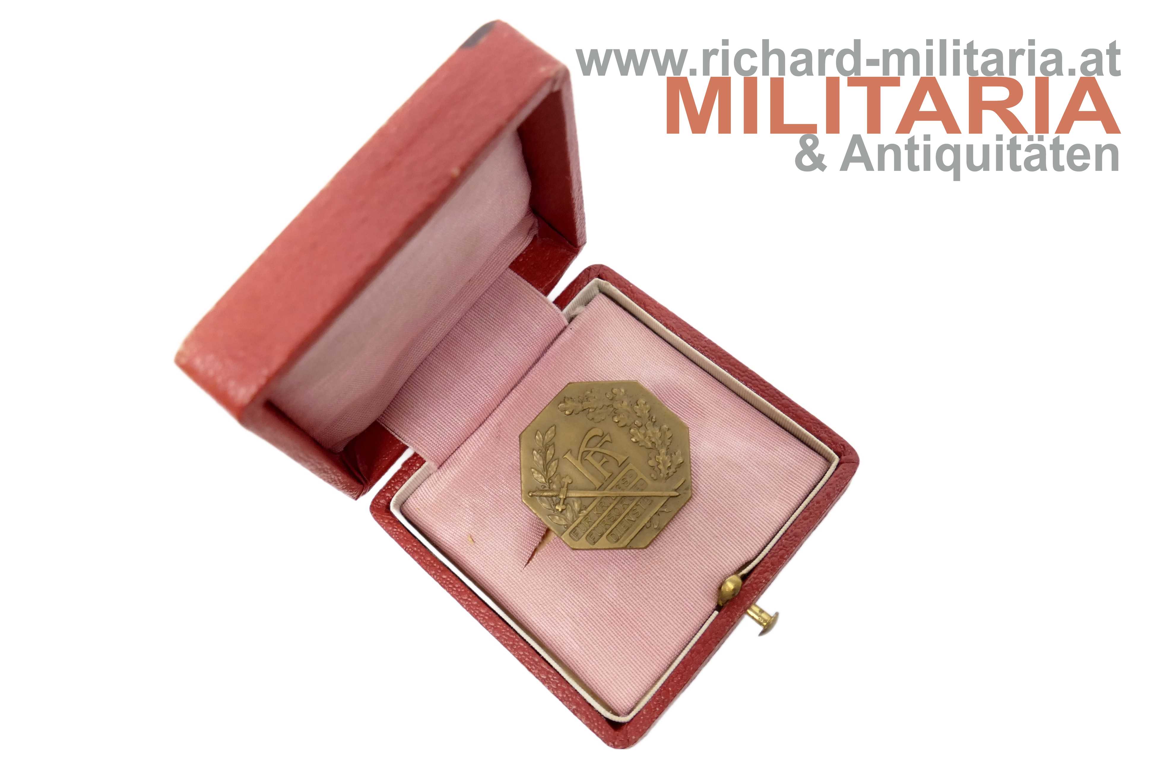 k.u.k. Anstecker für Kriegsfürsorge-Dienste mit Etui; Bronze vergoldet; revers gestempelt "vom Kriegsfürsorgeamt"; mit originalem Nadelsystem; zugehöriges rotes Etui mit goldener Deckelprägung; innen mit rosanem Stoff ausgelegt;