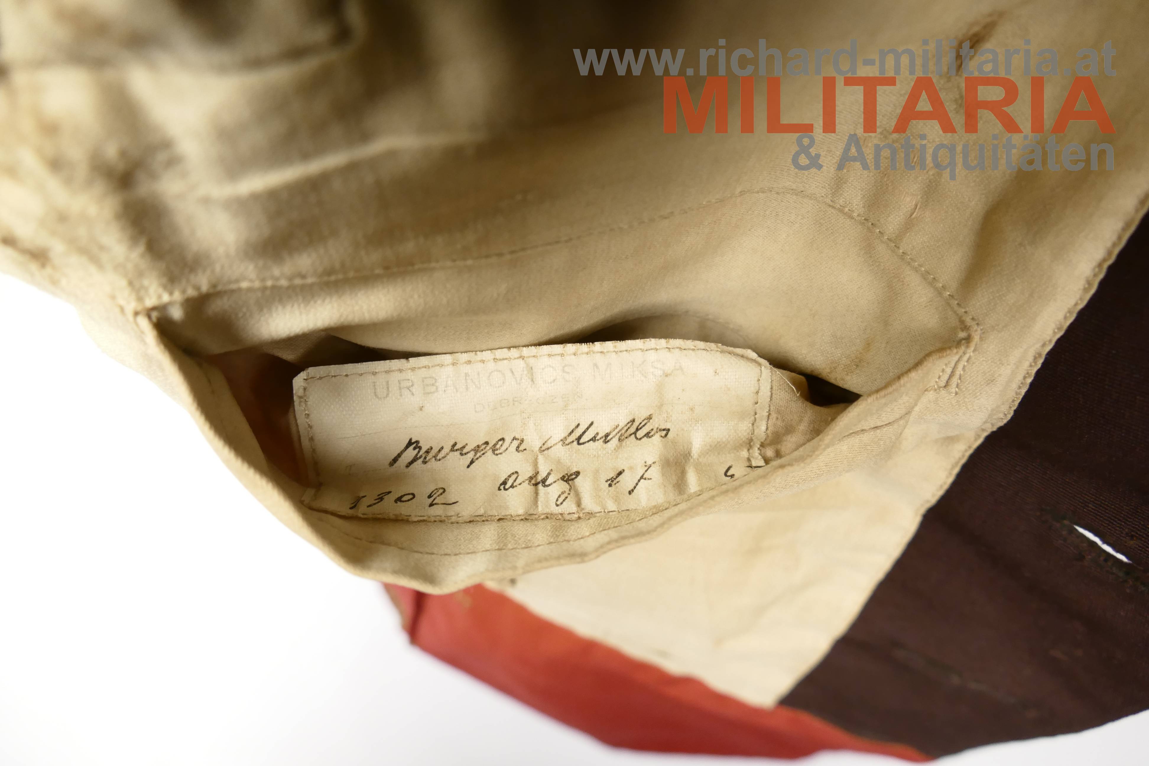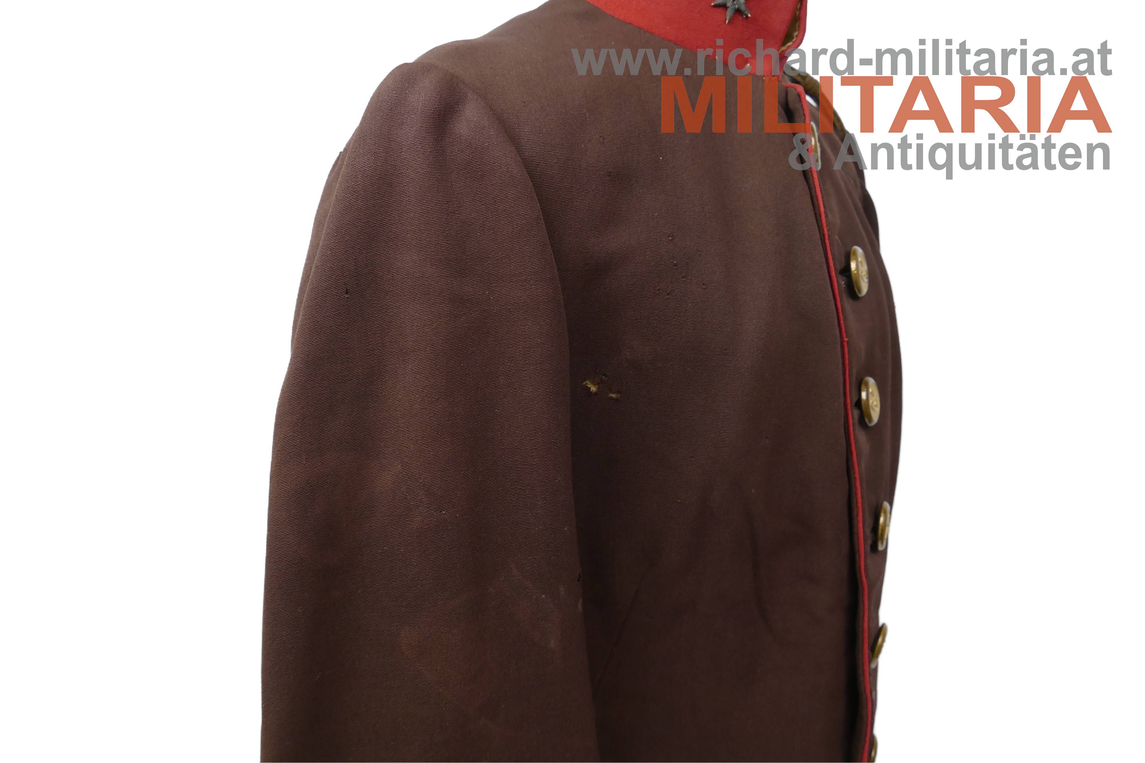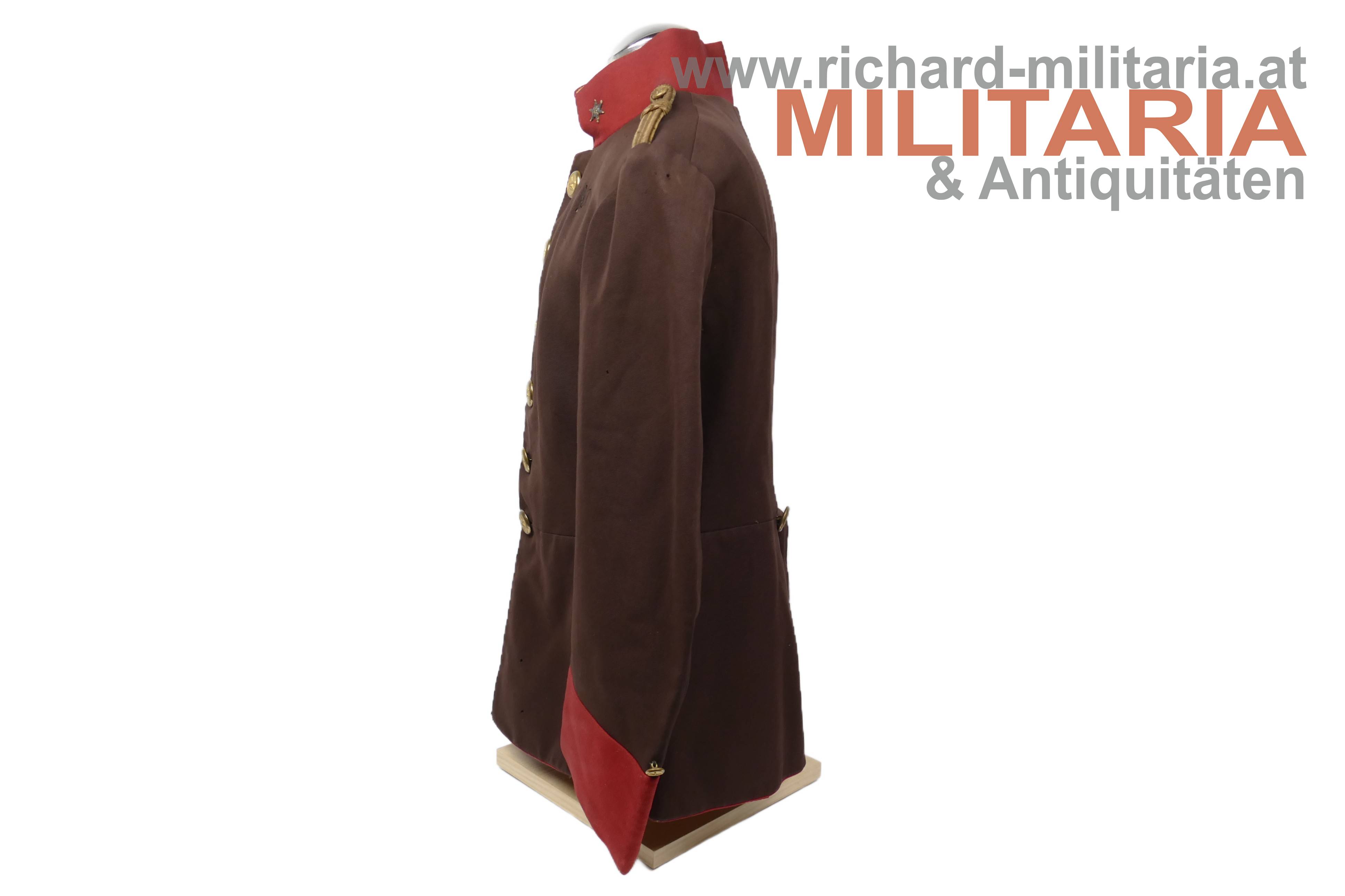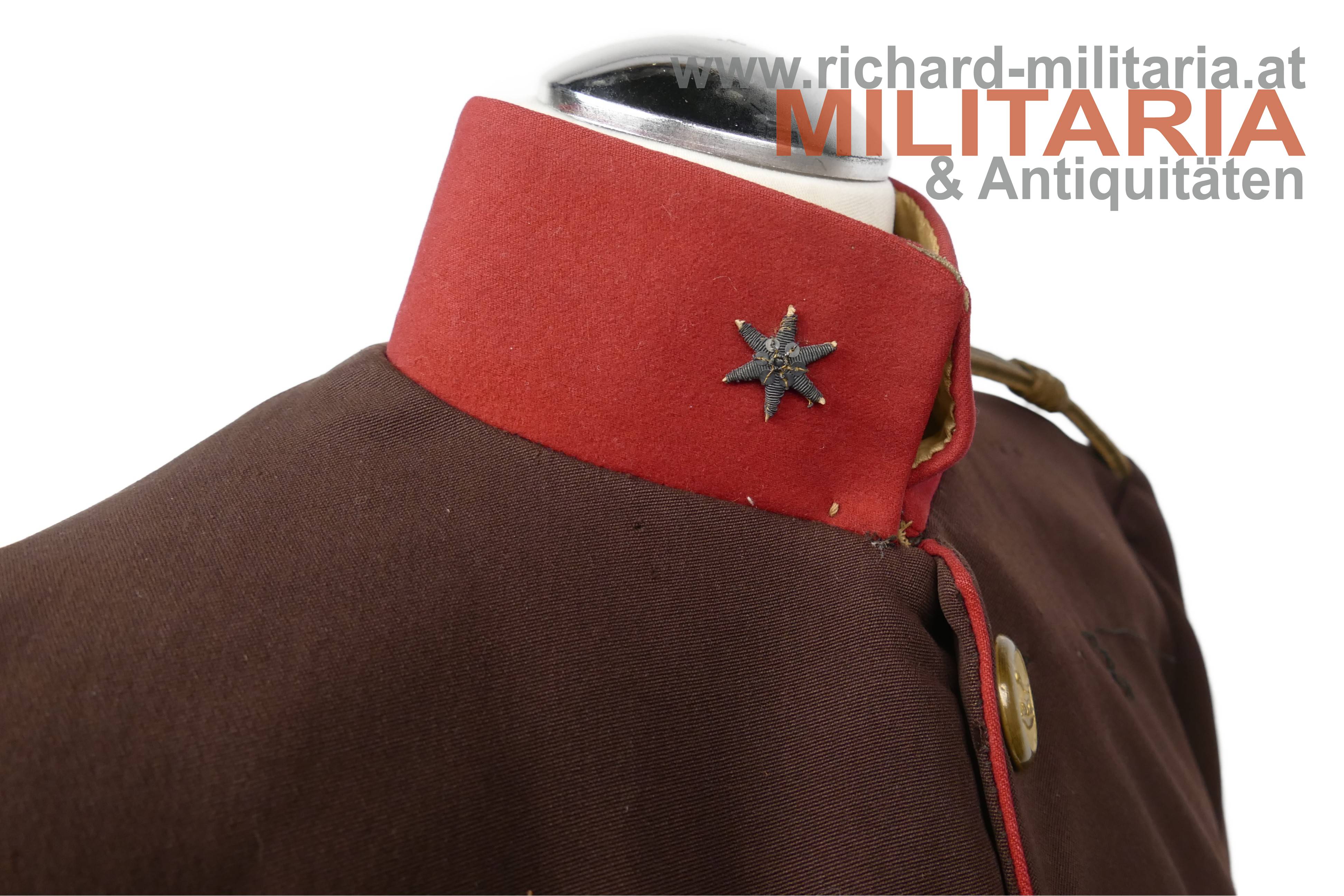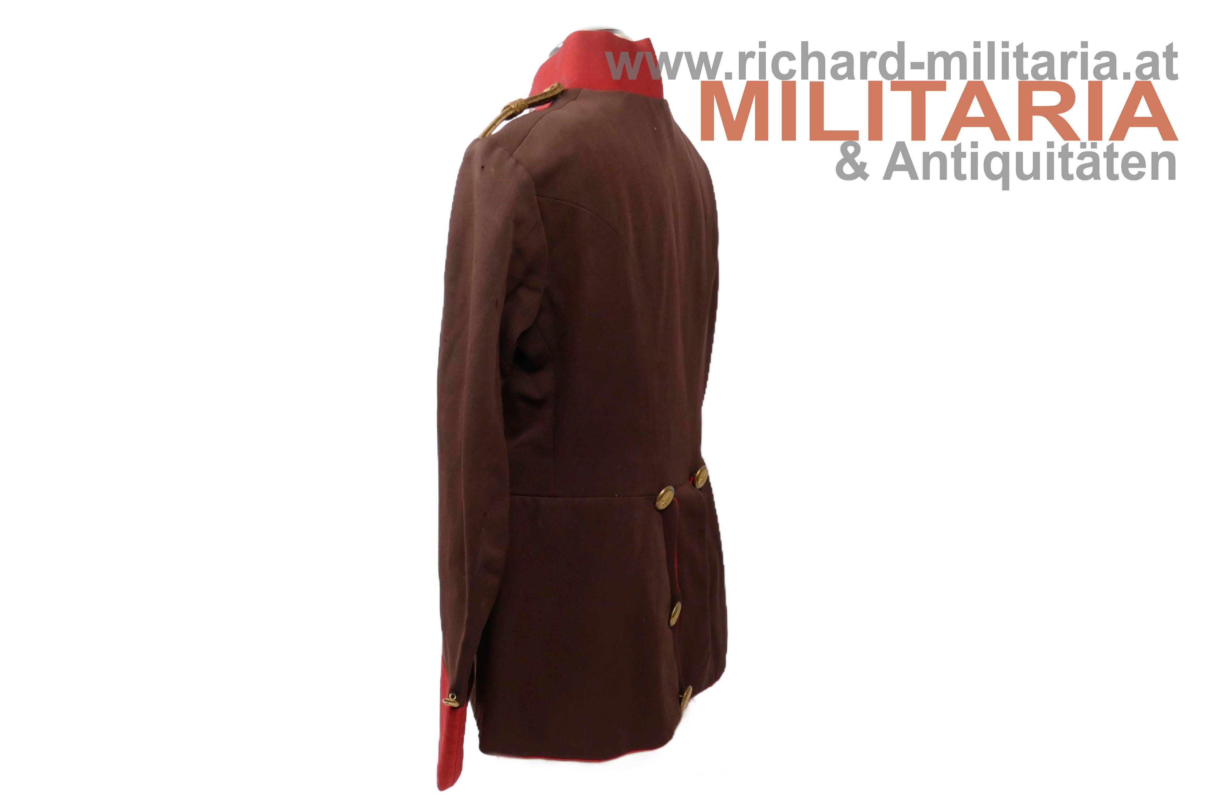 k.u.k. Artillerie Rock - Hauptmann; braunes feines Tuch mit roten Kragen und Ärmelaufschlägen; einreihig zu 6 vergoldeten Artillerieknöpfen; am Kragen je ein gedunkelter Offiziers-Distinktionsstern für einen Leutnant; auf der linken Schulter eine dick ausgeführte schwarz geritzte goldene Achselspange, gehalten von einem Artillerieknopf; rückseitig zweireihig zu je 3 vergoldeten Artillerieknöpfen; auf der linken Brust Reste von Fäden zum Anbringen von Auszeichnungen; innen der Brustteil mit beigem Seidenstoff ausgelegt; Schoßteil mit rotem Seidenstoff; in der Brusttasche ein Herstelleretikett von "Urbanovics Miksa Debreczen"; dieses beschriftet mit "Burger Miklos 1302 Aug 17"; mehrere Einrisse am Innenfutter und Mottenlöcher auf der Außenseite;