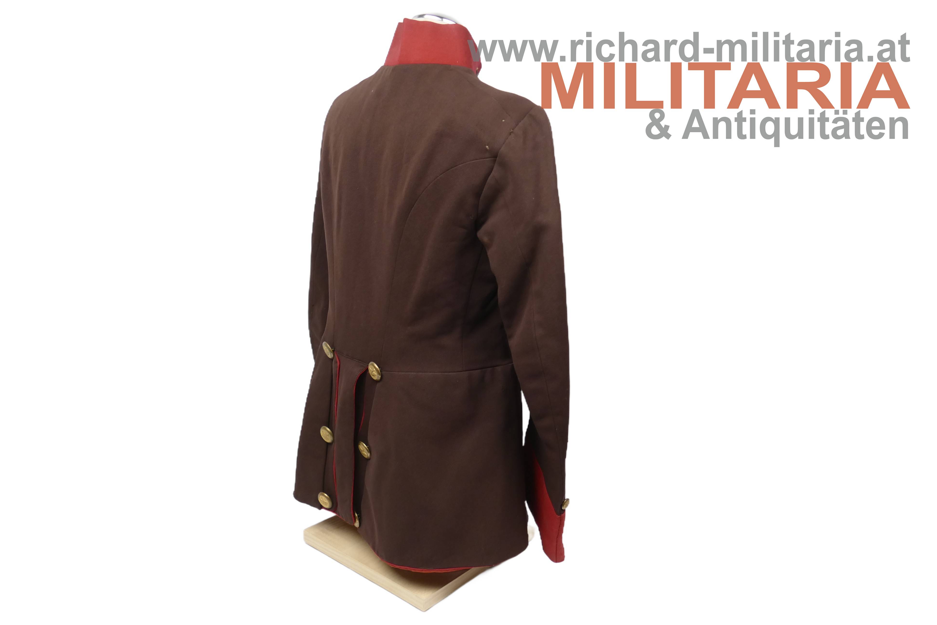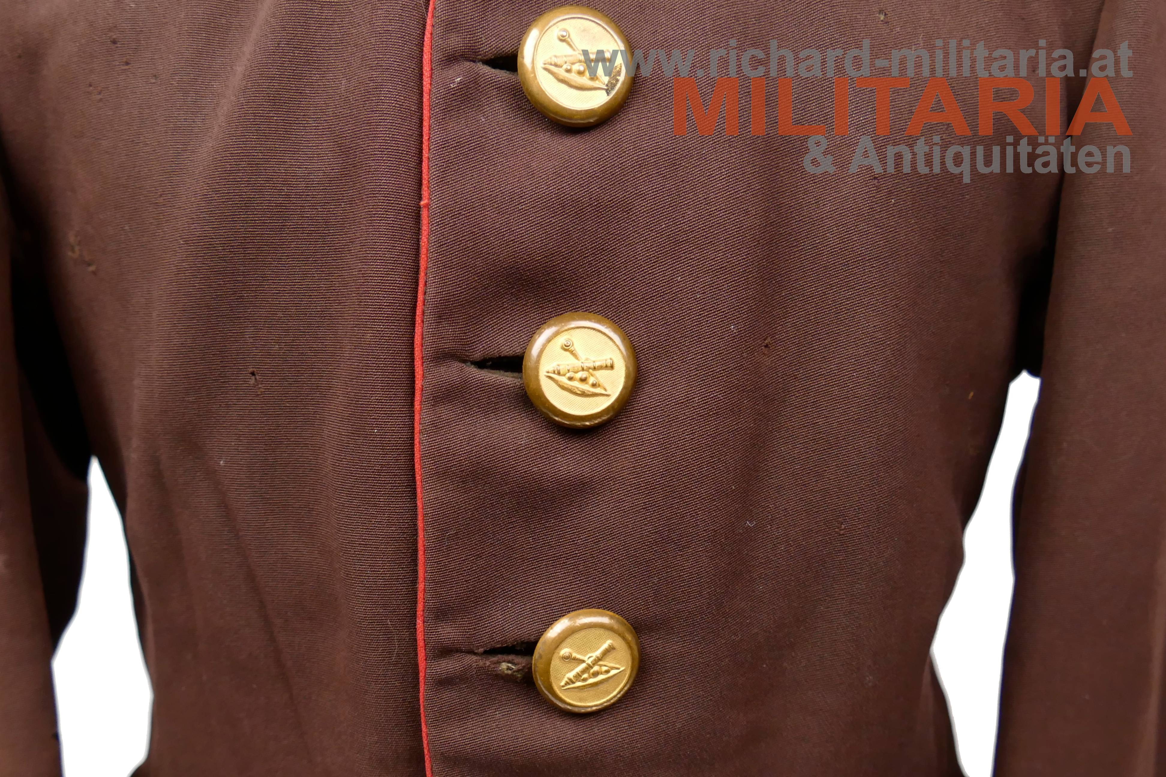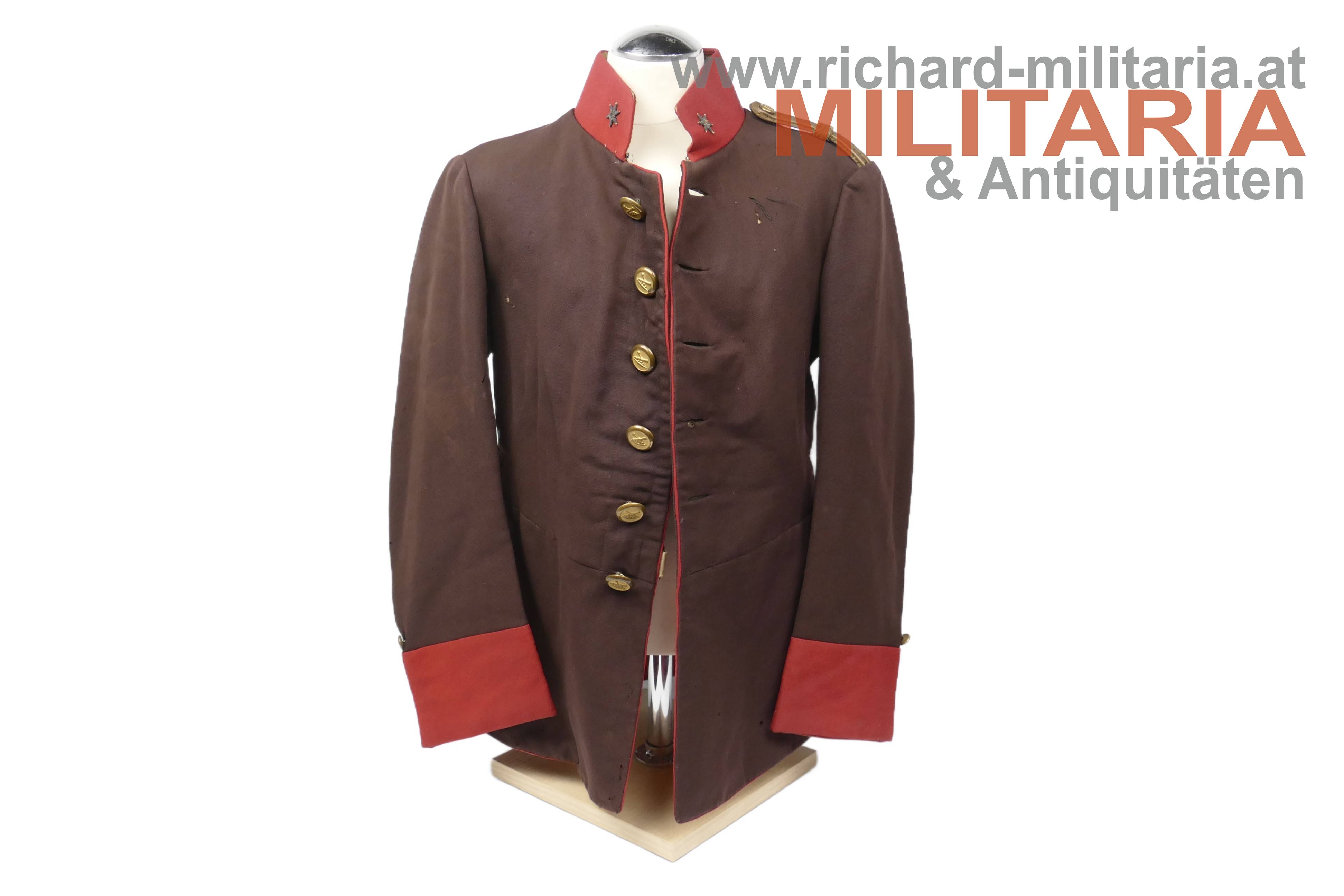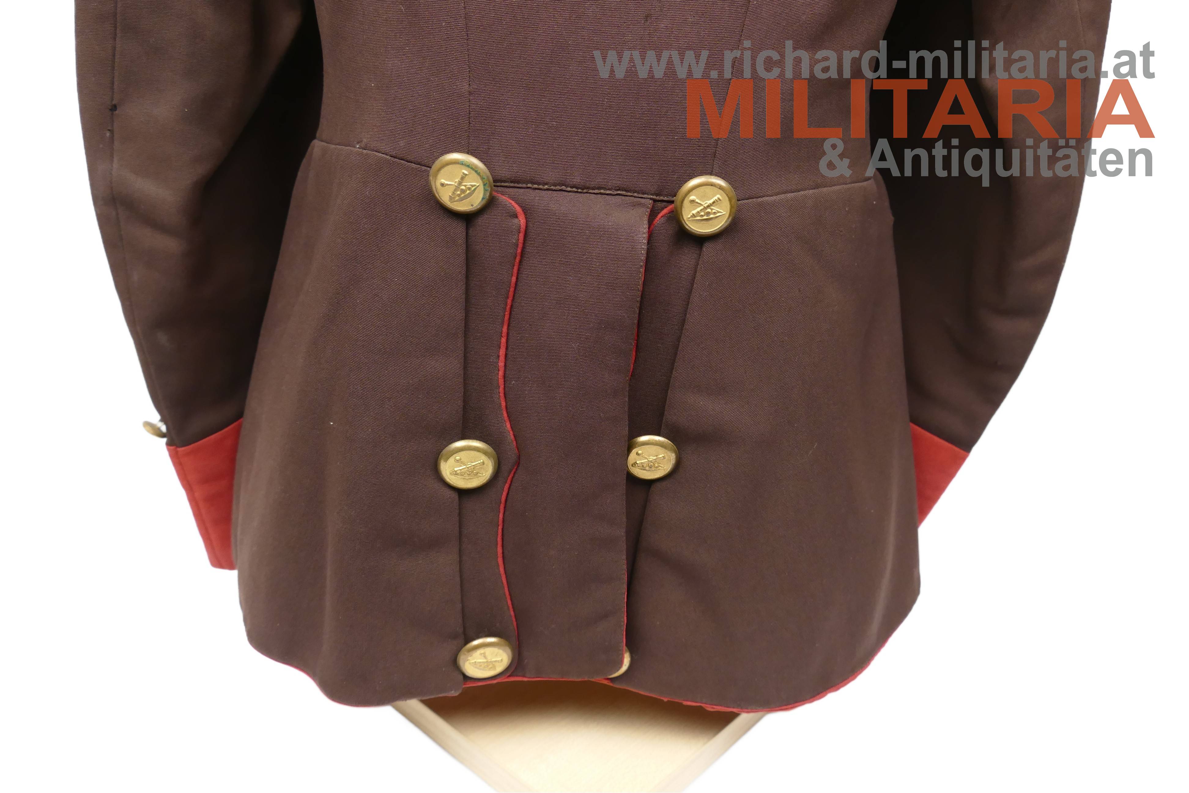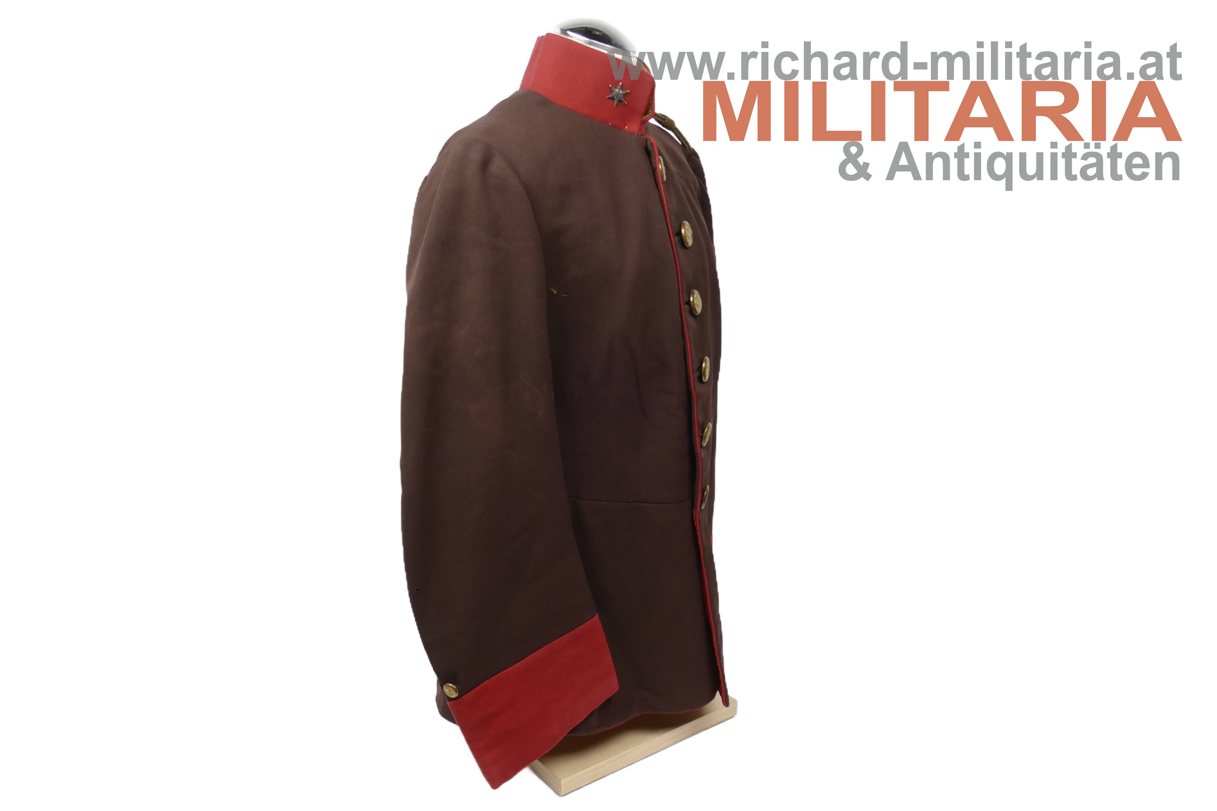 k.u.k. Artillerie Rock - Hauptmann; braunes feines Tuch mit roten Kragen und Ärmelaufschlägen; einreihig zu 6 vergoldeten Artillerieknöpfen; am Kragen je ein gedunkelter Offiziers-Distinktionsstern für einen Leutnant; auf der linken Schulter eine dick ausgeführte schwarz geritzte goldene Achselspange, gehalten von einem Artillerieknopf; rückseitig zweireihig zu je 3 vergoldeten Artillerieknöpfen; auf der linken Brust Reste von Fäden zum Anbringen von Auszeichnungen; innen der Brustteil mit beigem Seidenstoff ausgelegt; Schoßteil mit rotem Seidenstoff; in der Brusttasche ein Herstelleretikett von "Urbanovics Miksa Debreczen"; dieses beschriftet mit "Burger Miklos 1302 Aug 17"; mehrere Einrisse am Innenfutter und Mottenlöcher auf der Außenseite;