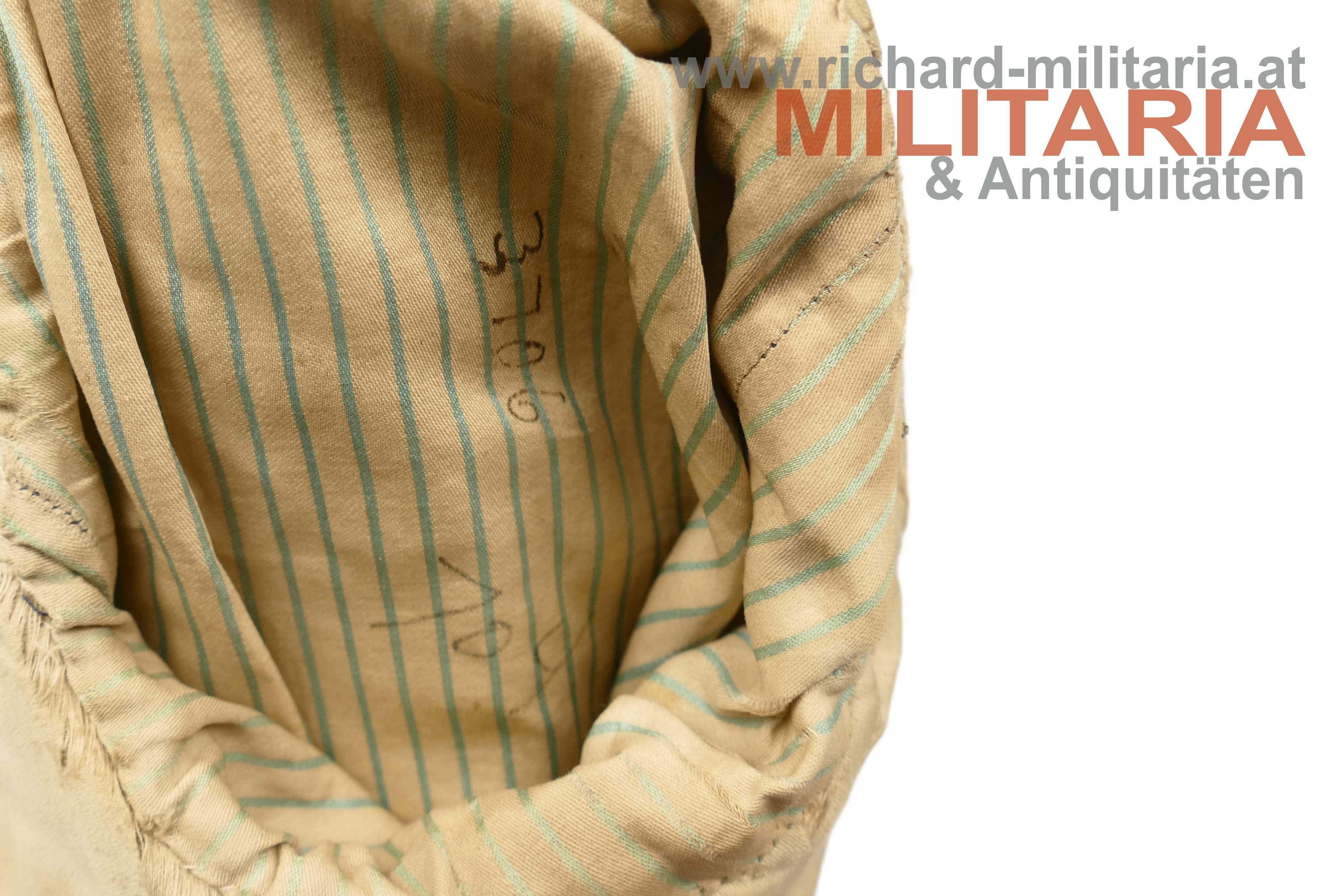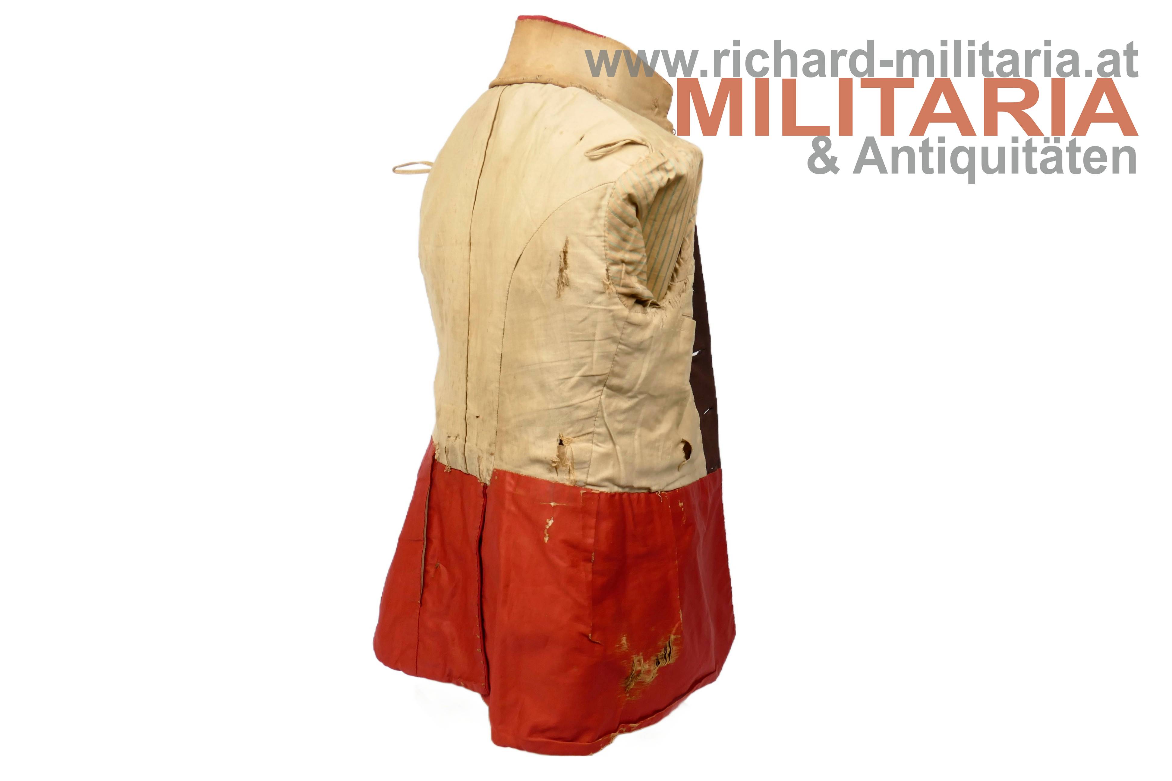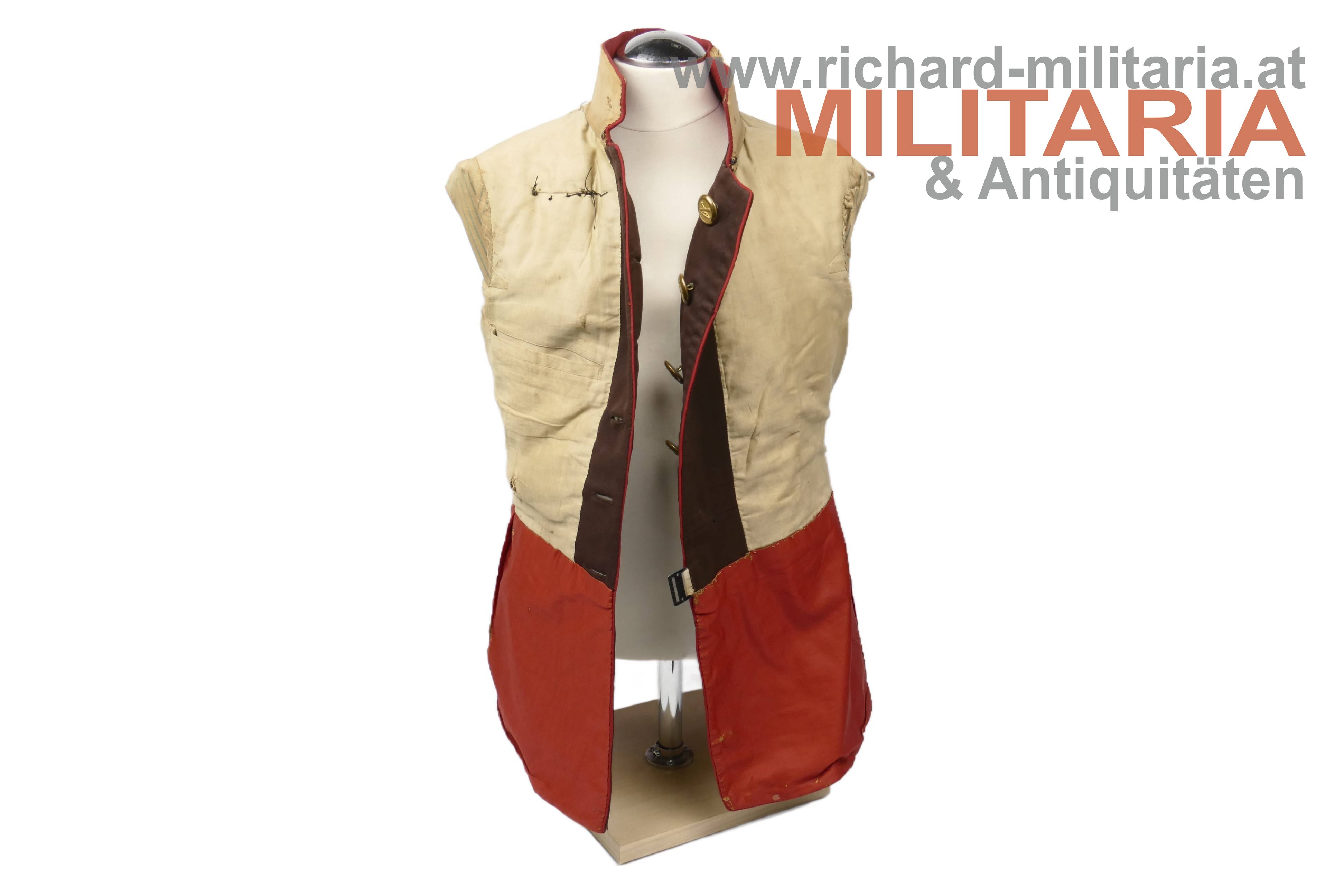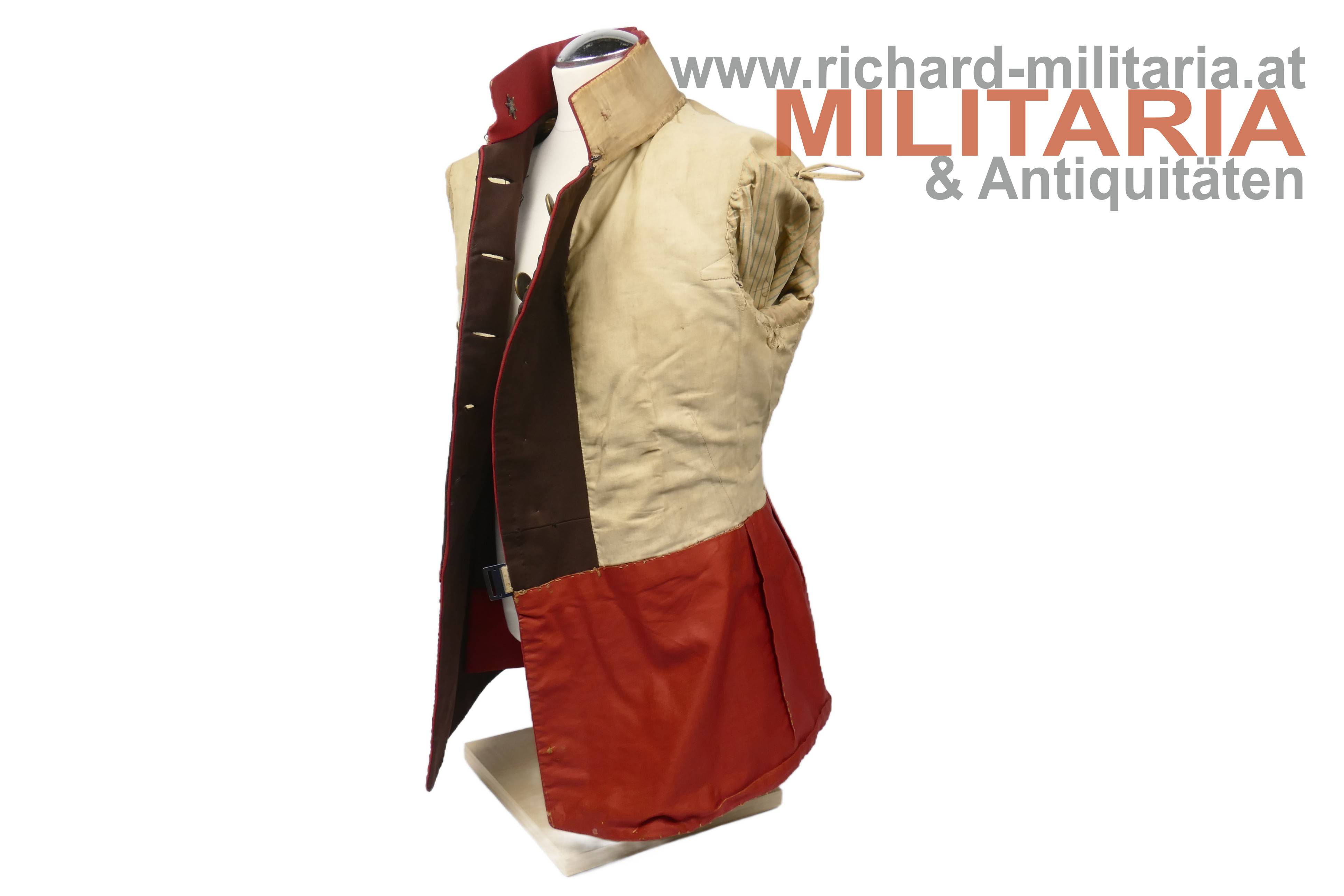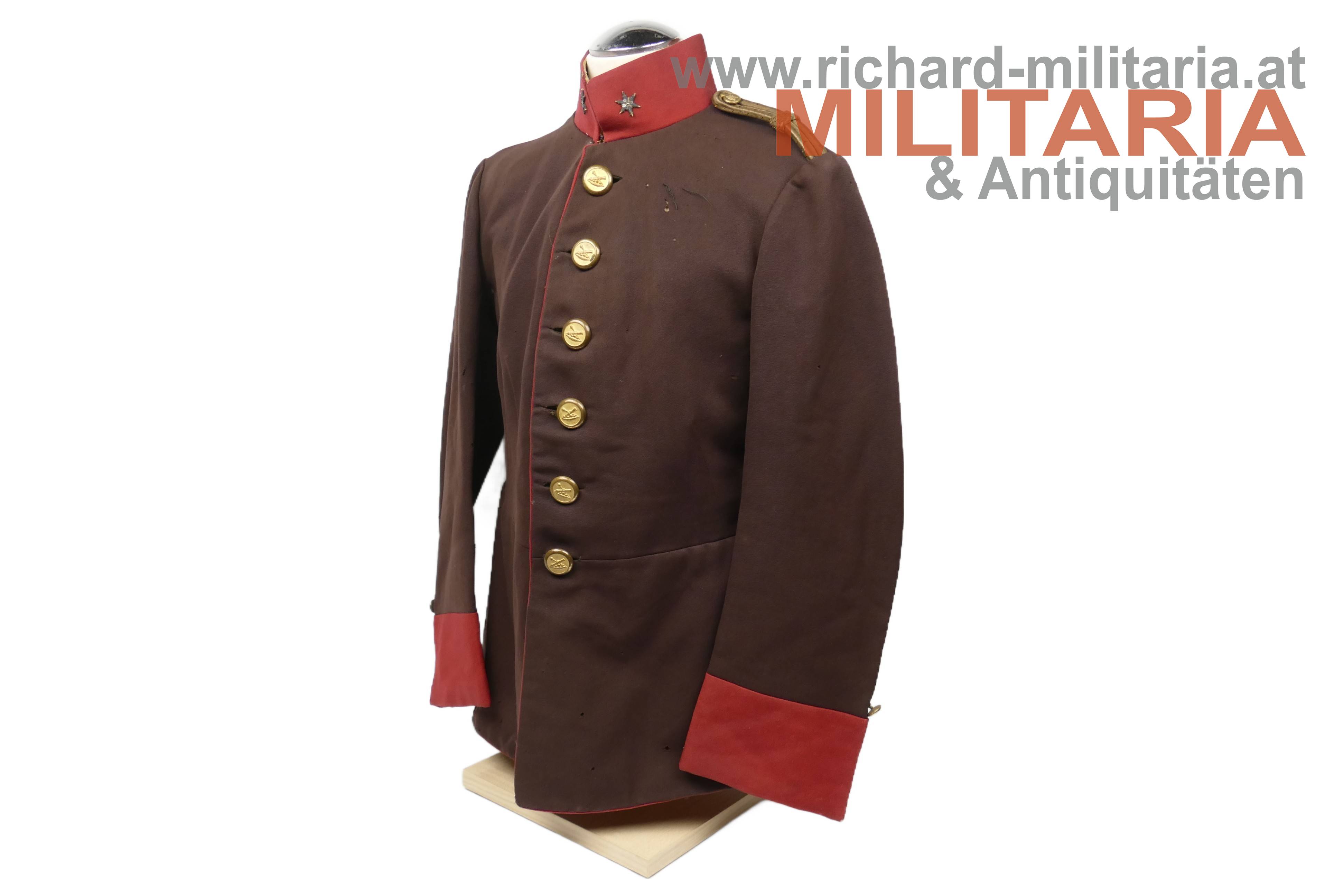 k.u.k. Artillerie Rock - Hauptmann; braunes feines Tuch mit roten Kragen und Ärmelaufschlägen; einreihig zu 6 vergoldeten Artillerieknöpfen; am Kragen je ein gedunkelter Offiziers-Distinktionsstern für einen Leutnant; auf der linken Schulter eine dick ausgeführte schwarz geritzte goldene Achselspange, gehalten von einem Artillerieknopf; rückseitig zweireihig zu je 3 vergoldeten Artillerieknöpfen; auf der linken Brust Reste von Fäden zum Anbringen von Auszeichnungen; innen der Brustteil mit beigem Seidenstoff ausgelegt; Schoßteil mit rotem Seidenstoff; in der Brusttasche ein Herstelleretikett von "Urbanovics Miksa Debreczen"; dieses beschriftet mit "Burger Miklos 1302 Aug 17"; mehrere Einrisse am Innenfutter und Mottenlöcher auf der Außenseite;